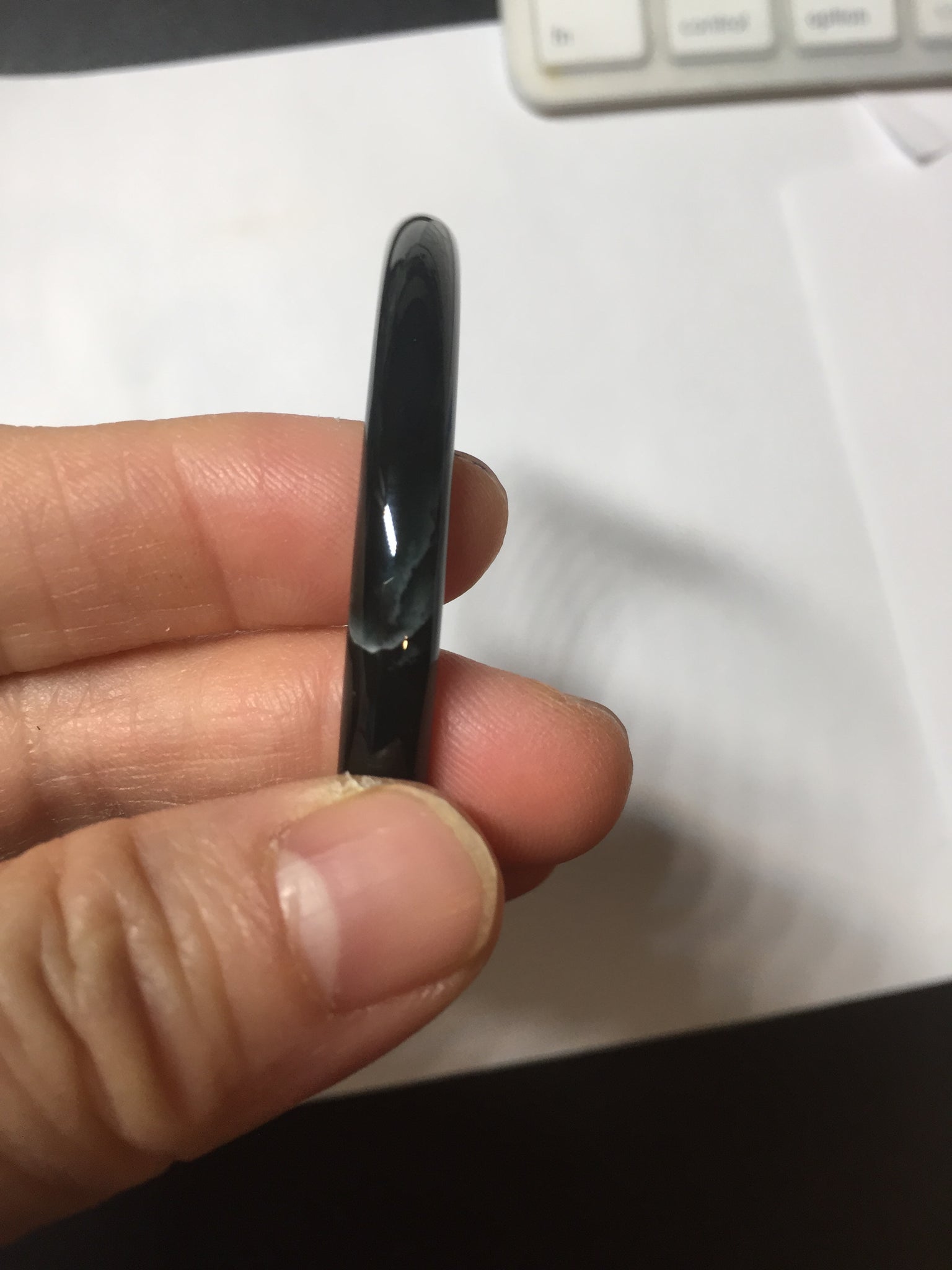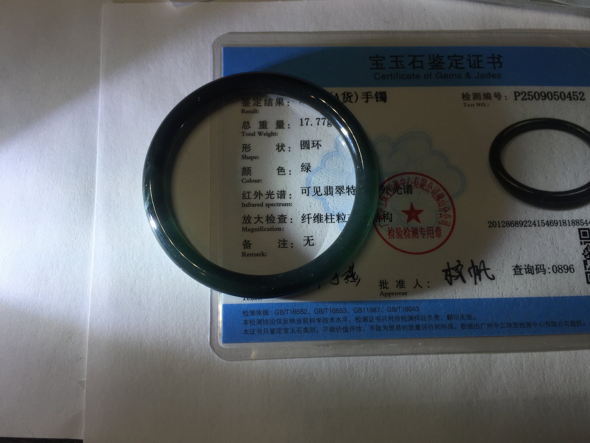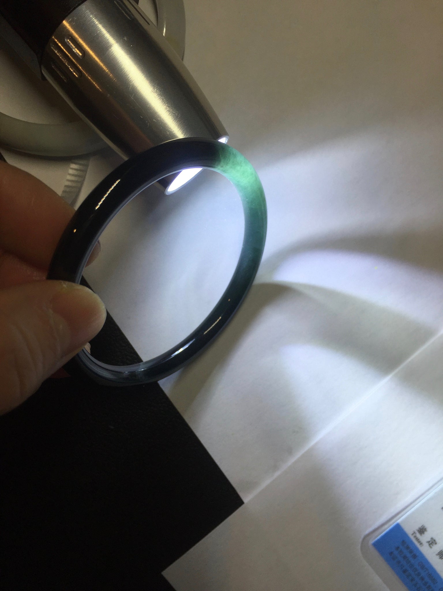 Two cracks. One is around the bangle. The bangle is still firm(The internal structure is not broken and remains connected). No hairline. Not transparent. under regular light, it is black color close to WuJi jadeite.