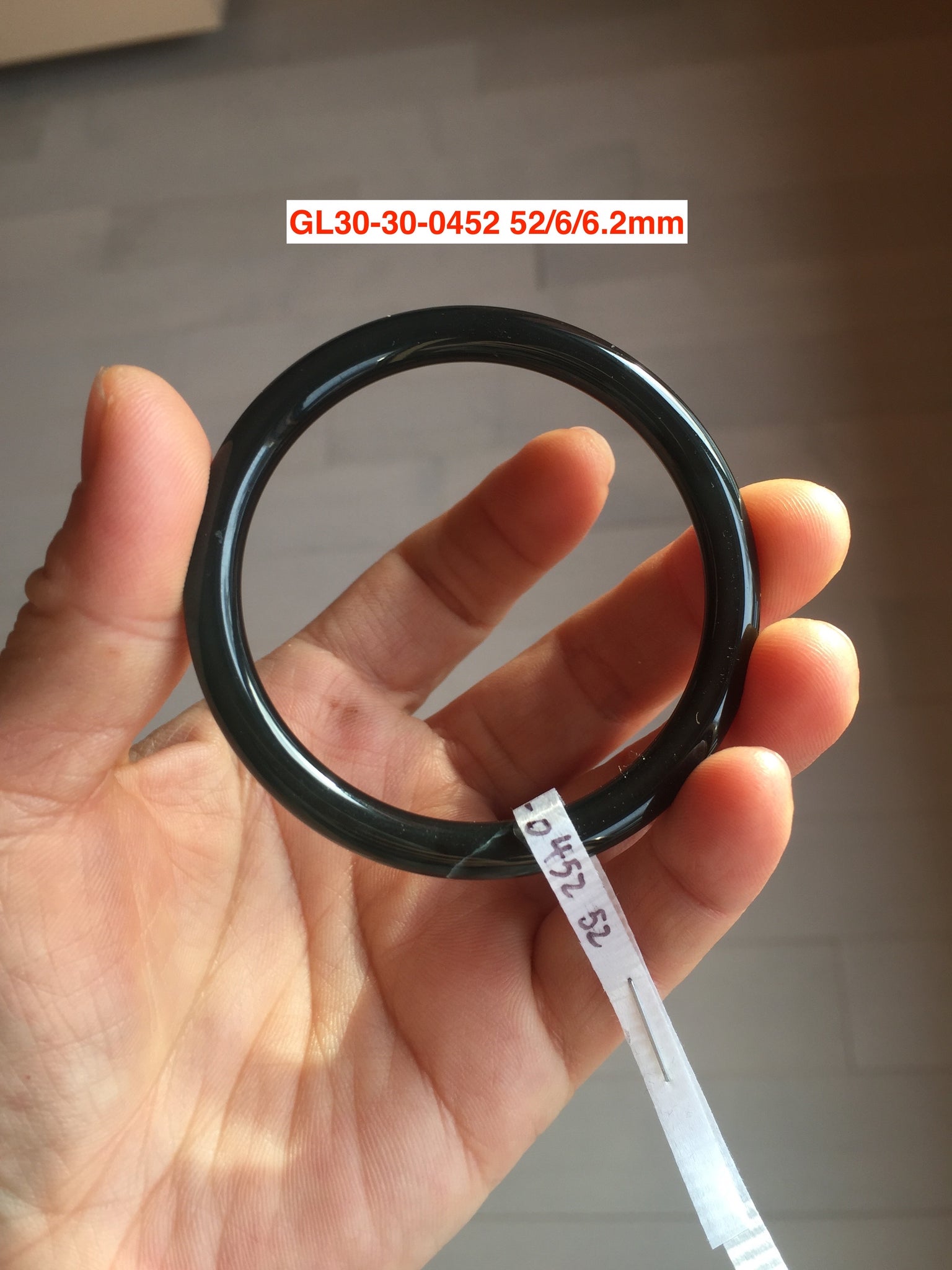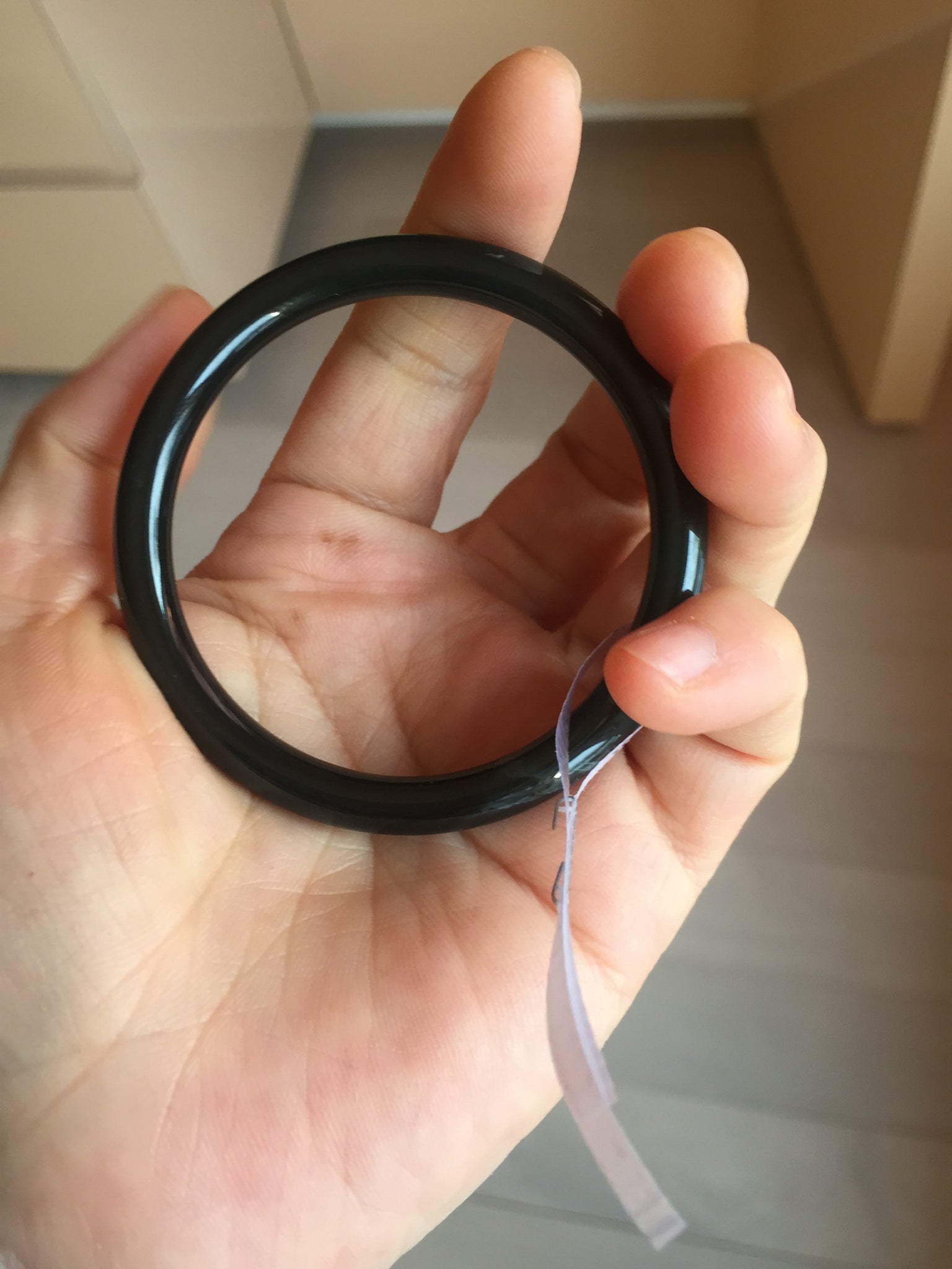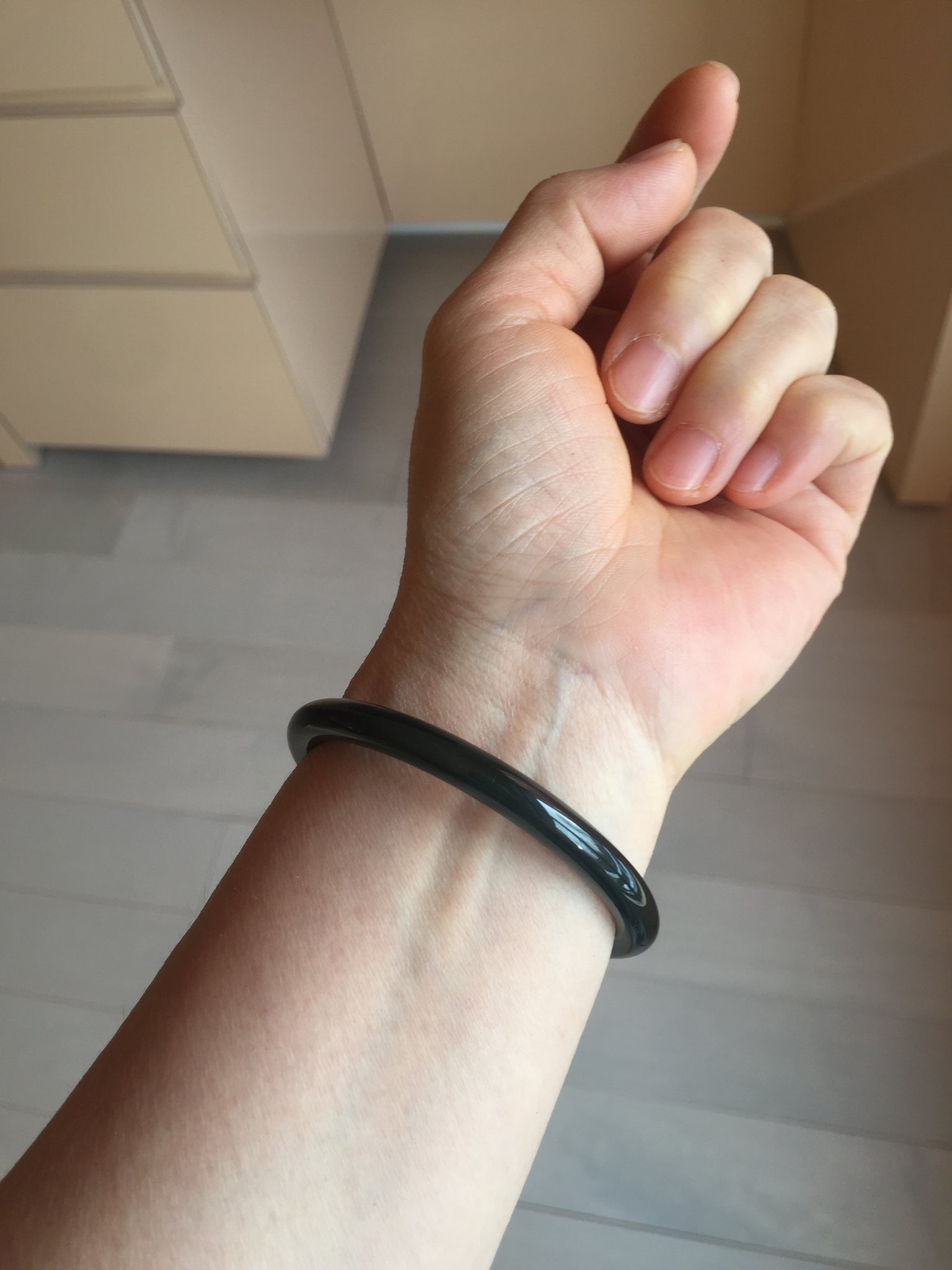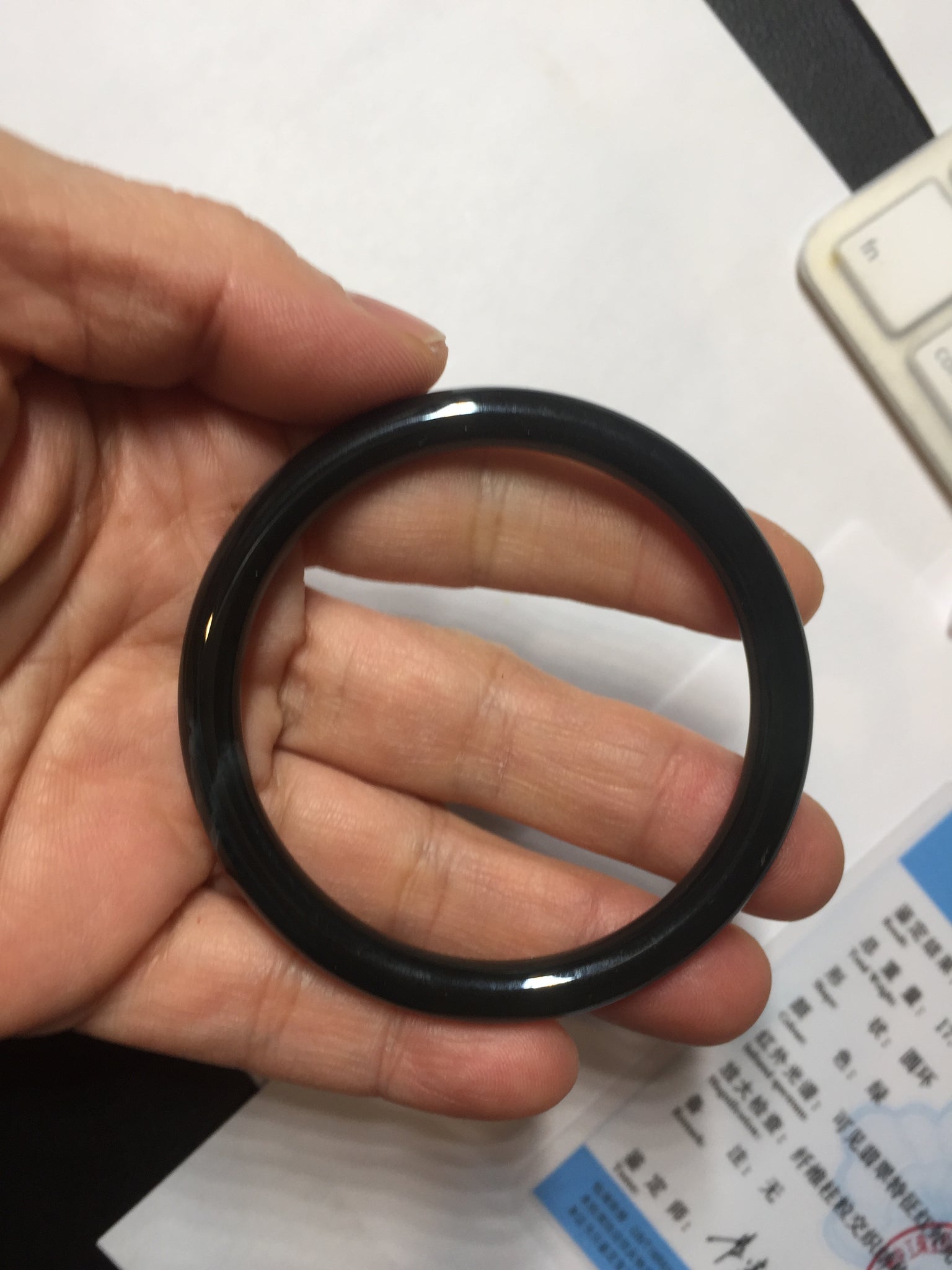 Two cracks. One is around the bangle. The bangle is still firm(The internal structure is not broken and remains connected). No hairline. Not transparent. under regular light, it is black color close to WuJi jadeite.