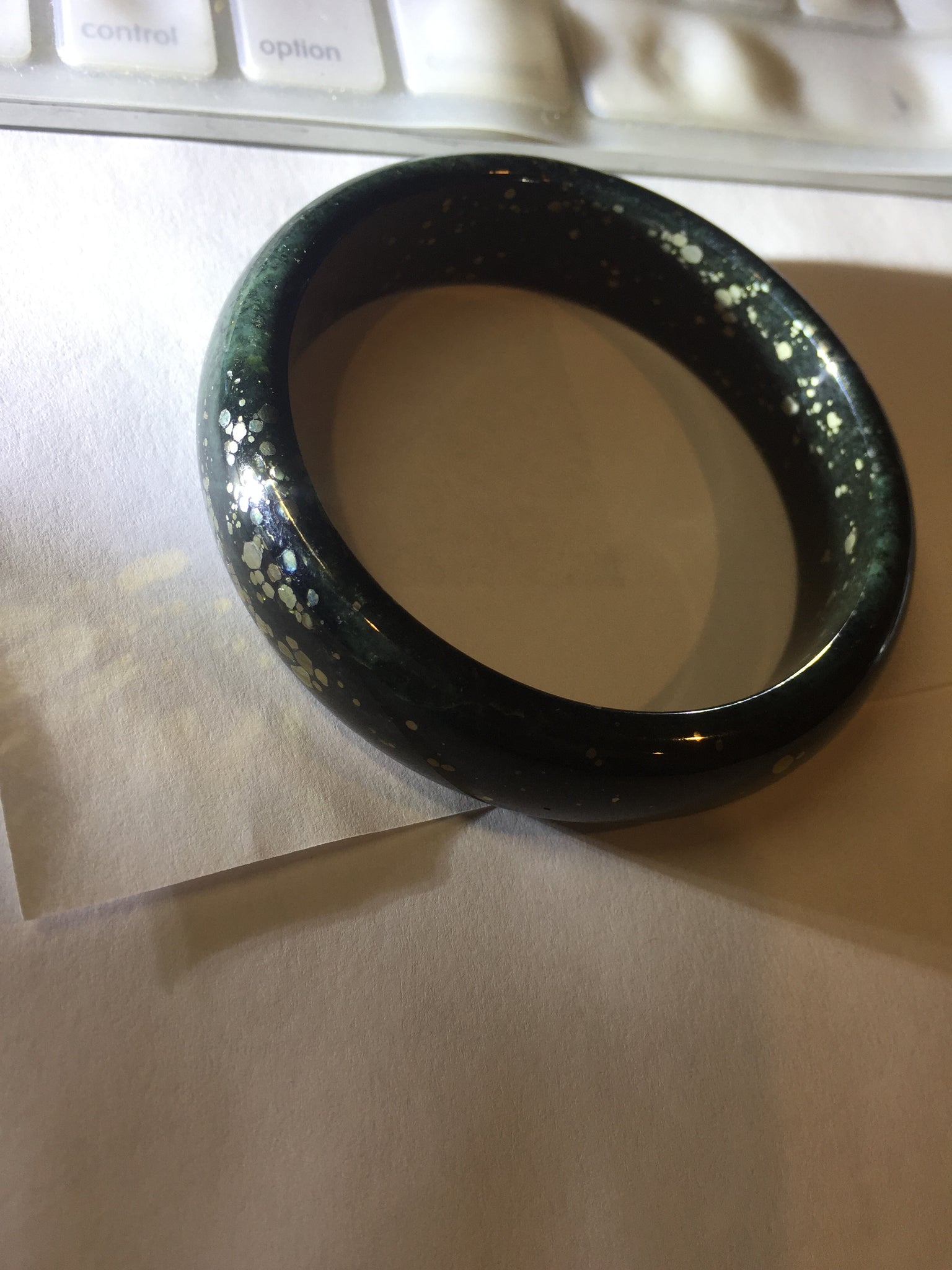No crack. No hairline. Some metal spots. The metal spots are naturally formed, not inlaid. Upon touch, some of the naturally formed metal spots may have a slightly raised edge that can be felt by finger. It is dark green. Under normal light, it is more close to black.