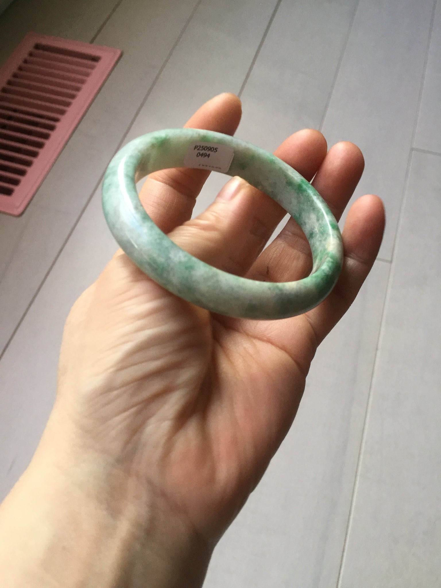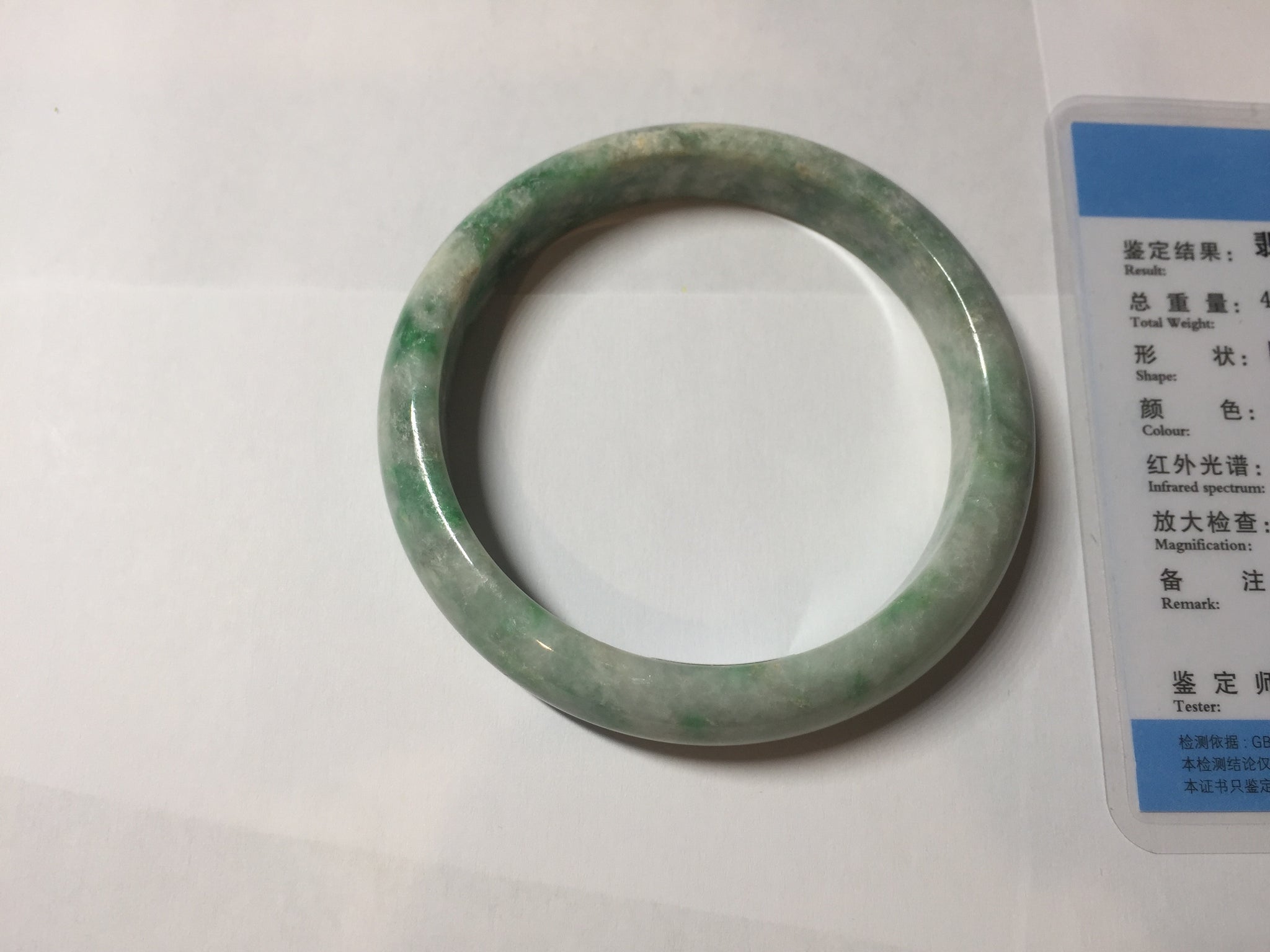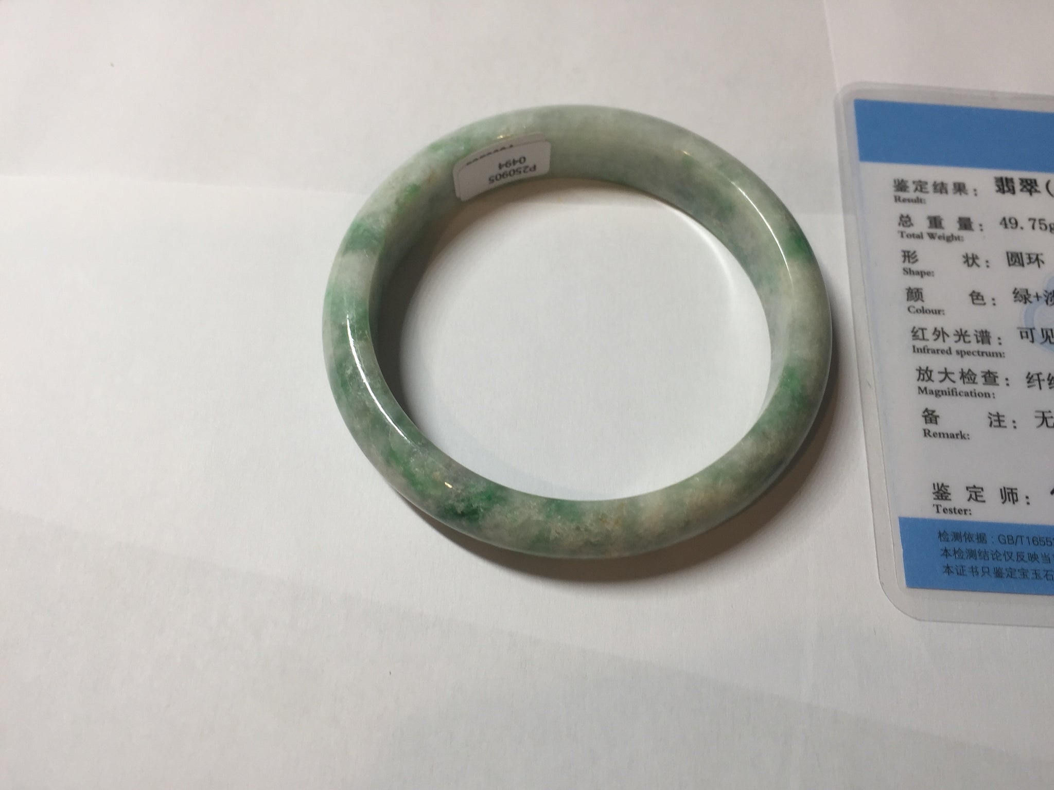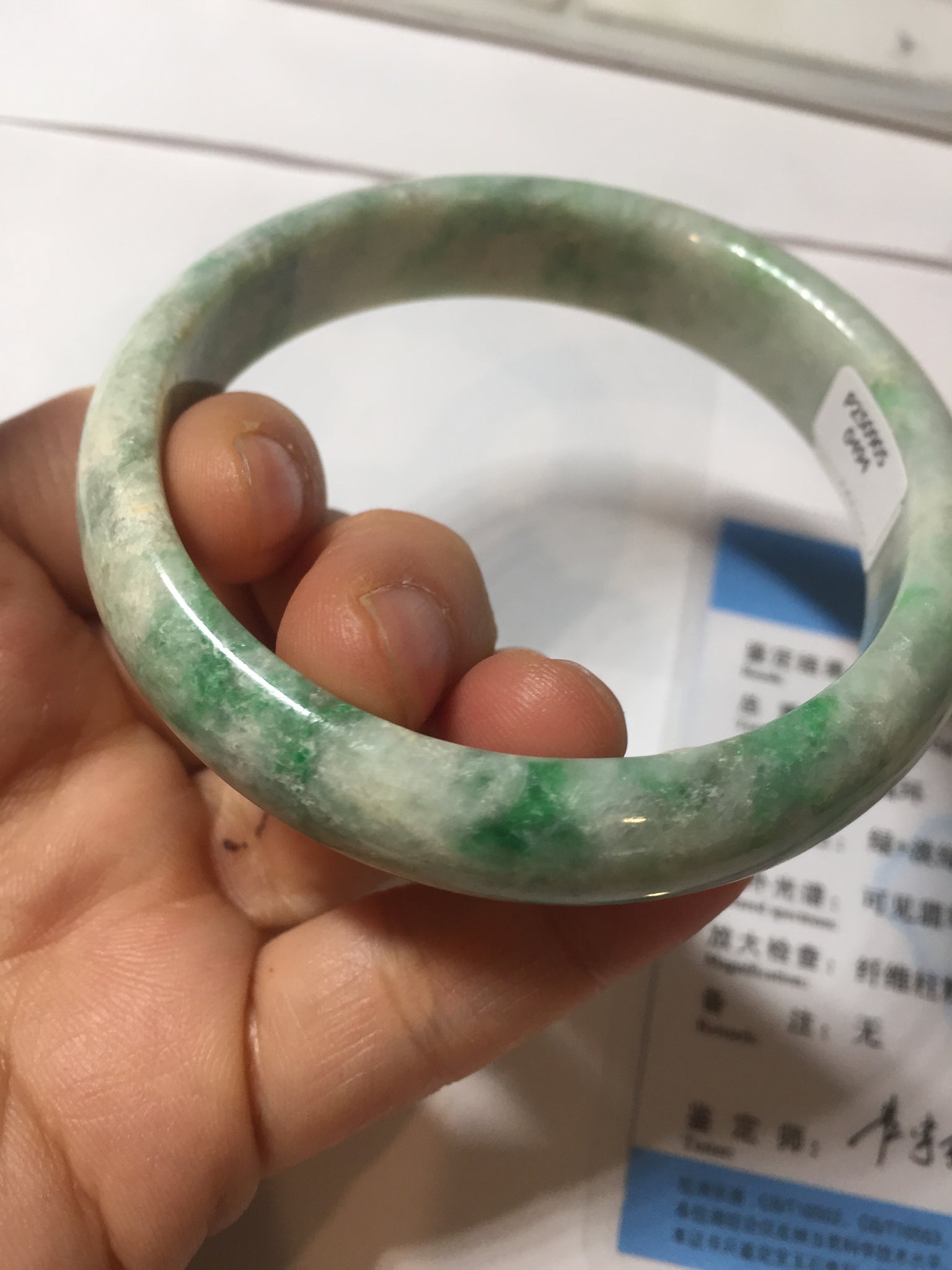 Some rough surface areas with surface fissures. Some rough surface has very tiny amount of wax. The texture is not delicate.Some cotton areas, cotton lines, structure lines, and cotton spots. Not transparent. Not watery. One part of bangle is thinner and narrower than other part.