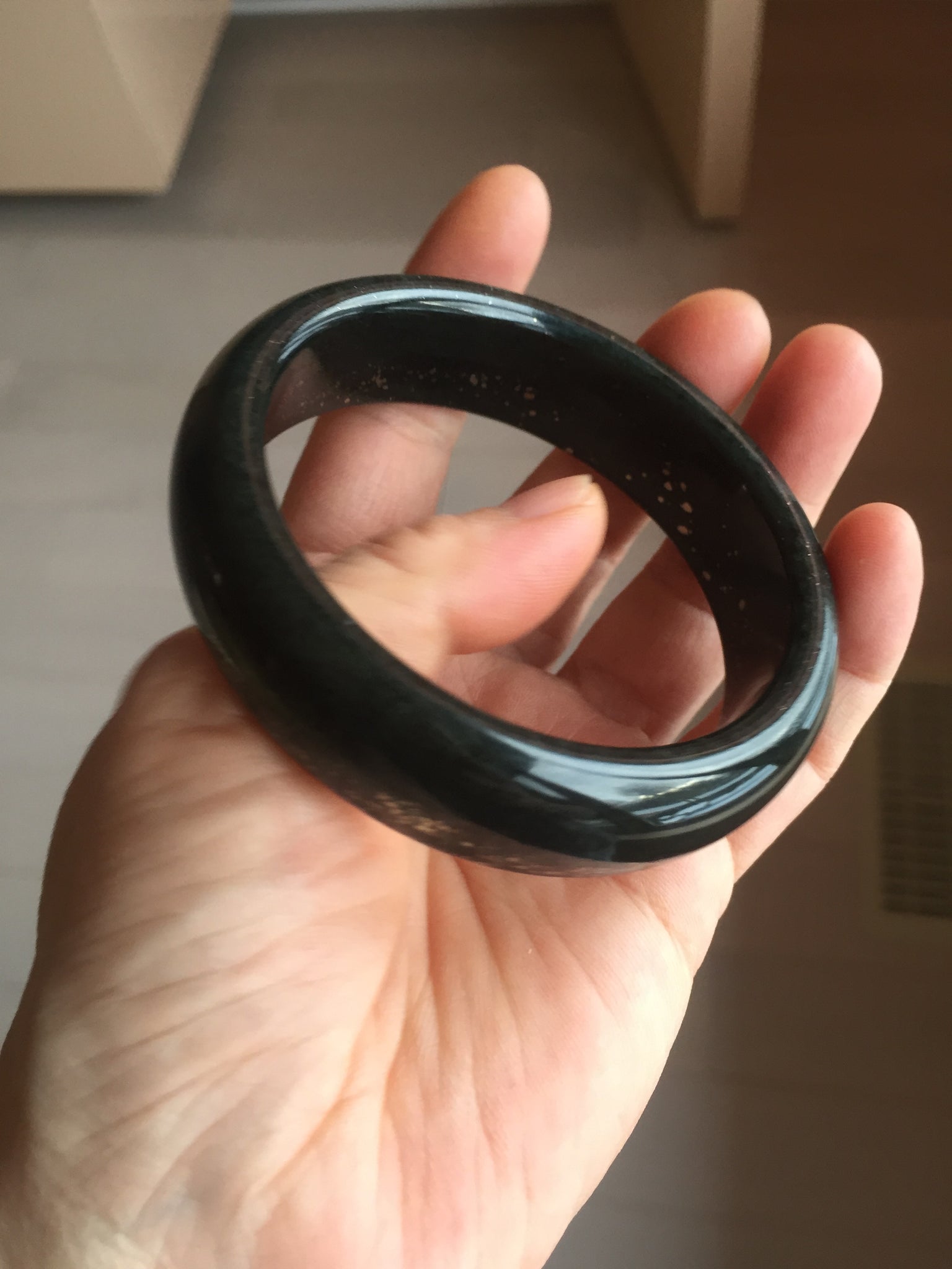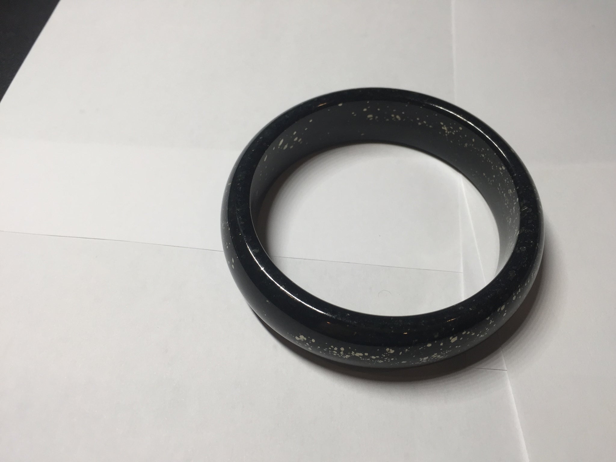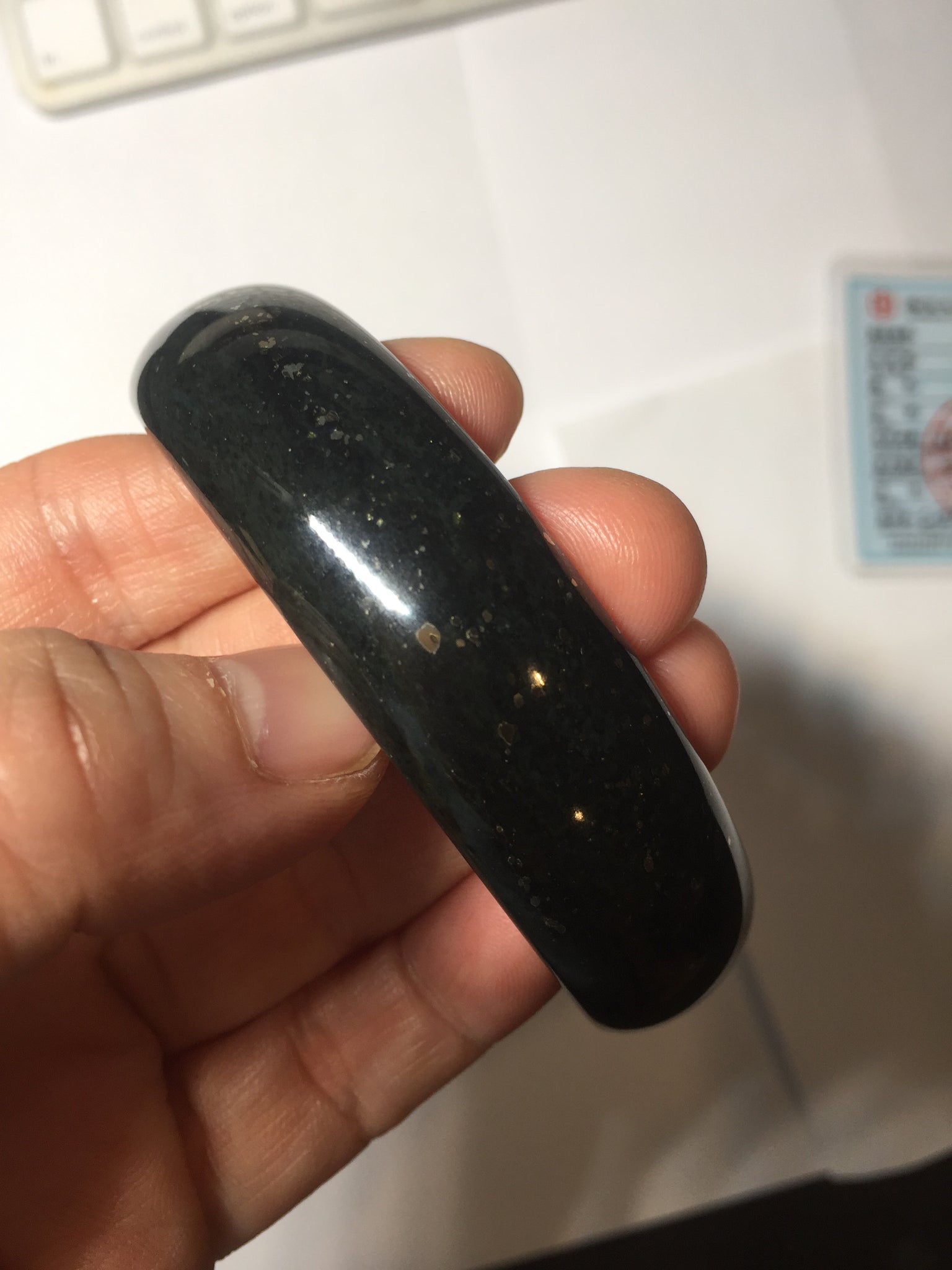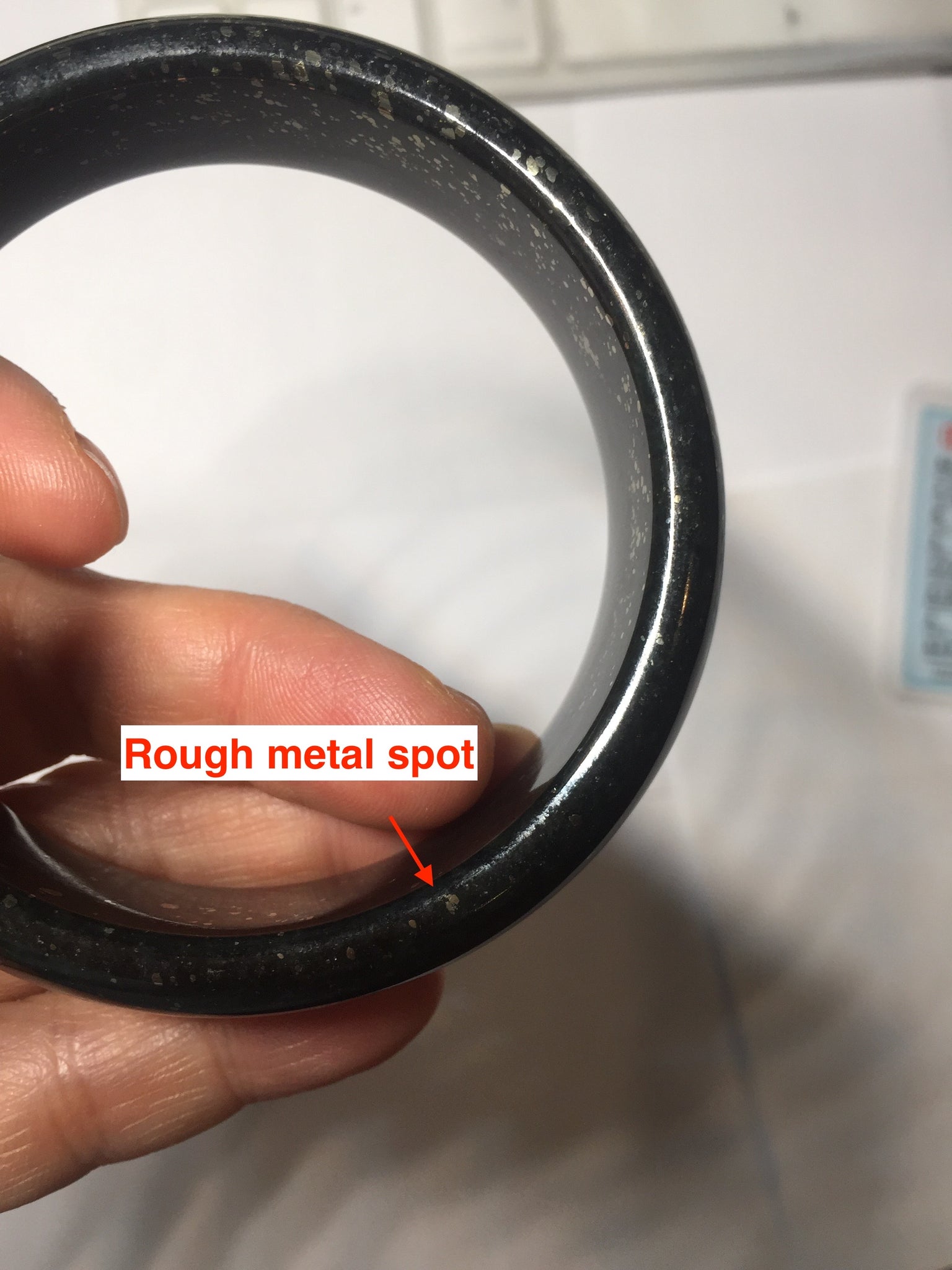 One ring shape crack. No hairline. Some metal spots. The metal spots are naturally formed, not inlaid. Upon touch, some of the naturally formed metal spots may have a slightly raised edge that can be felt by finger. It is dark green. Under normal light, it is more close to black.