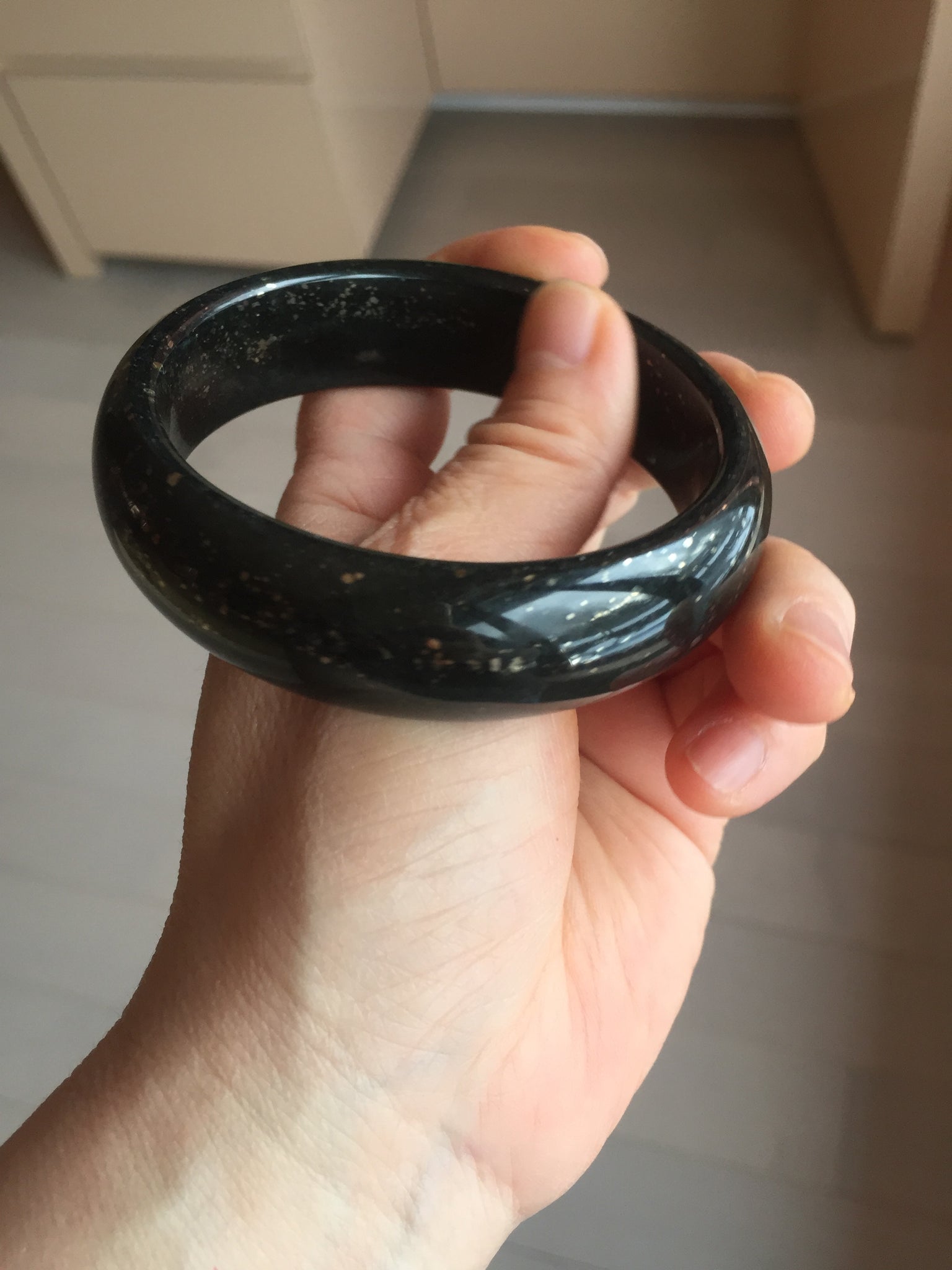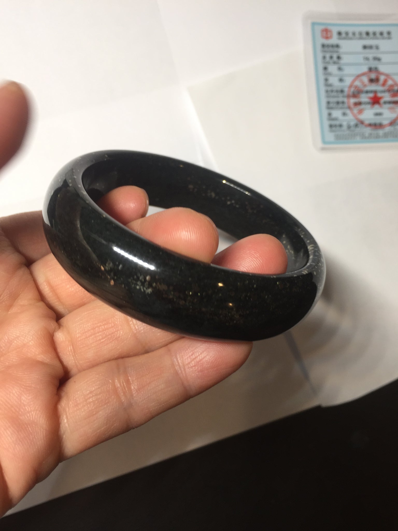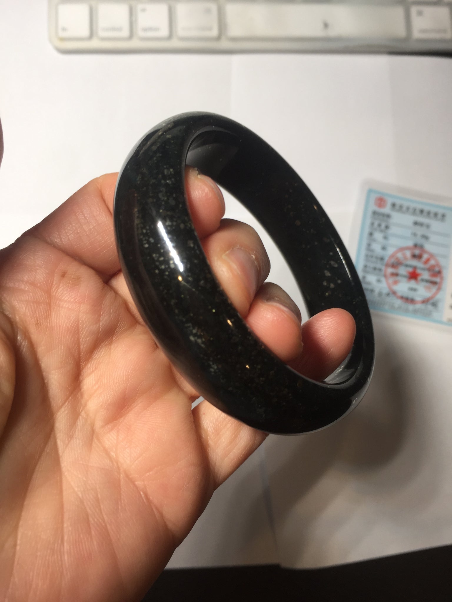 One ring shape crack. No hairline. Some metal spots. The metal spots are naturally formed, not inlaid. Upon touch, some of the naturally formed metal spots may have a slightly raised edge that can be felt by finger. It is dark green. Under normal light, it is more close to black.