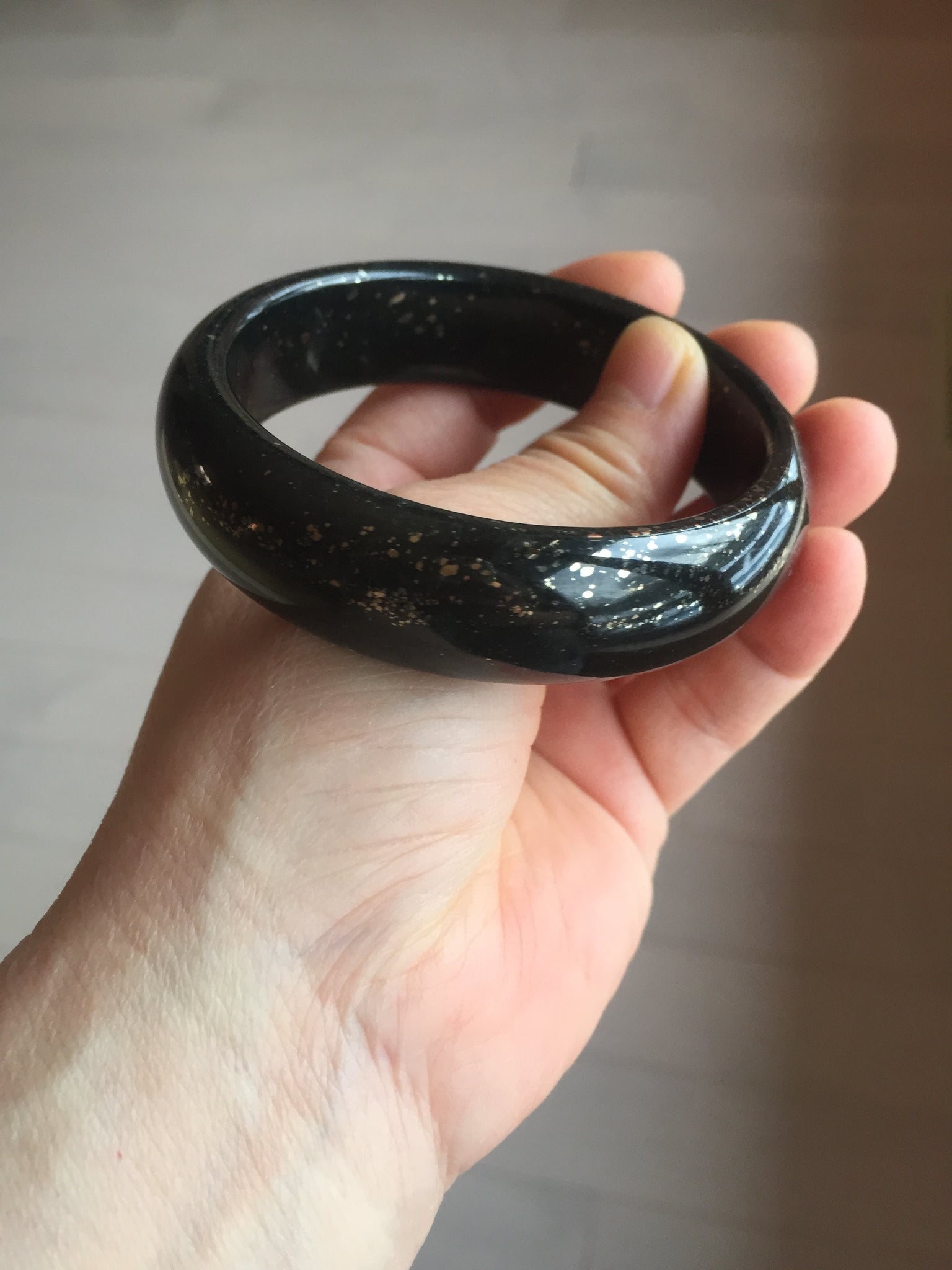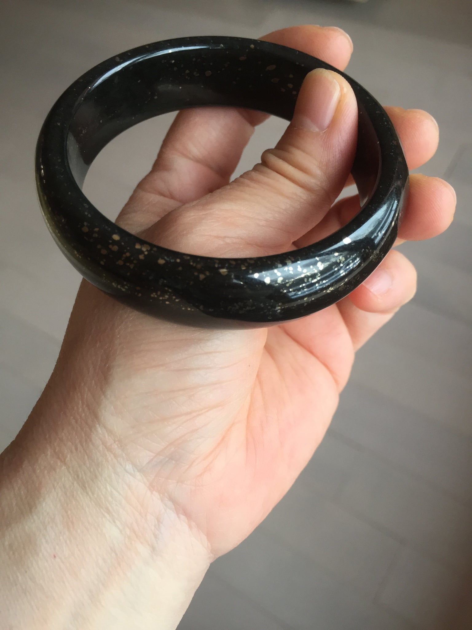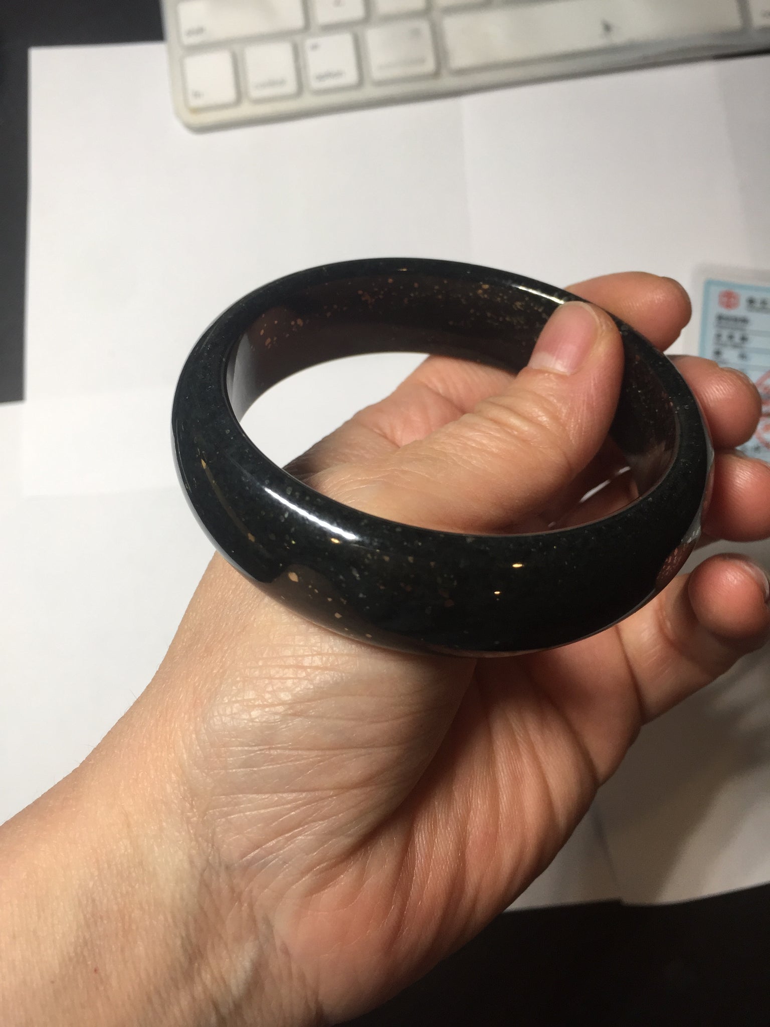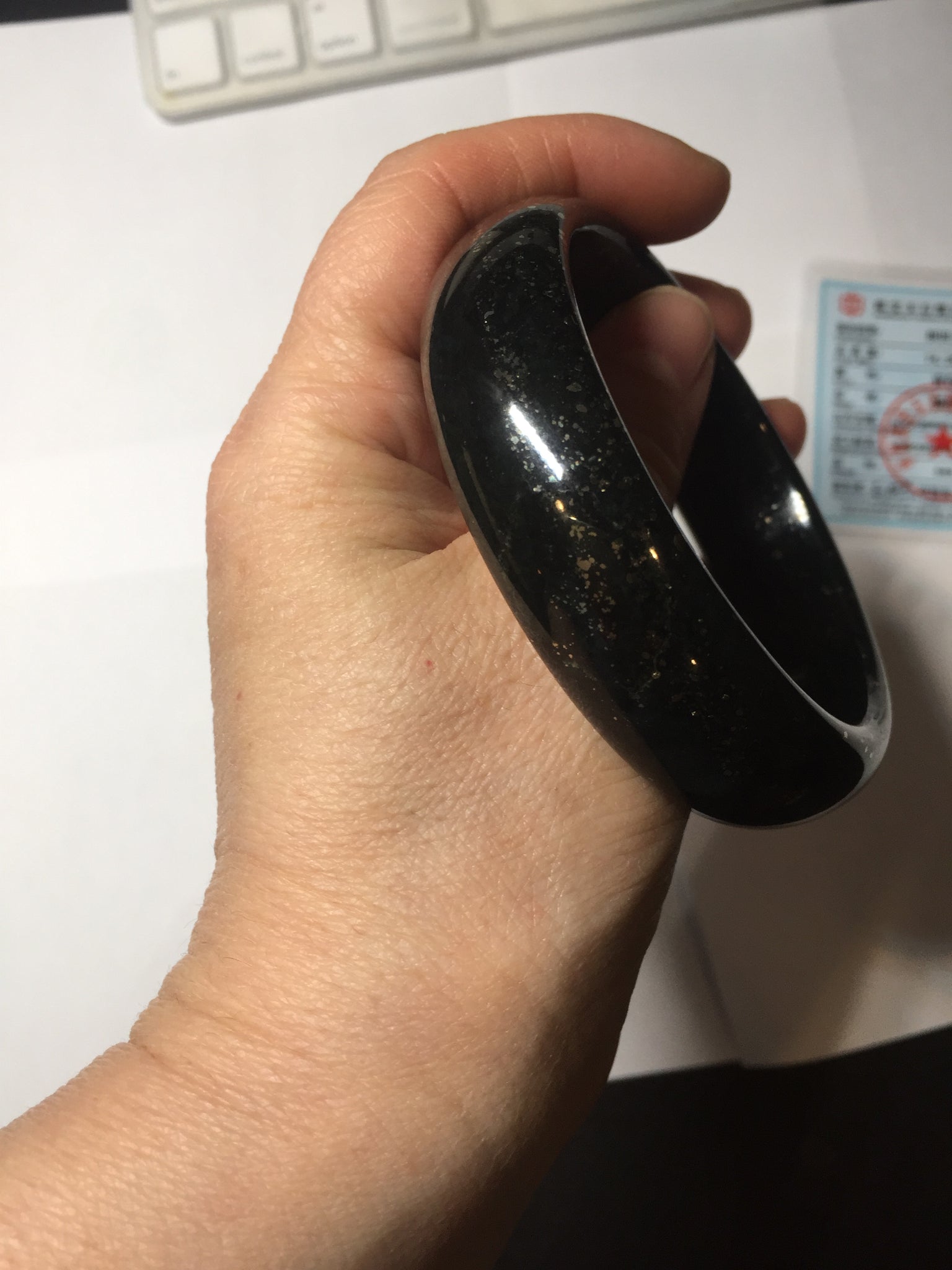 One ring shape crack. No hairline. Some metal spots. The metal spots are naturally formed, not inlaid. Upon touch, some of the naturally formed metal spots may have a slightly raised edge that can be felt by finger. It is dark green. Under normal light, it is more close to black.