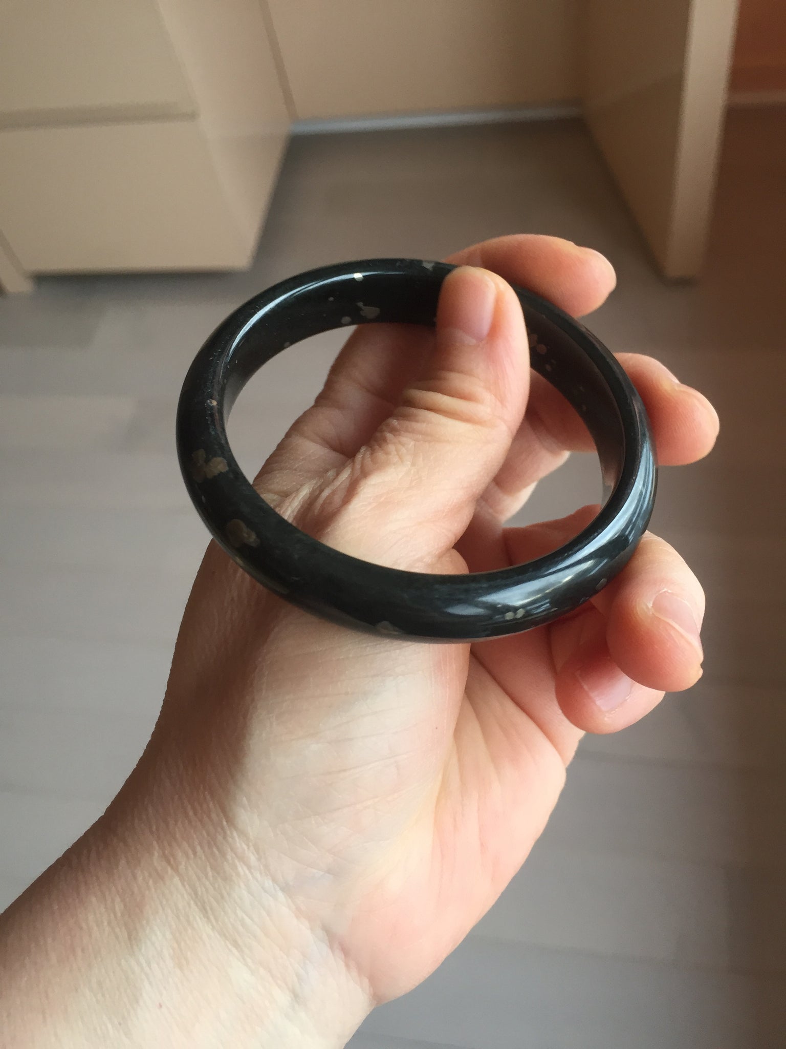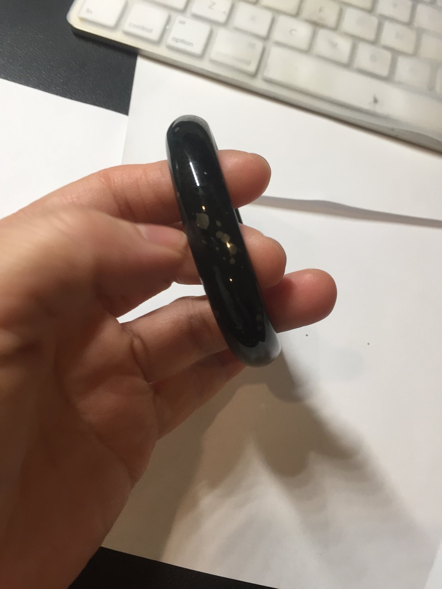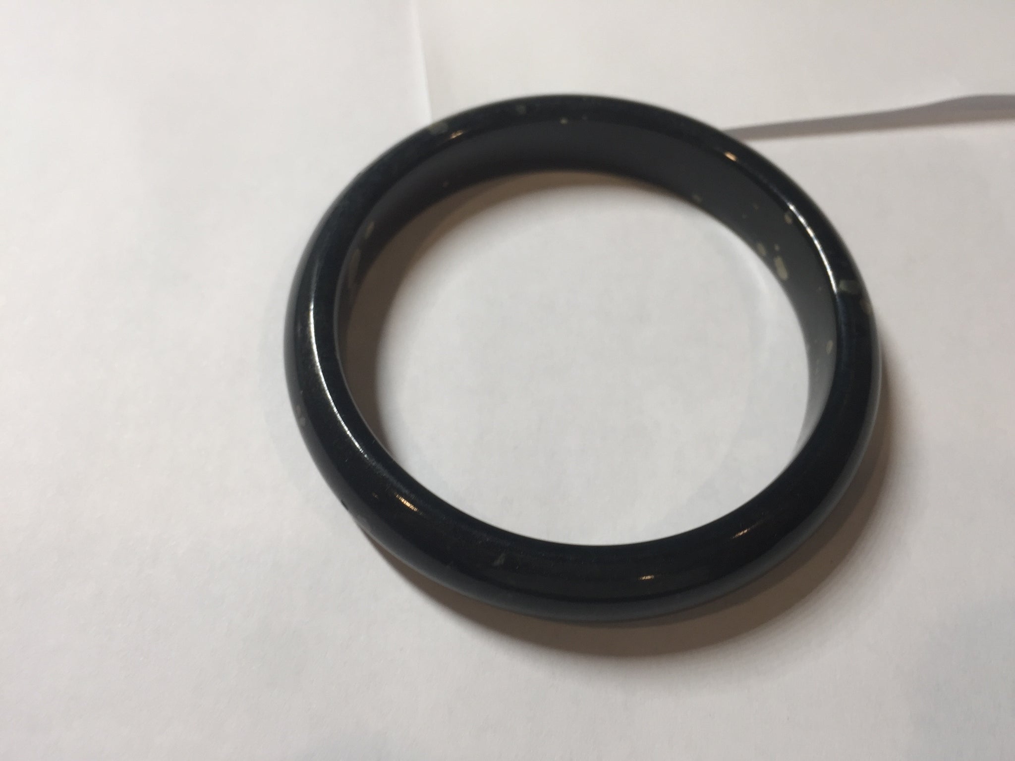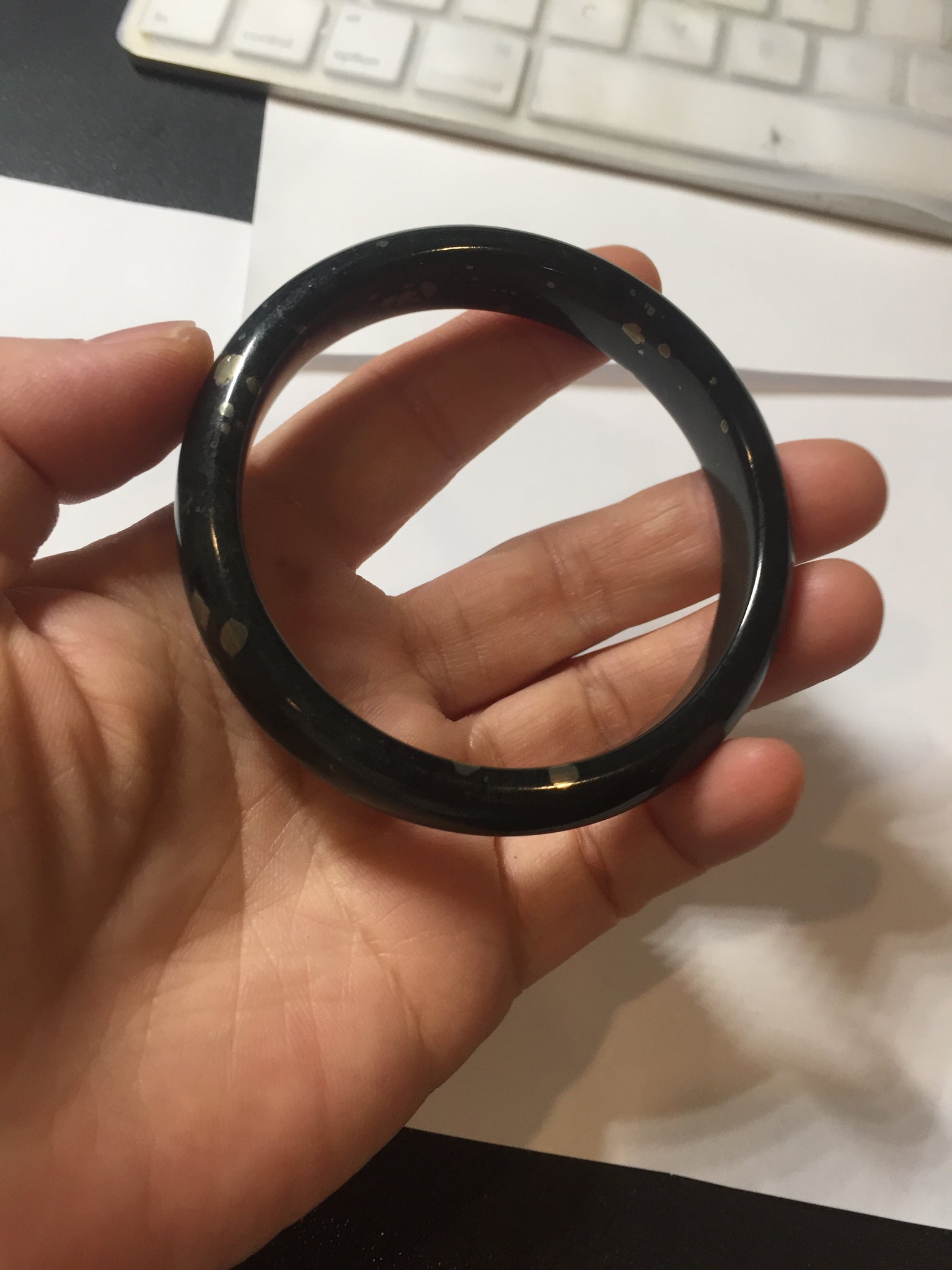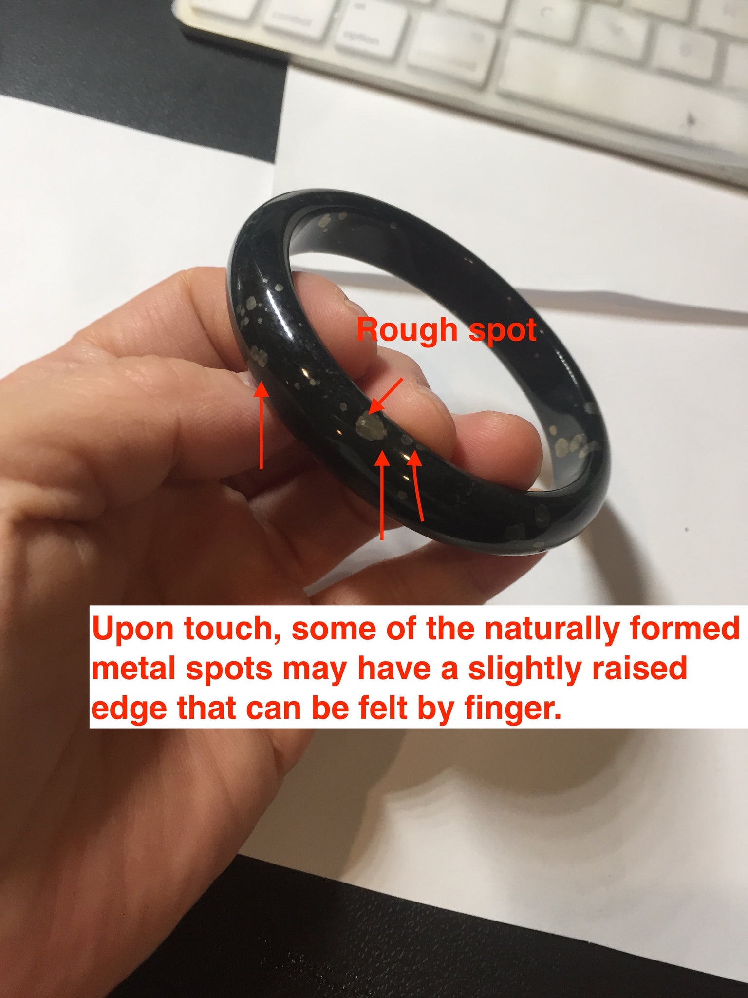 No crack. No hairline. Some metal spots. The metal spots are naturally formed, not inlaid. Upon touch, some of the naturally formed metal spots may have a slightly raised edge that can be felt by finger. It is dark green. Under normal light, it is more close to black.
