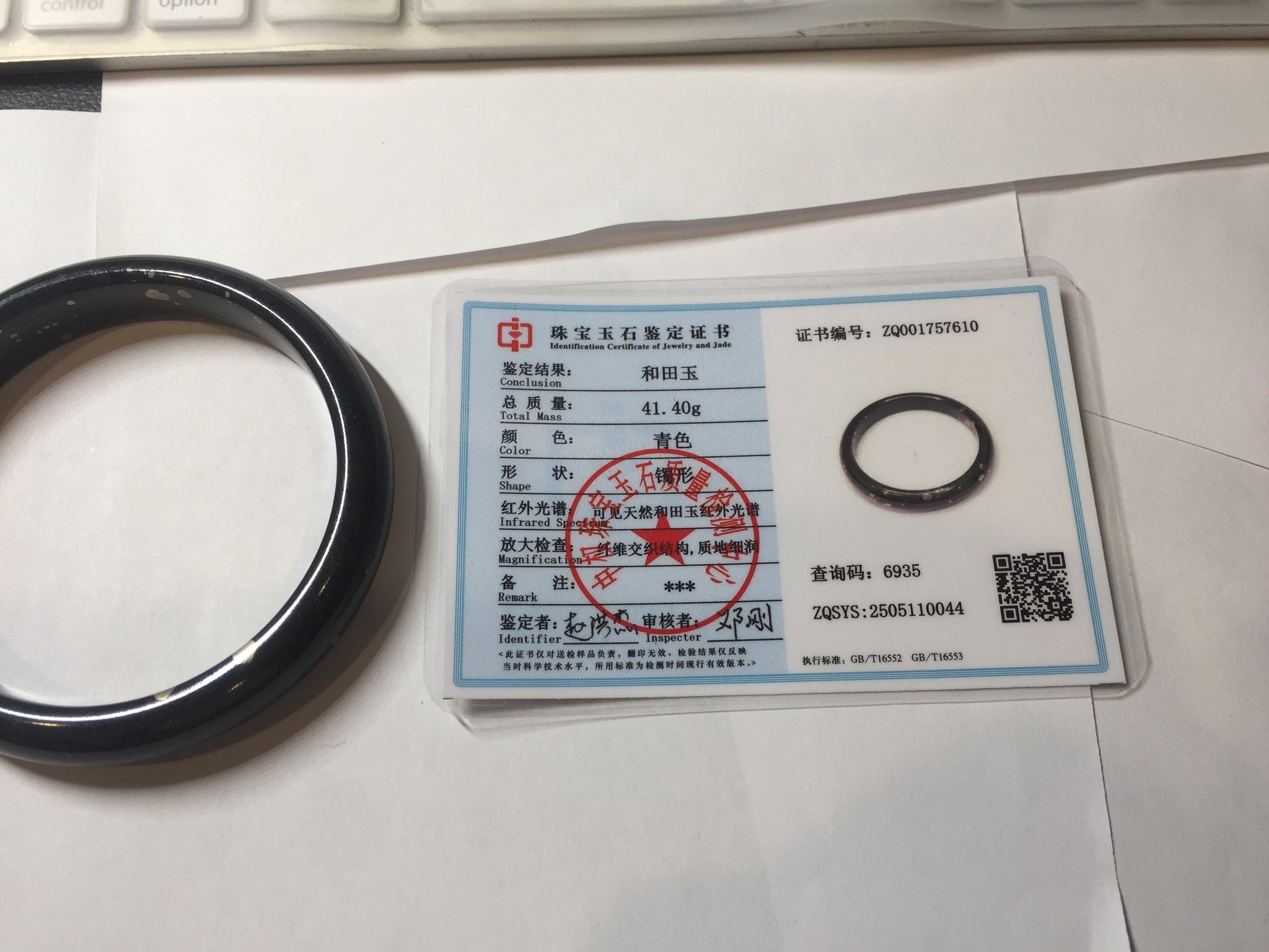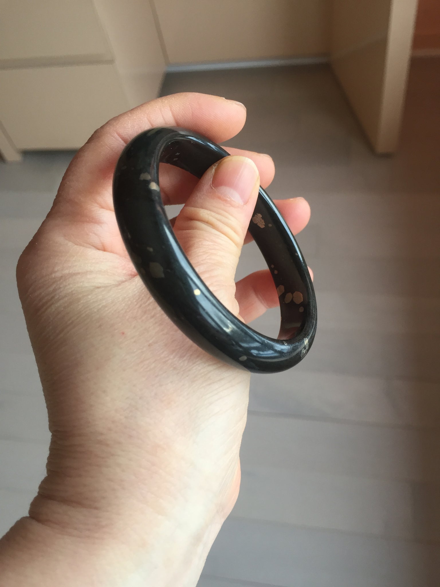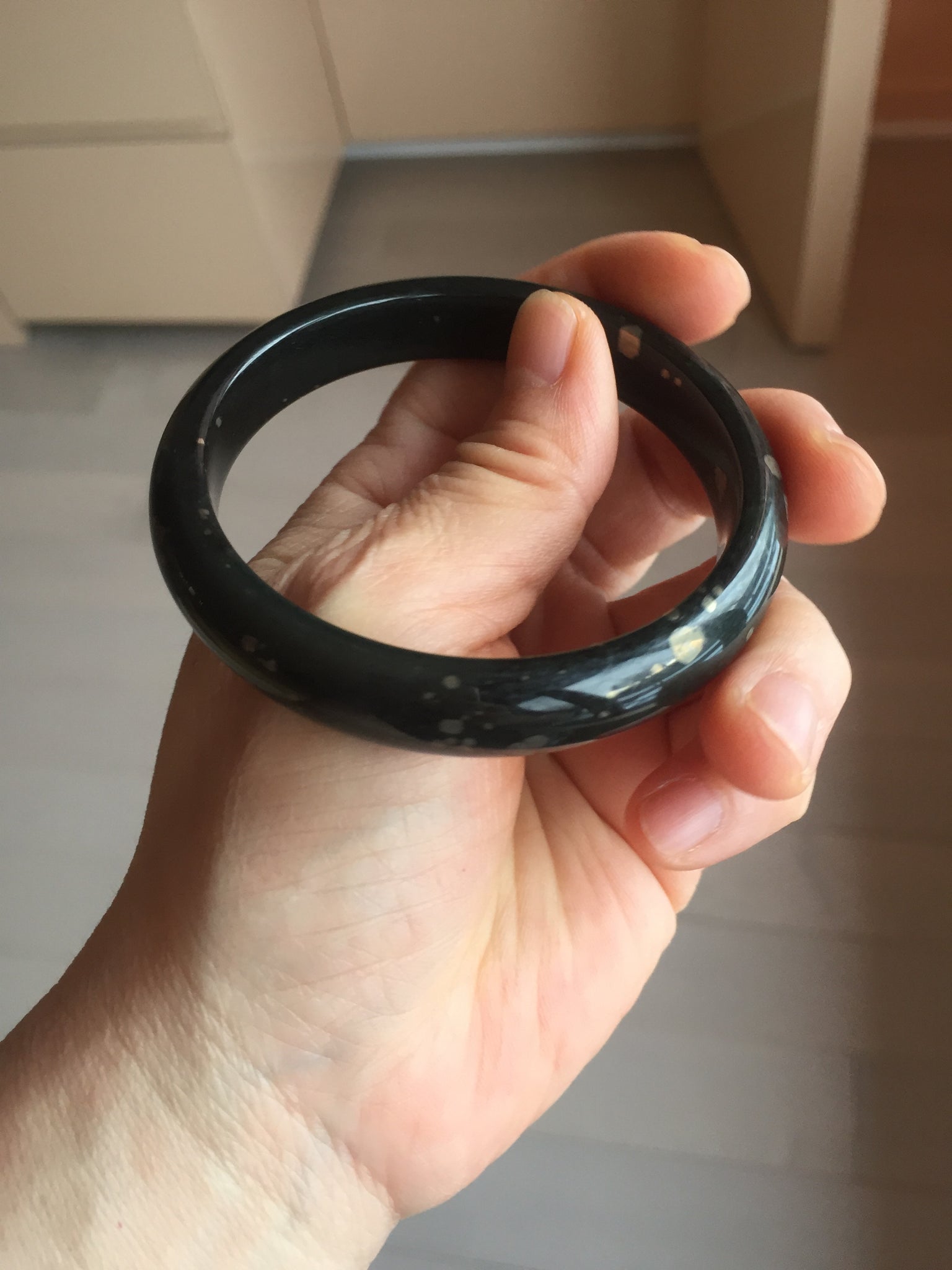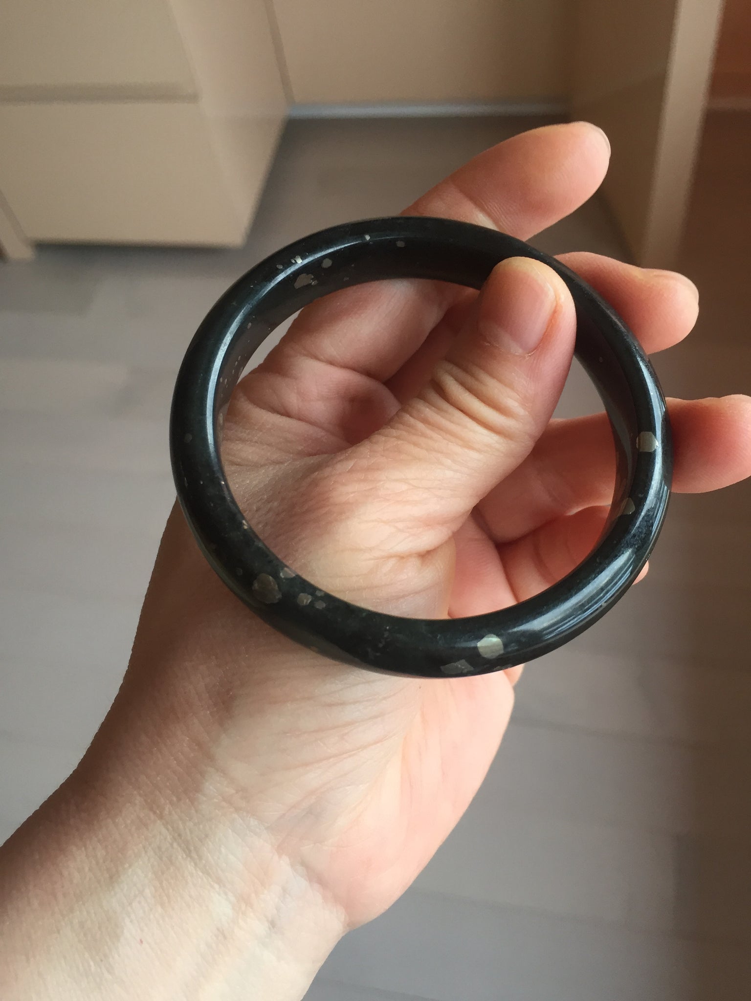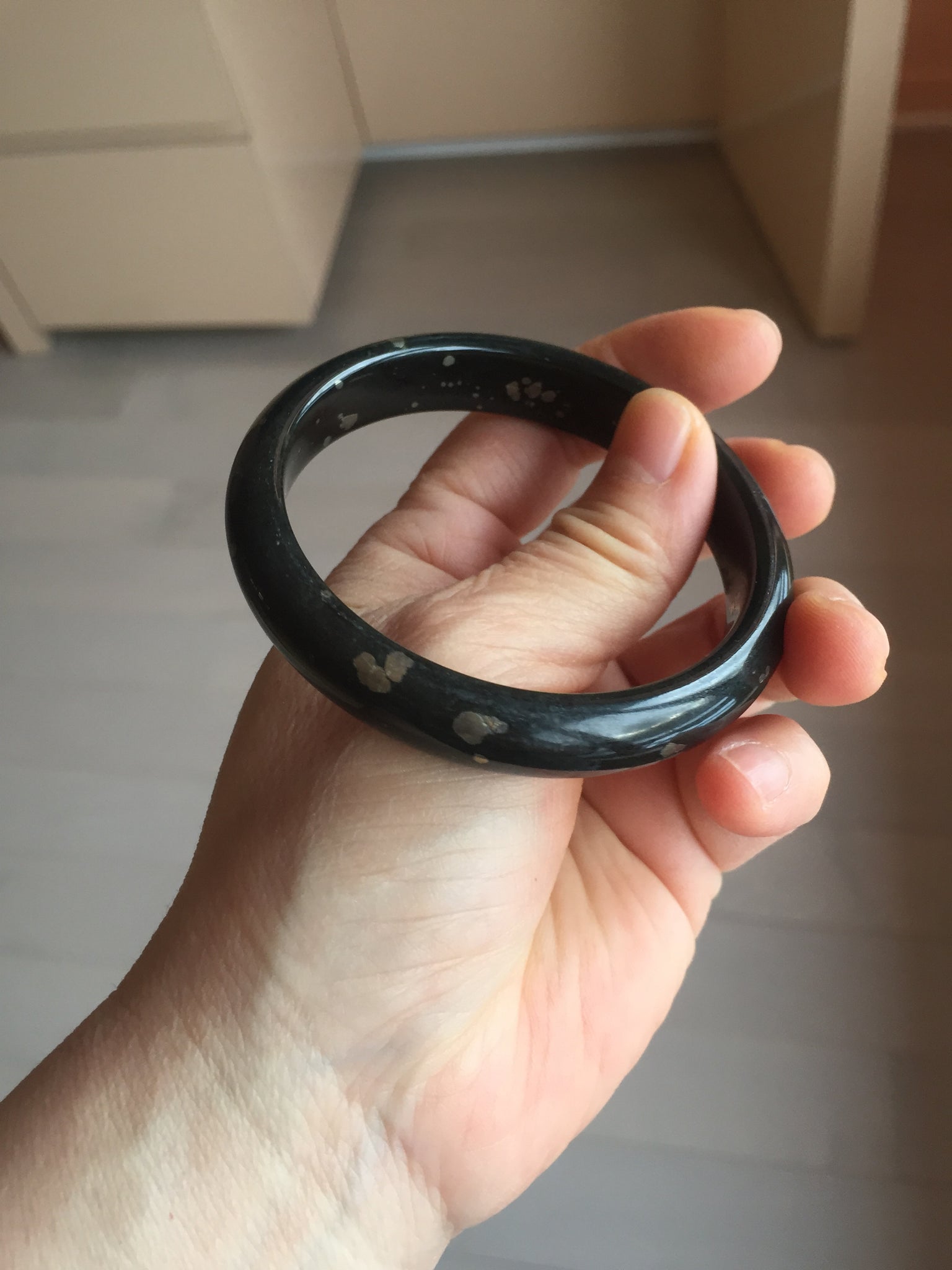No crack. No hairline. Some metal spots. The metal spots are naturally formed, not inlaid. Upon touch, some of the naturally formed metal spots may have a slightly raised edge that can be felt by finger. It is dark green. Under normal light, it is more close to black.