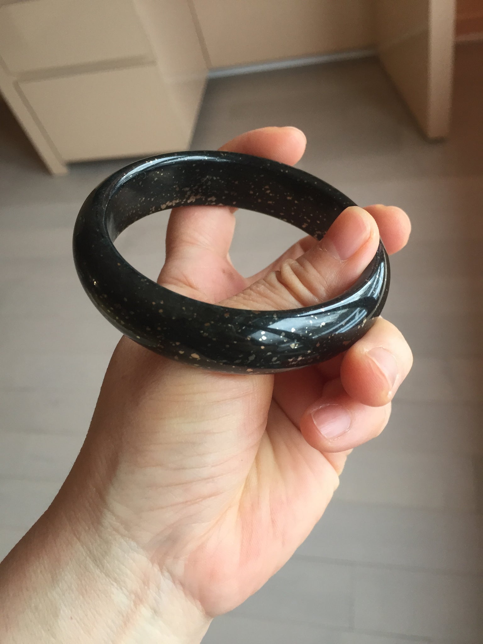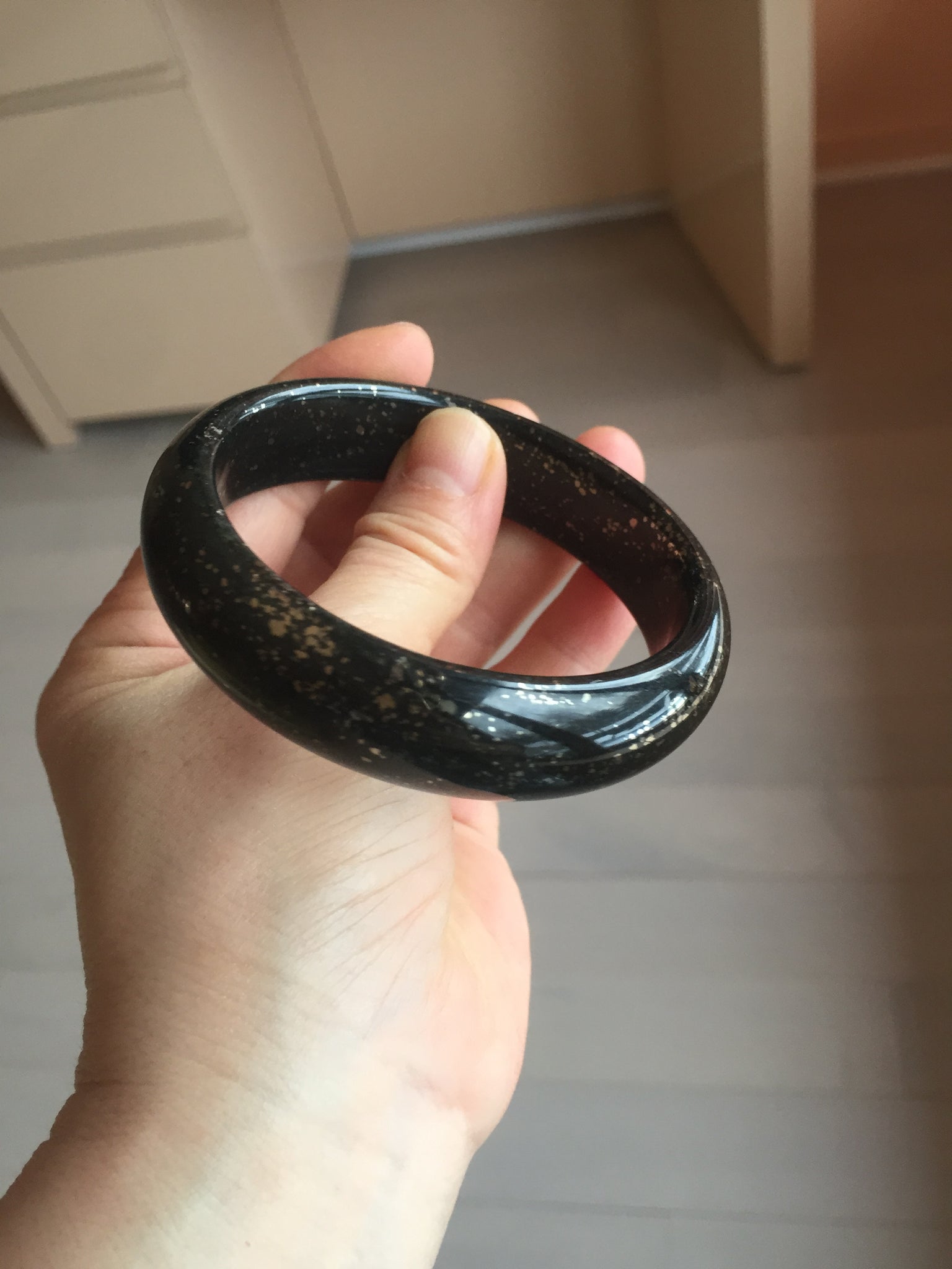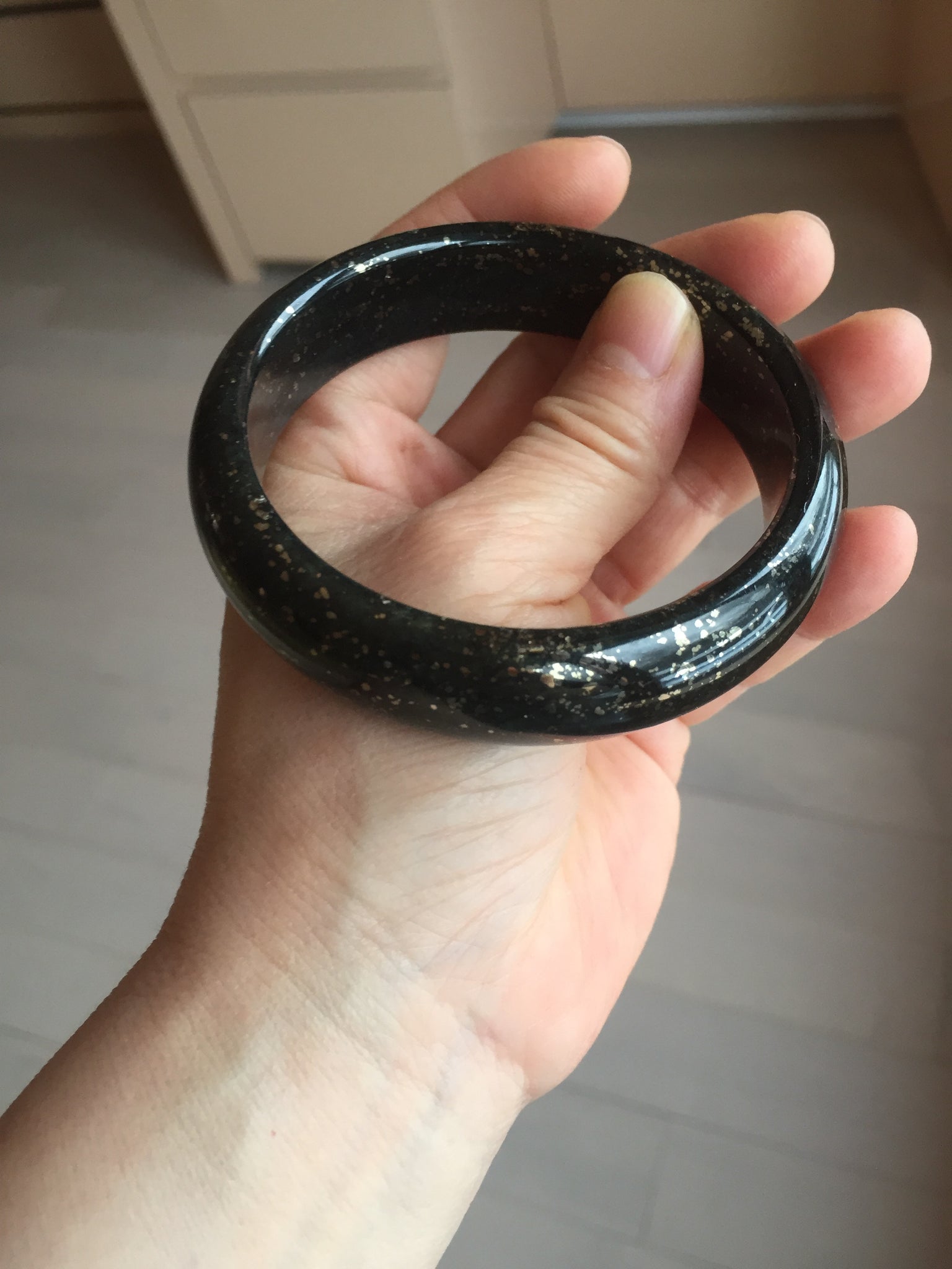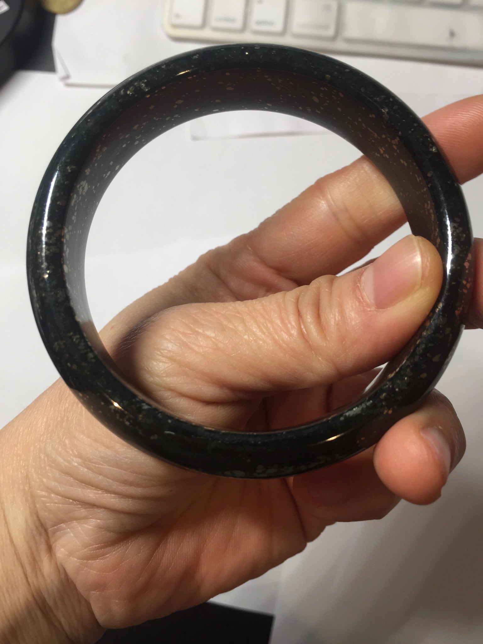 No crack. No hairline. Some metal spots. The metal spots are naturally formed, not inlaid. A few metal spots surface are not smooth or with mine pits. Some small rough spots. It is dark green. Under normal light, it is more close to black.