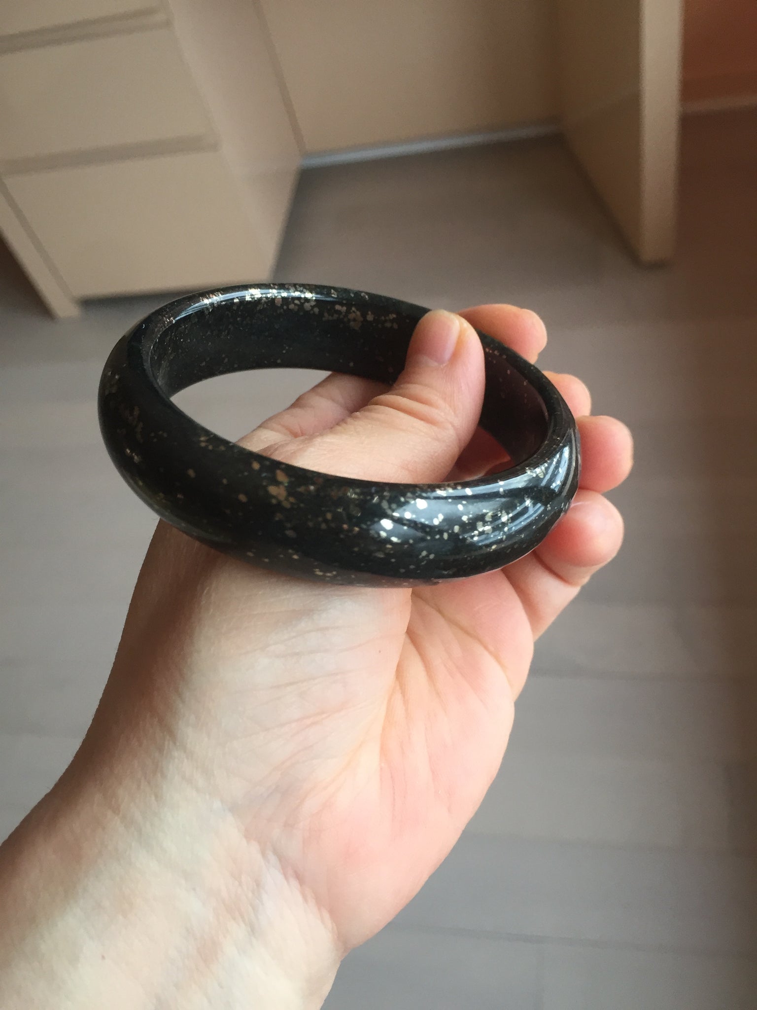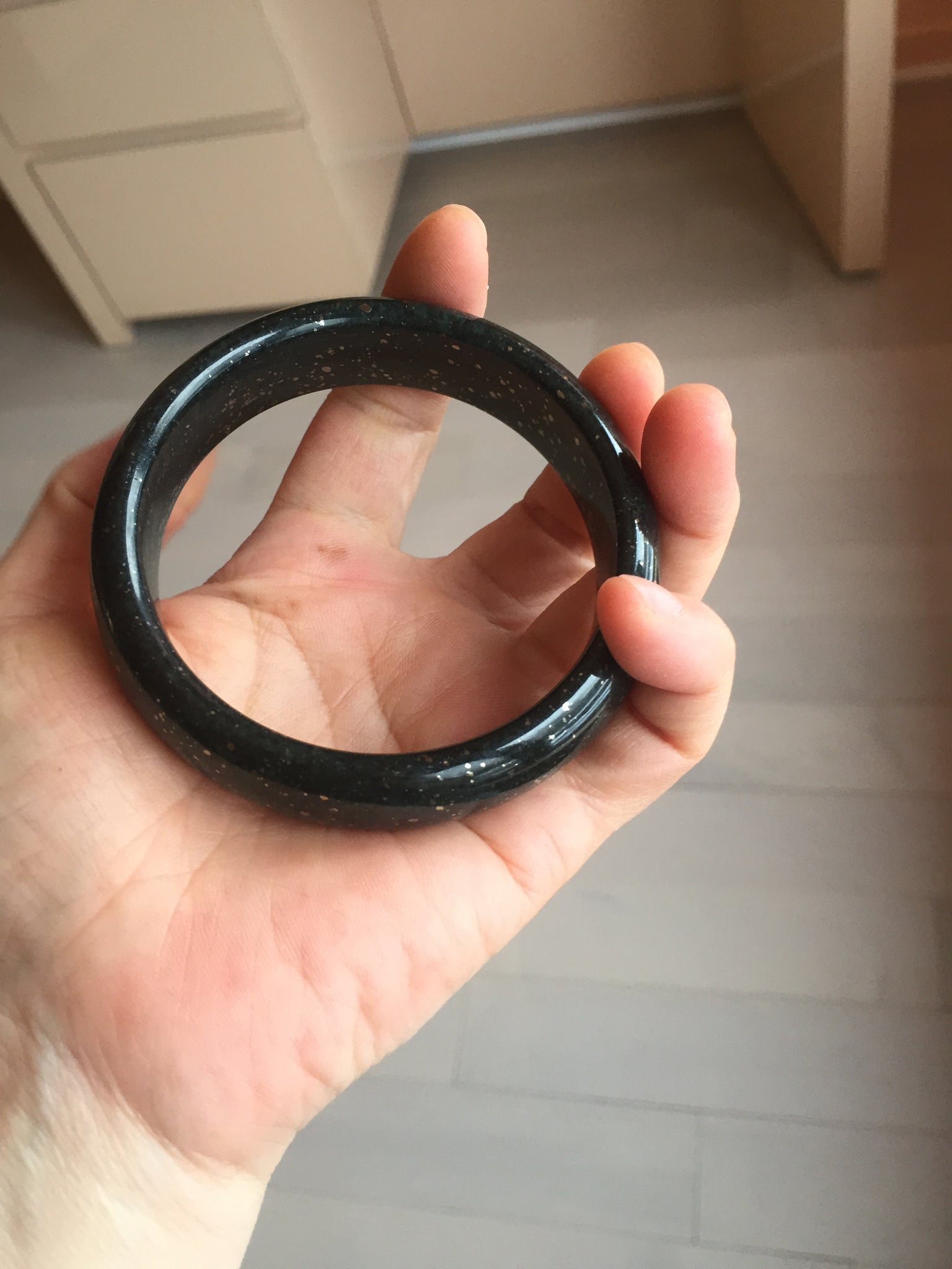 62/16.8/8mm With dark green and black color and metallic specks.