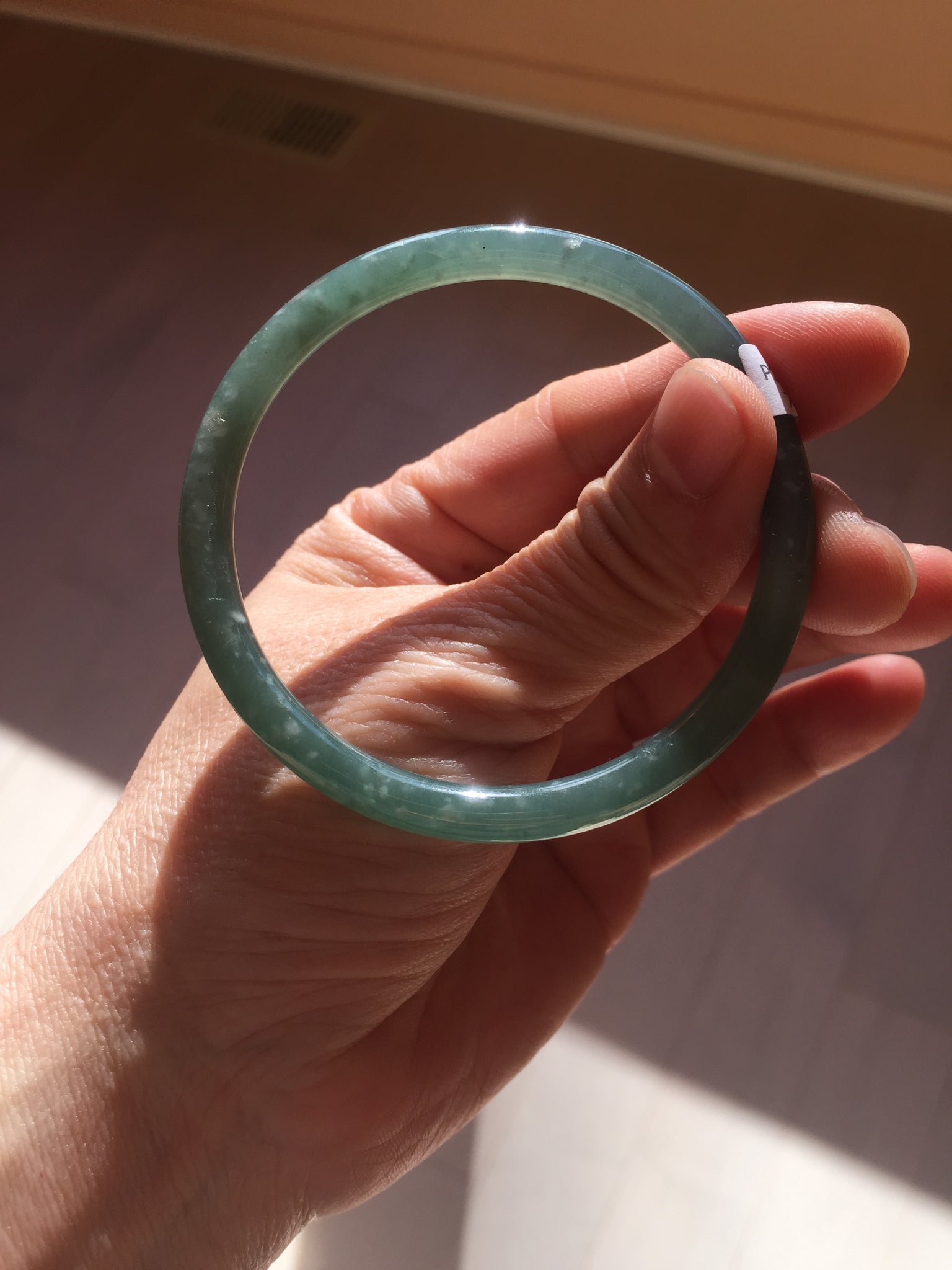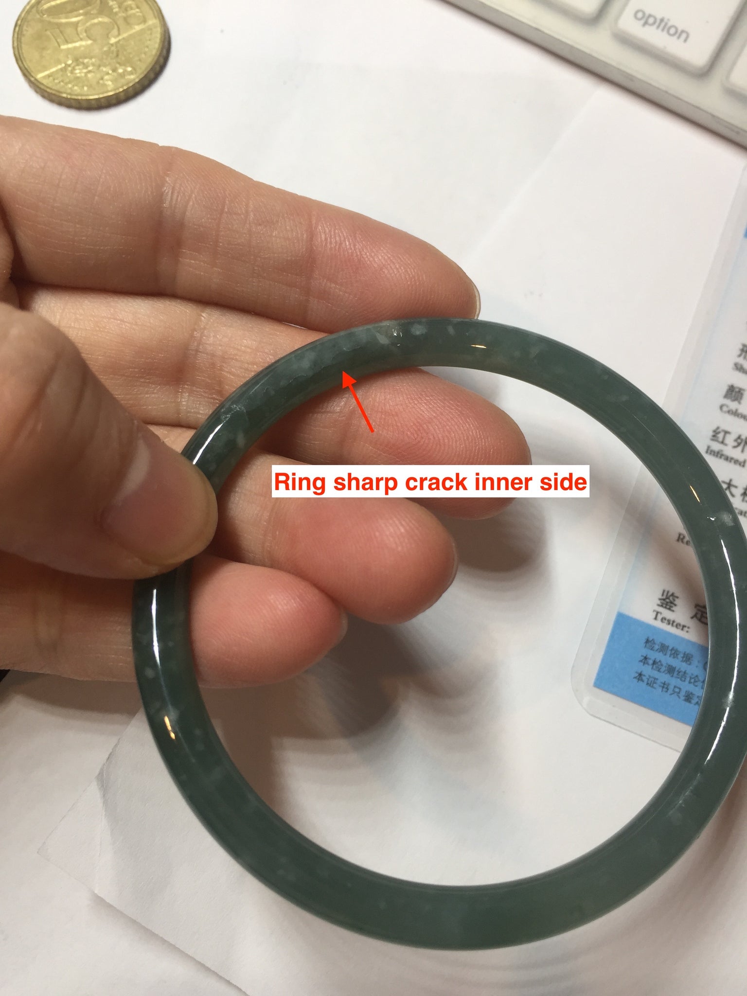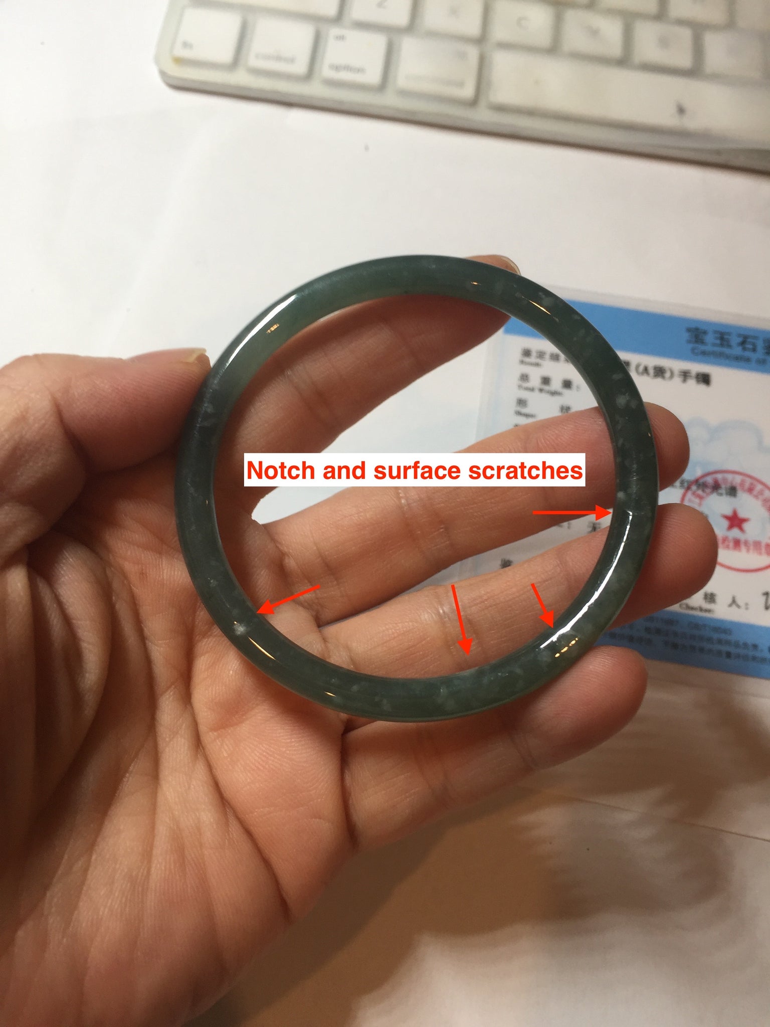 One ring shape surface crack. The bangle is solid. Some rough surfaces cotton areas. Some cotton areas,cotton lines and cotton spots. The bangle has some gray/ black color.