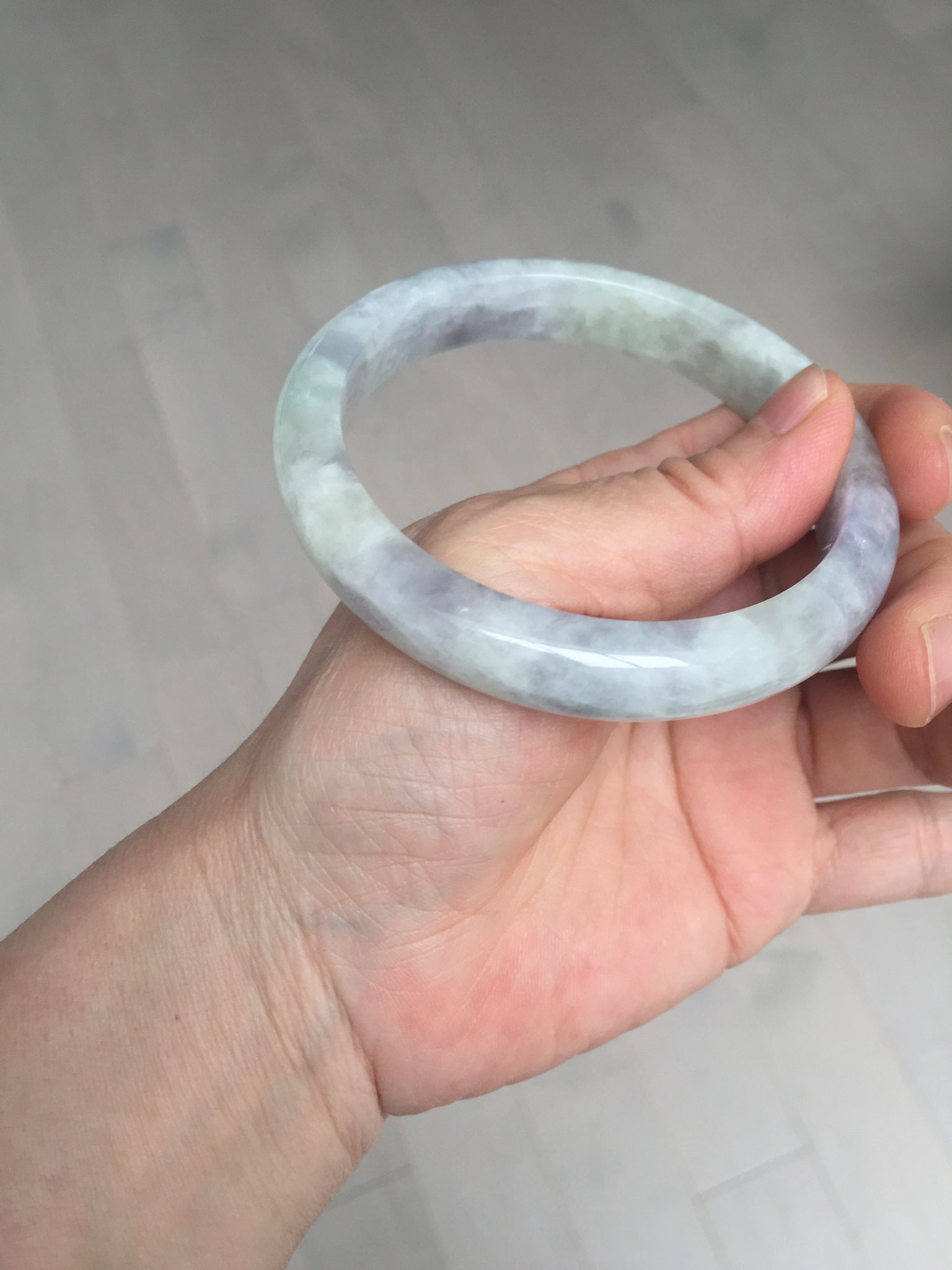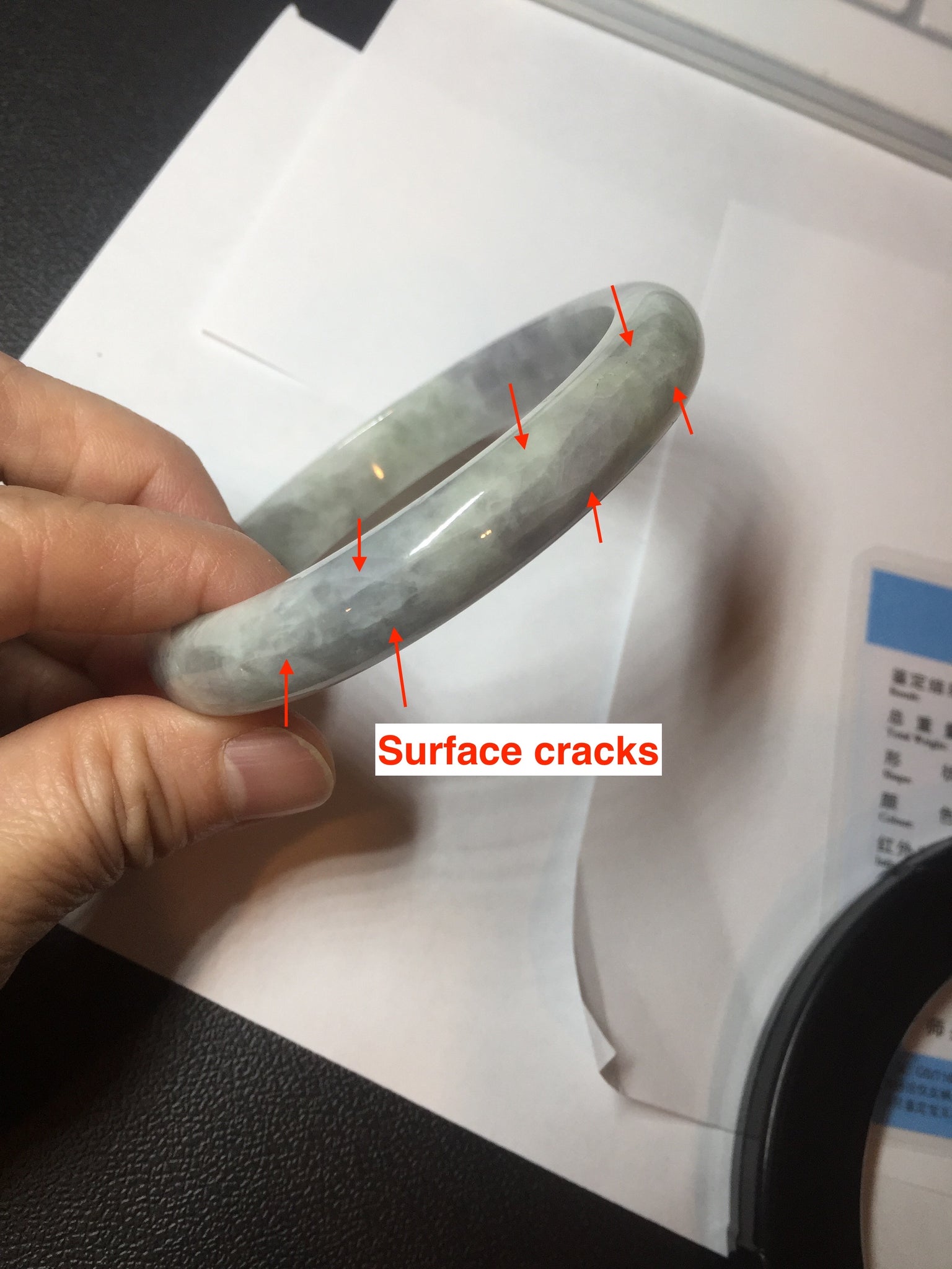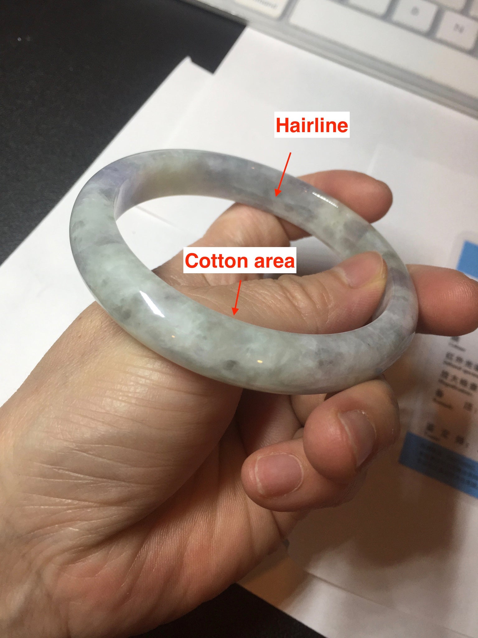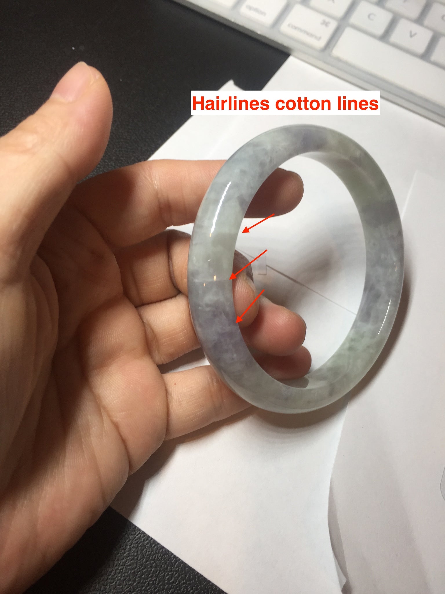 Some surface cracks. The bangle is solid(Guaranteed!). The texture is not fine. Some hairlines and cotton lines. Some blisters. Quite a lot of cotton areas(May not be showed all due to the photo space limit). The purple lighter than in the photos due to the purple color always being more camera-friendly.