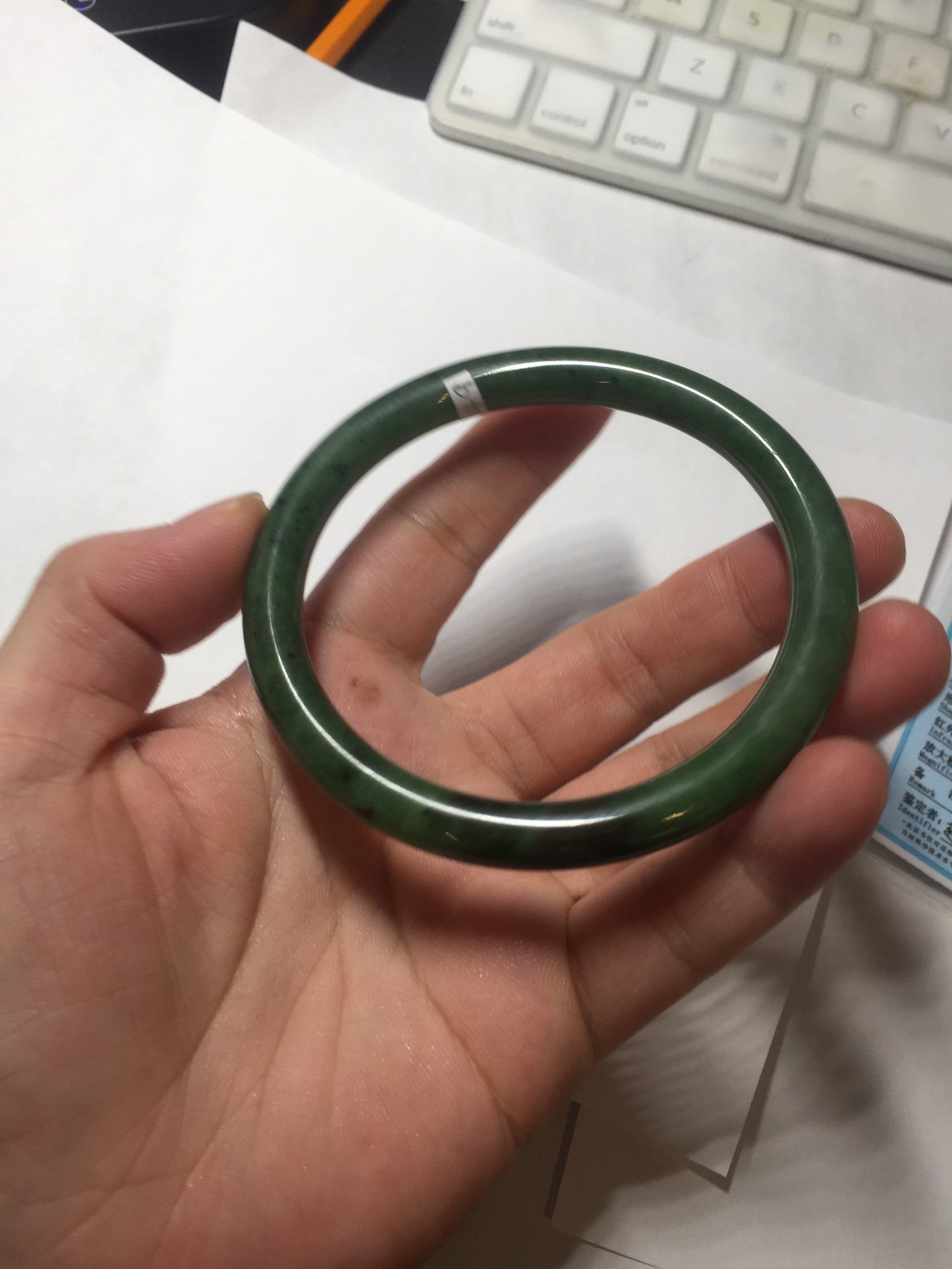 Imperfections: No crack. No hairlines.Some cottot spots. Some black cloudiness and spots. Has black colors. Under normal light, it is close to dark green/black.