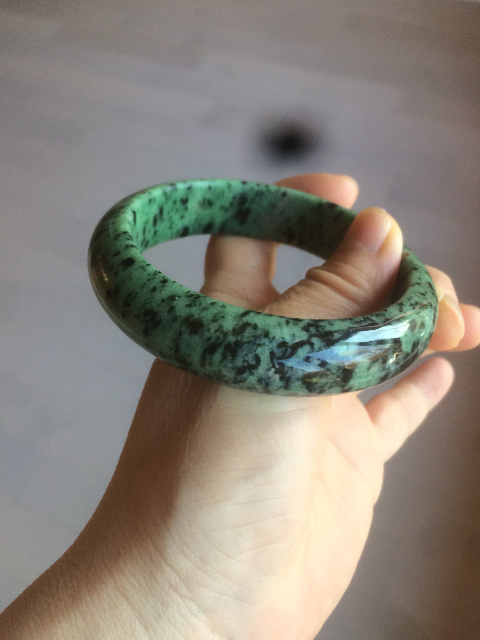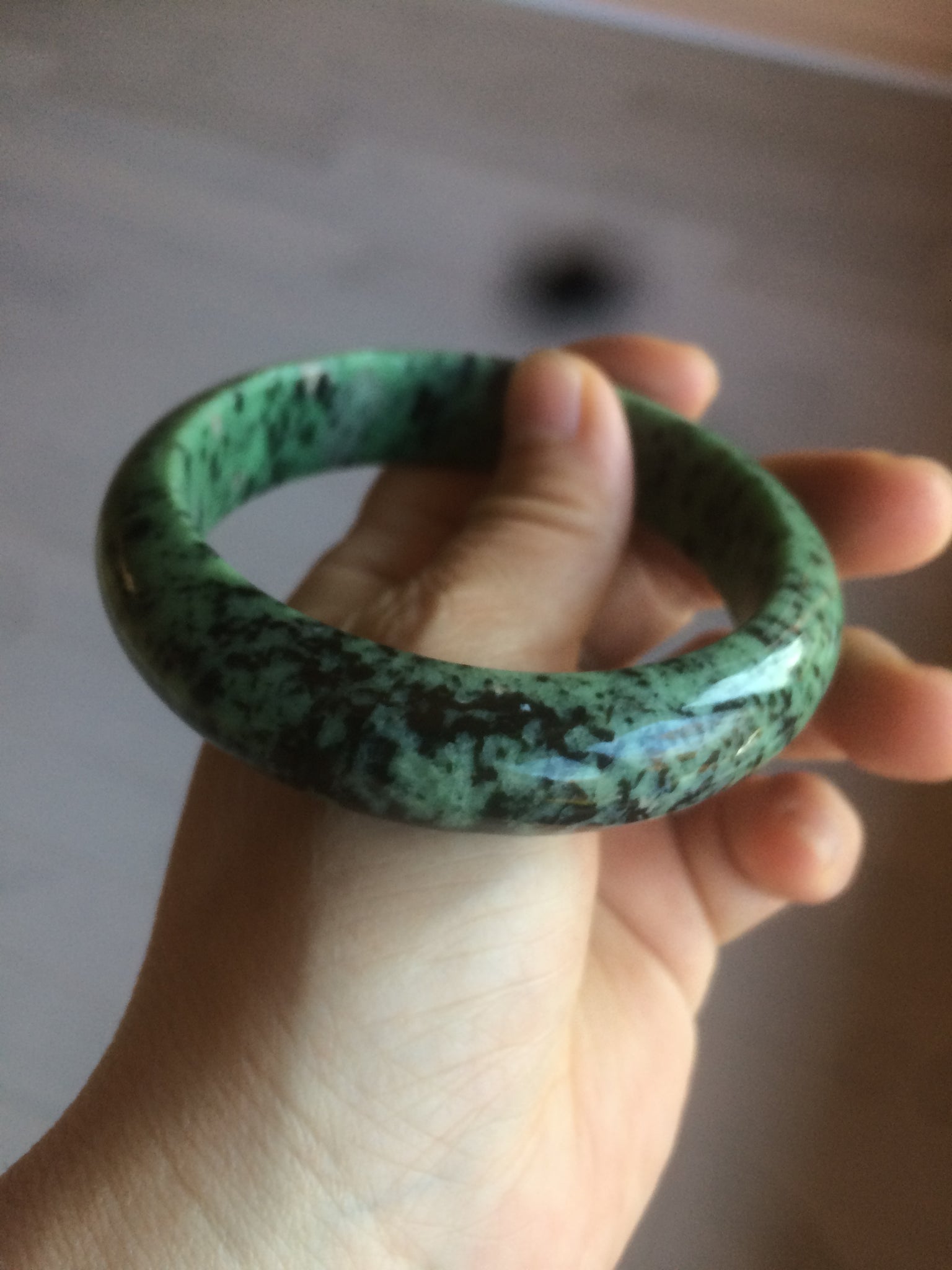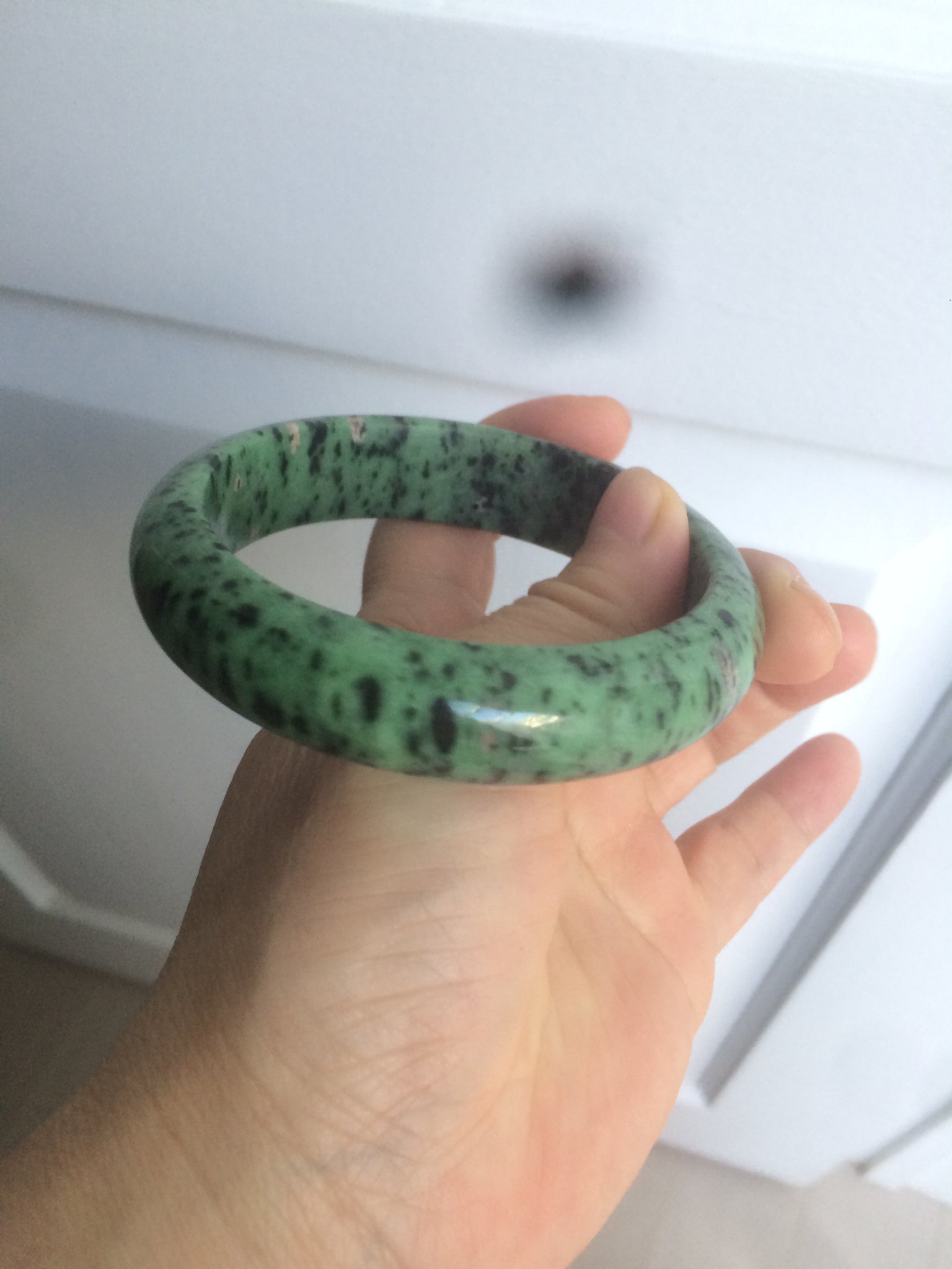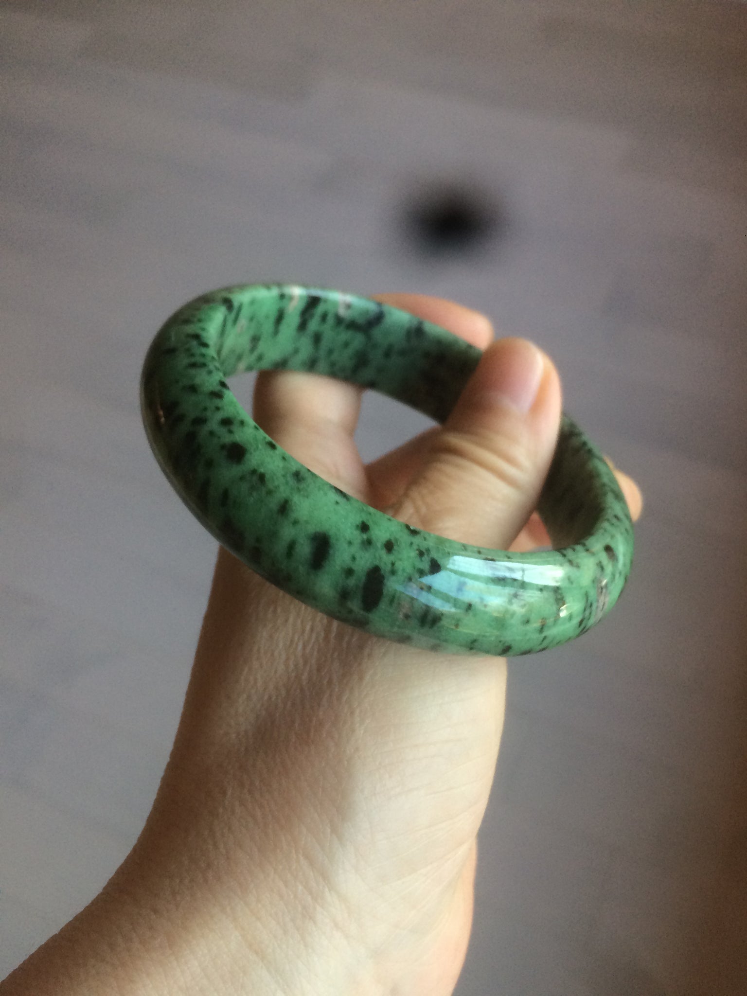 红绿宝手镯,红绿宝简单的说就是低级版本的红宝石绿宝石黑碧玺共生。 这个手镯绿色很浓, 黑点很多,红色就算没有吧。