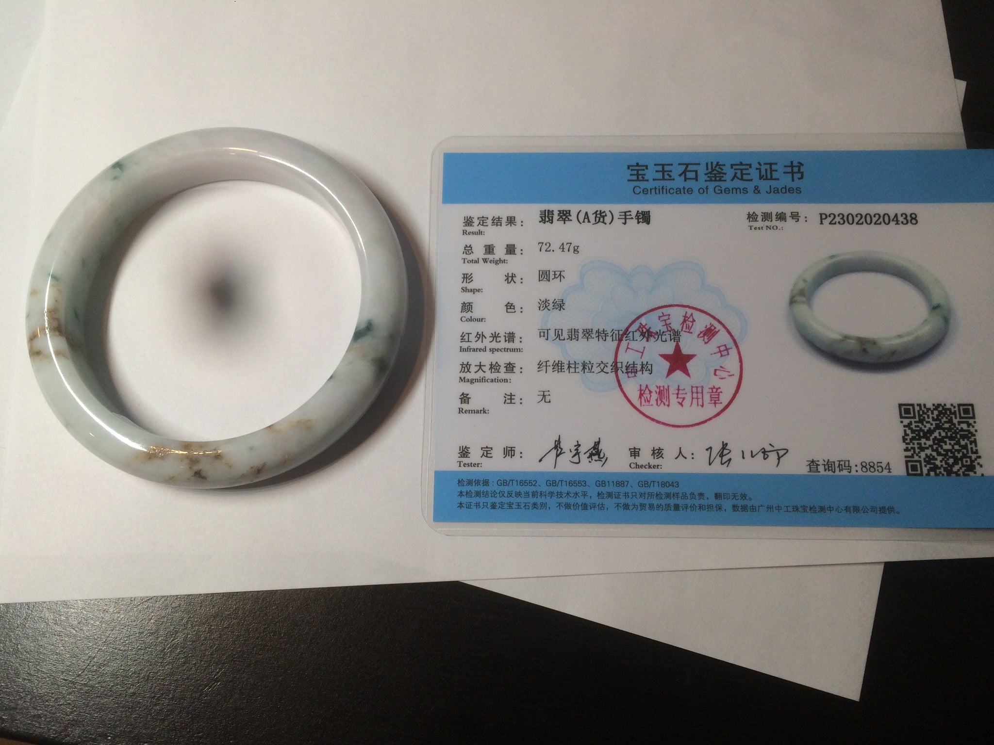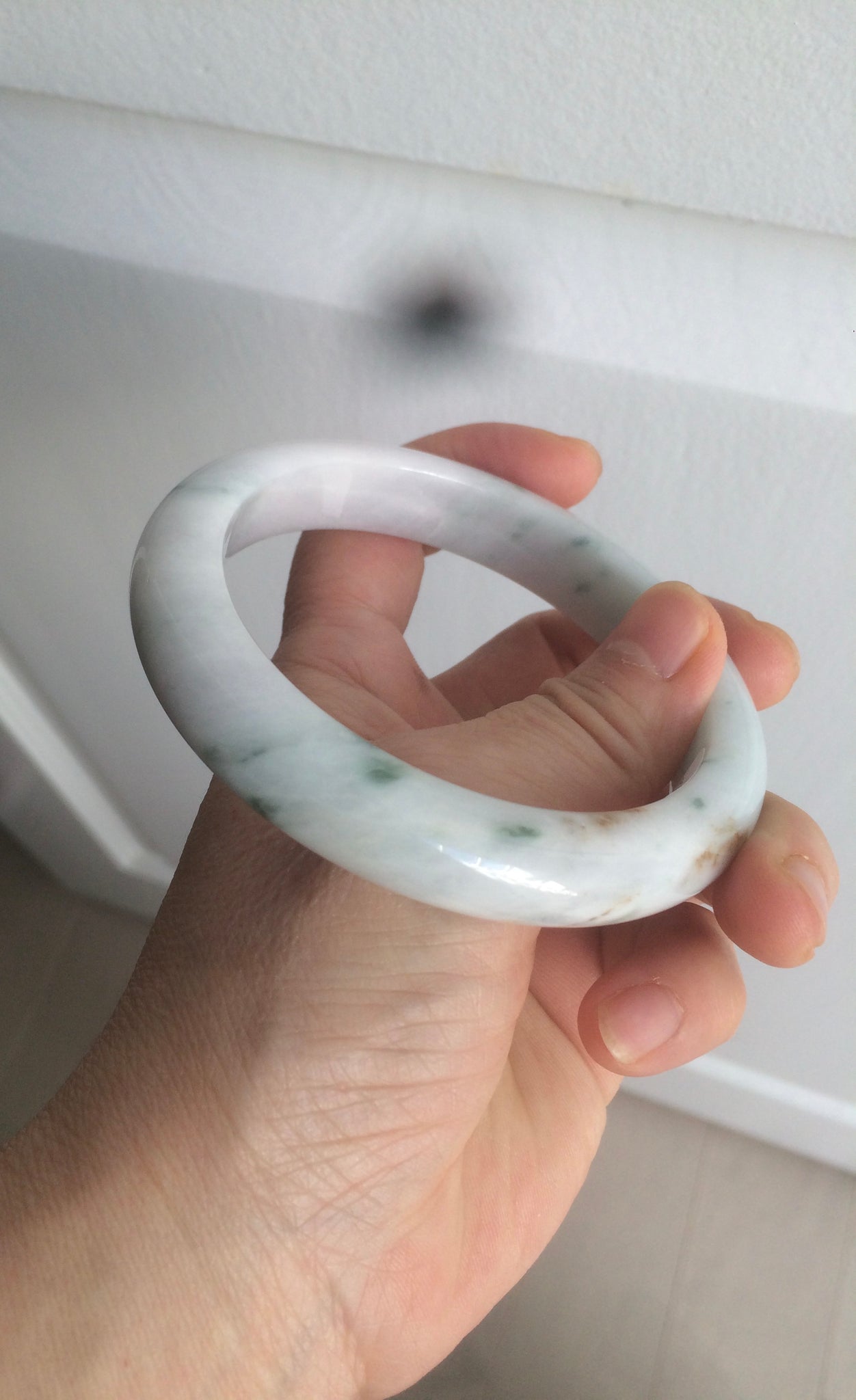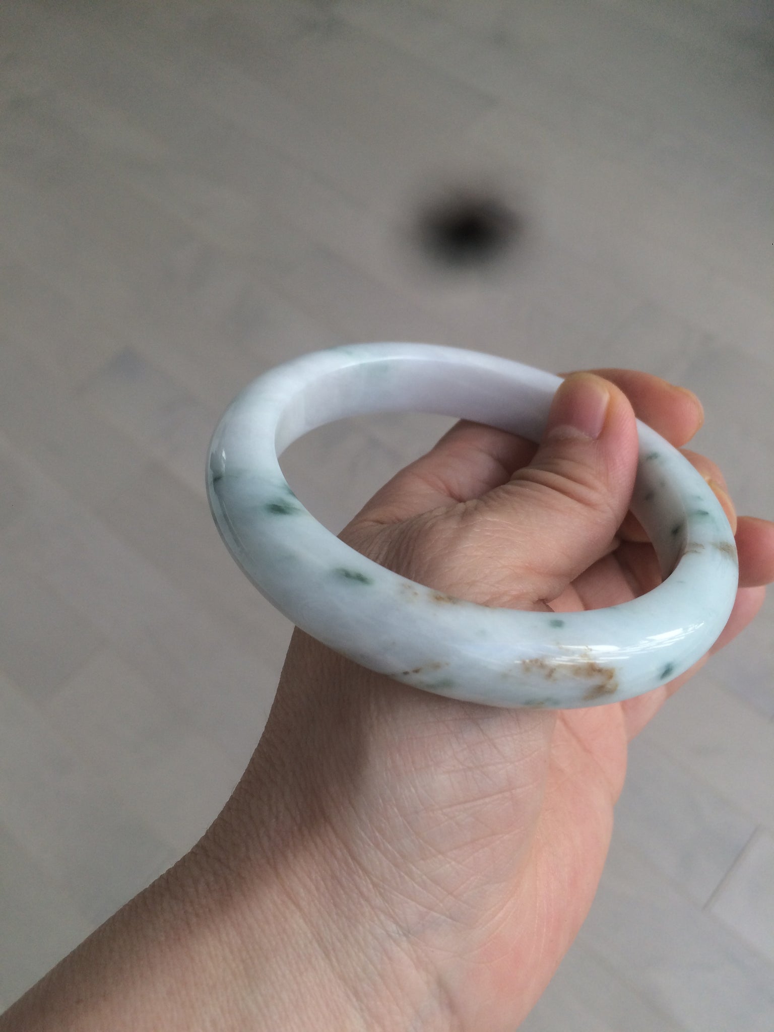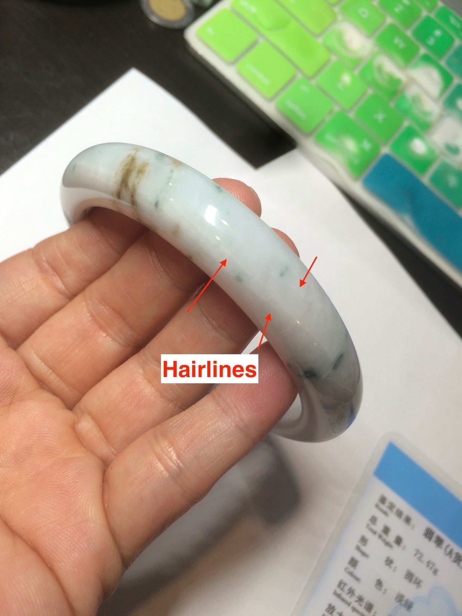 Imperfections: No crack. Some hairlines(photos may not show all). Some are long. Some color roots. The bangle is still solid(guareented!) The surface of the brown color root is not smooth due to the texture difference. Cotton lines and spots. The purple is super light. Lighter than in photos. Porcelain background. Not transparent.