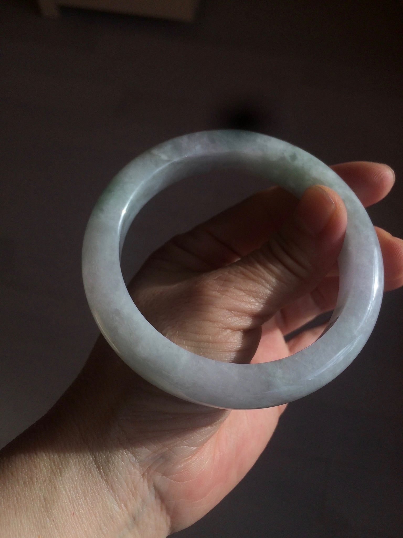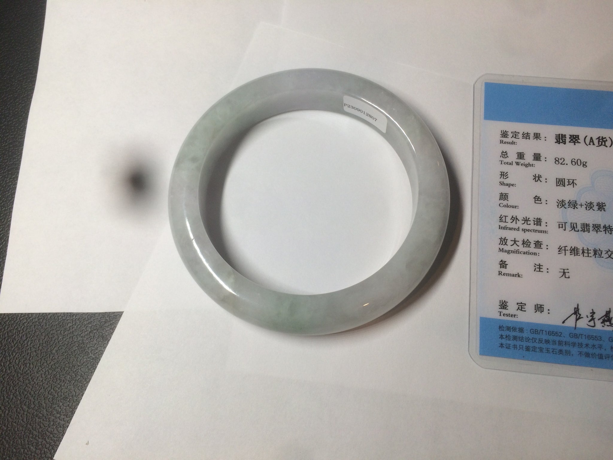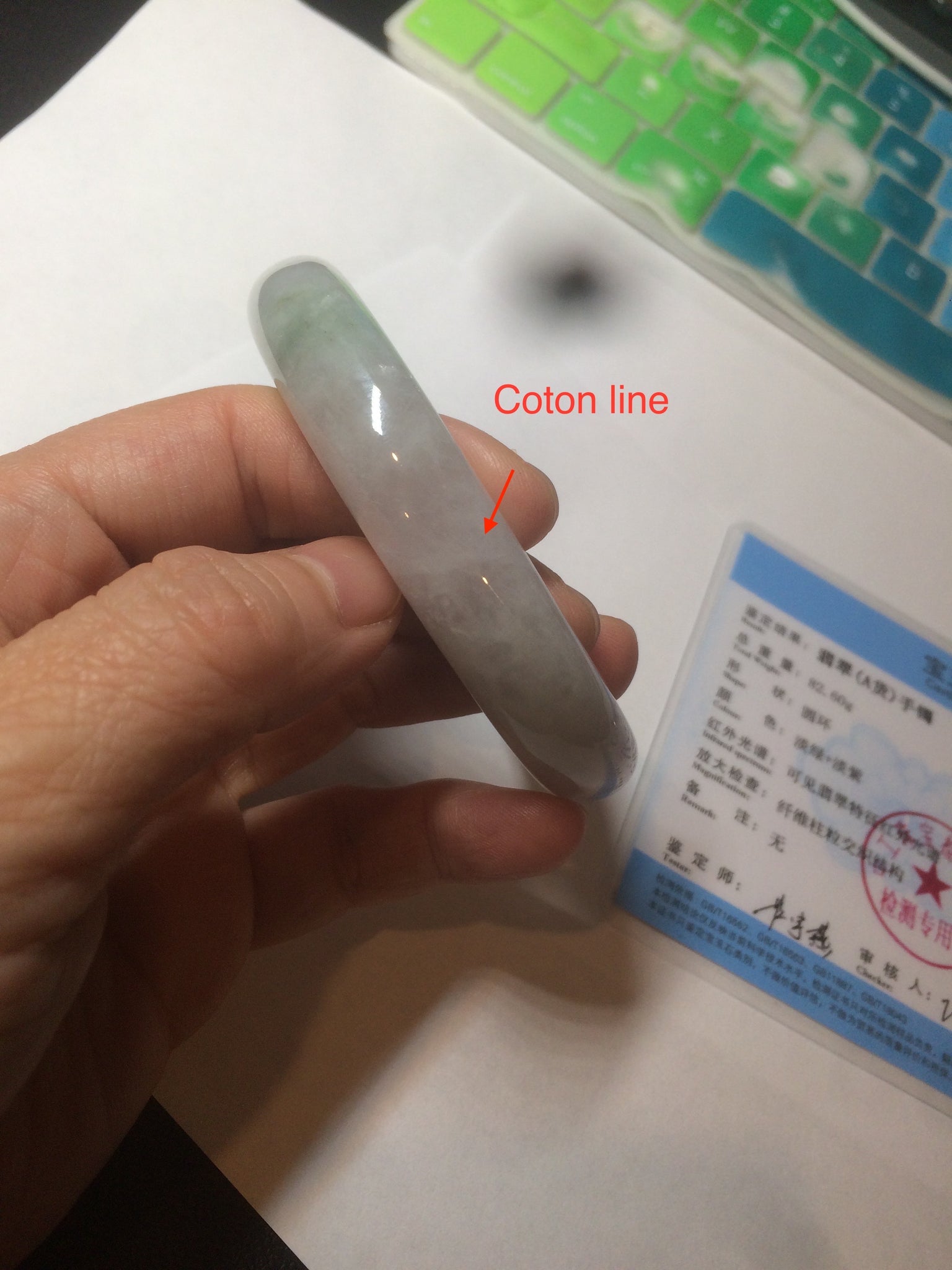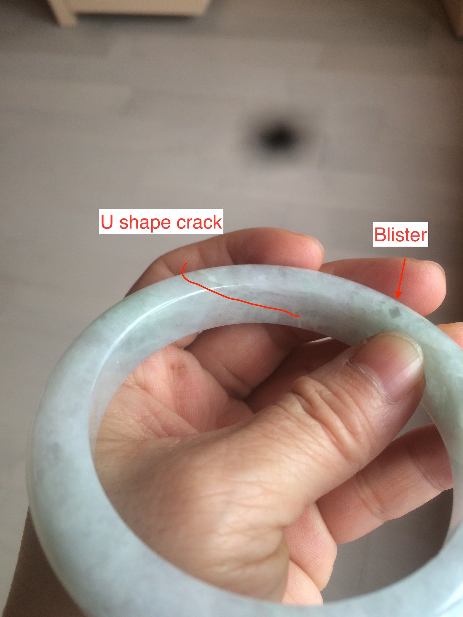 Some cracks. The bangle is solid (Guaranteed!). Make a high-pitched sound when clicked. Quite a lot of hairlines cotton lines, spots, blisters, and areas. The purple is super light. It's only just a hint of purple.