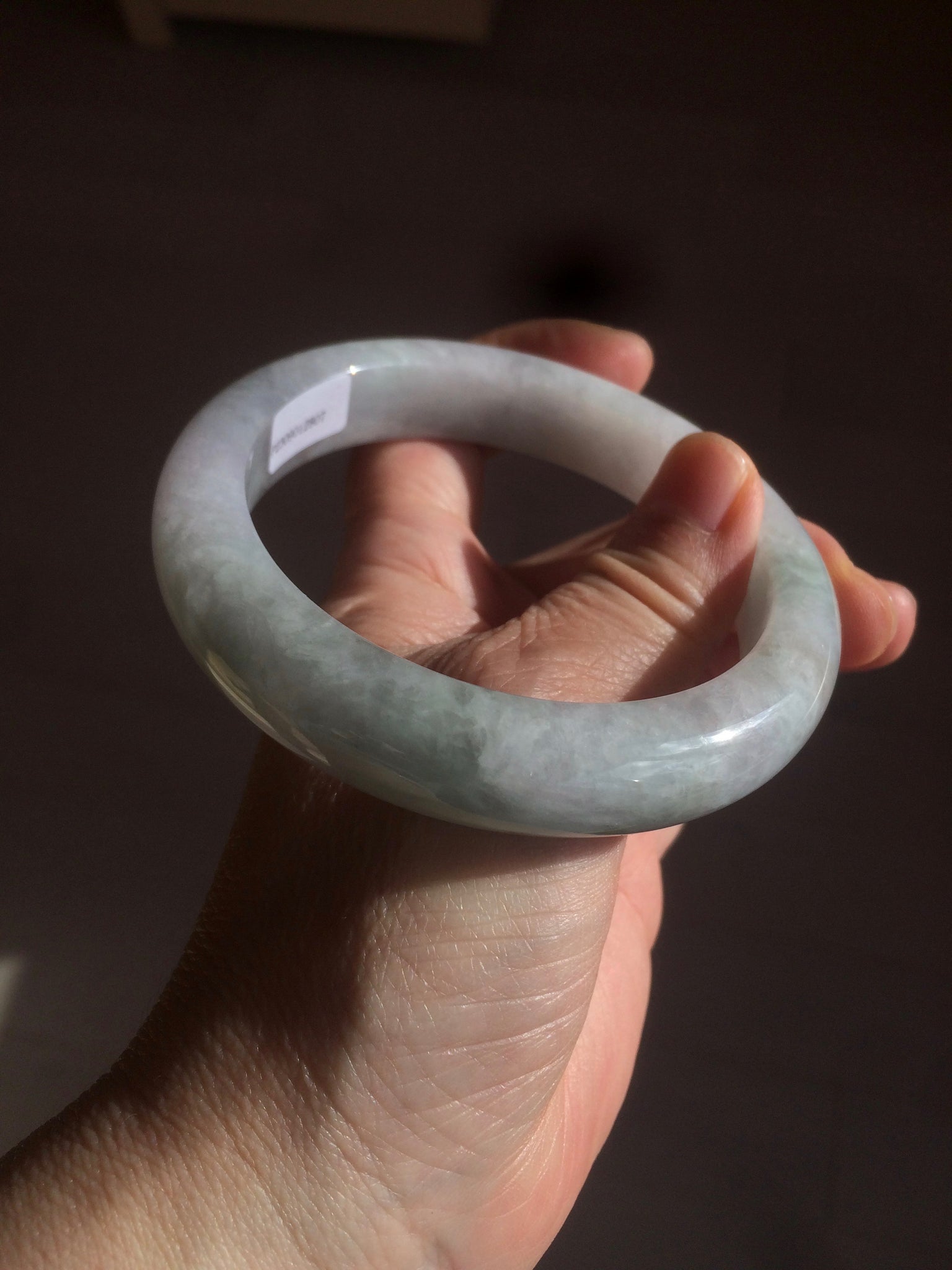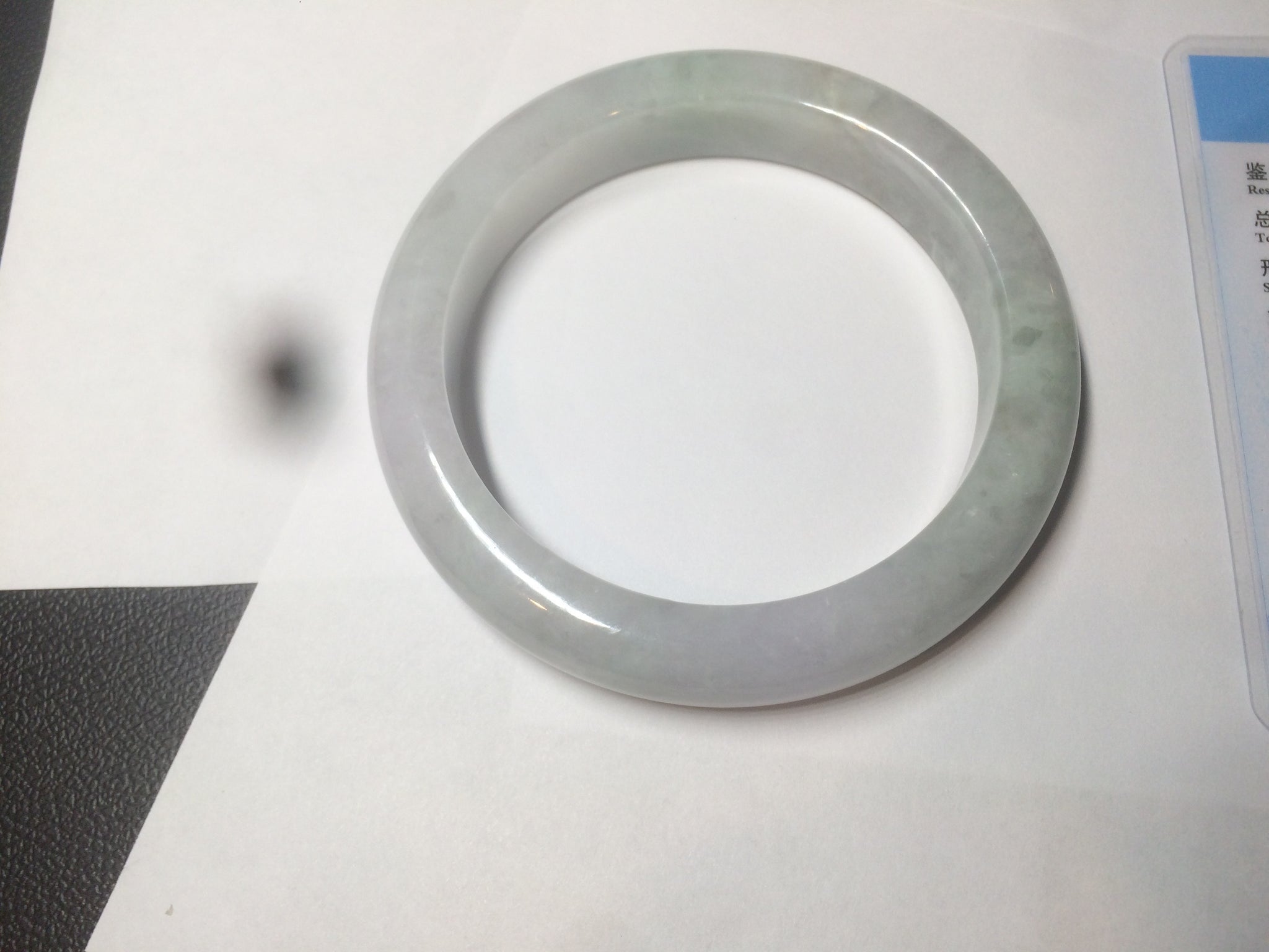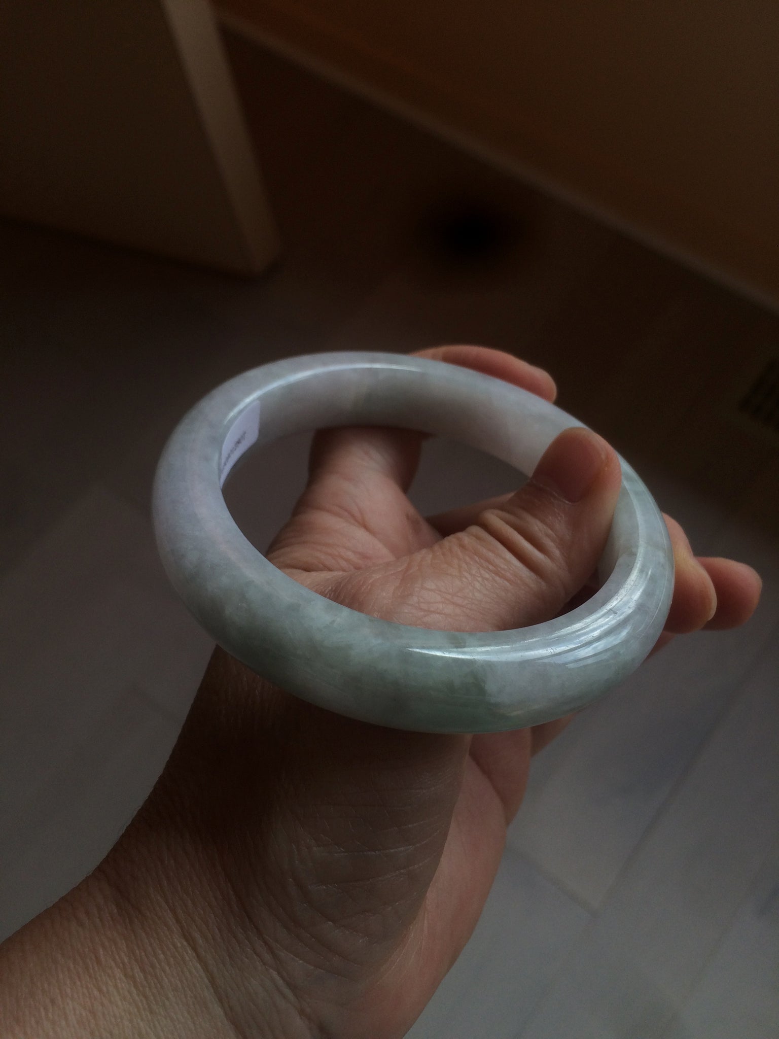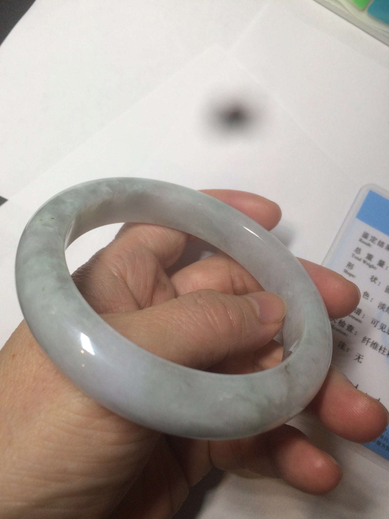 Some cracks. The bangle is solid (Guaranteed!). Make a high-pitched sound when clicked. Quite a lot of hairlines cotton lines, spots, blisters, and areas. The purple is super light. It's only just a hint of purple.