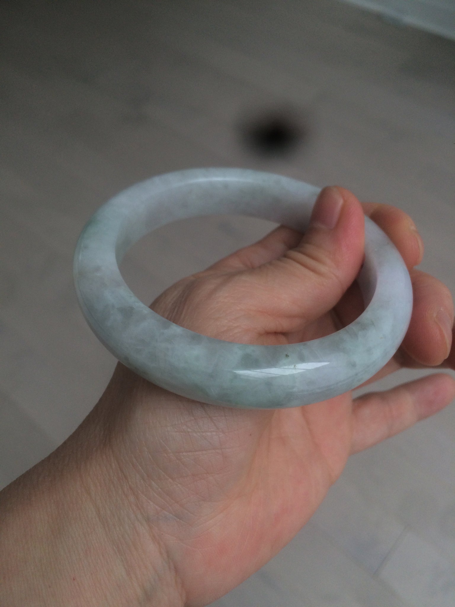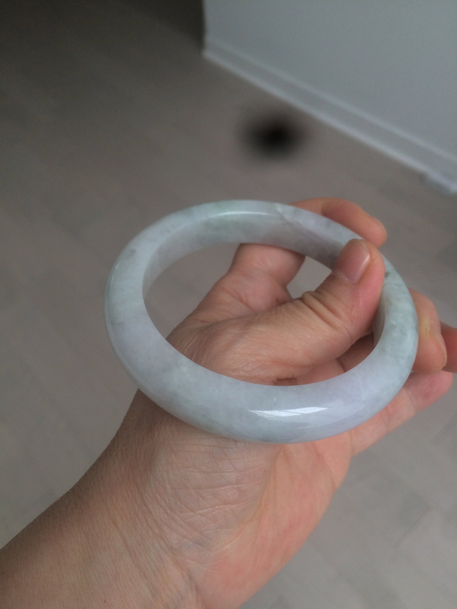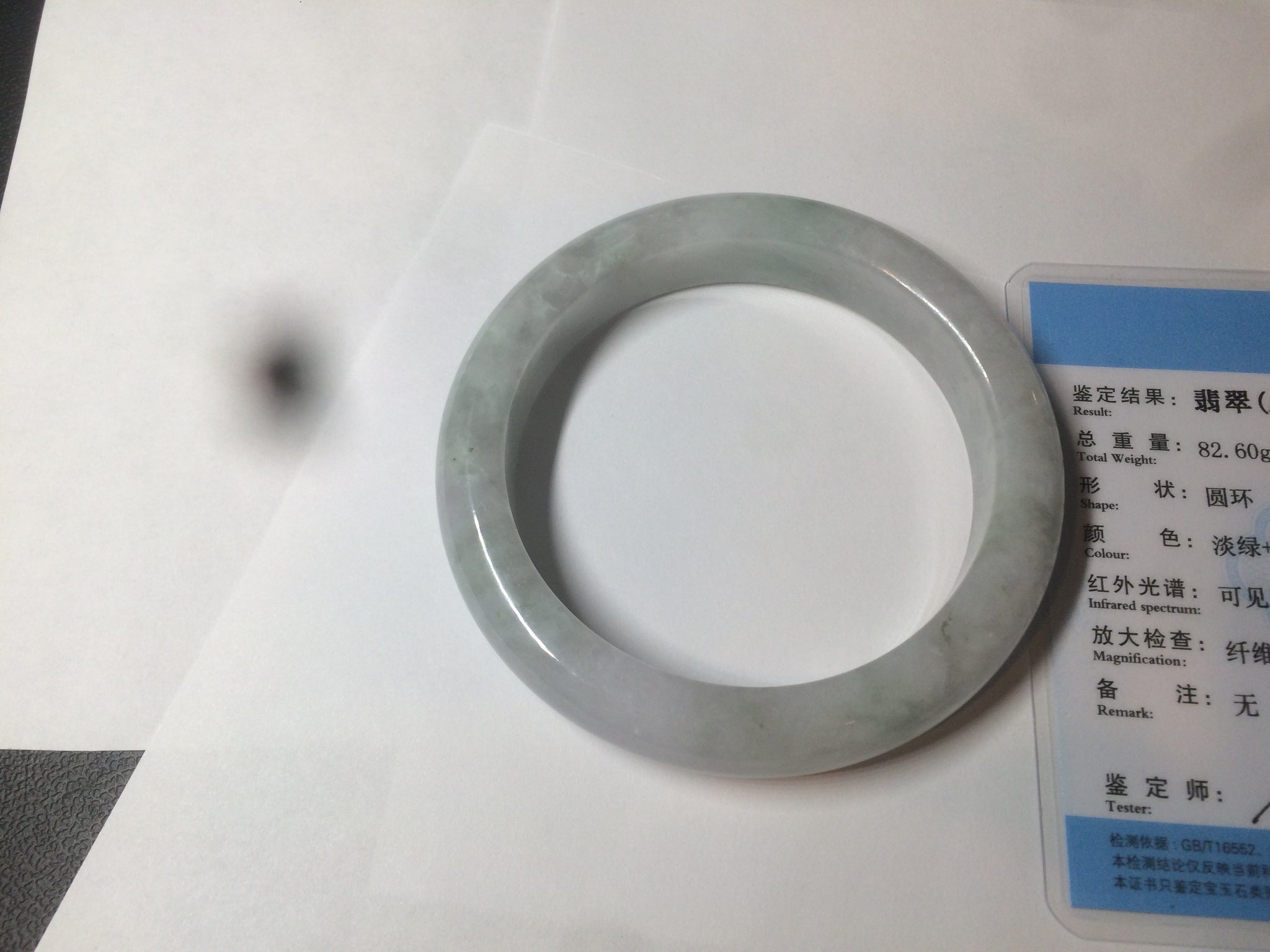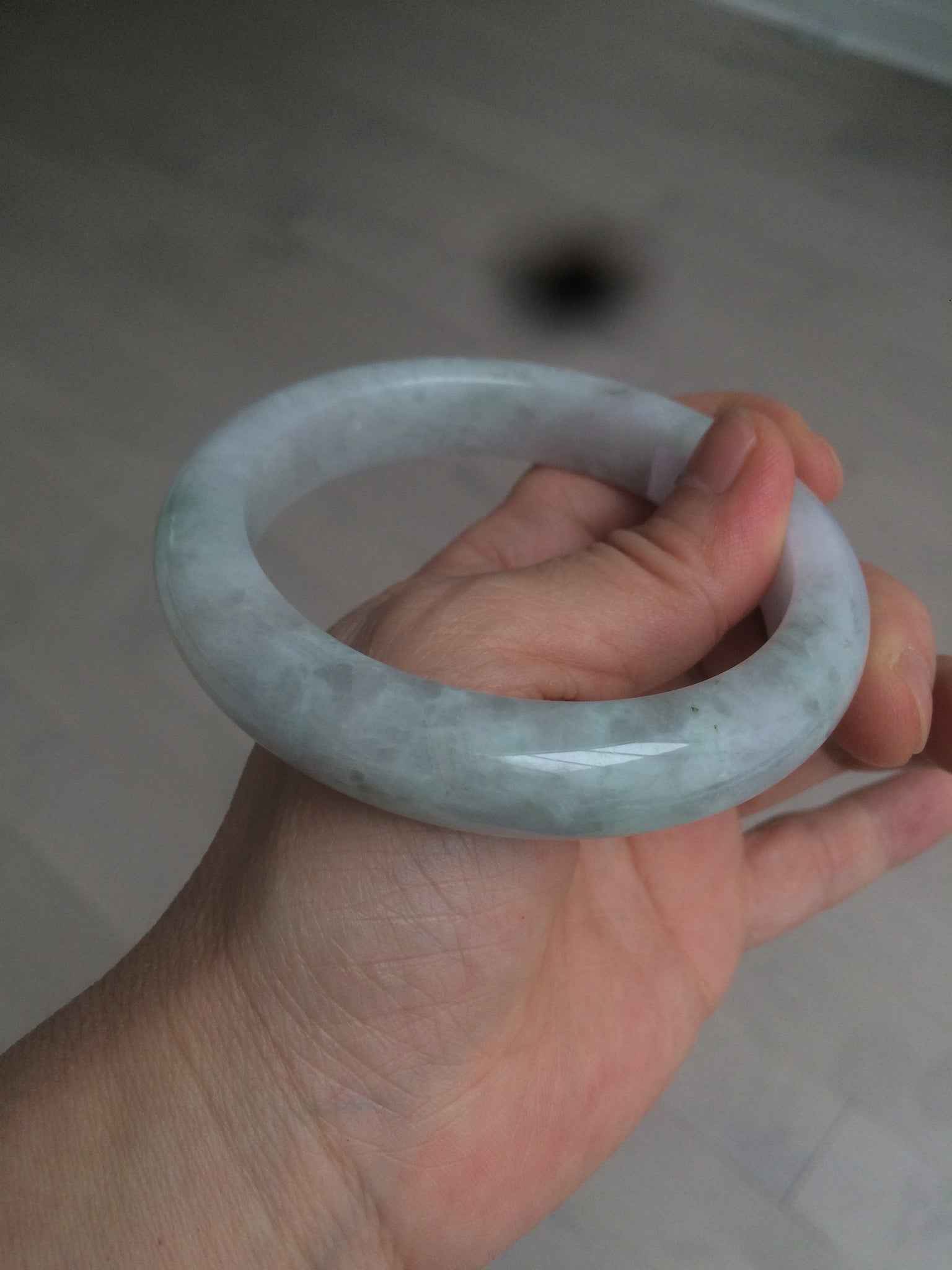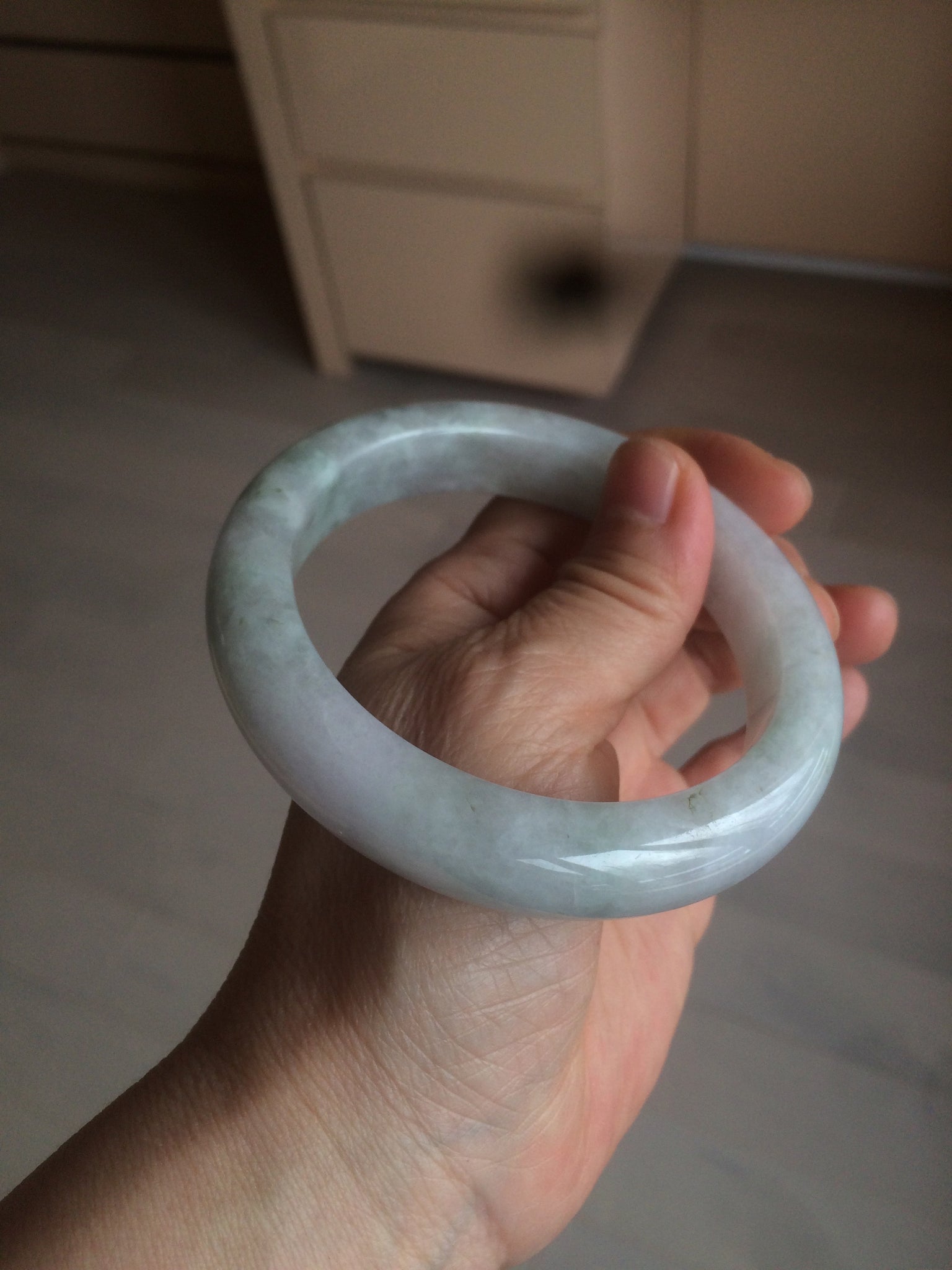 Some cracks. The bangle is solid (Guaranteed!). Make a high-pitched sound when clicked. Quite a lot of hairlines cotton lines, spots, blisters, and areas. The purple is super light. It's only just a hint of purple.