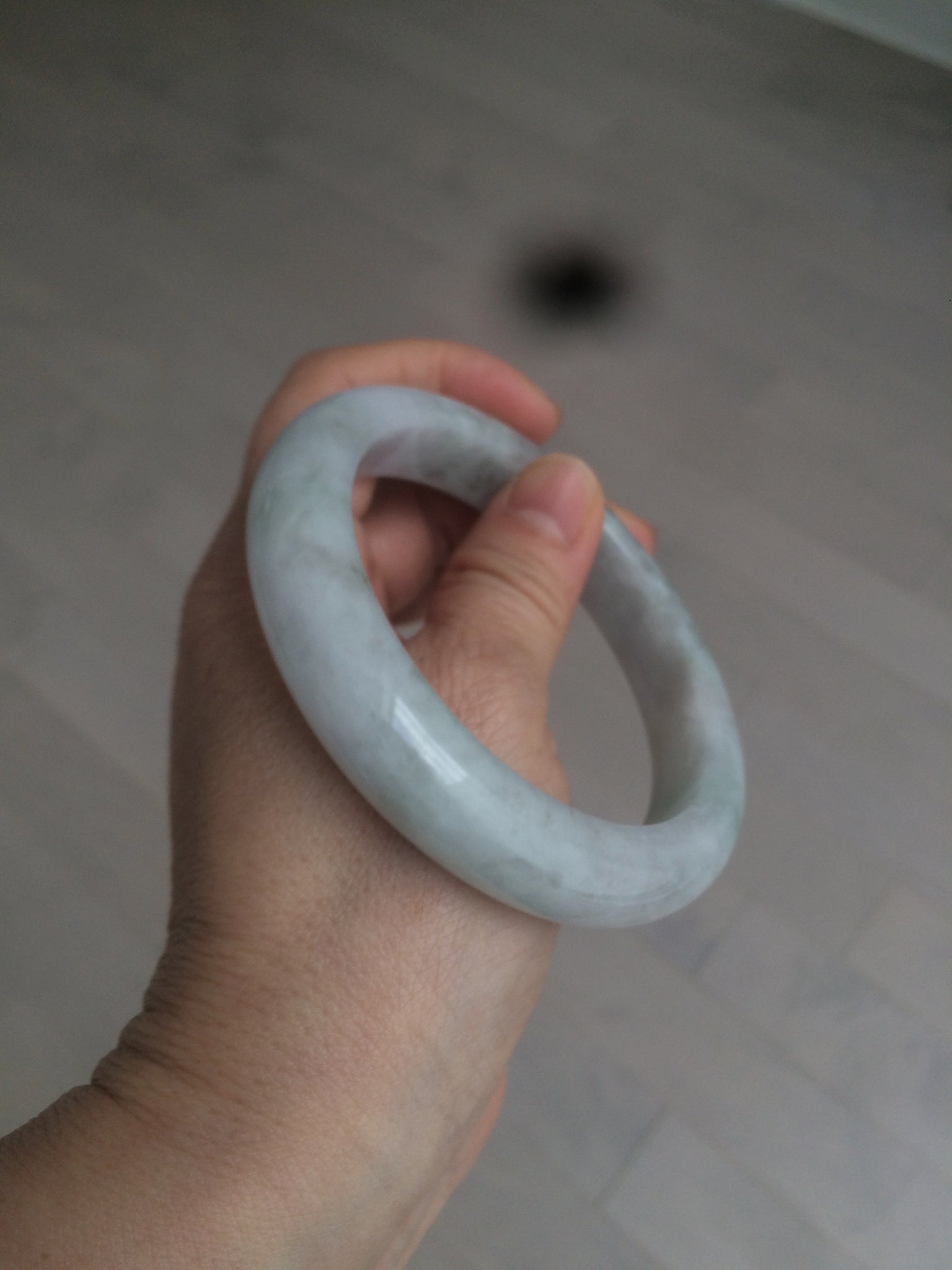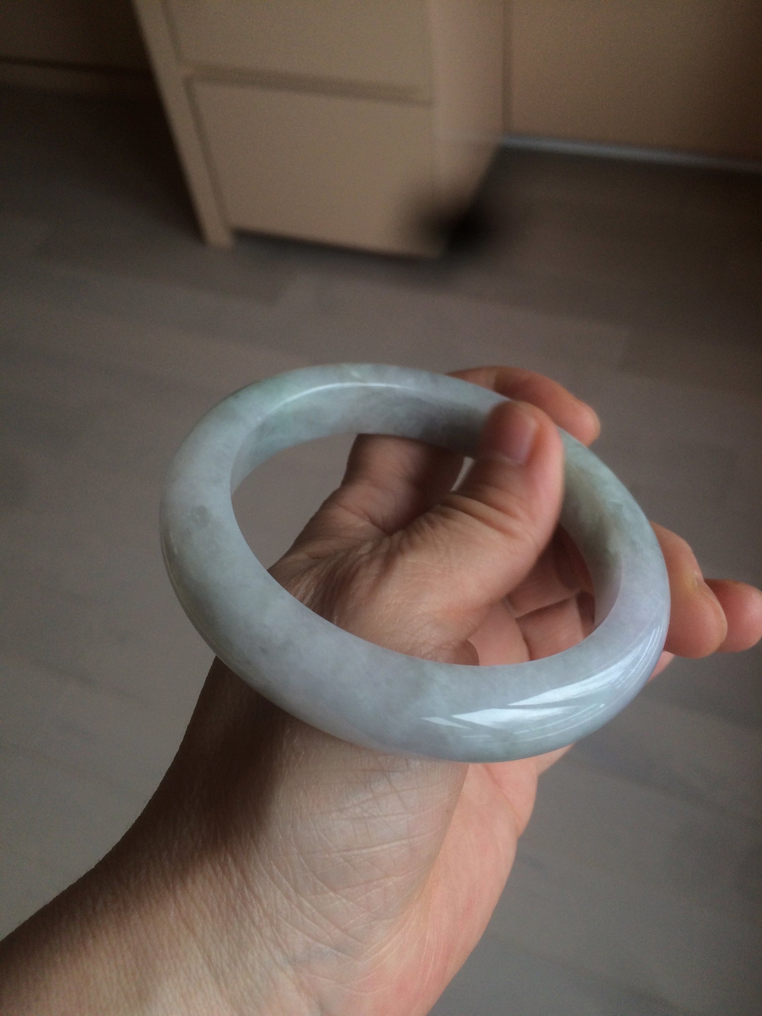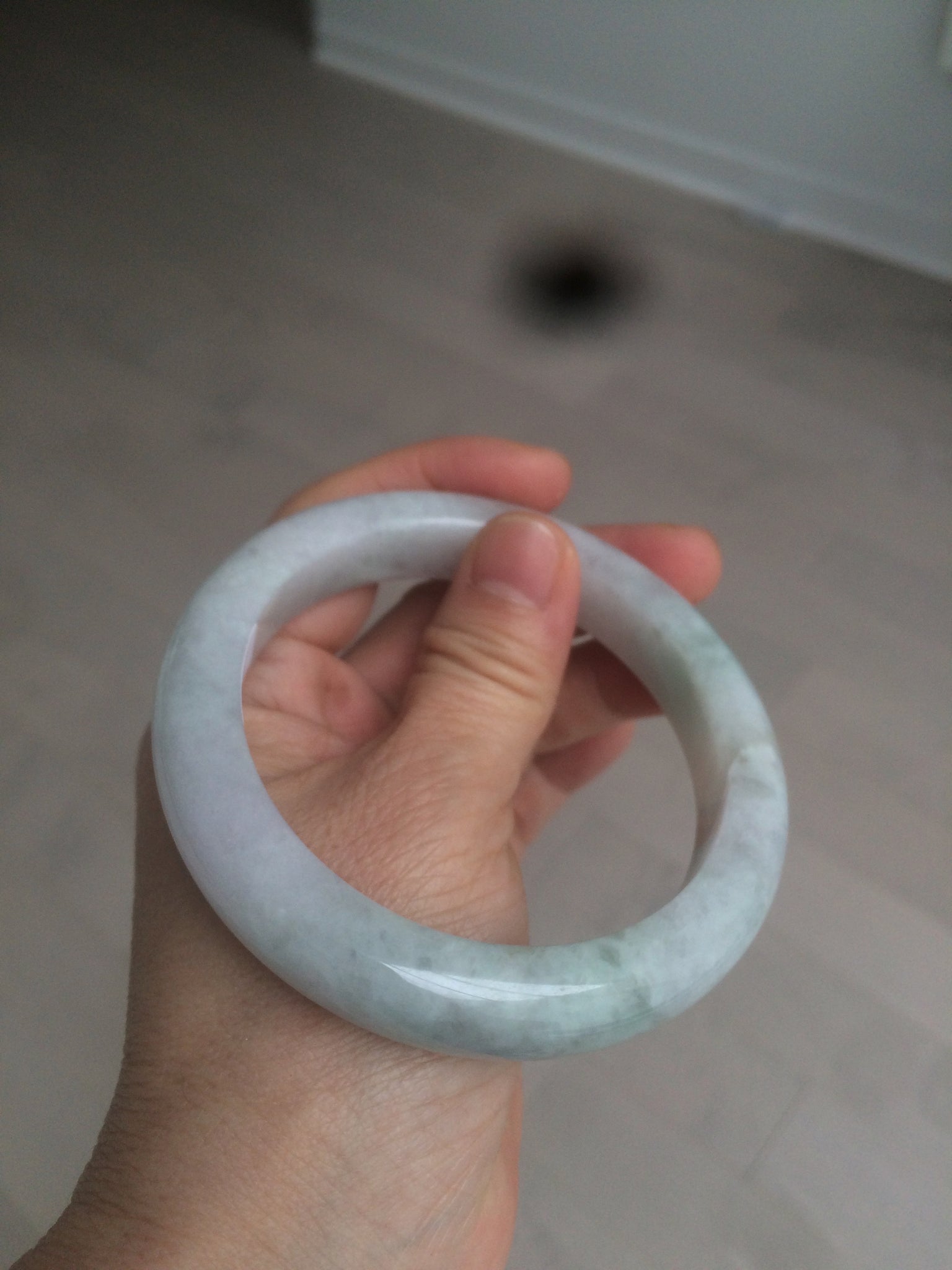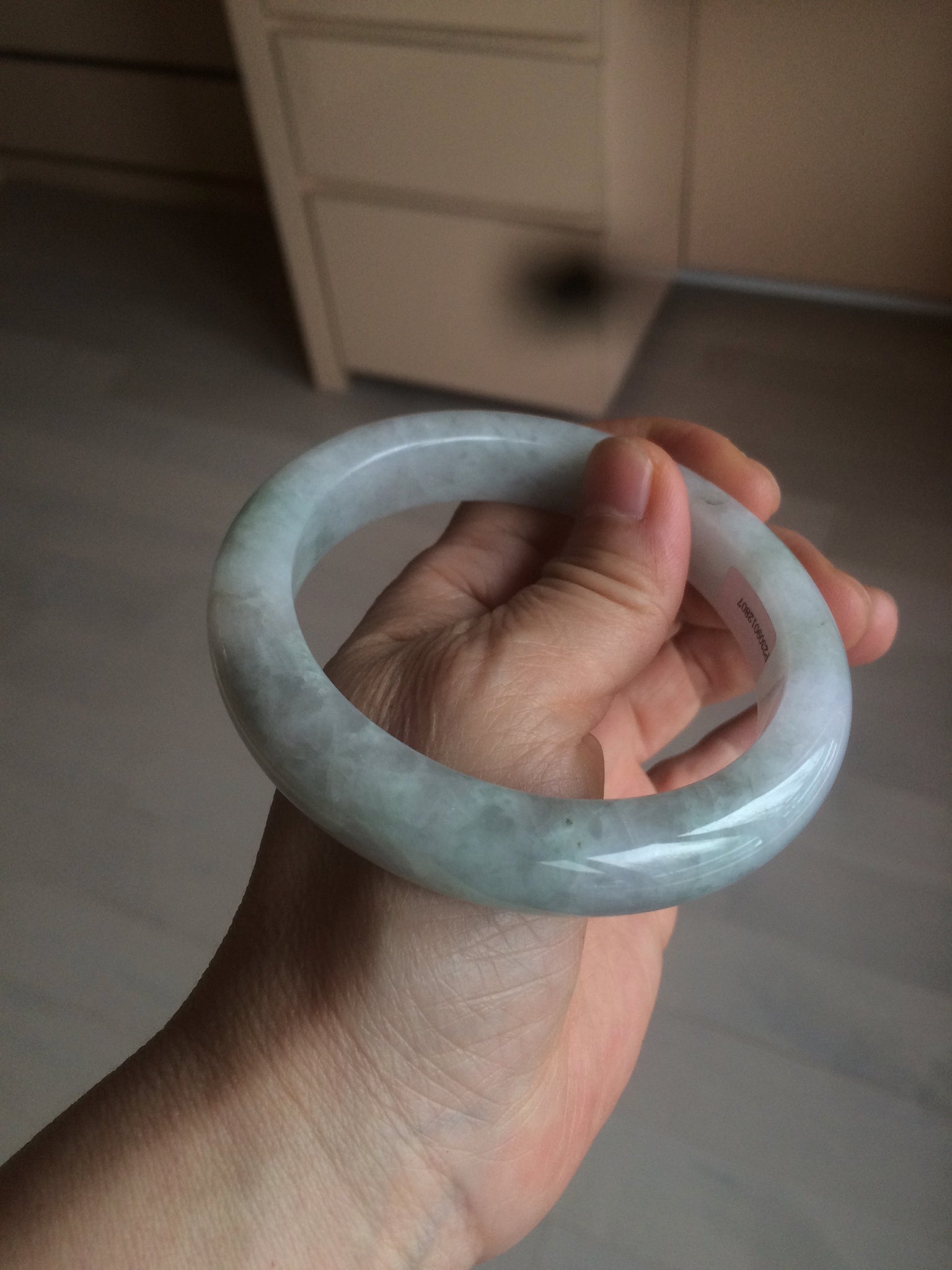 Some cracks. The bangle is solid (Guaranteed!). Make a high-pitched sound when clicked. Quite a lot of hairlines cotton lines, spots, blisters, and areas. The purple is super light. It's only just a hint of purple.