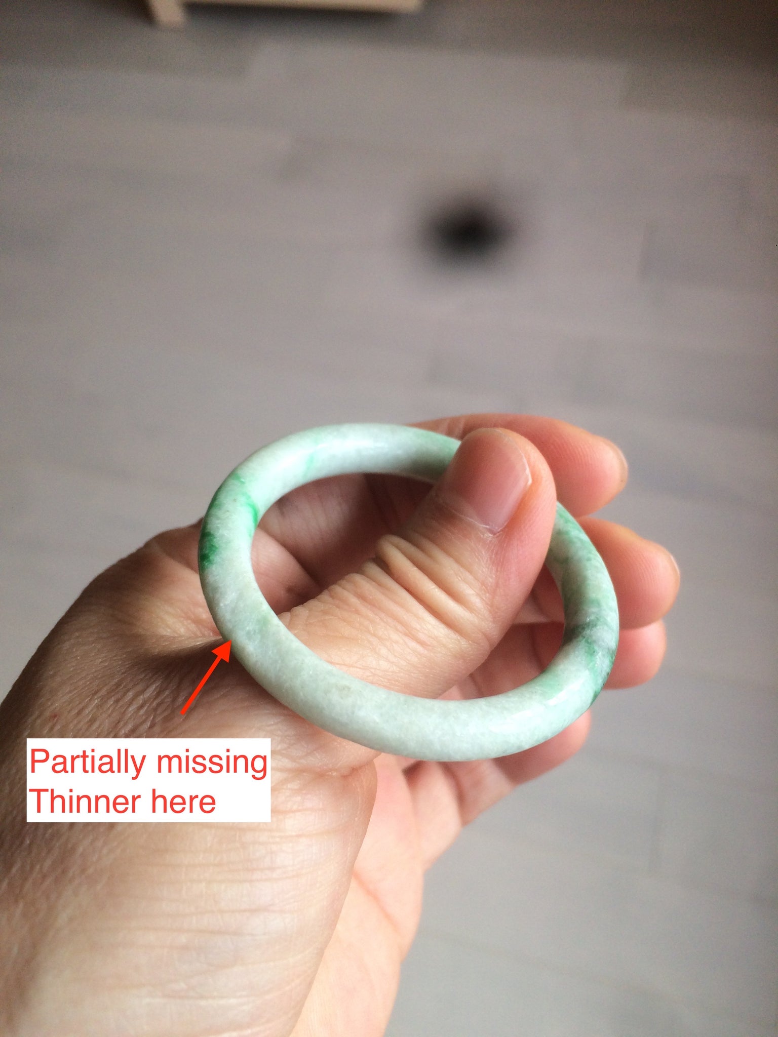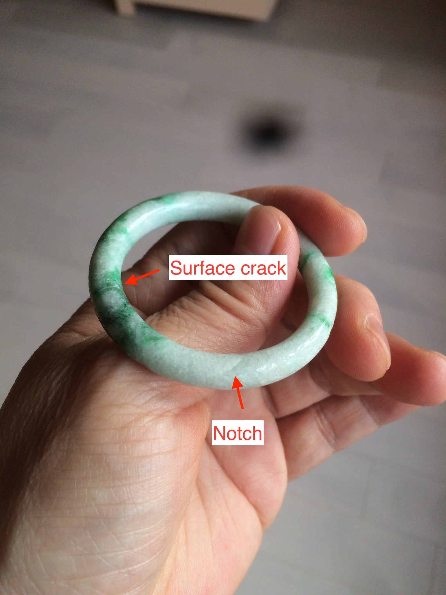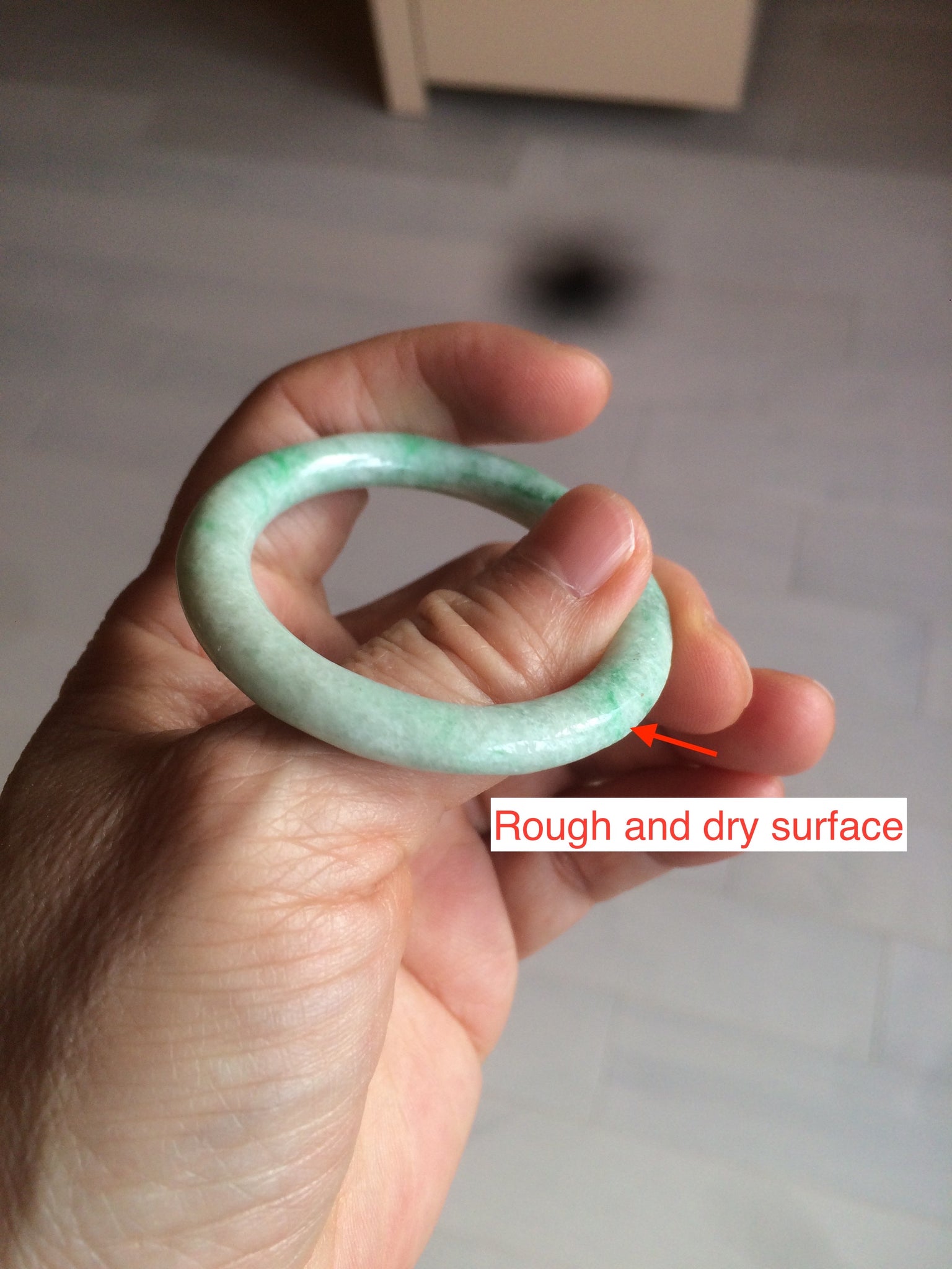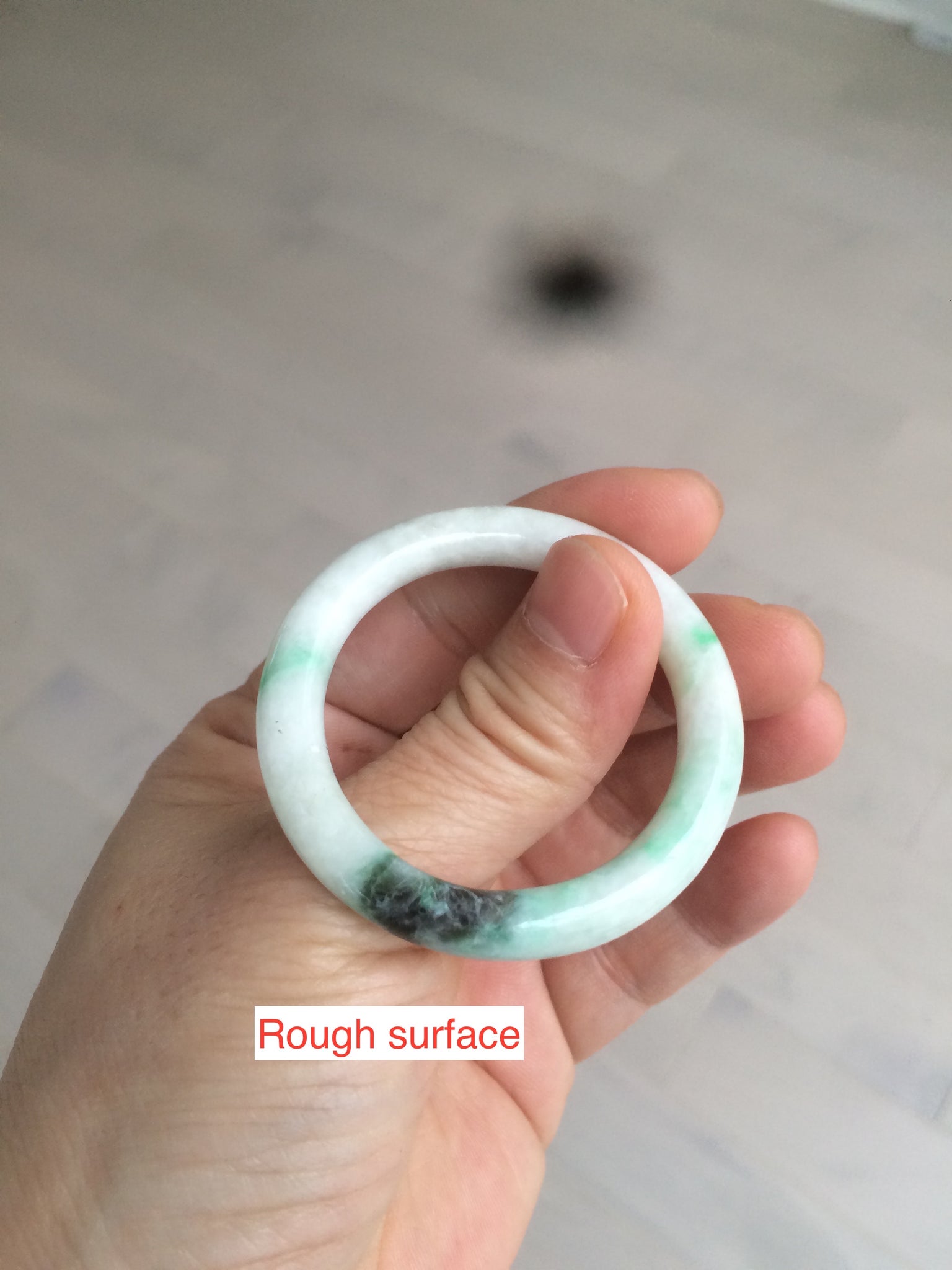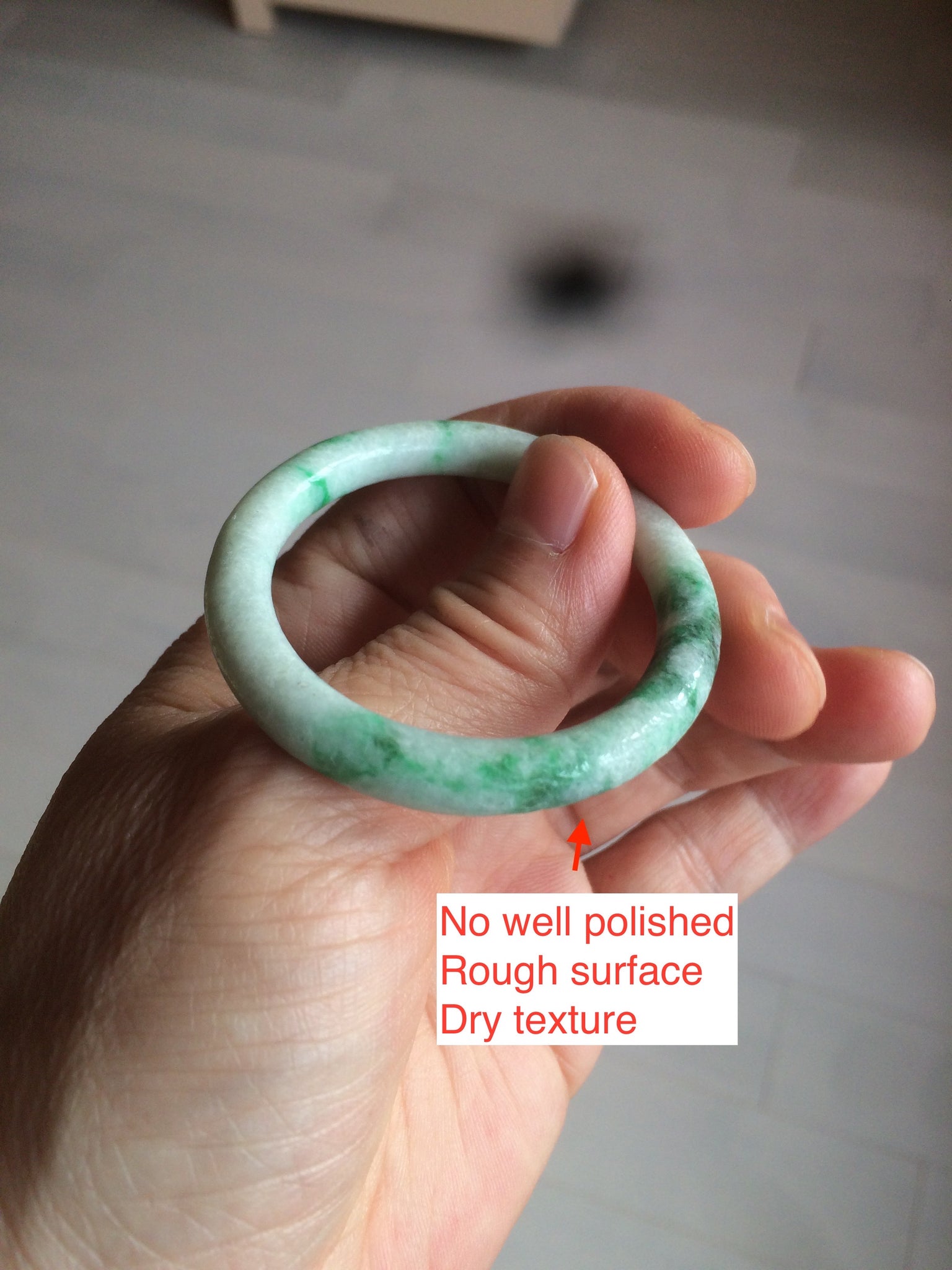 Flat round cut. The bangle is not perfectly round. The polishing job is less ideal. Some rough and dry surfaces. Cotton spots and lines.
