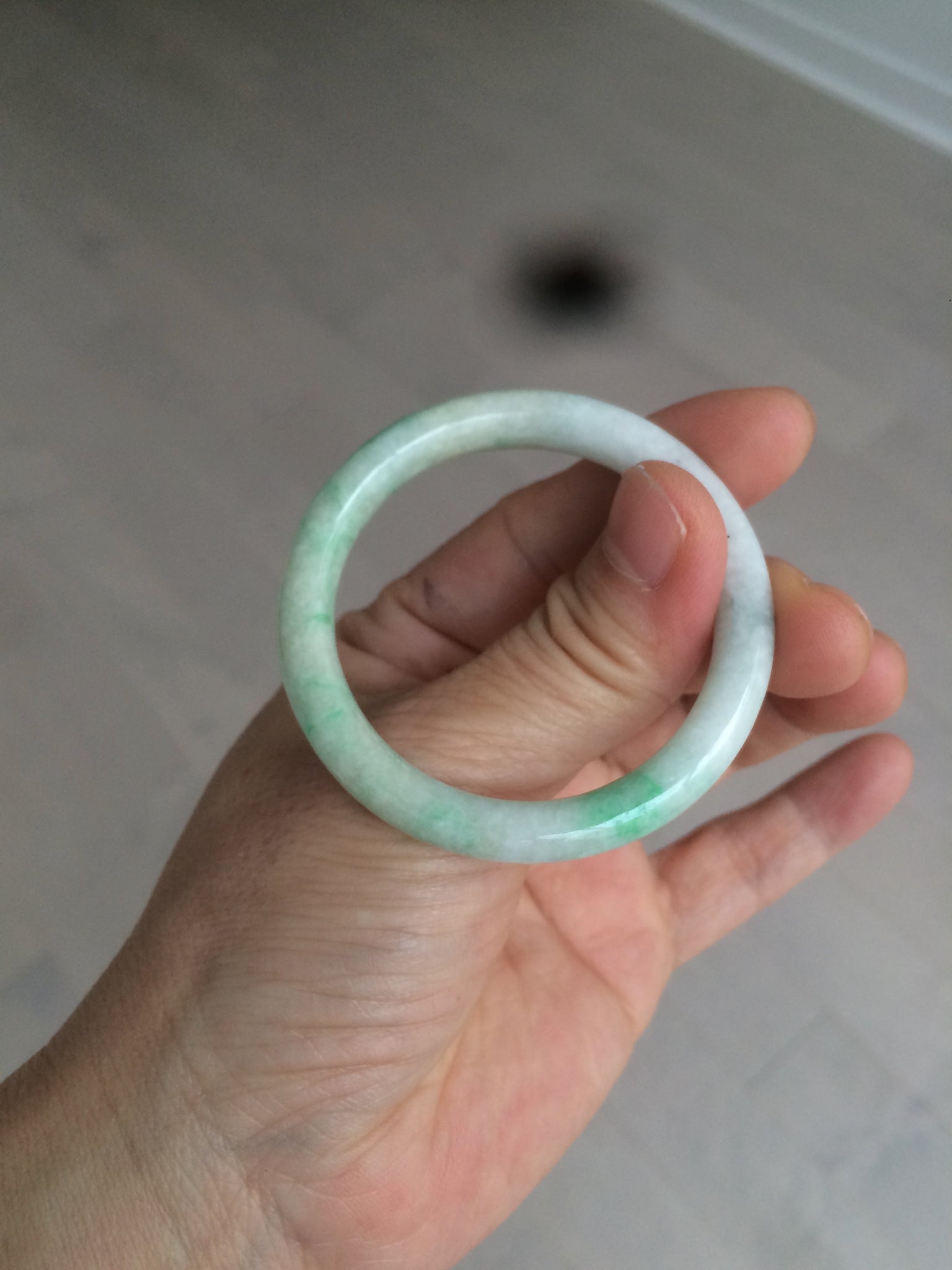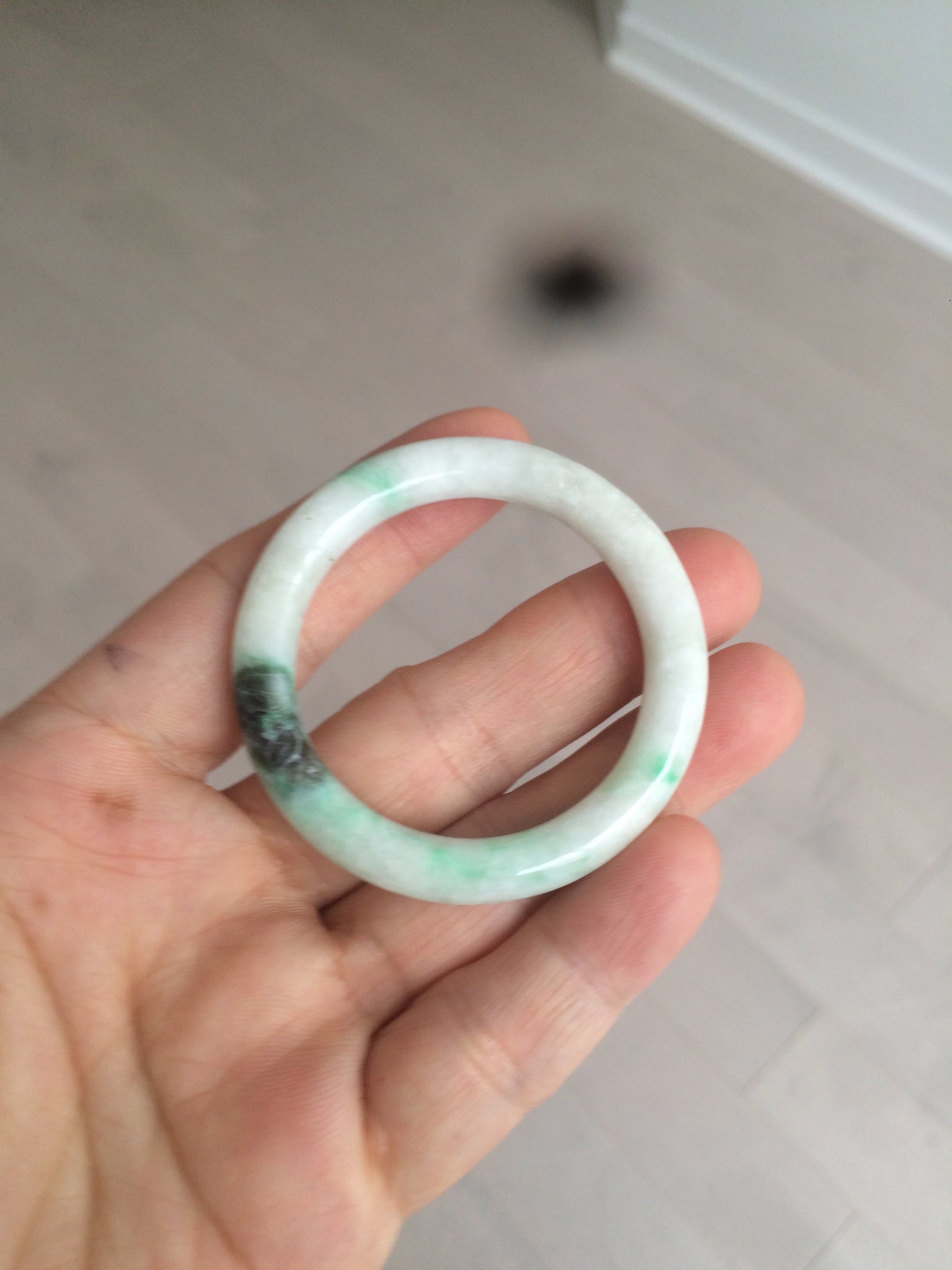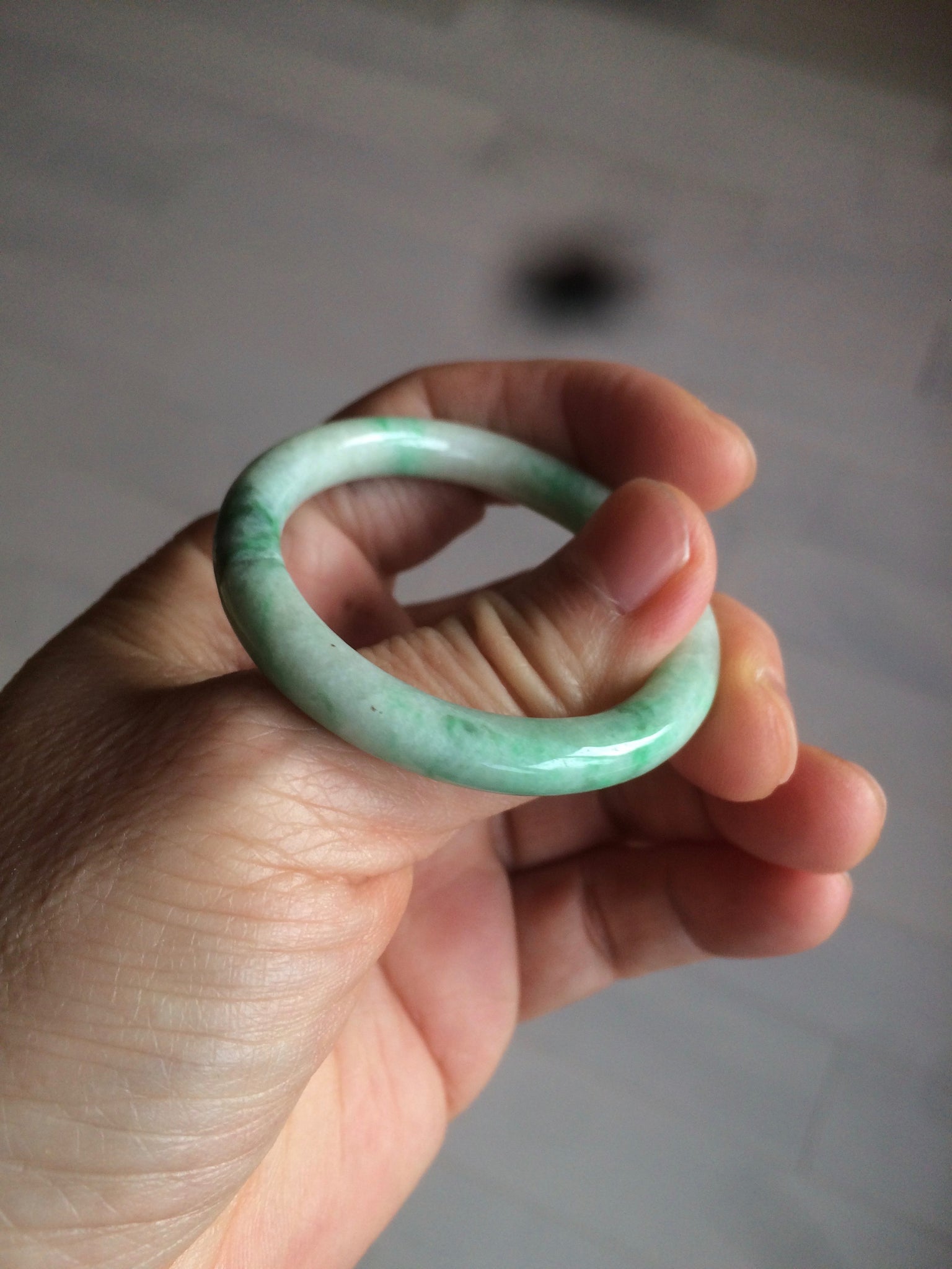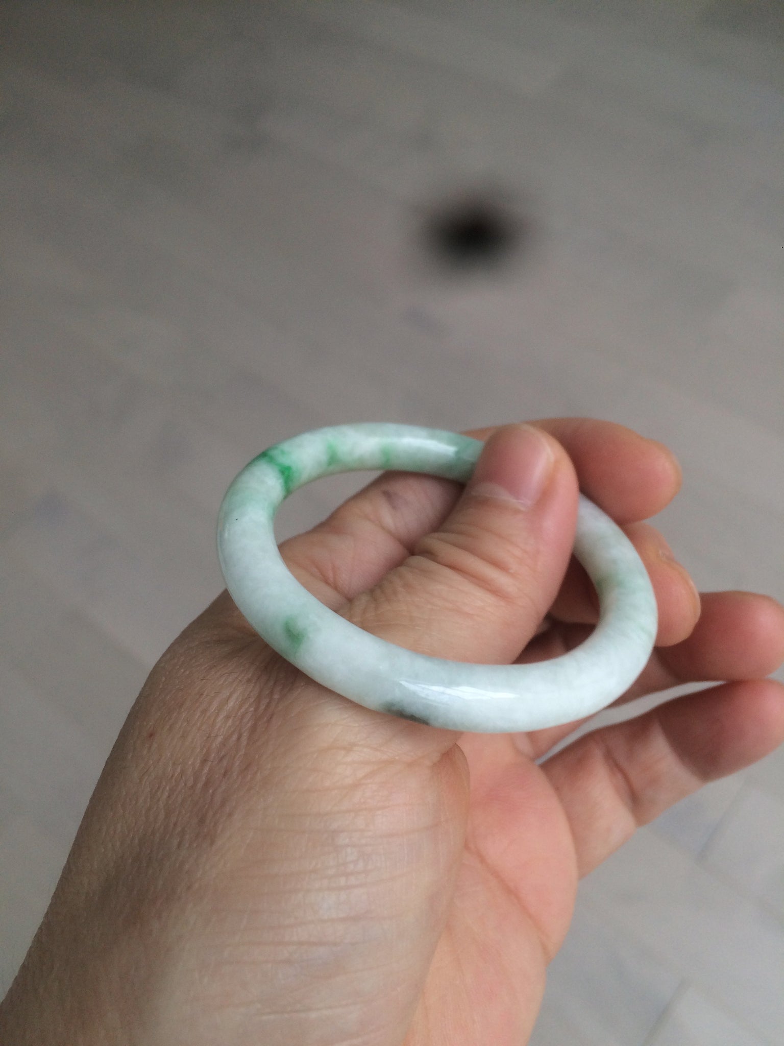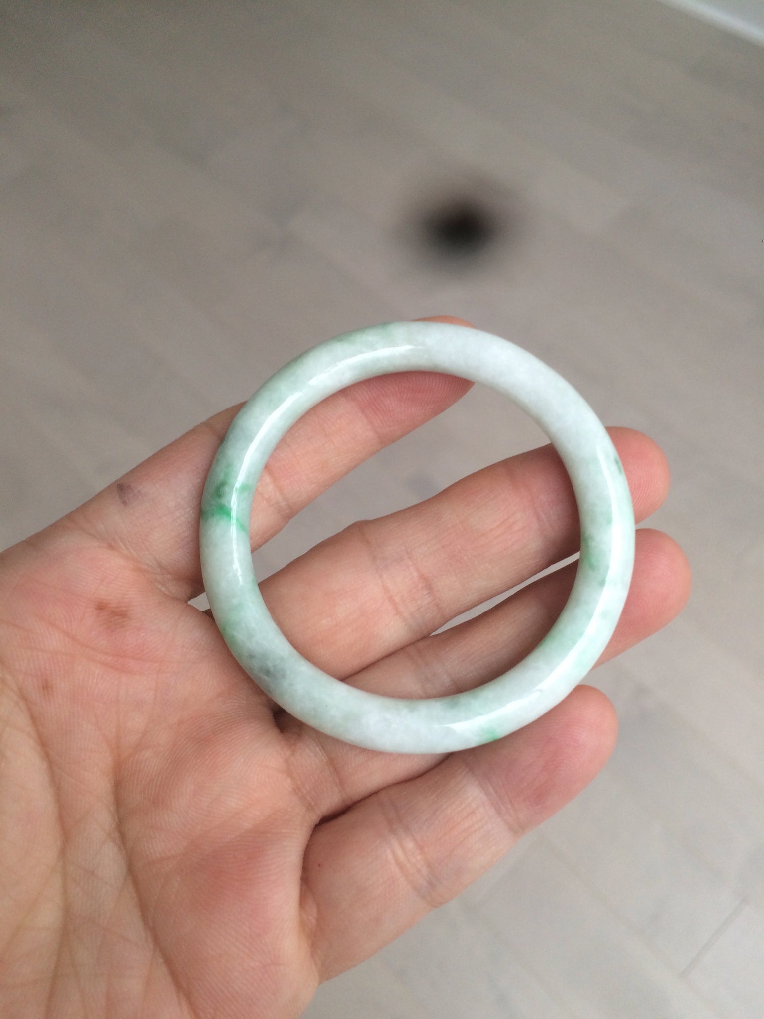 Flat round cut. The bangle is not perfectly round. The polishing job is less ideal. Some rough and dry surfaces. Cotton spots and lines.
