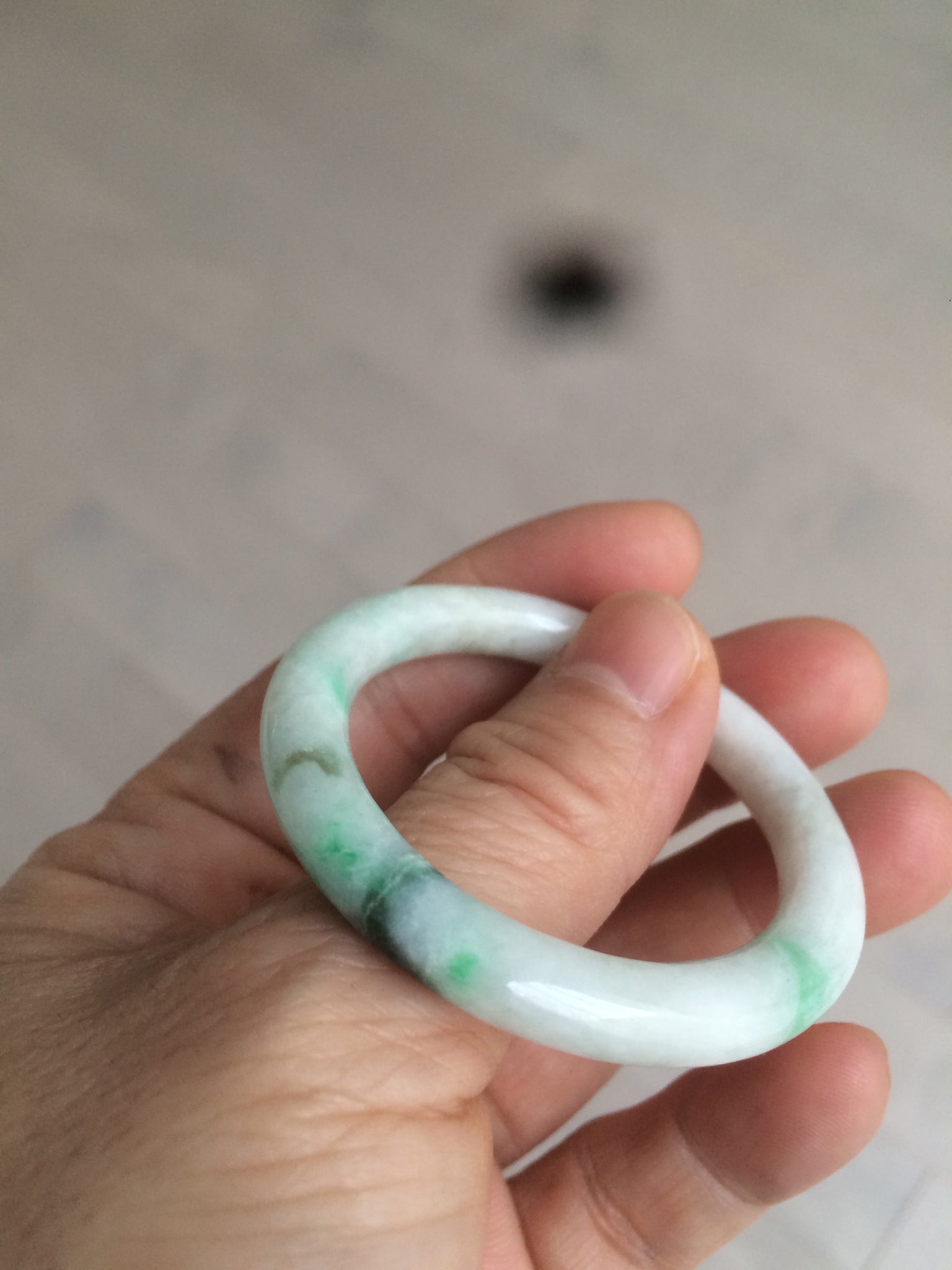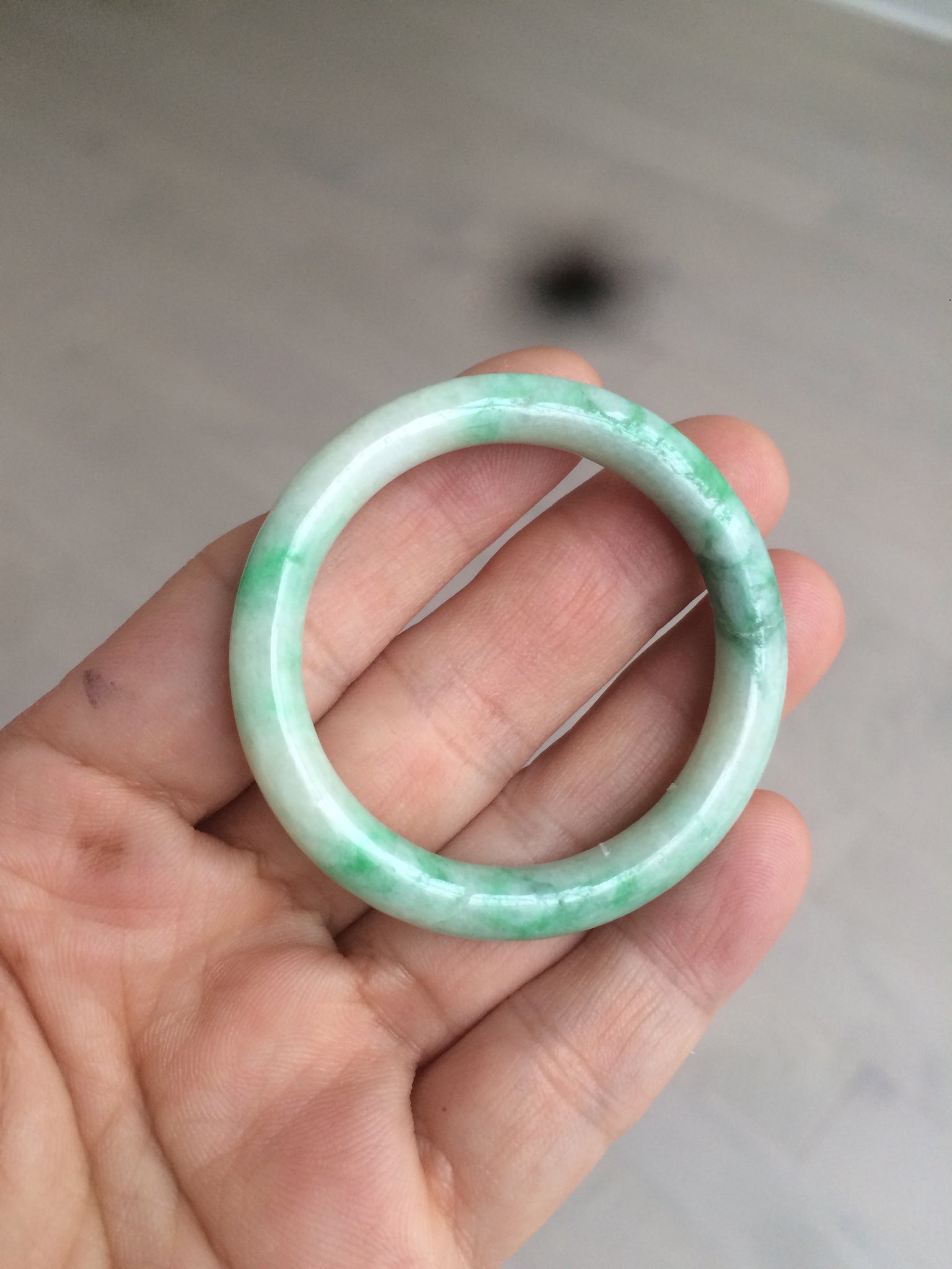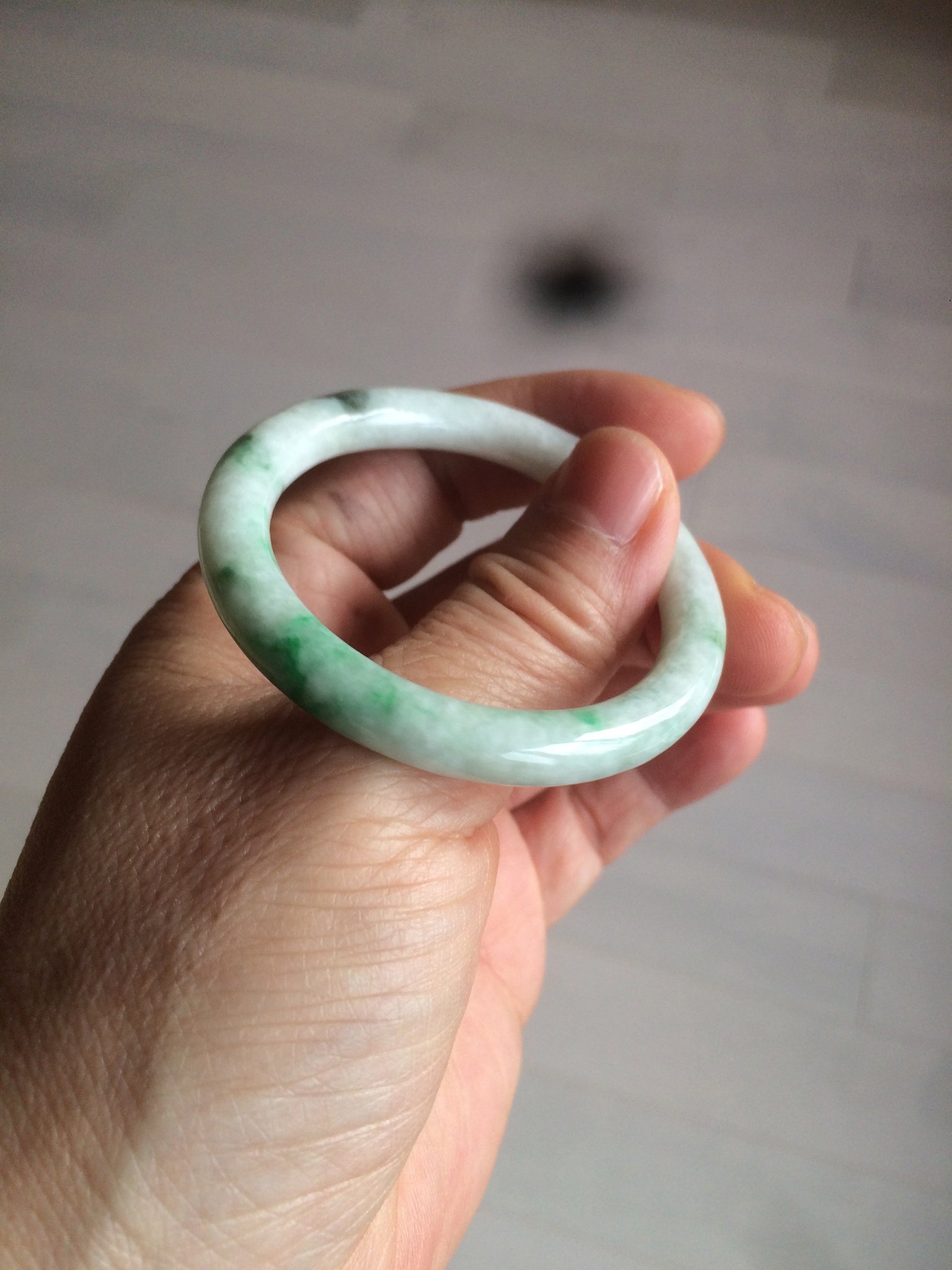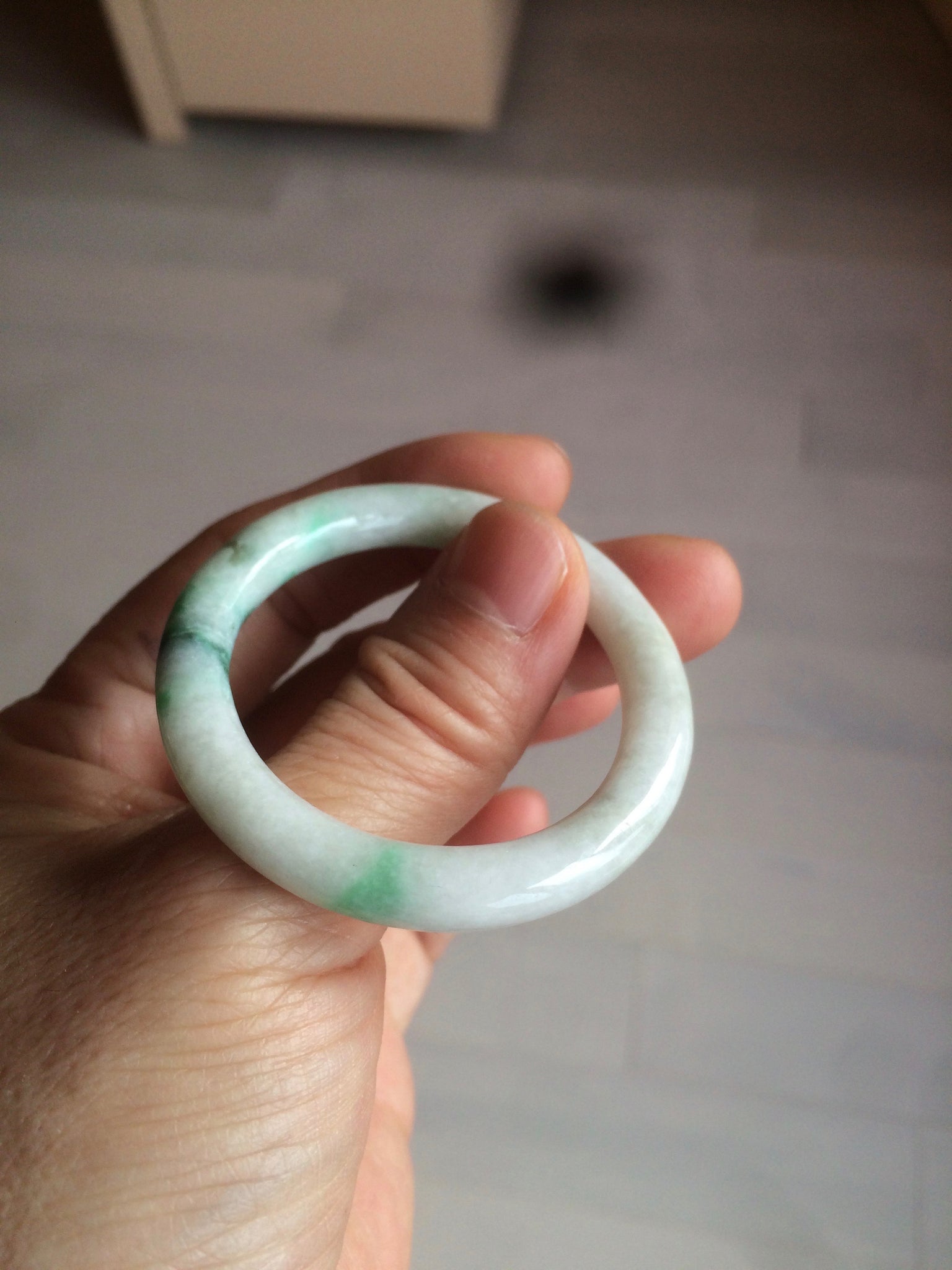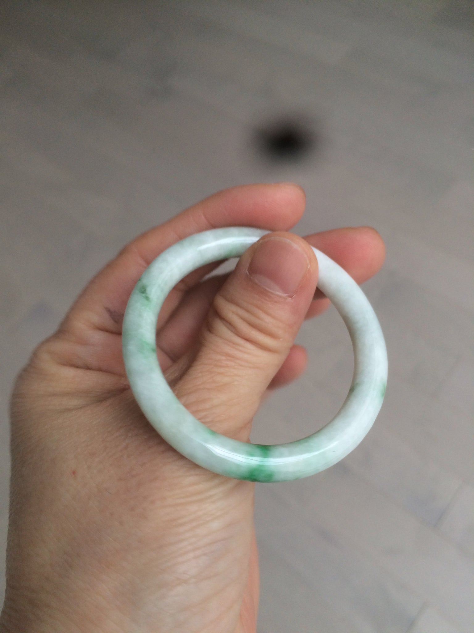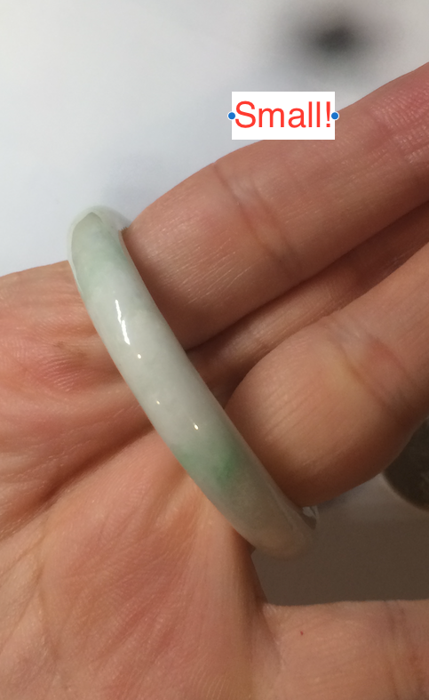 Flat round cut. The bangle is not perfectly round. The polishing job is less ideal. Some rough and dry surfaces. Cotton spots and lines.