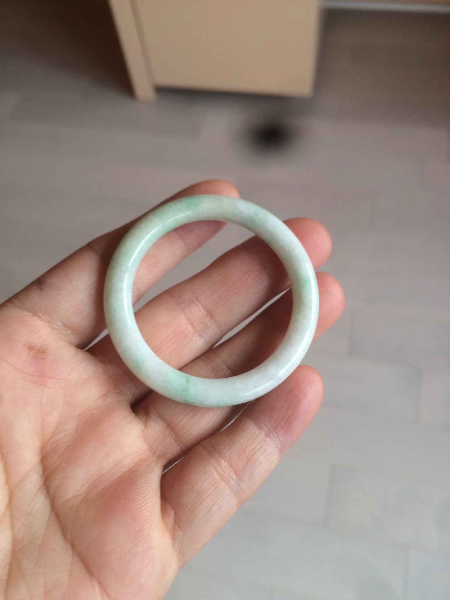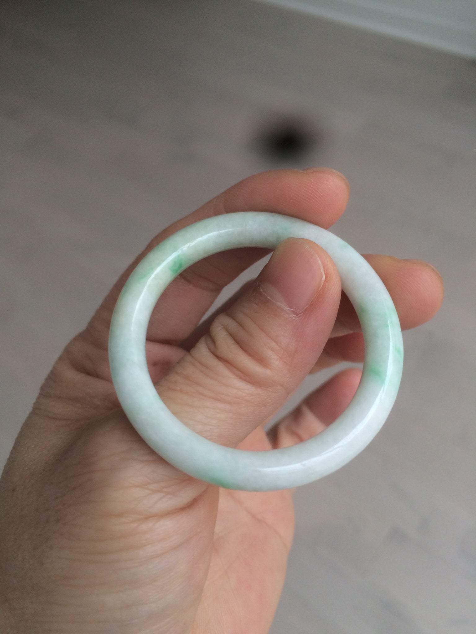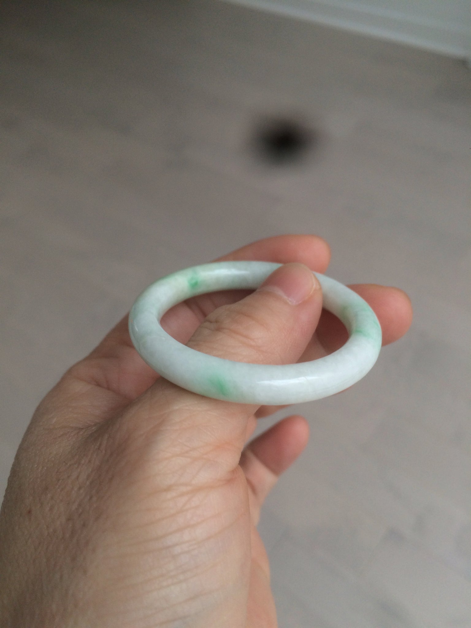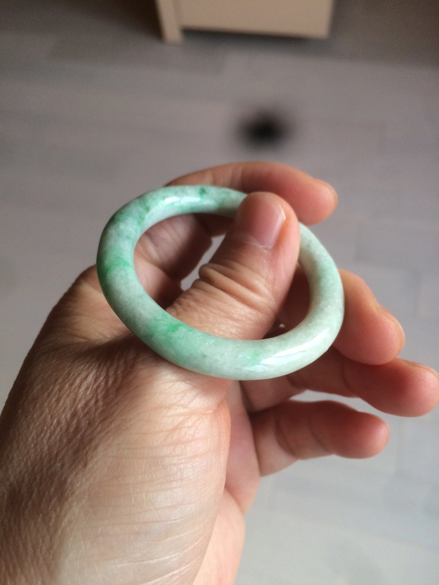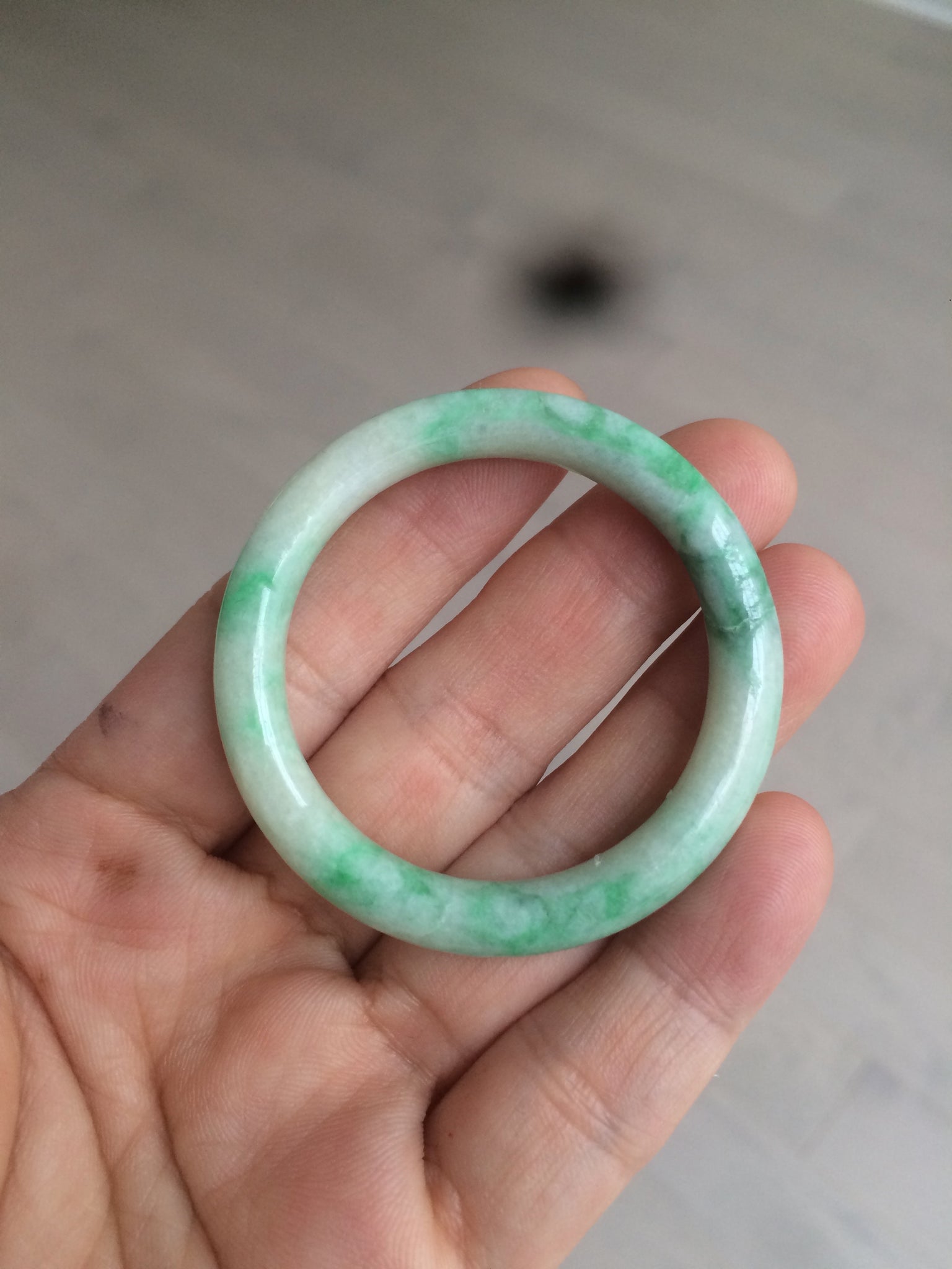 Flat round cut. The bangle is not perfectly round. The polishing job is less ideal. Some rough and dry surfaces. Cotton spots and lines.