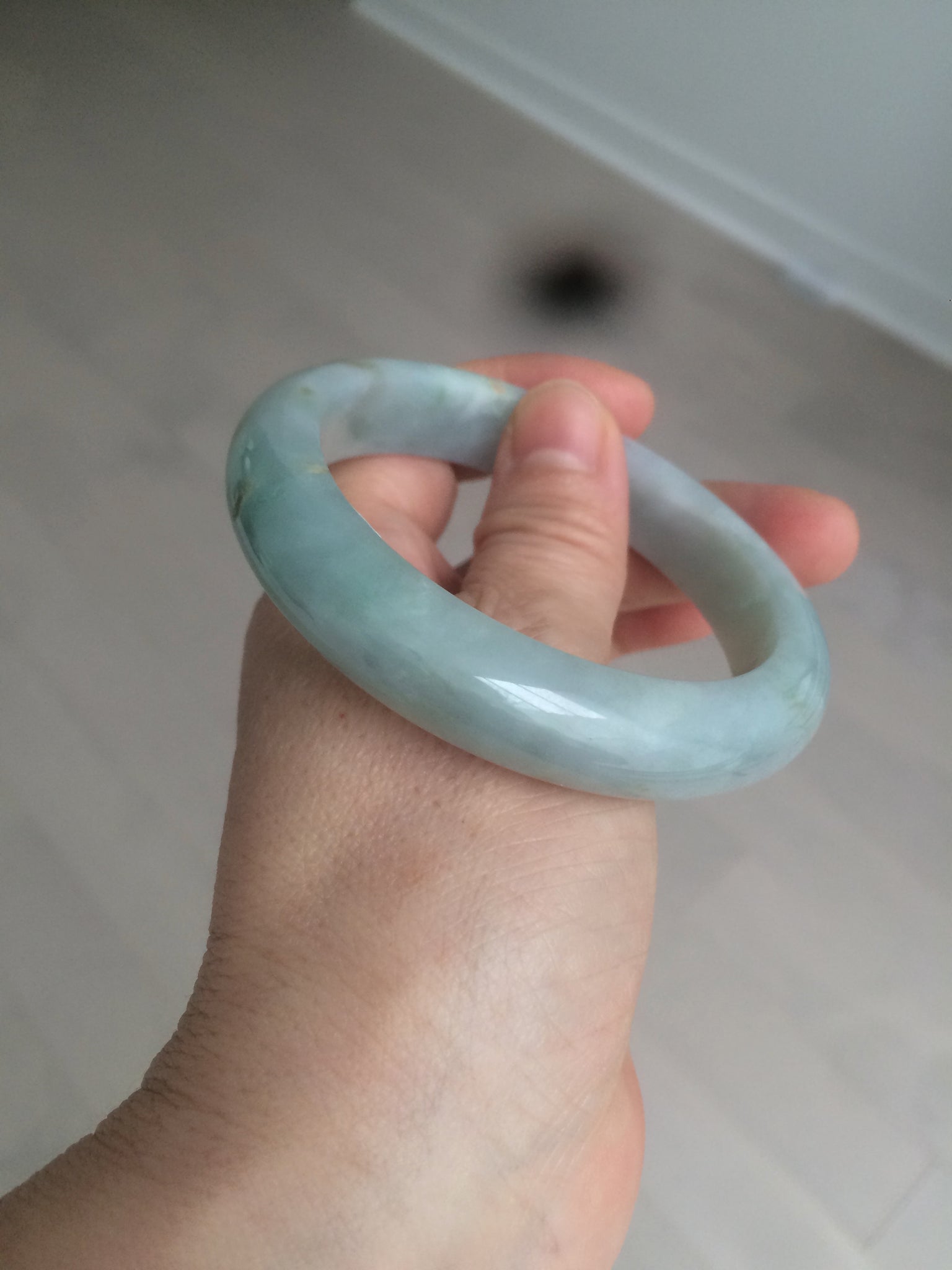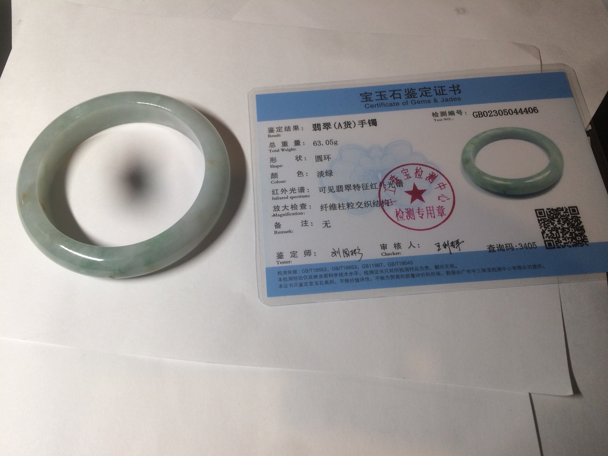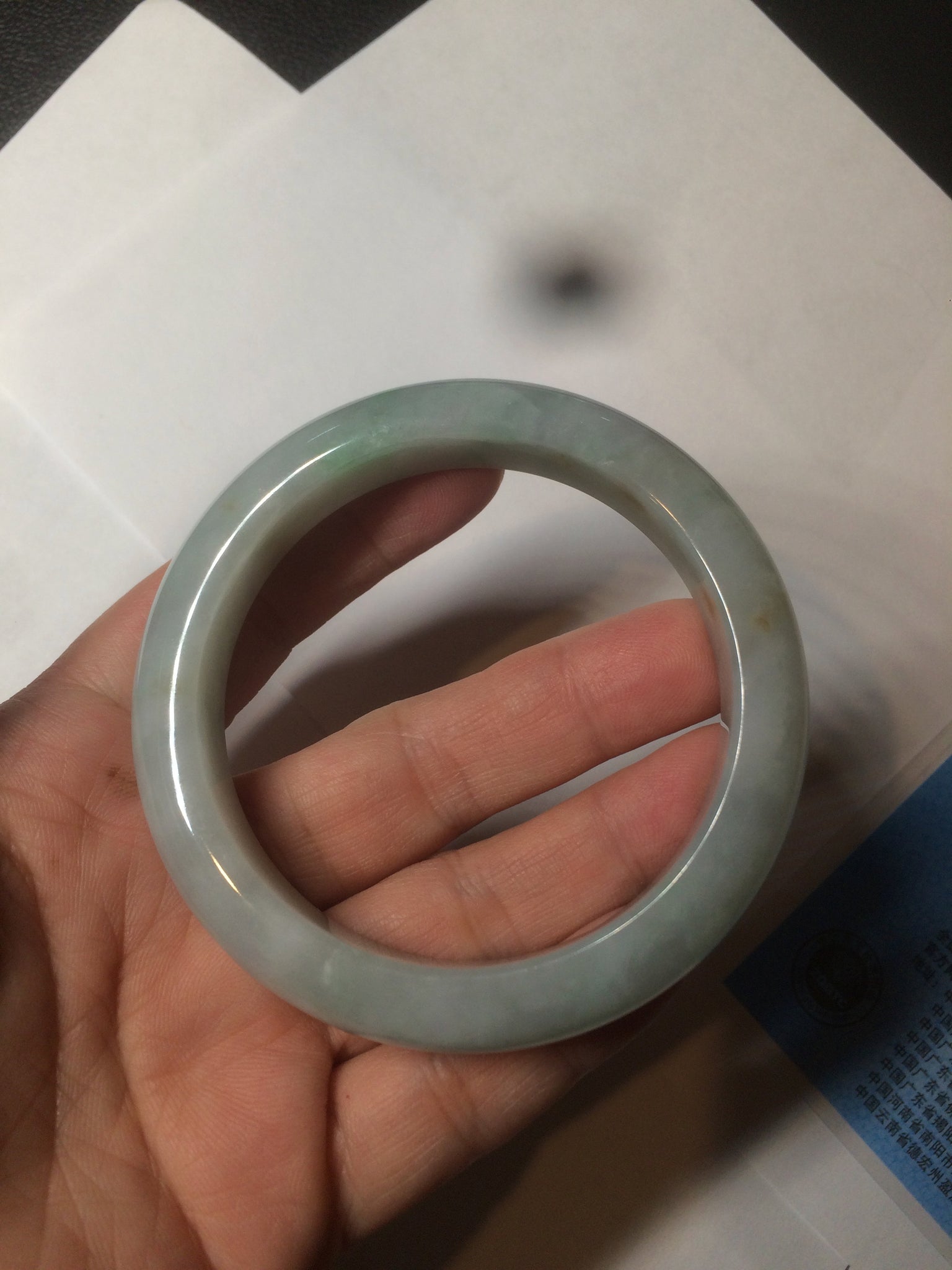 Some surface cracks(photos may not show all). One is a long U-shape. The bangle is solid. It makes a high-pitched sound when clicked. Some hairlines. Some yellow/ brown rough surface areas. Some cotton lines, spots, and areas.