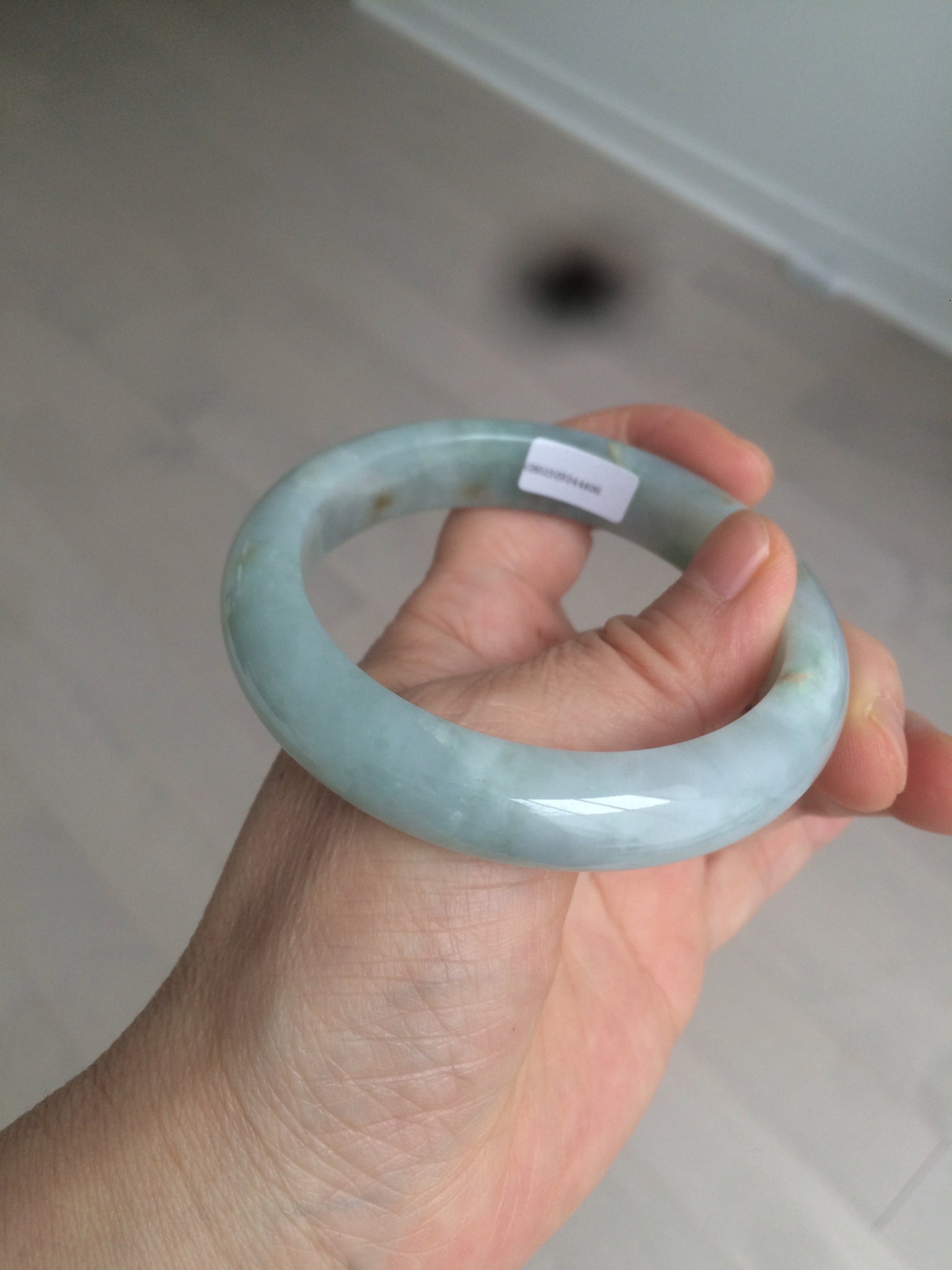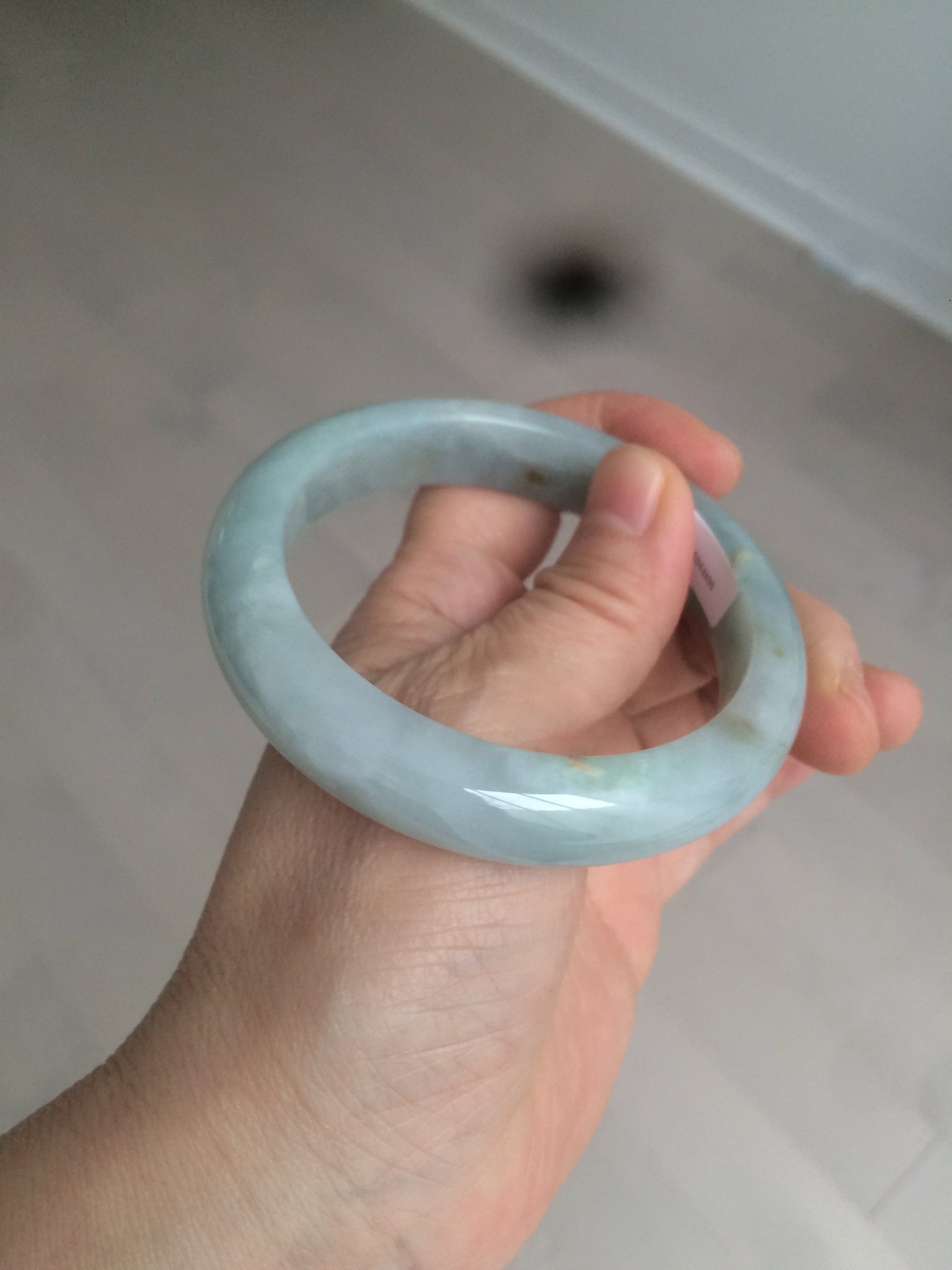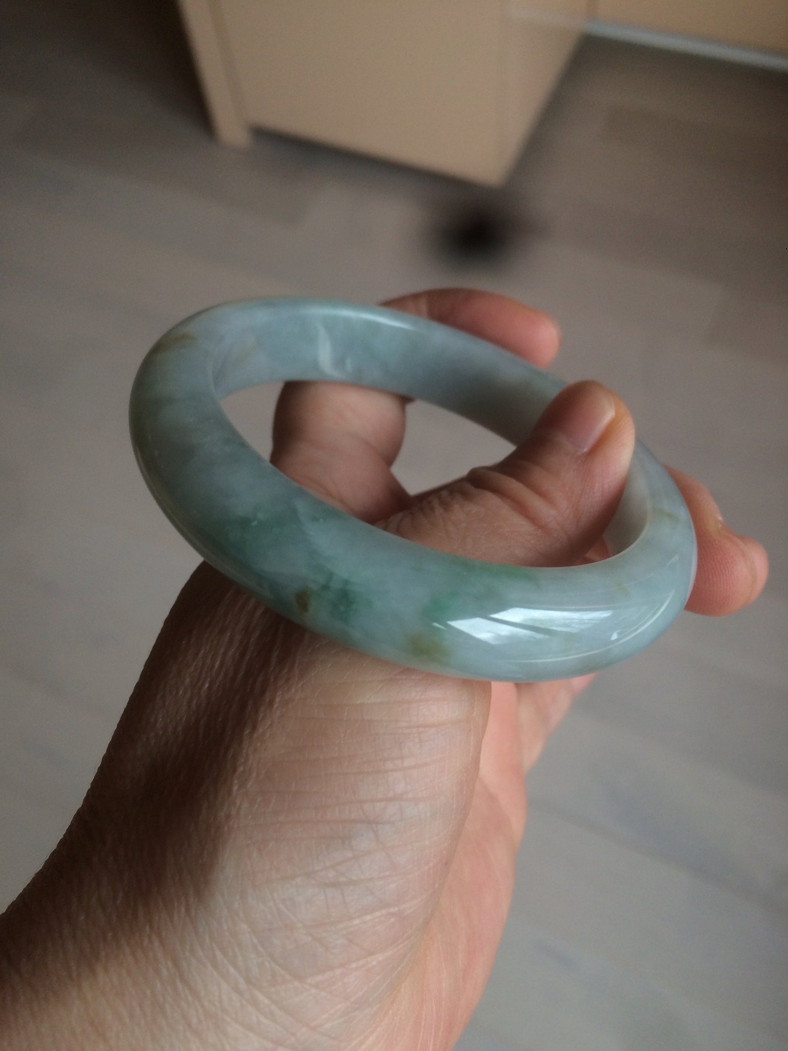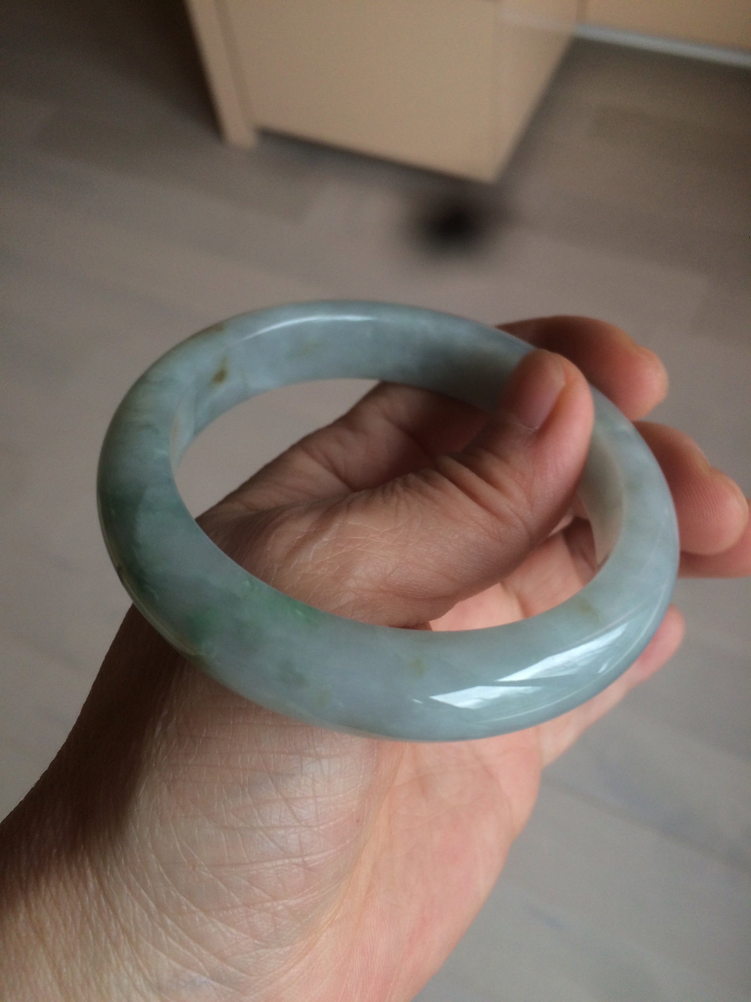 Some surface cracks(photos may not show all). One is a long U-shape. The bangle is solid. It makes a high-pitched sound when clicked. Some hairlines. Some yellow/ brown rough surface areas. Some cotton lines, spots, and areas.