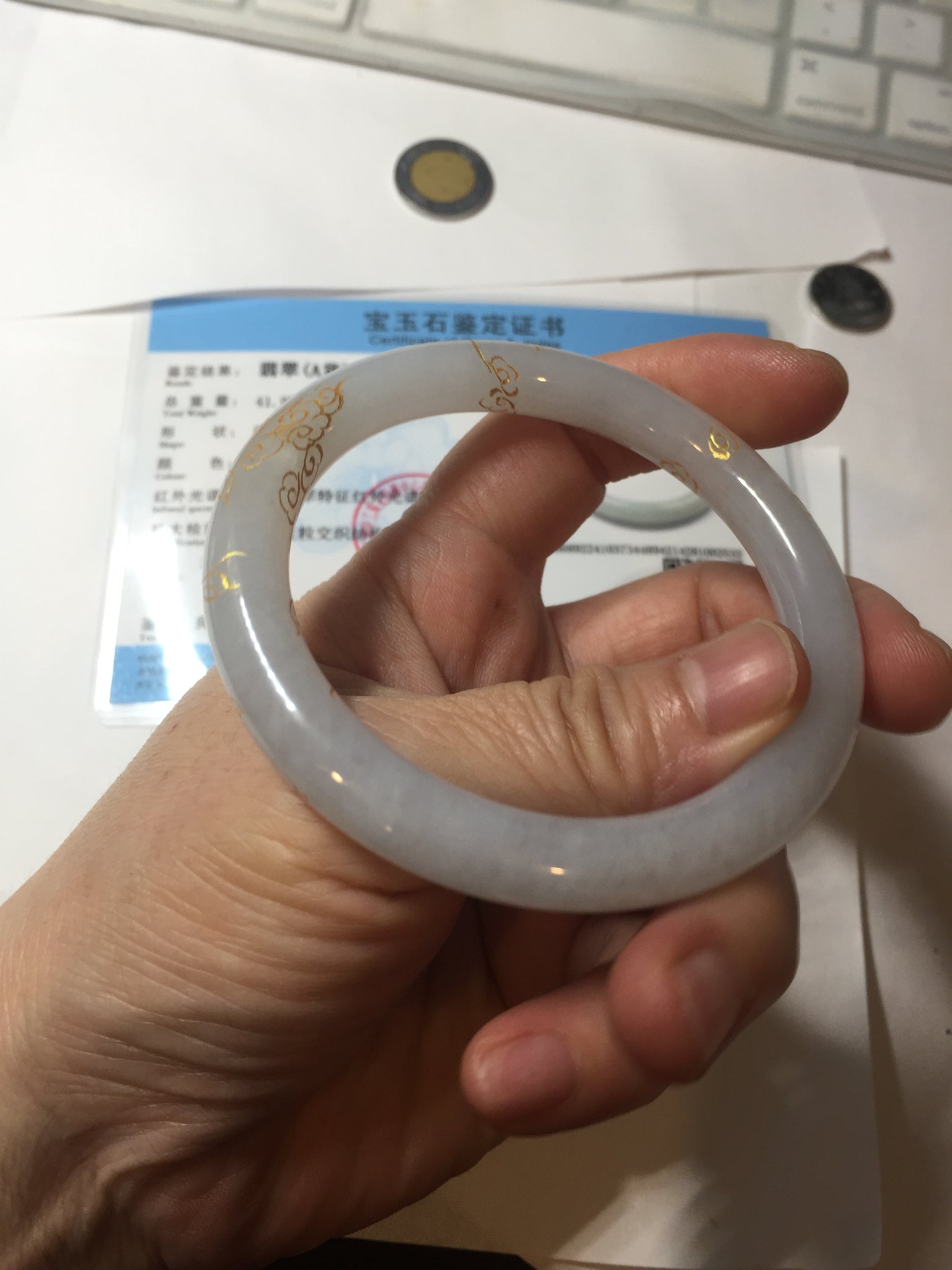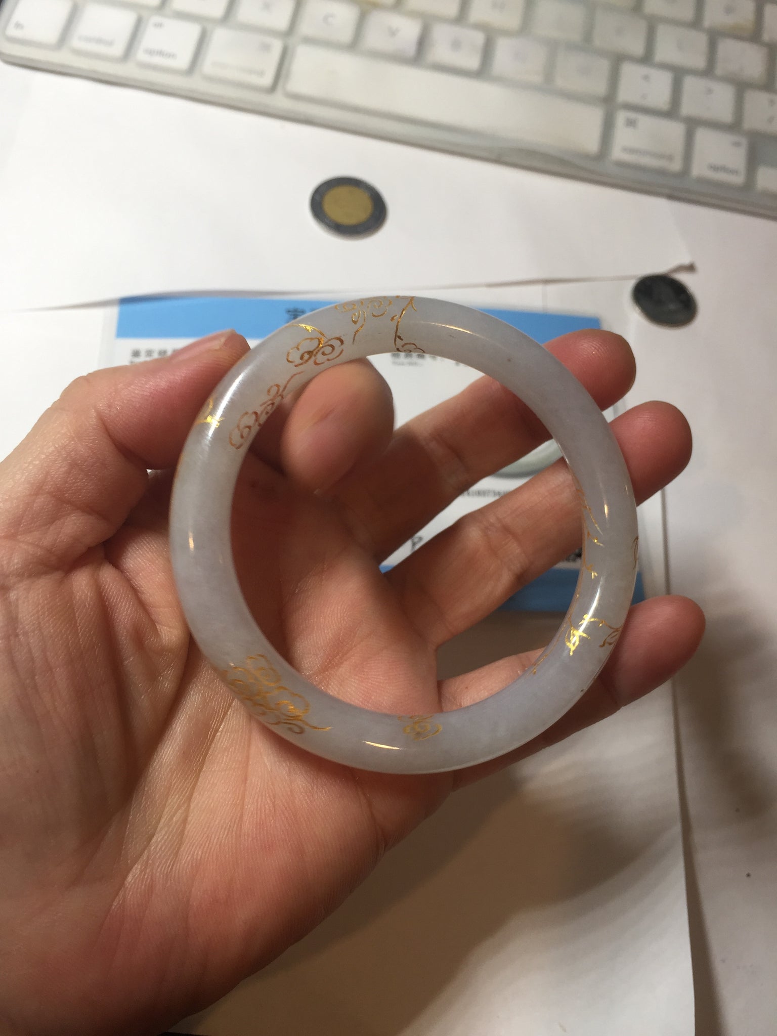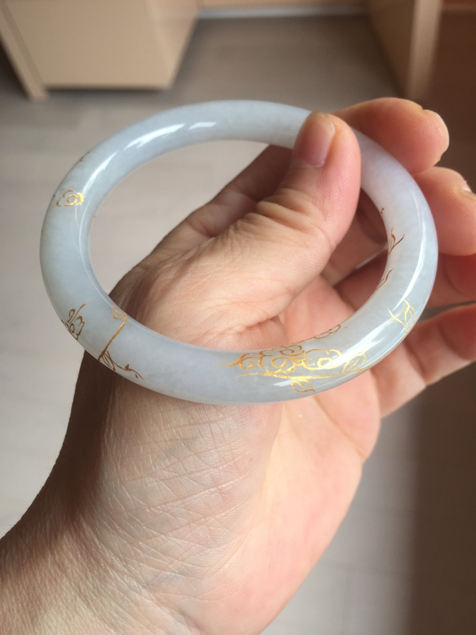 Some cracks or hairlines covered by the carving. The bangle is firm(Guaranteed!). Cotton spots, cotton lines, and cotton areas.