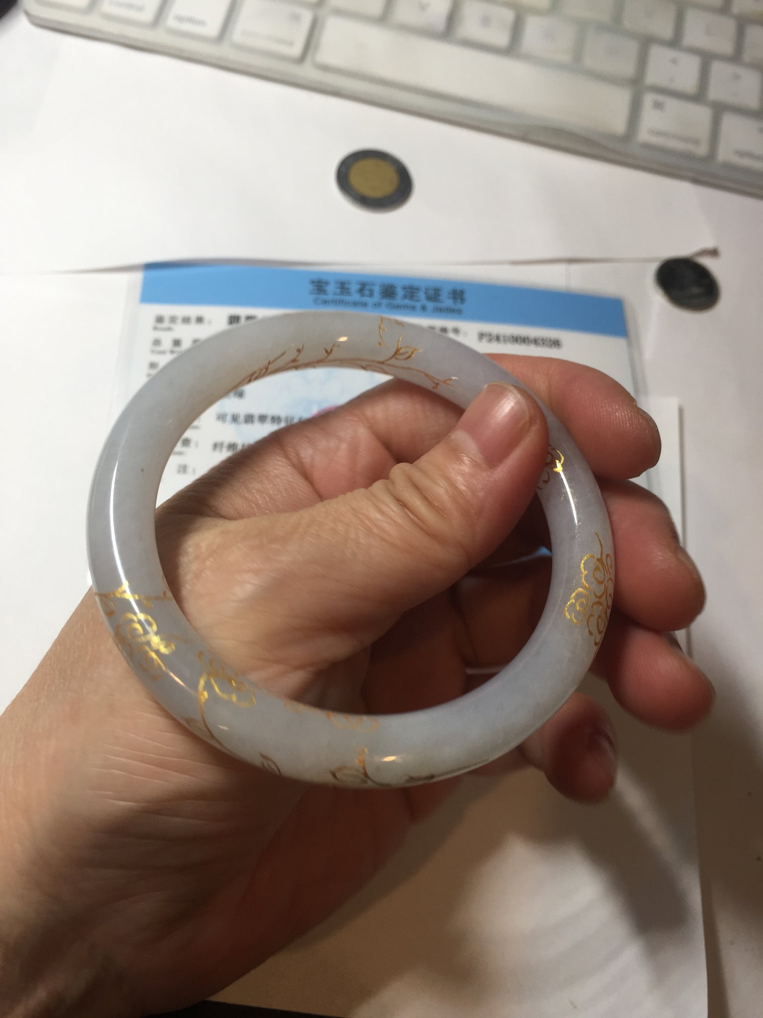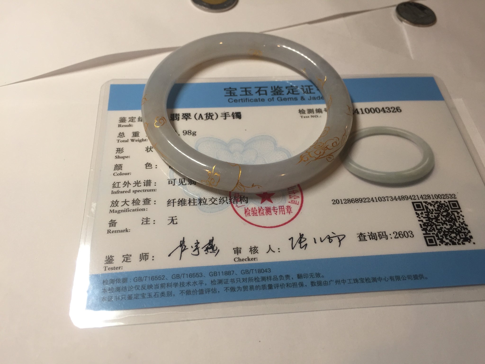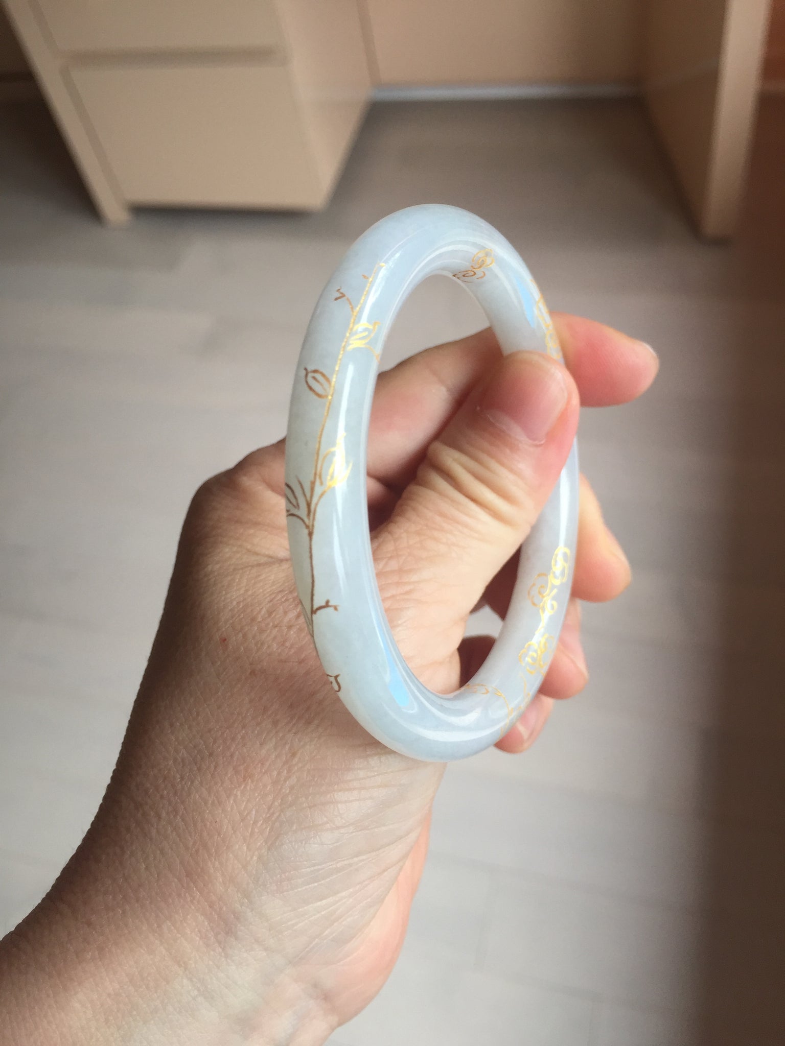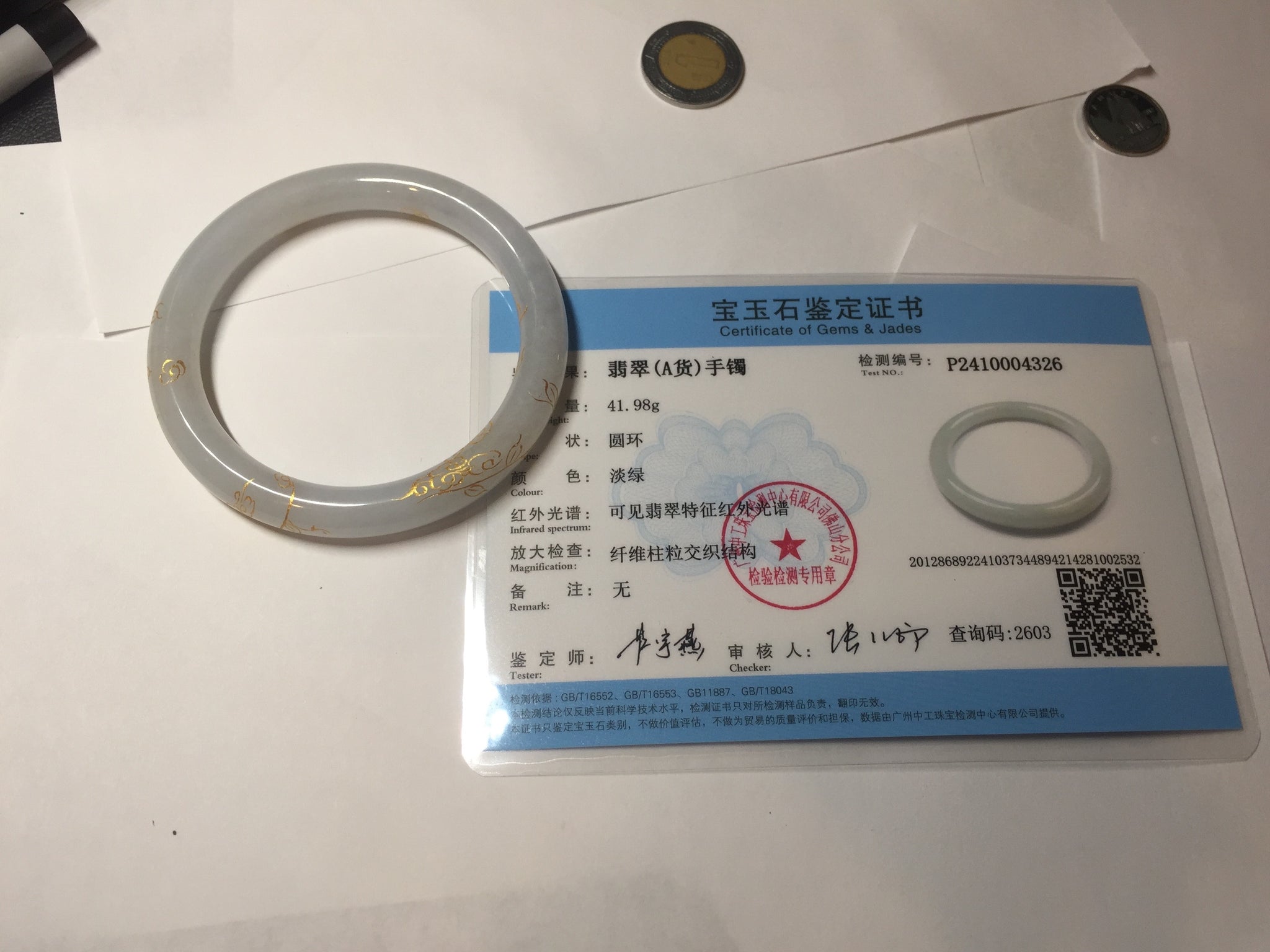 56.5mm 100% Natural type A light green white carved and golden-painted Jadeite Jade bangle PA112-4326