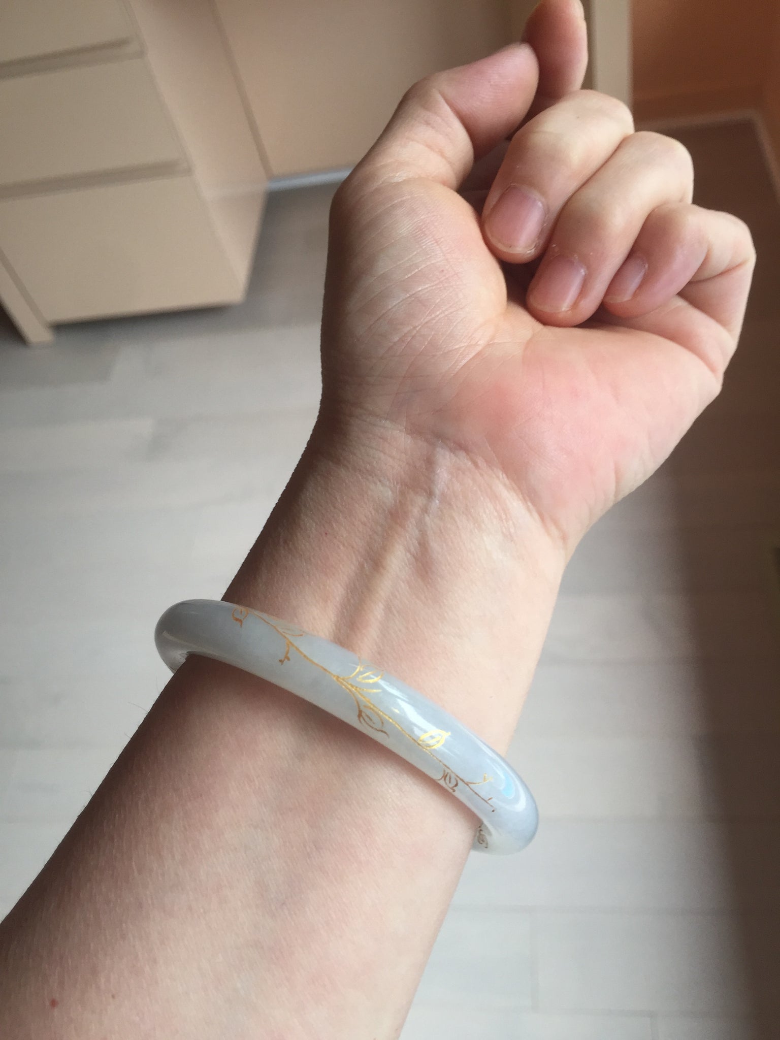 This gold pigment is not permanent. How long it lasts depends on how often the bangle is worn and the nature of the wearer’s daily activities. Usually, it at least can last 1 year. If the color fades, you can touch it up using gold nail polish or even change it to a different color if you wish. Demonstration video