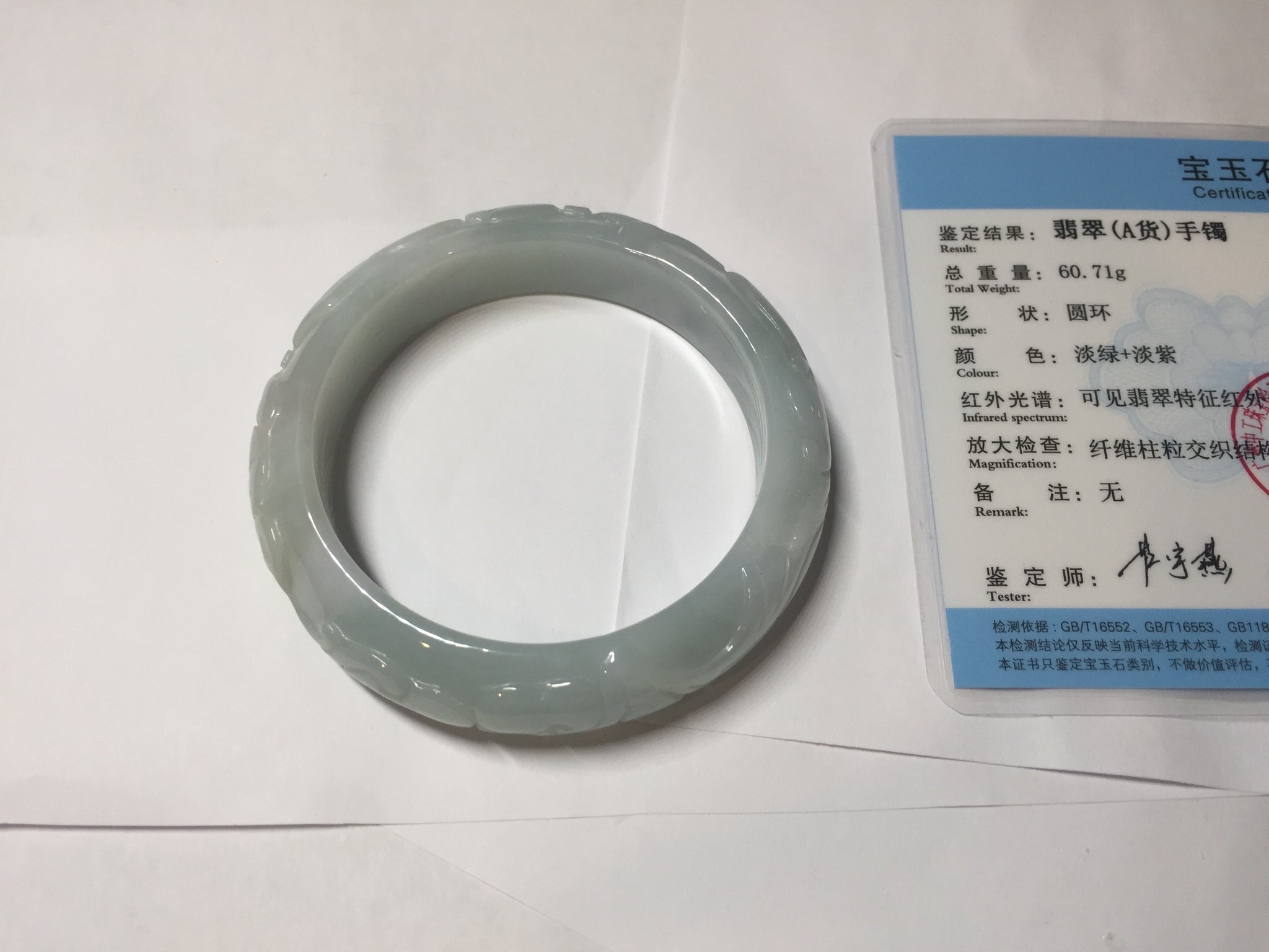 This exquisite light green jade bangle is masterfully carved with three powerful traditional motifs: