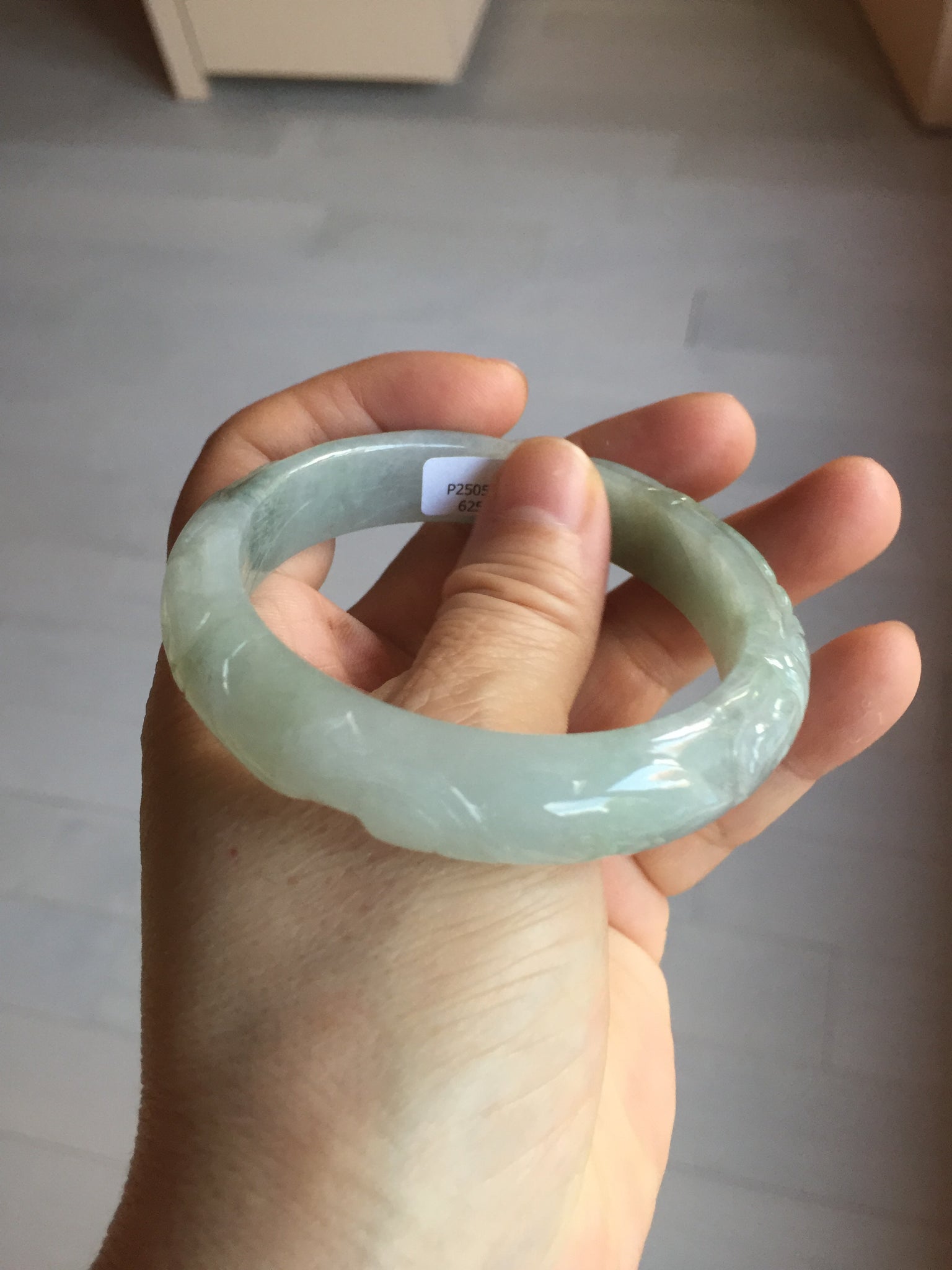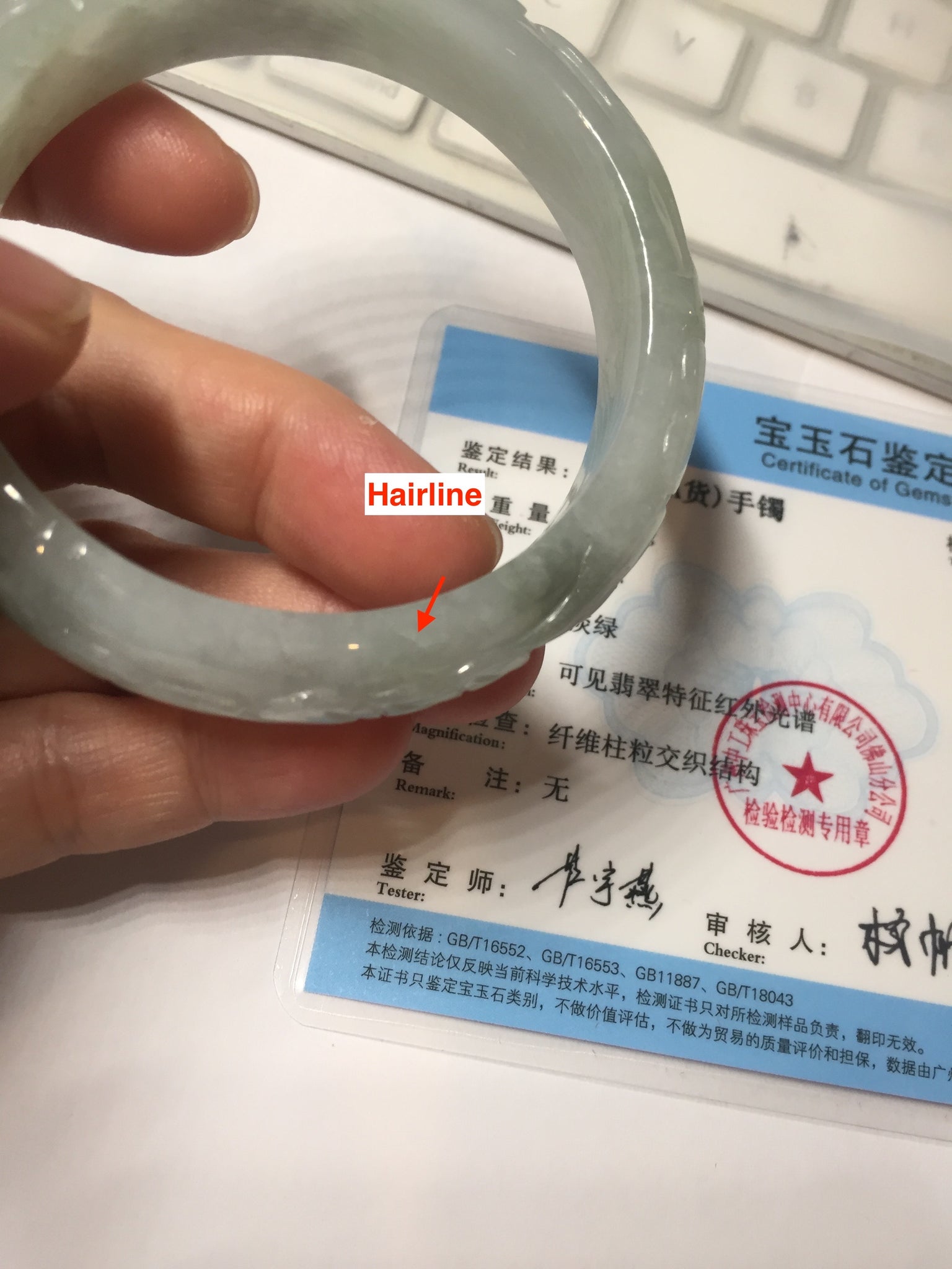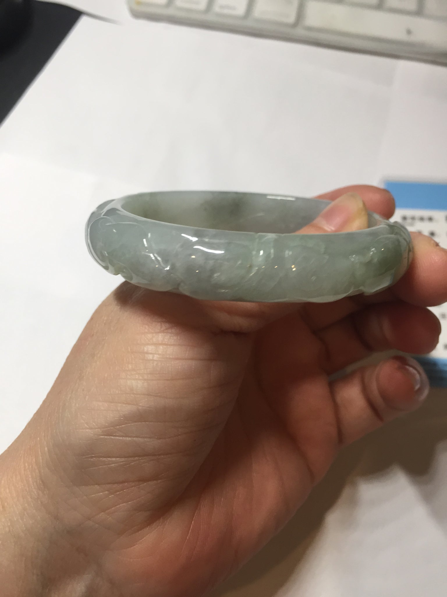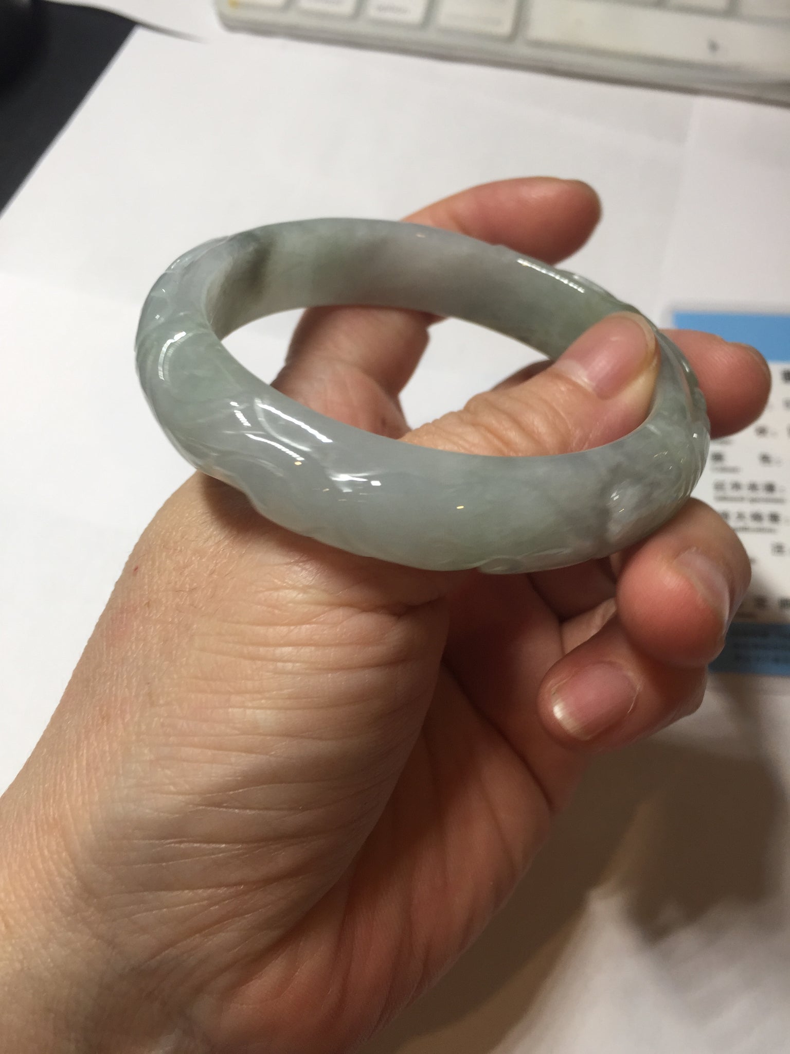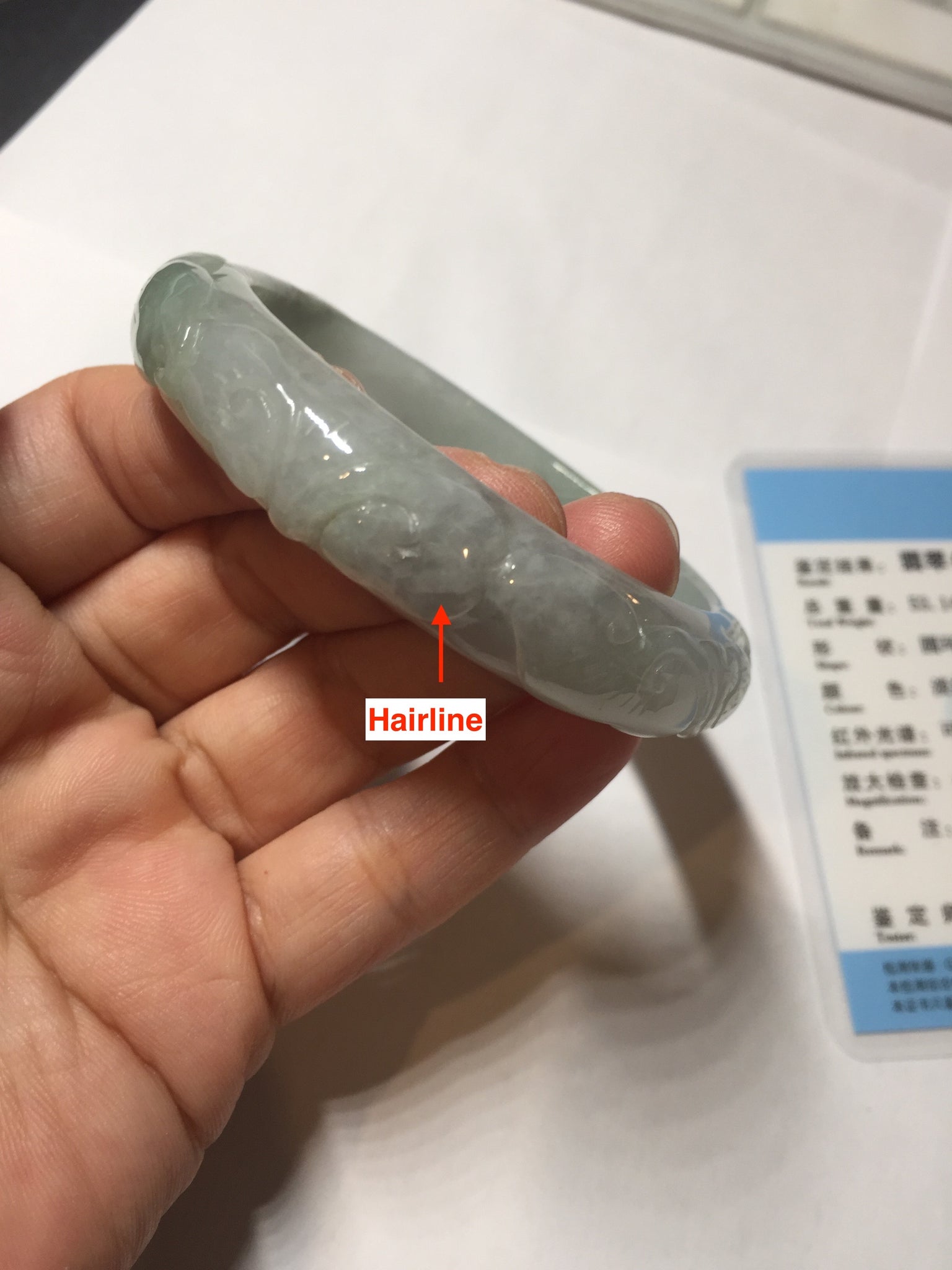 55.3mm Certified Type A 100% Natural light green with carved Ancient Coin, Auspicious Cloud, and Lingzhi Jadeite Jade bangle PD146-6252