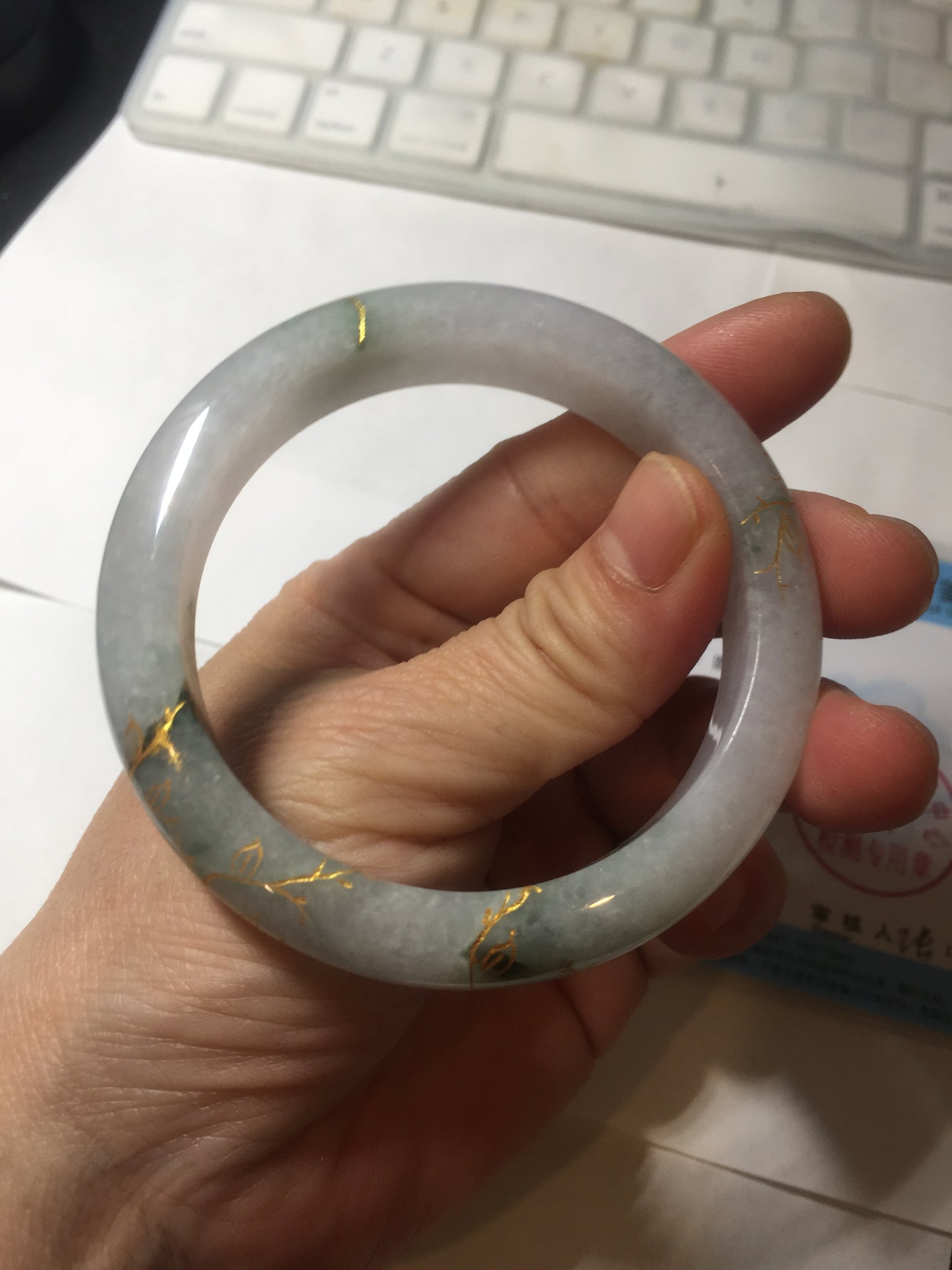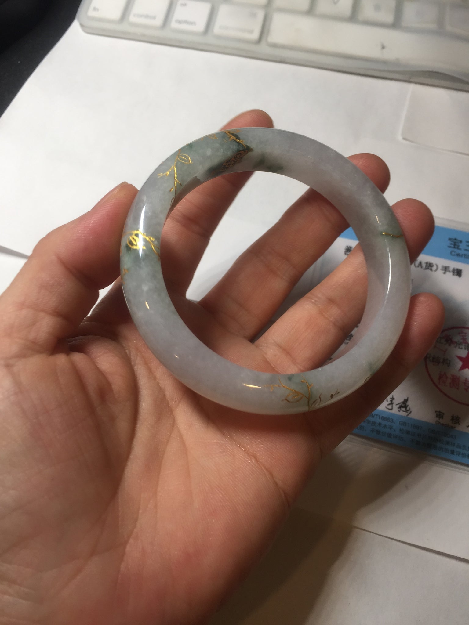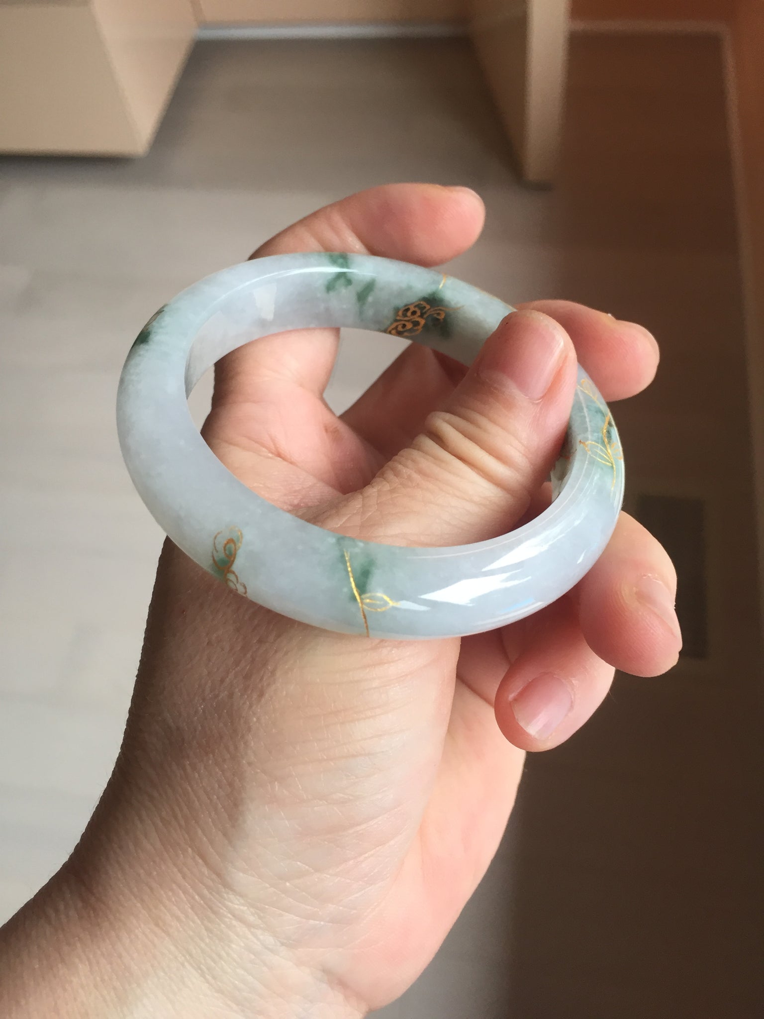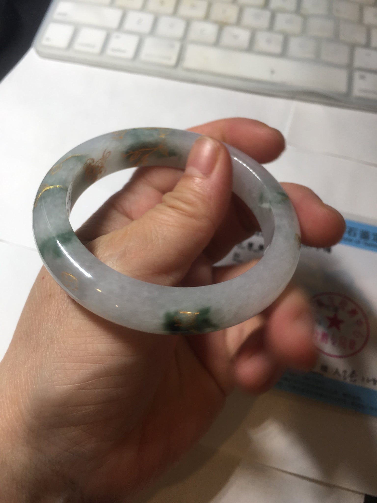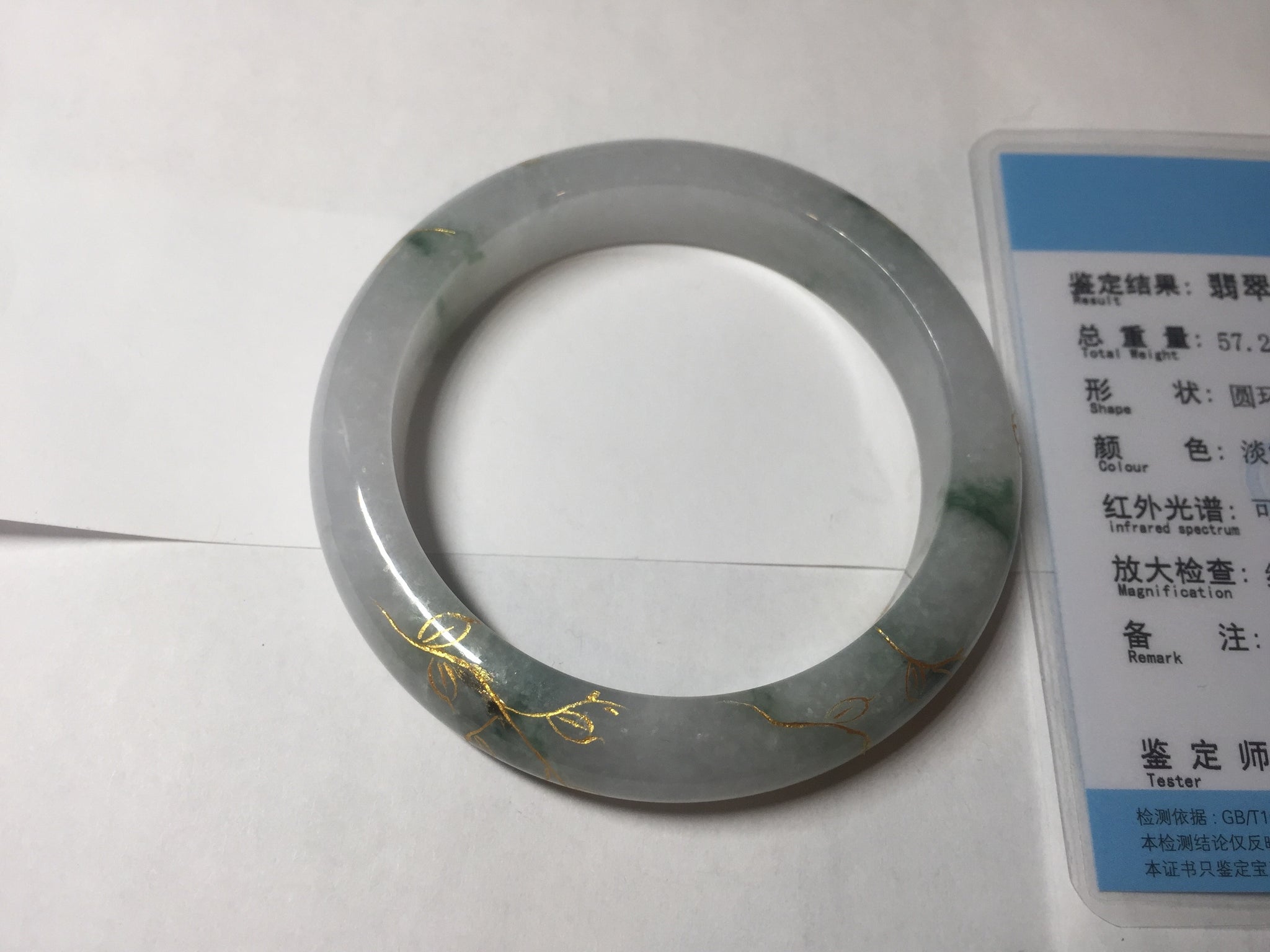Some surface cracks or hairlines covered by the carving. The bangle is firm(Guaranteed!). Cotton spots, cotton lines, and cotton areas.
