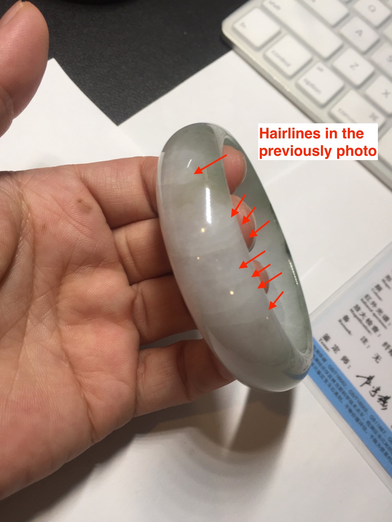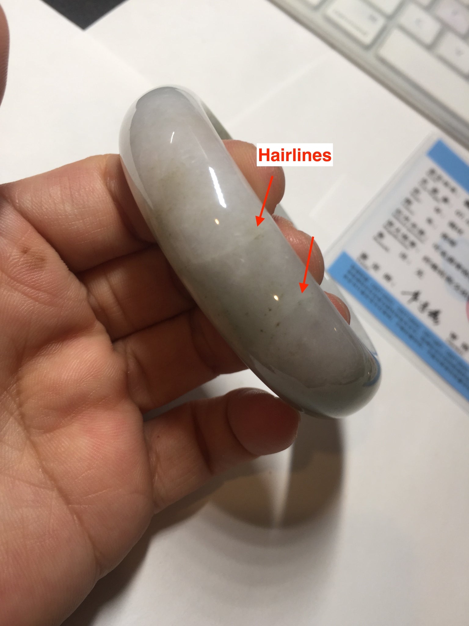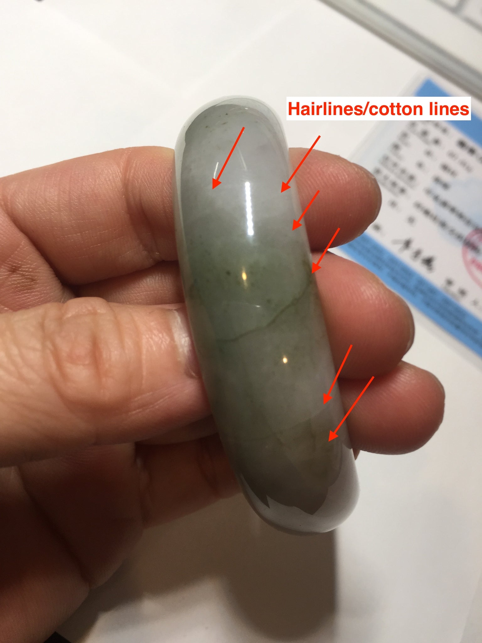 Two small color root cracks. There are more than 9 hairlines. The bangle is solid. It makes a high-pitched sound when clicked. Some cotton areas, and spots.  It has some gray color.