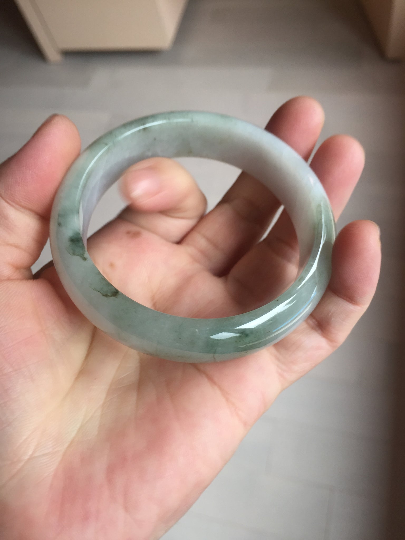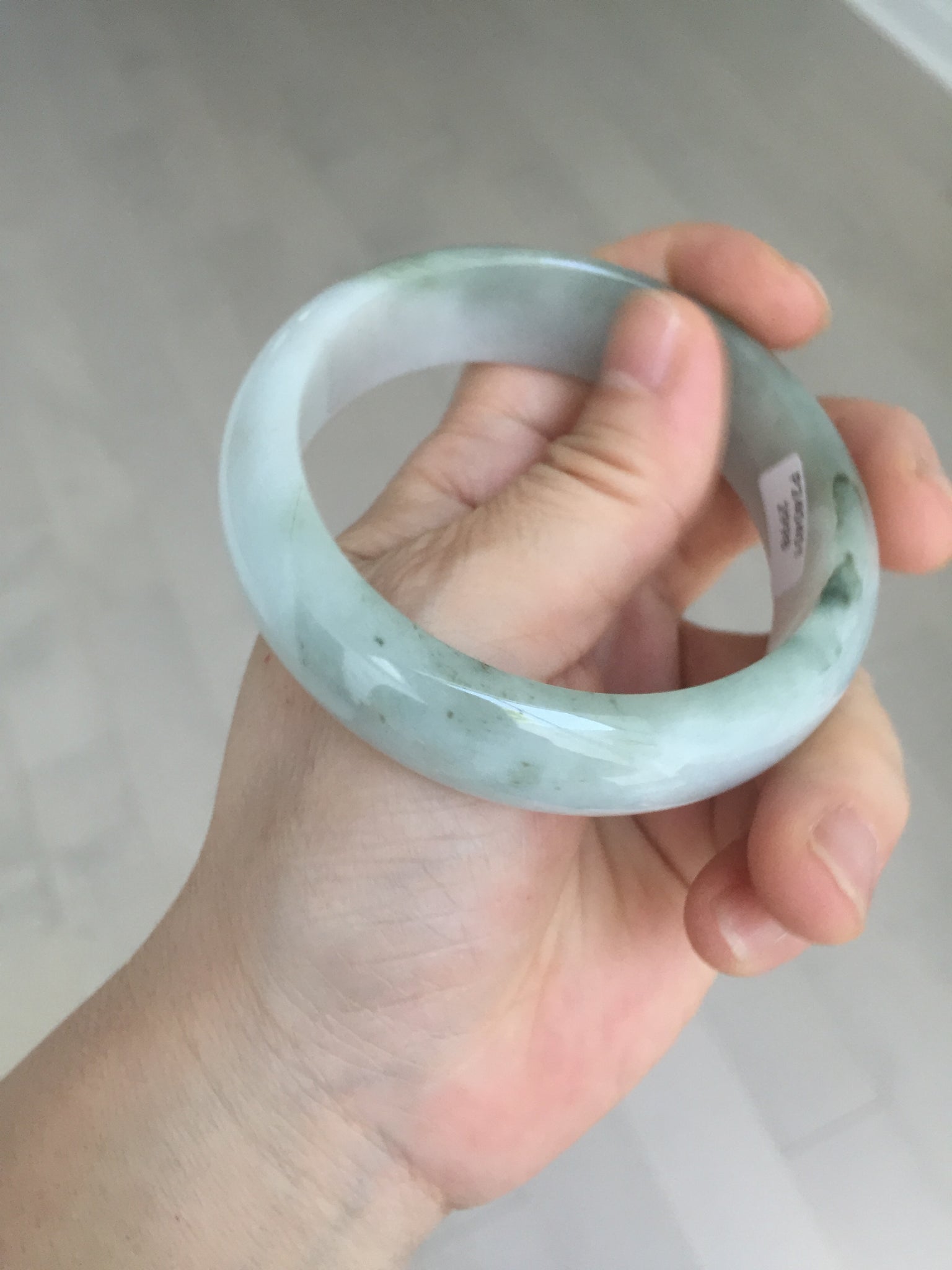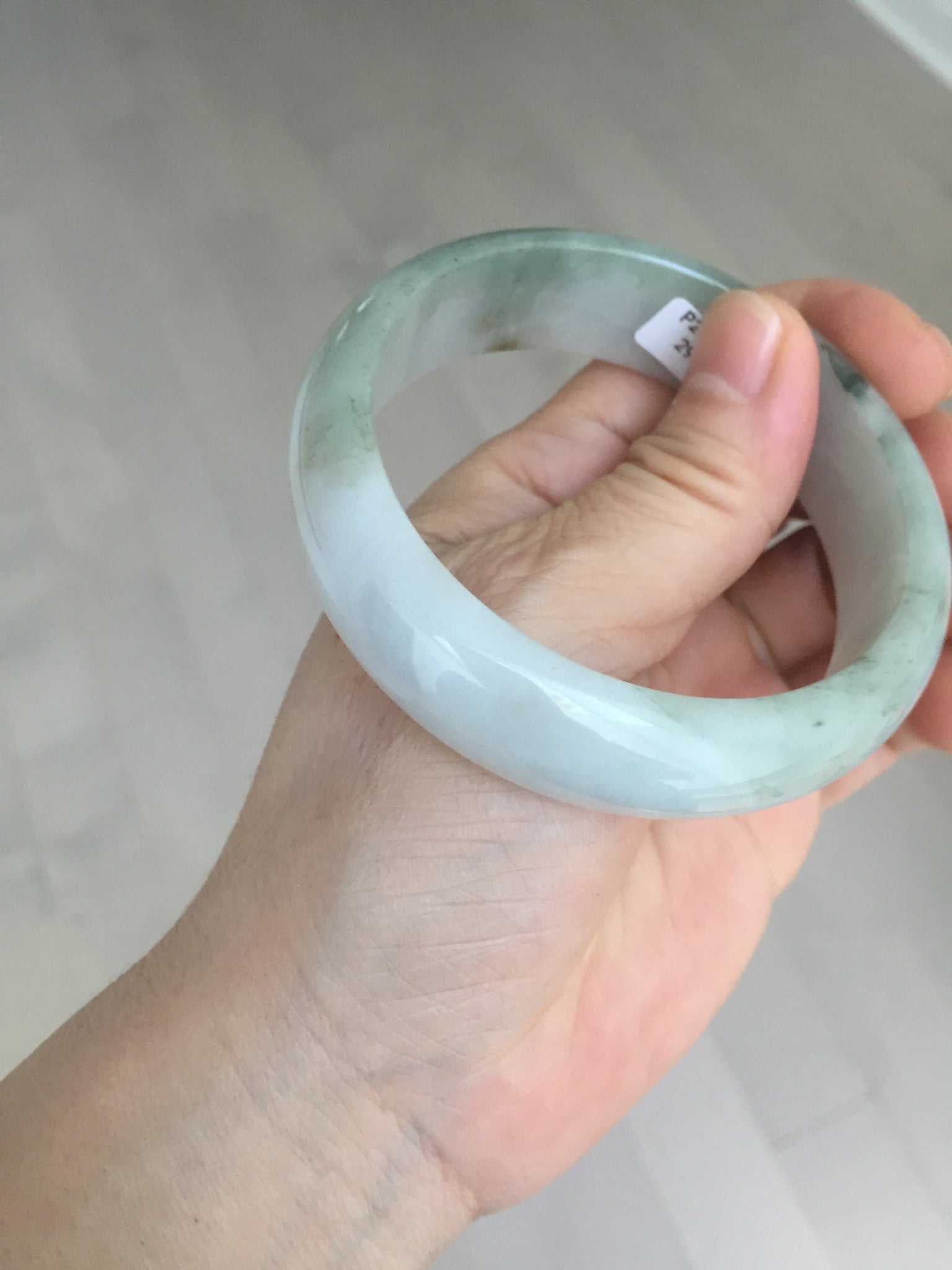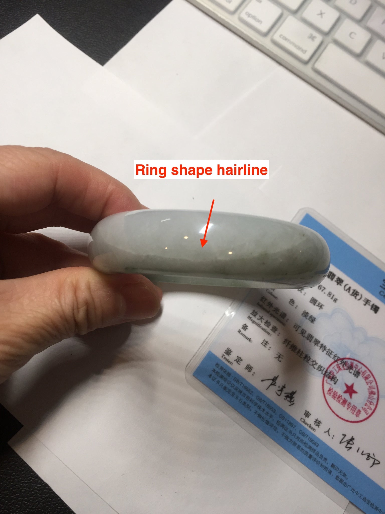 Two small color root cracks. There are more than 9 hairlines. The bangle is solid. It makes a high-pitched sound when clicked. Some cotton areas, and spots.  It has some gray color.