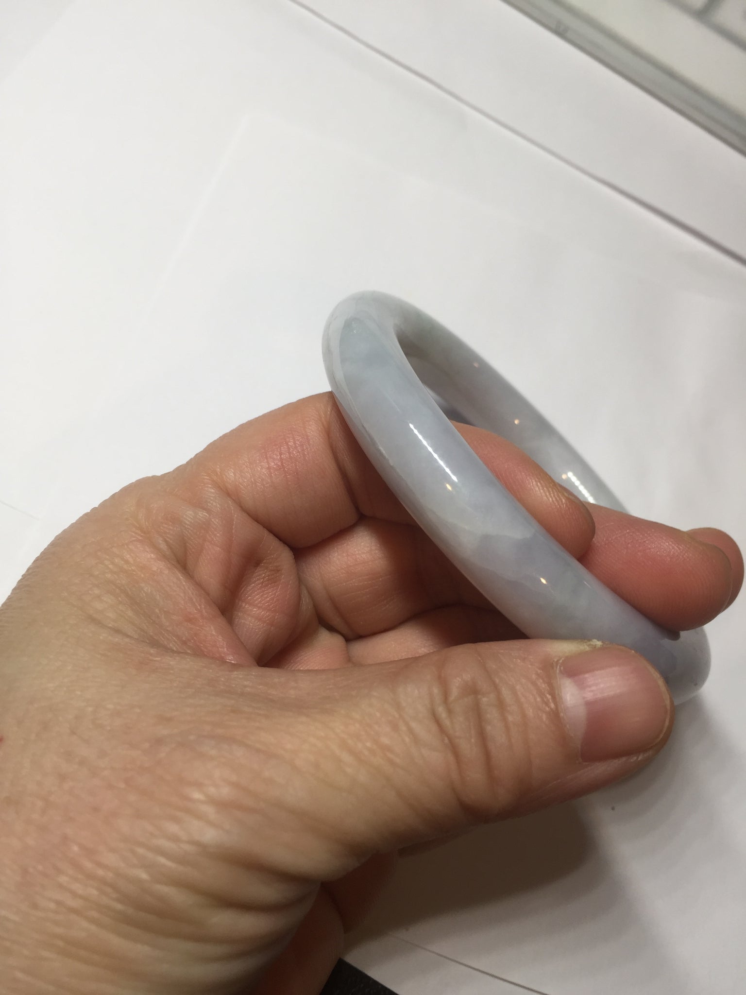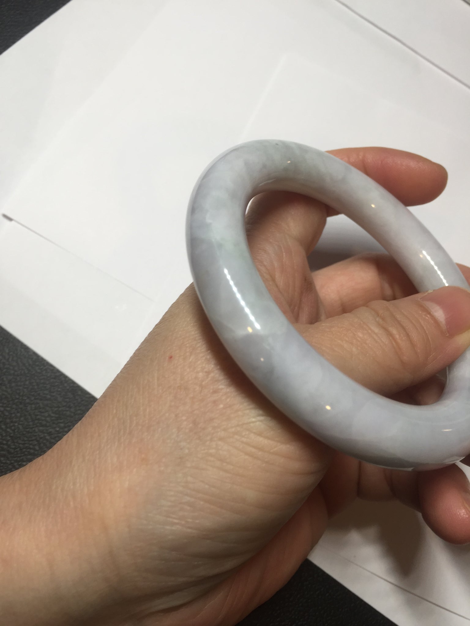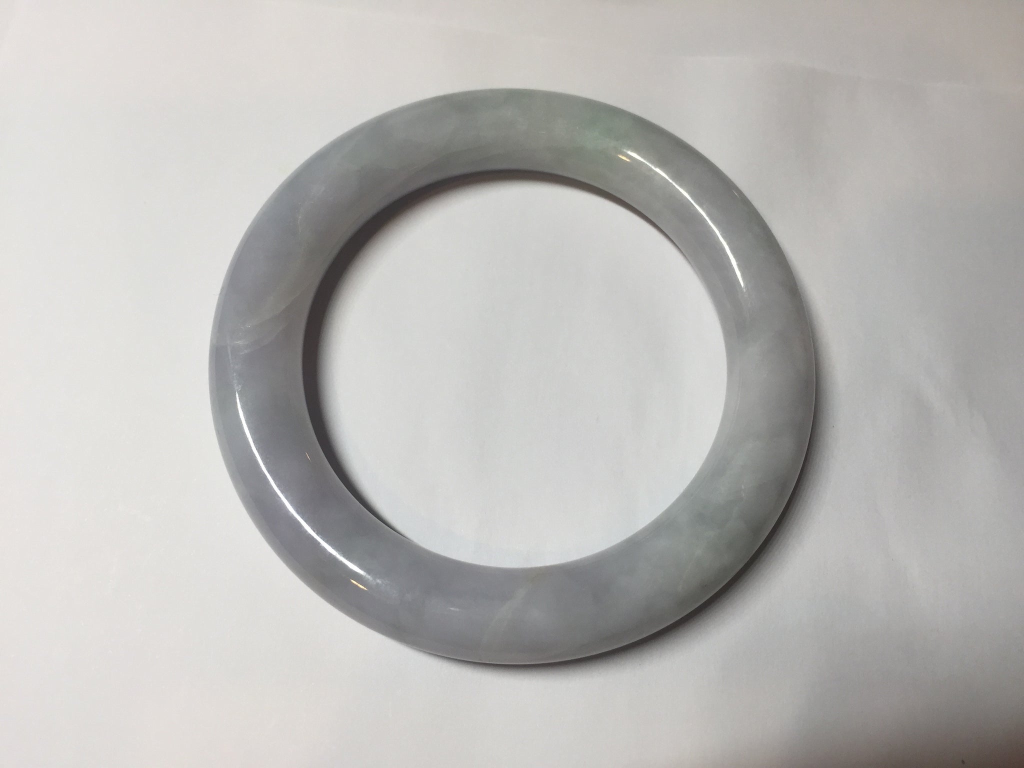 Quite a lots of cracks and surface fissures(I won't mark them since the price is low). The bangle is solid(Guaranteed!). Some hairlines. Some cotton spots and cotton areas. Not watery. Not transparent. The purple is lighter than in the photos due to the purple color always more camera friendly.