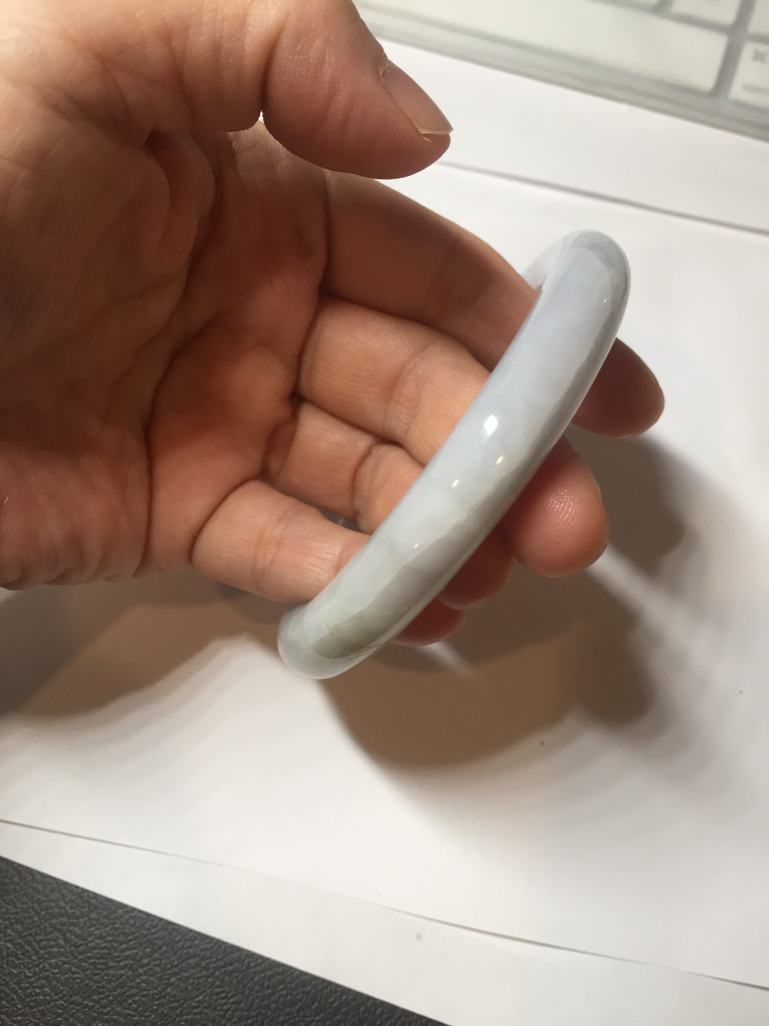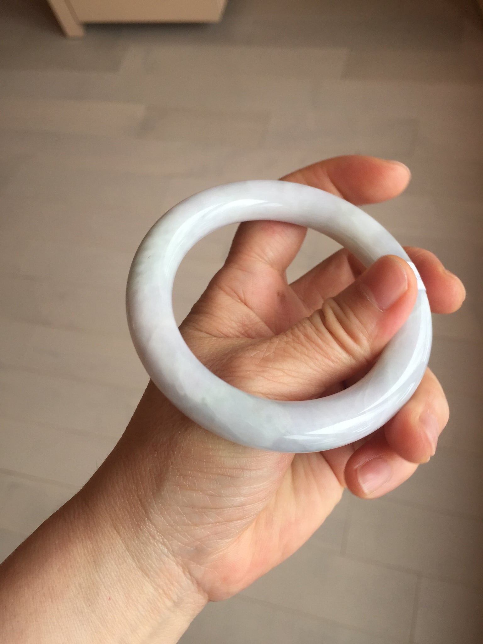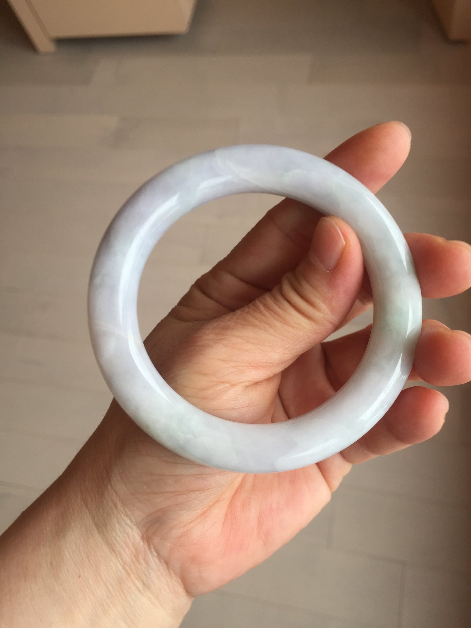 Quite a lots of cracks and surface fissures(I won't mark them since the price is low). The bangle is solid(Guaranteed!). Some hairlines. Some cotton spots and cotton areas. Not watery. Not transparent. The purple is lighter than in the photos due to the purple color always more camera friendly.