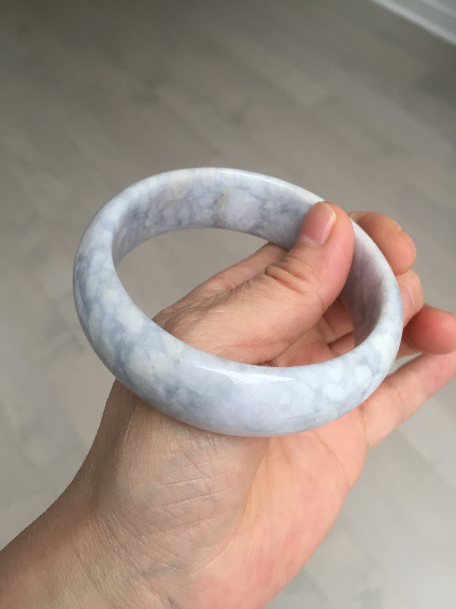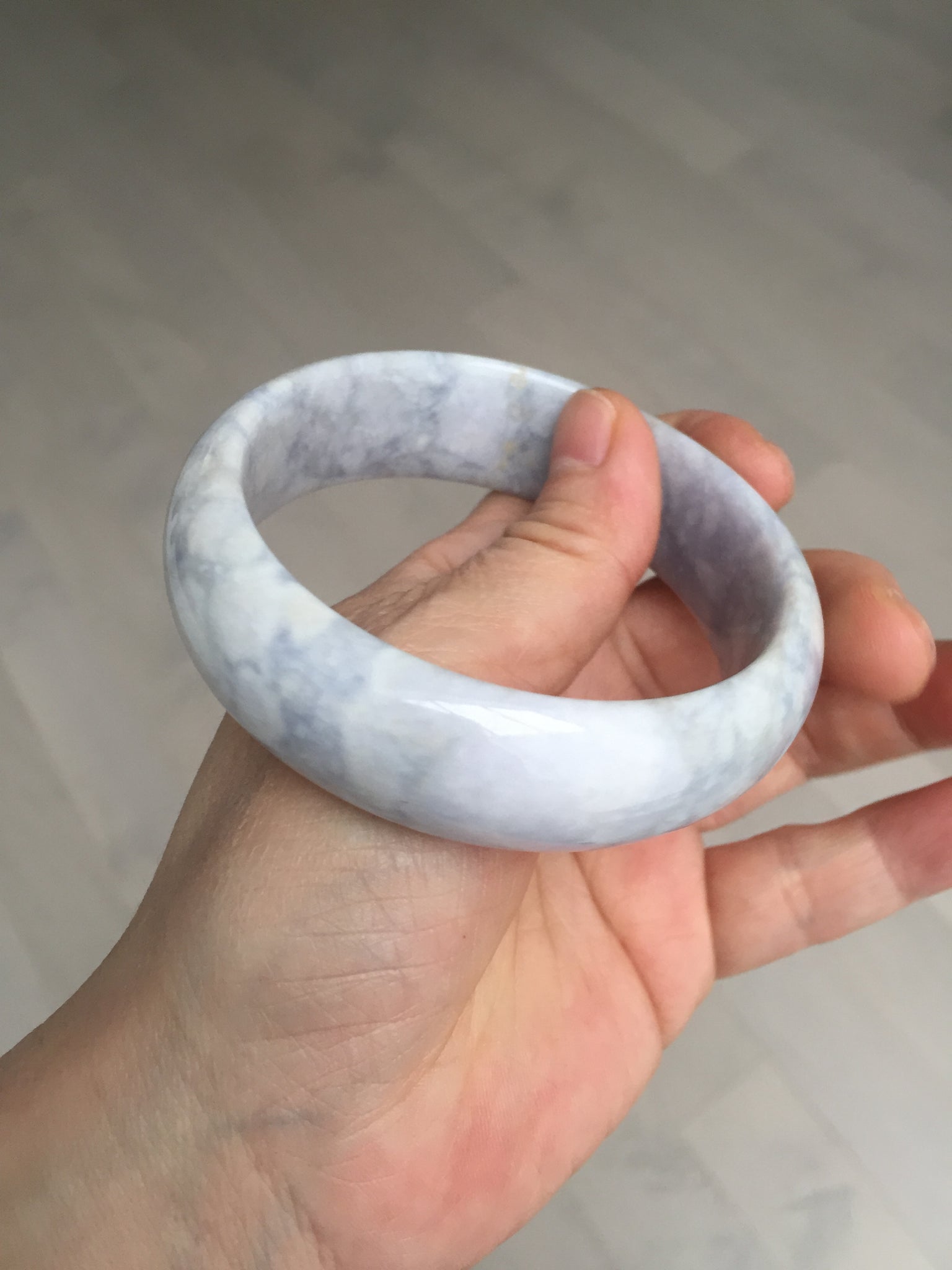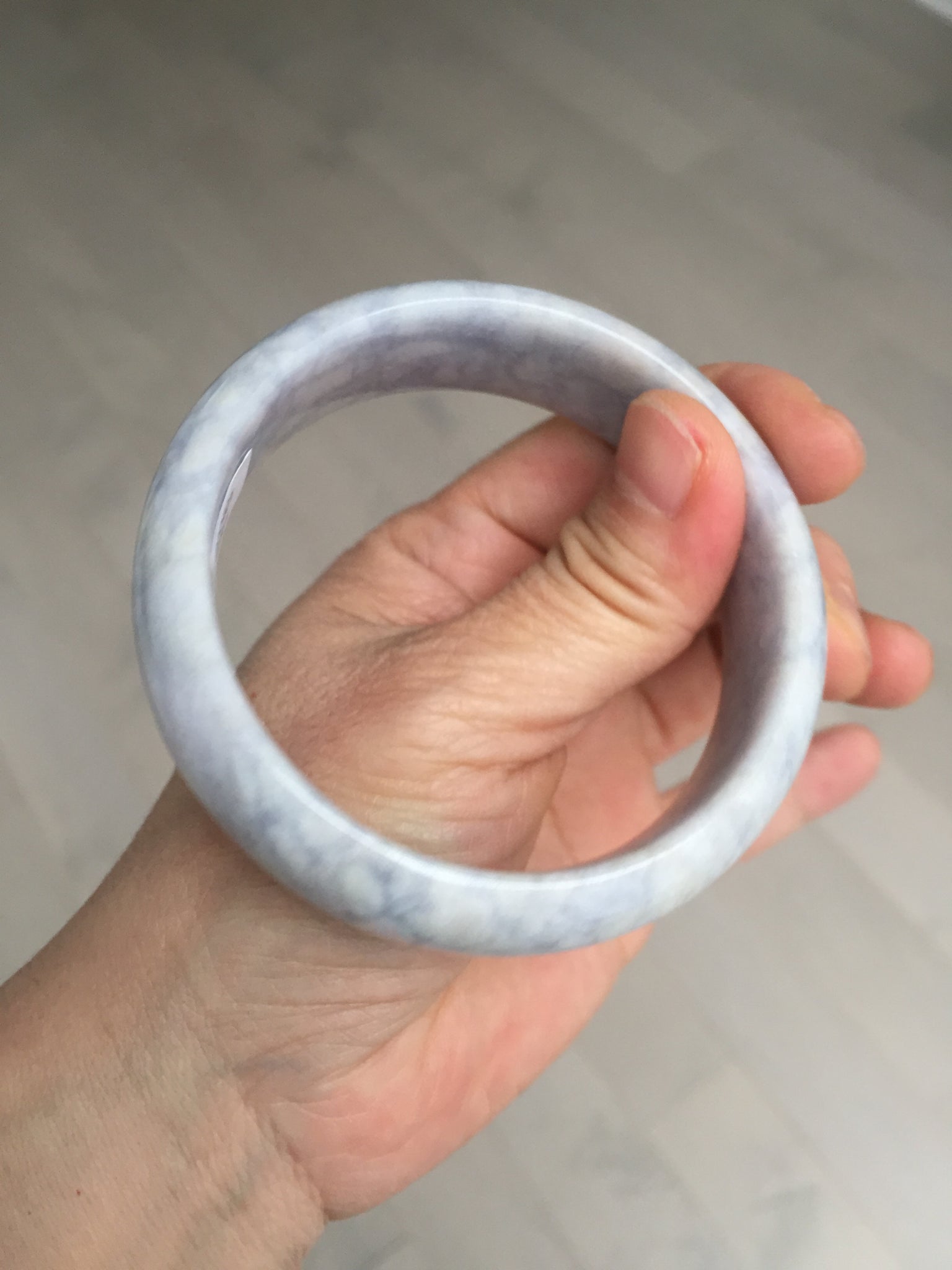 非常漂亮的淡紫翡翠手镯,很多棉团,像浮冰悬浮在淡紫色的河流上,我给起个名字叫冰河时代。厚重,上手很好看。