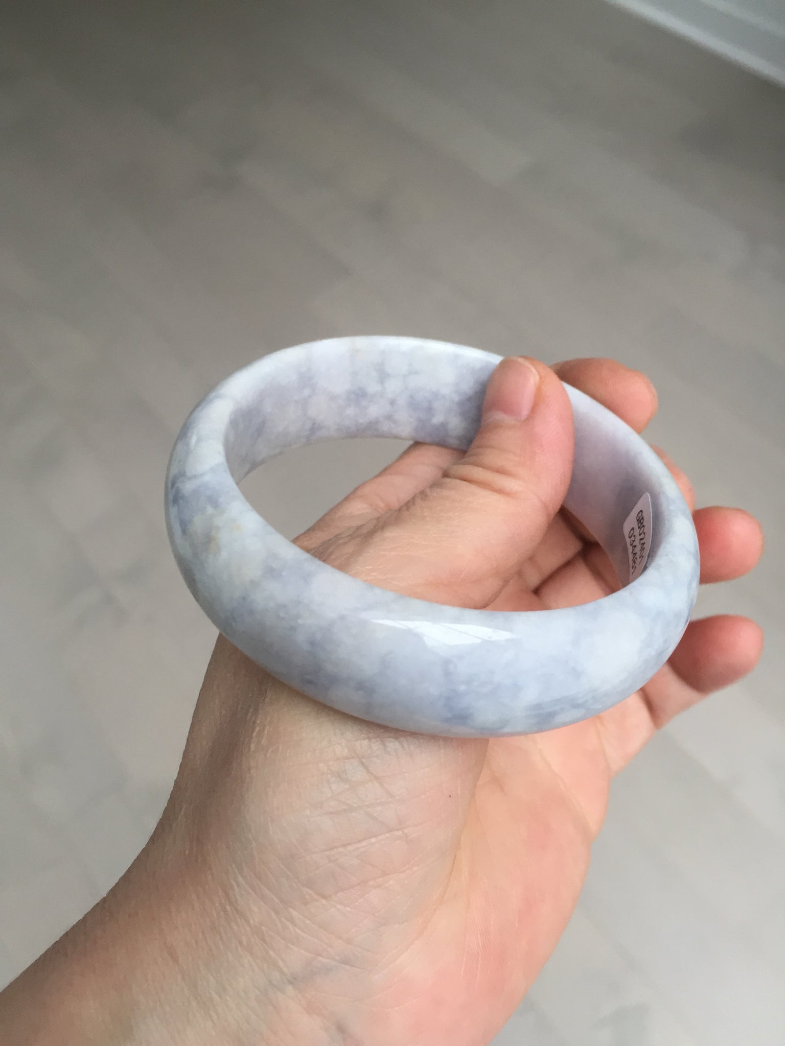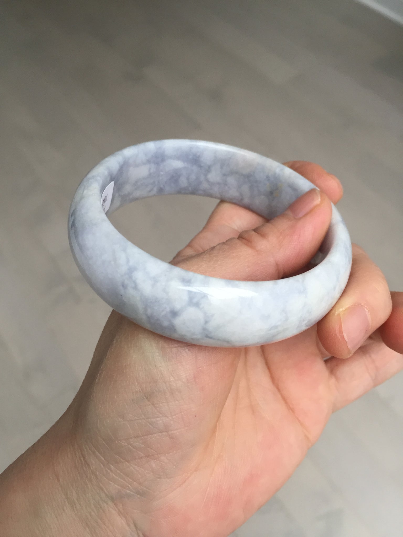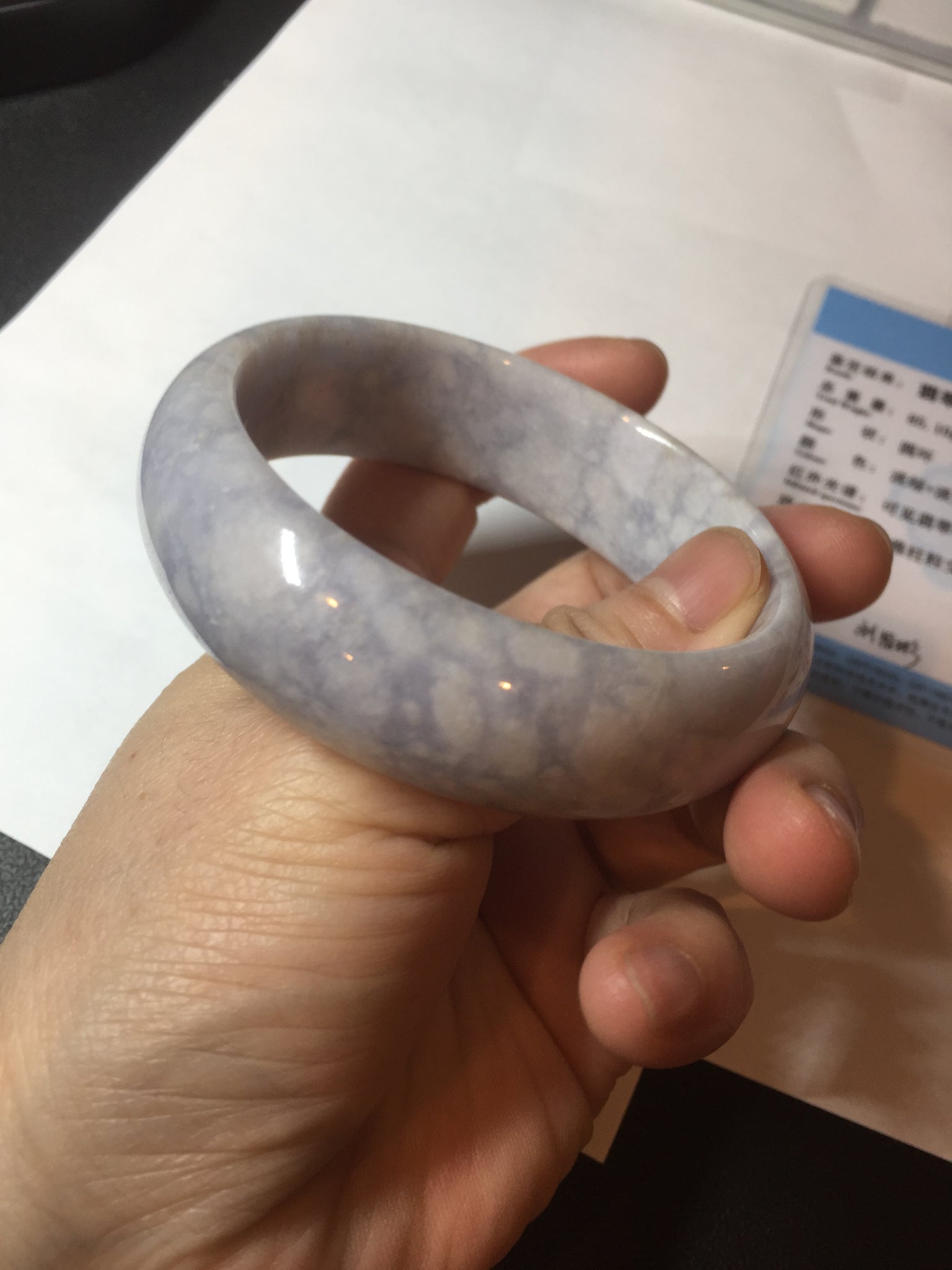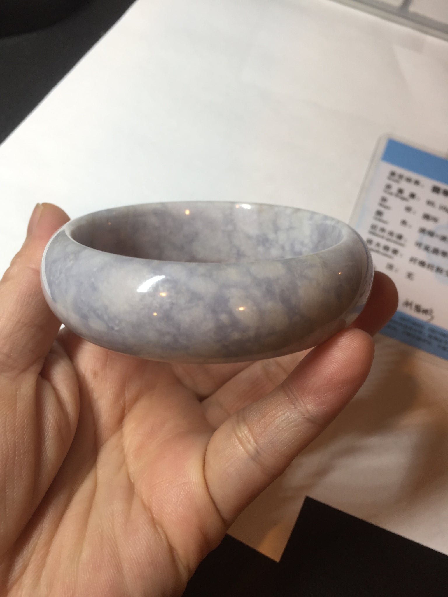 非常漂亮的淡紫翡翠手镯,很多棉团,像浮冰悬浮在淡紫色的河流上,我给起个名字叫冰河时代。厚重,上手很好看。
