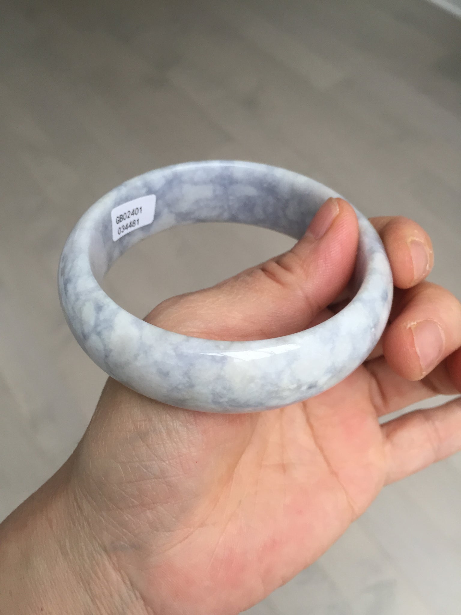 Two surface cracks or scratches. The bangle is solid. Some rough surfaces with wax. Quite a lot of cotton spots and areas with wax.