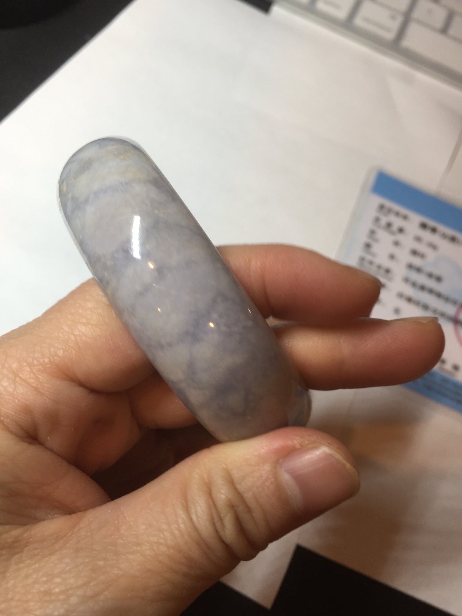 This bangle reaches the jadeite jade certificate criterion. But somehow the the cotton areas also show a medium amount of UV light reaction under UV light. There is not a UV reaction between the cotton areas. I count all this as wax, and I also have a video about it. The price has reflected this already. Please don't order if you feel this is unacceptable.
