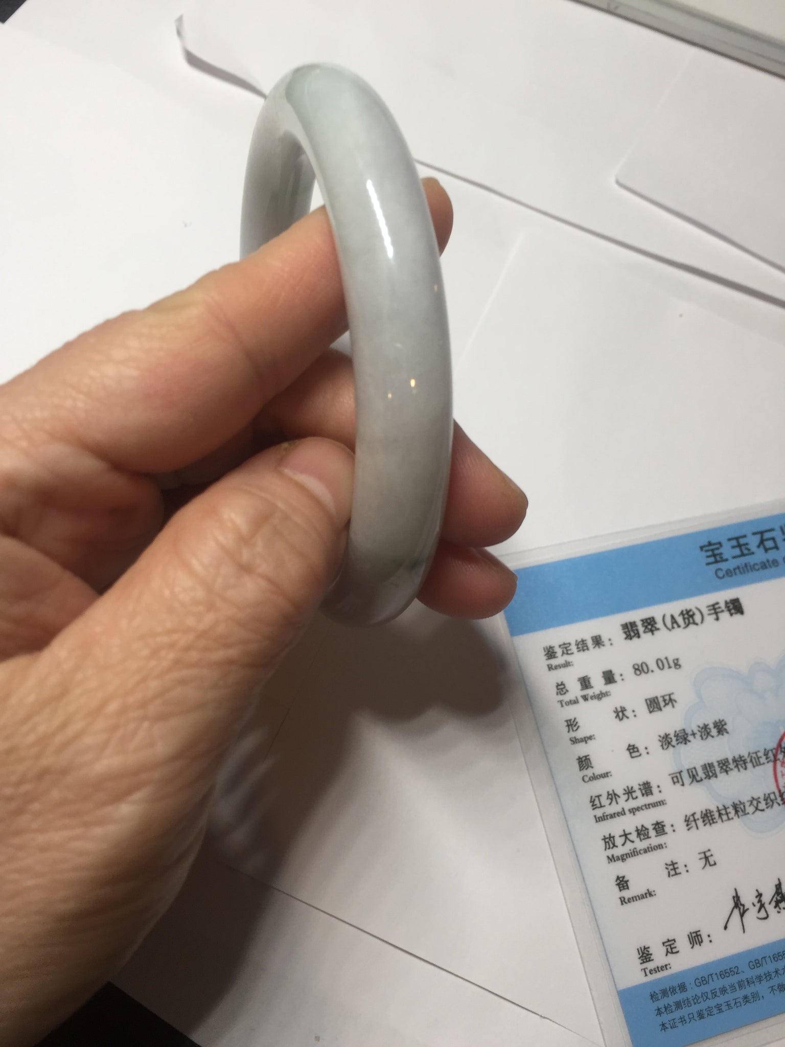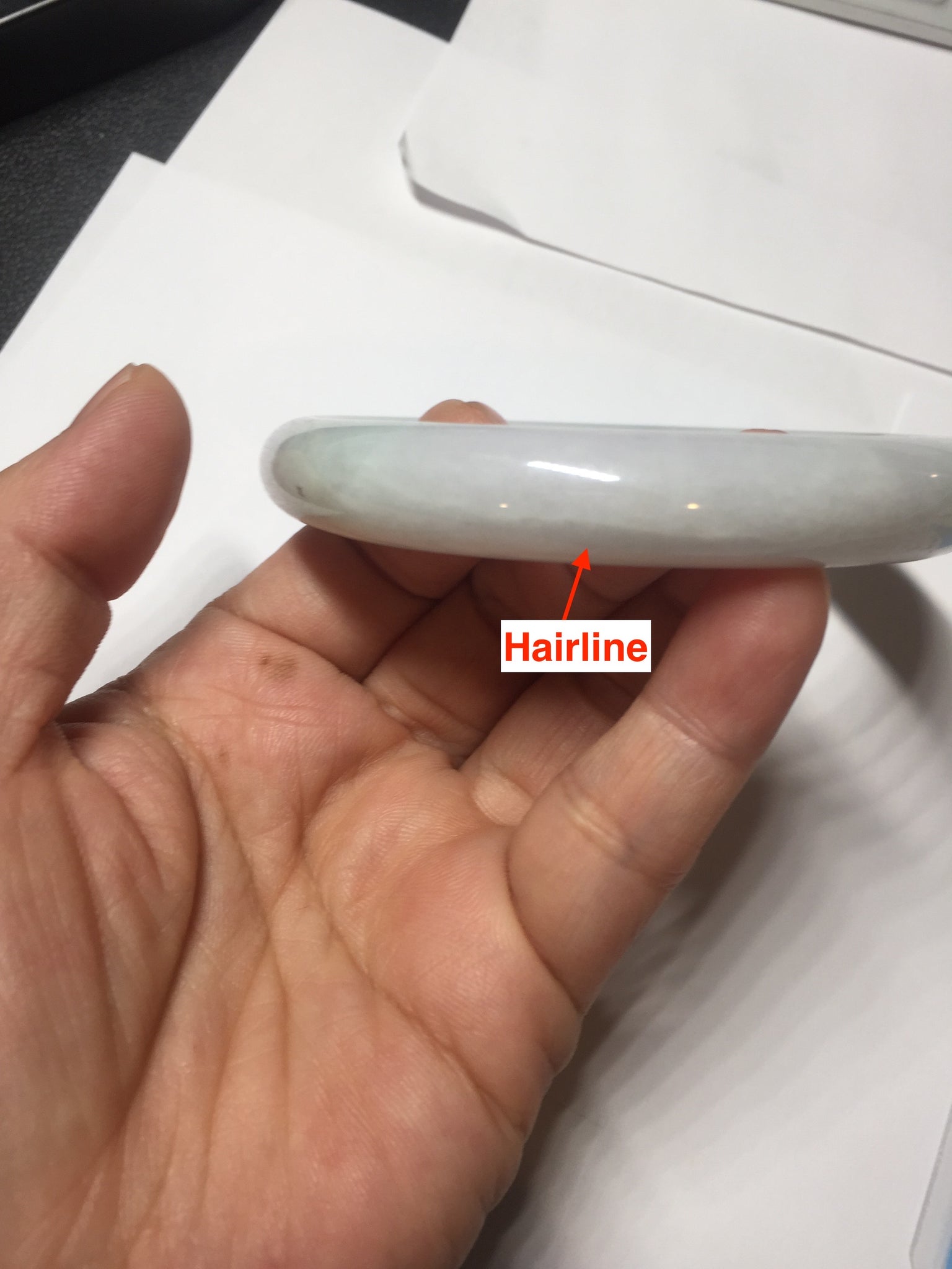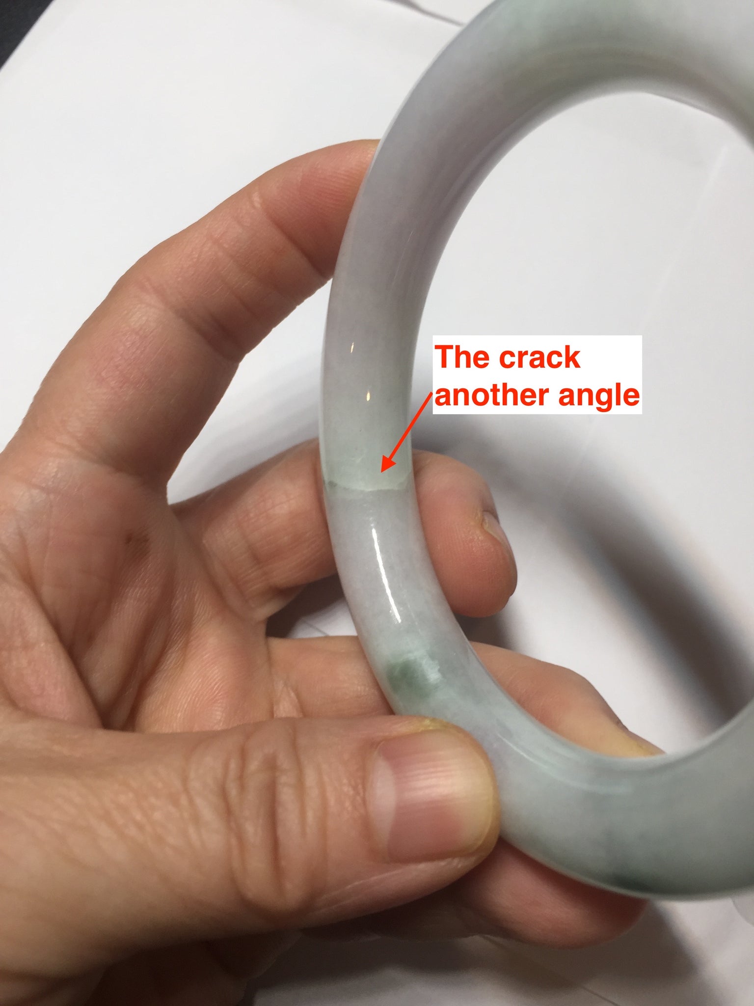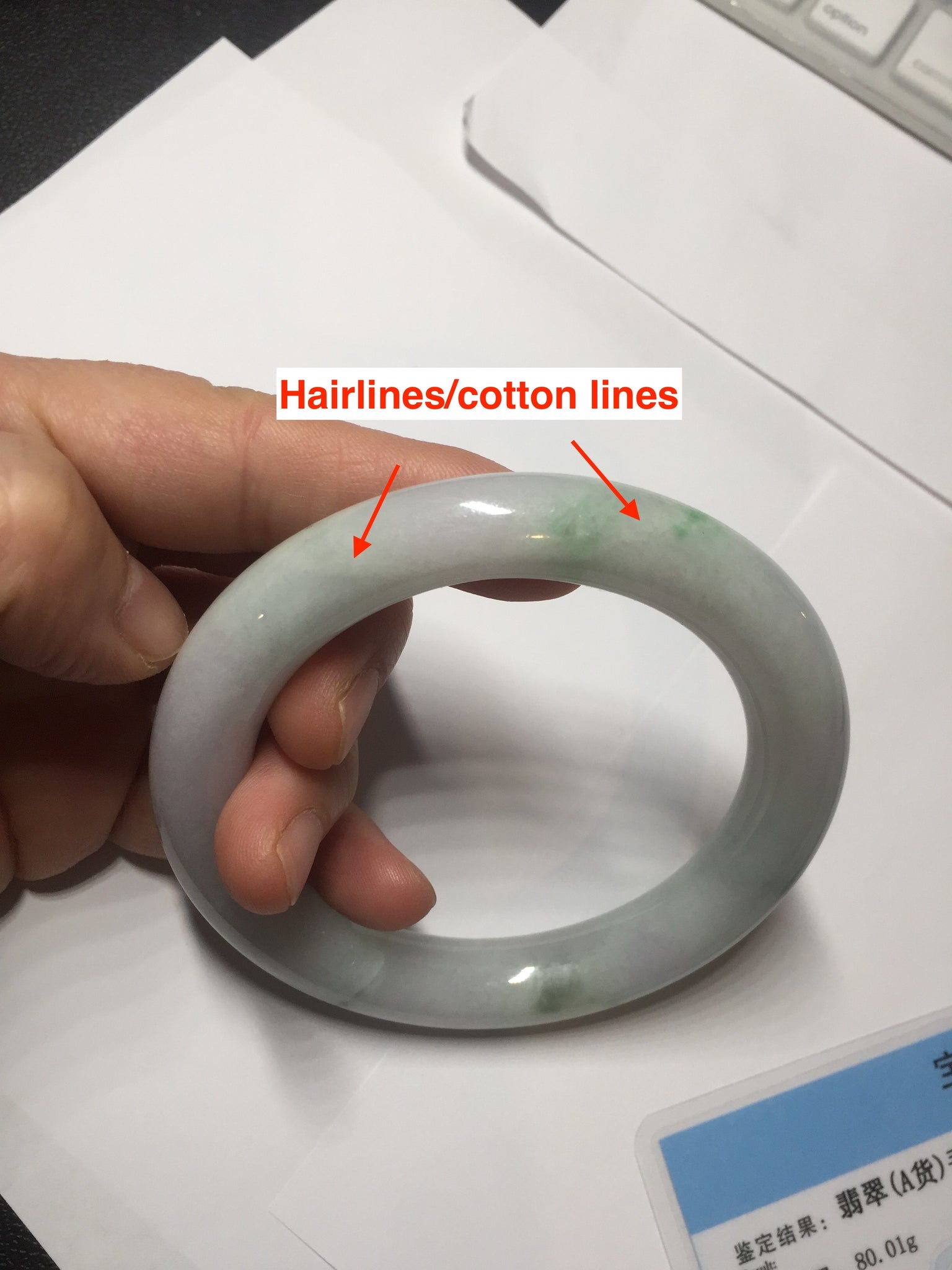 Some surface cracks and fissures. One of them is almost around the bangle. The inner side still connected. The bangle is solid(refund guaranteed!). One small rough surface. Some hairlines. Some cotton spots, cotton lines, and cotton areas. Not transparent. One part is thinner than other parts. The purple is lighter than in the photos due to the purple color always more camera friendly.