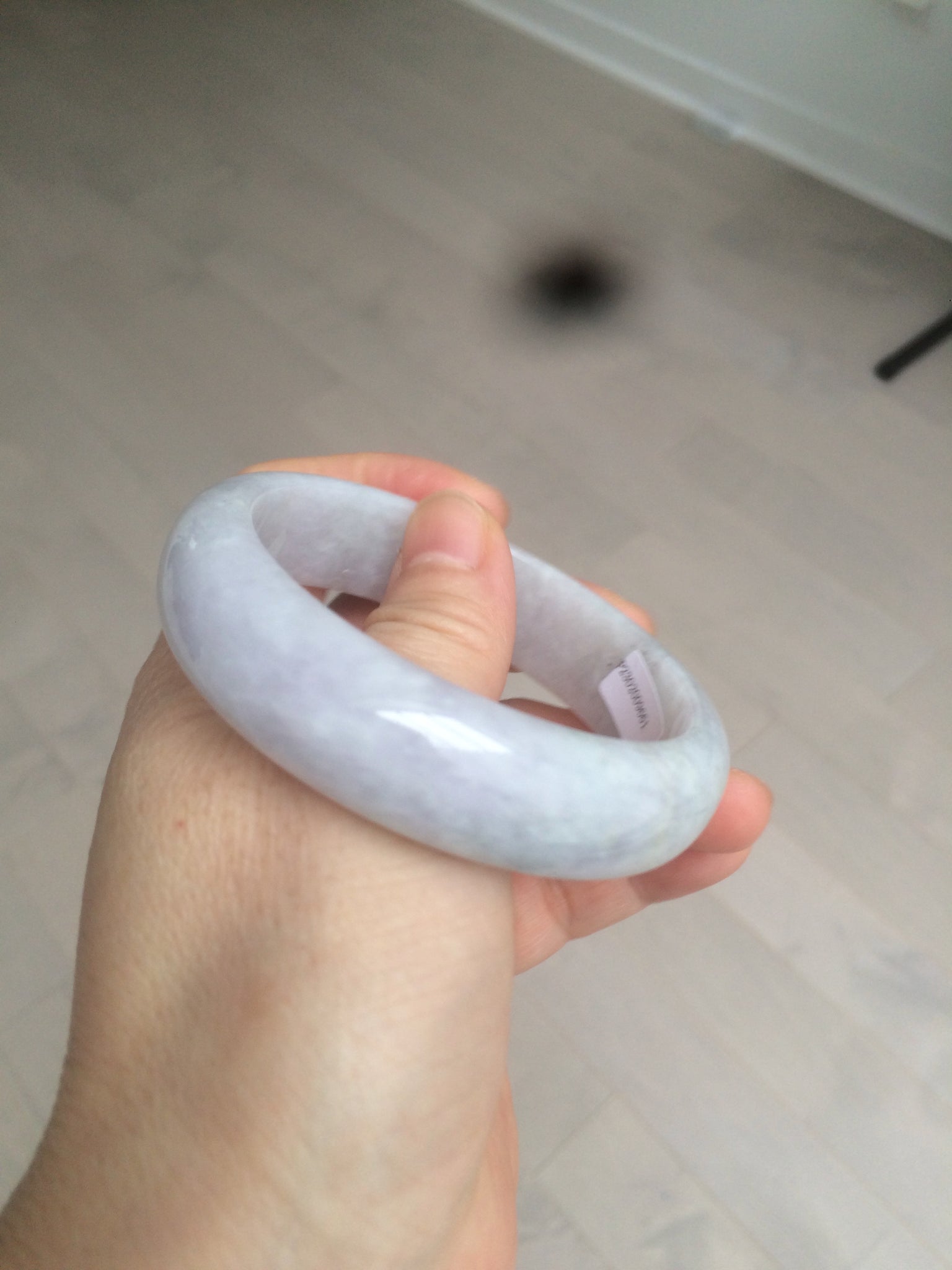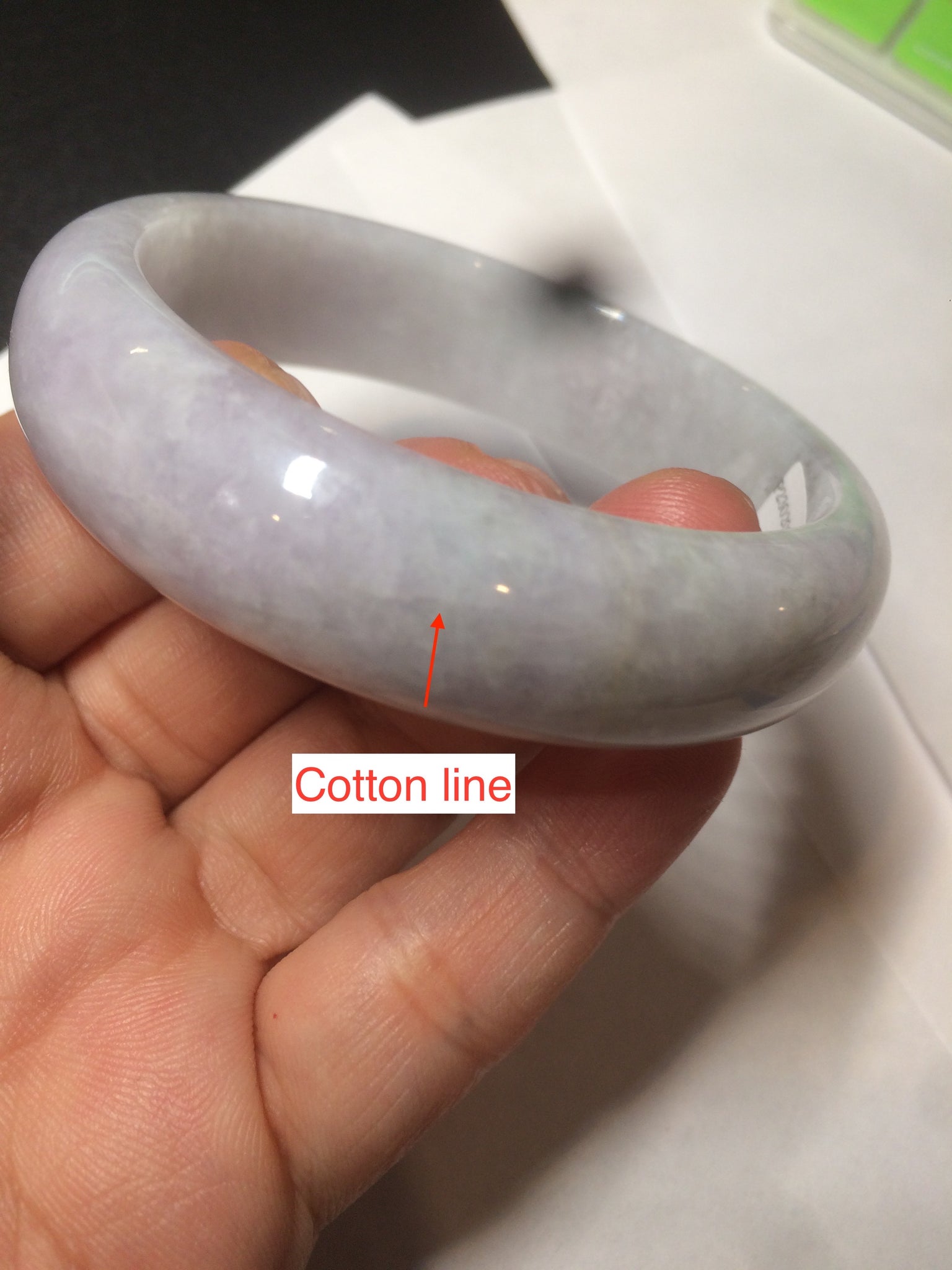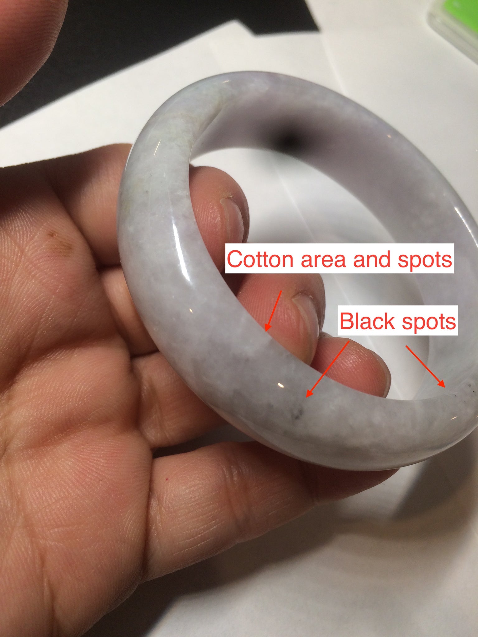 One surface crack. The bangle is solid. The texture is not so fine. Quite a lot of cotton lines, areas, and cotton spots. Black spots. The purple is super light. Lighter than in the photos. Not watery. Not transparent.
