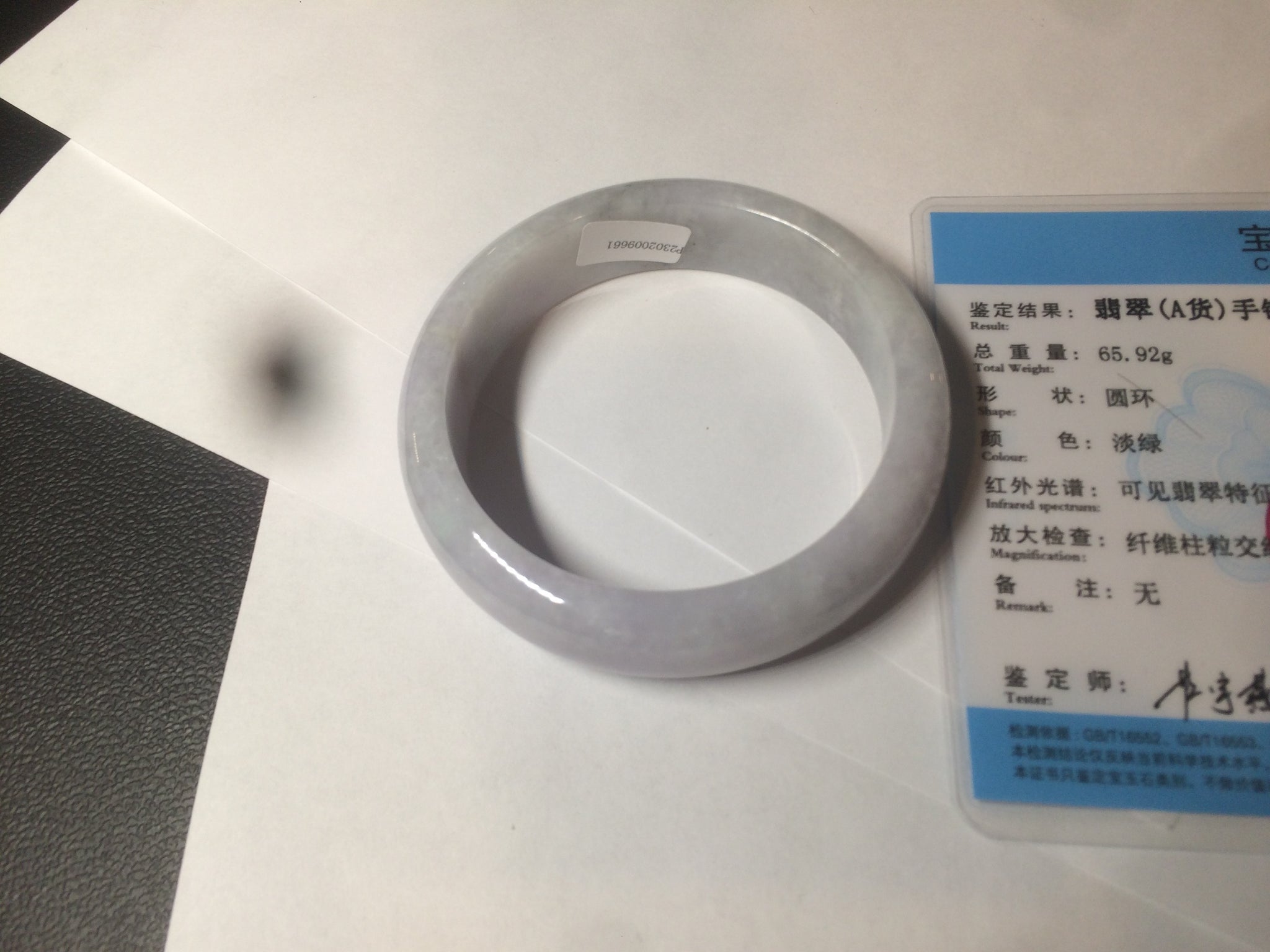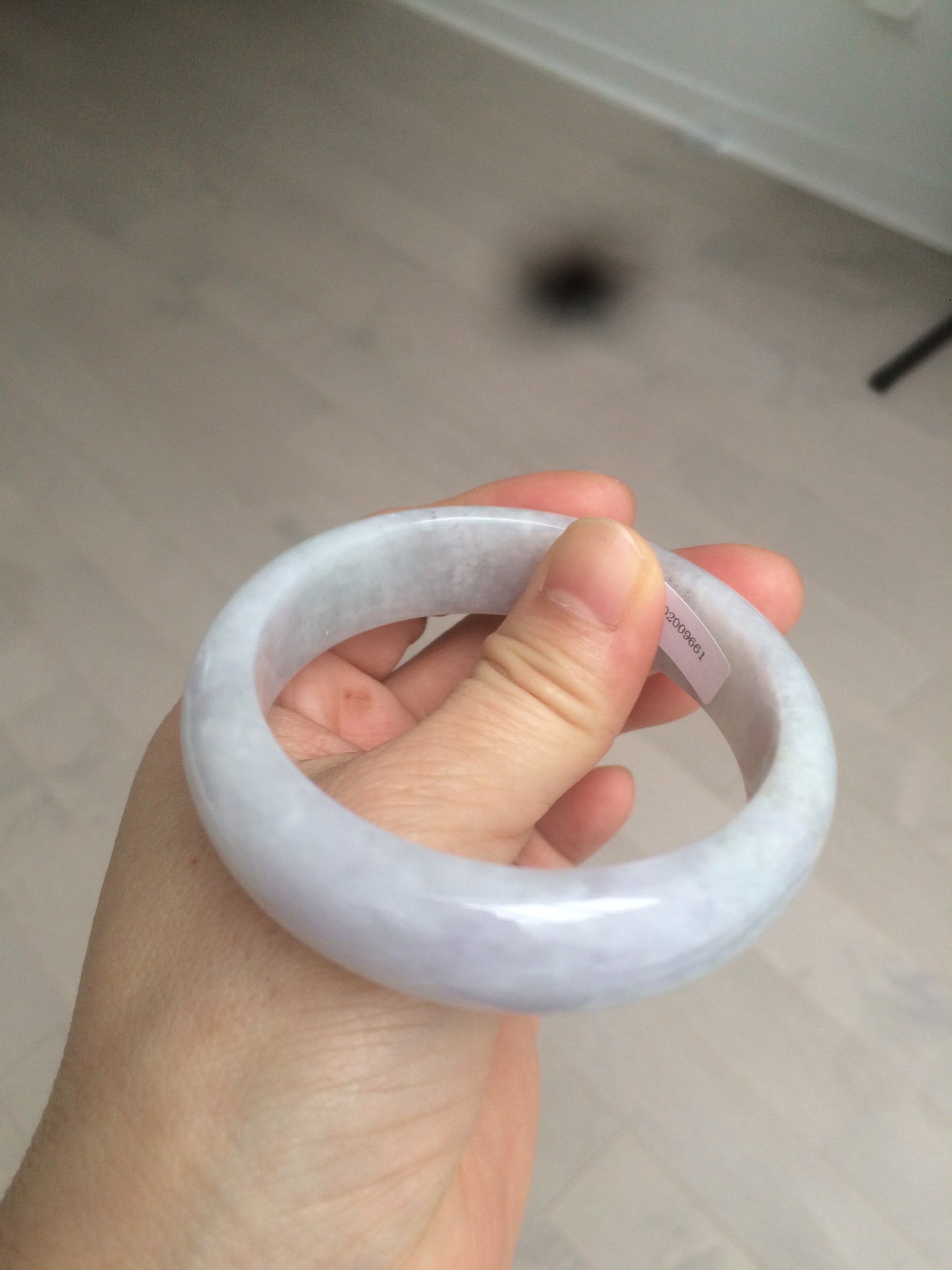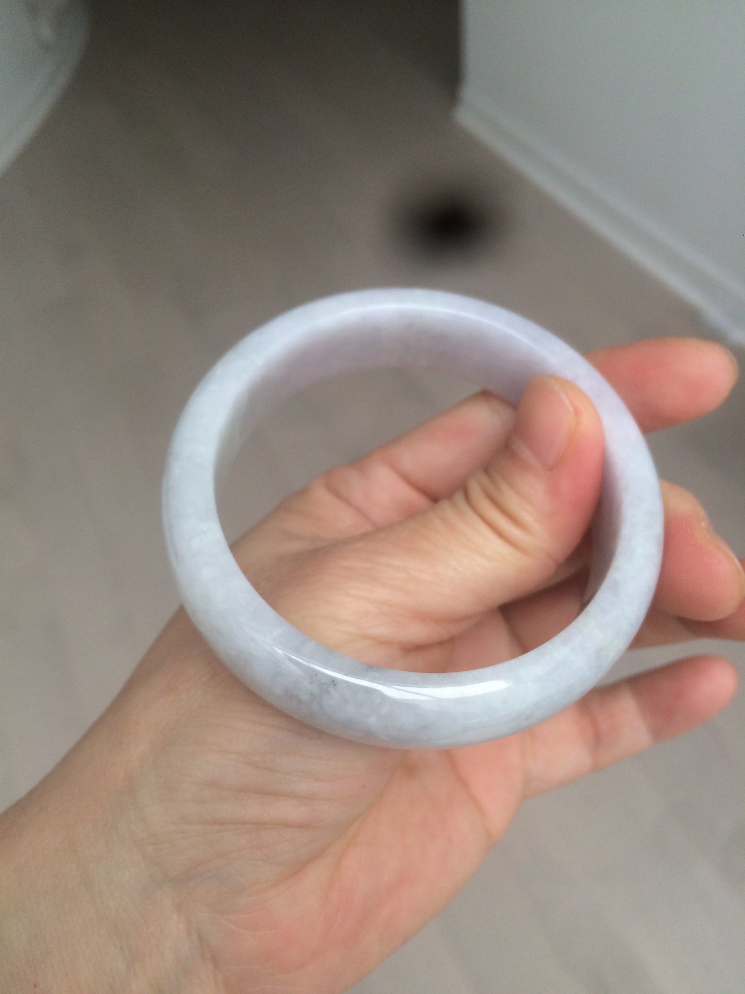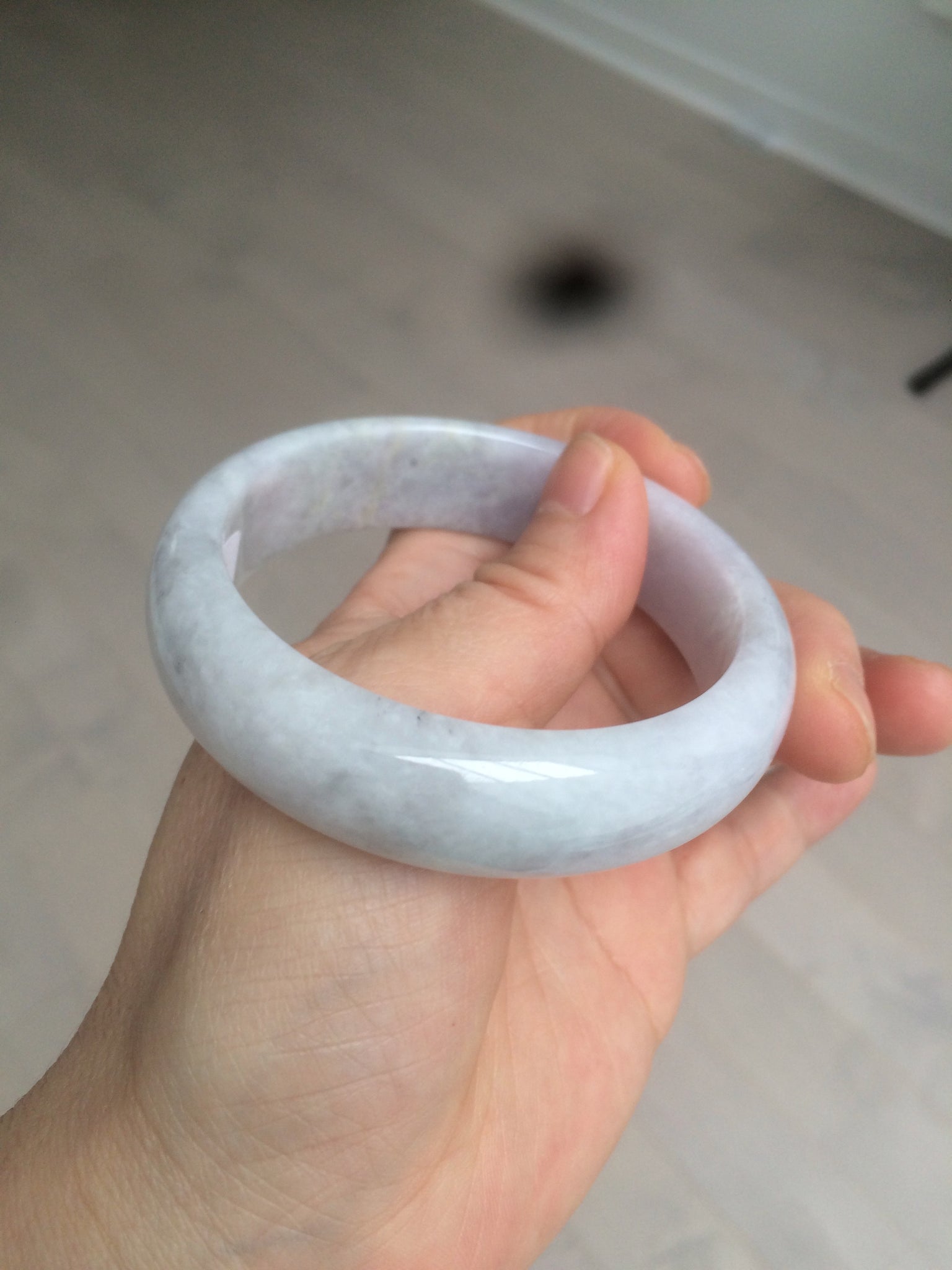 One surface crack. The bangle is solid. The texture is not so fine. Quite a lot of cotton lines, areas, and cotton spots. Black spots. The purple is super light. Lighter than in the photos. Not watery. Not transparent.