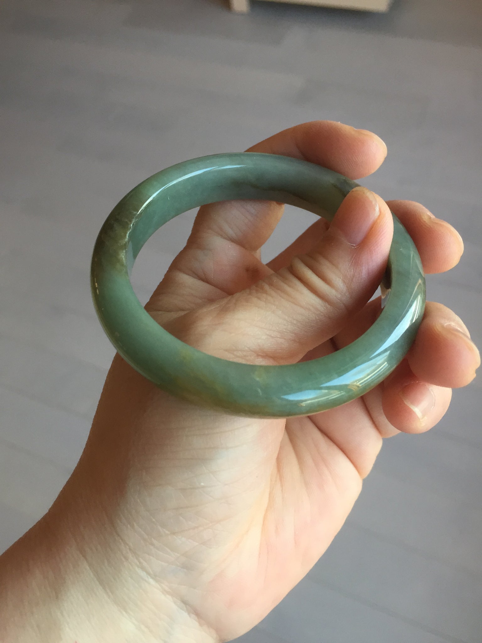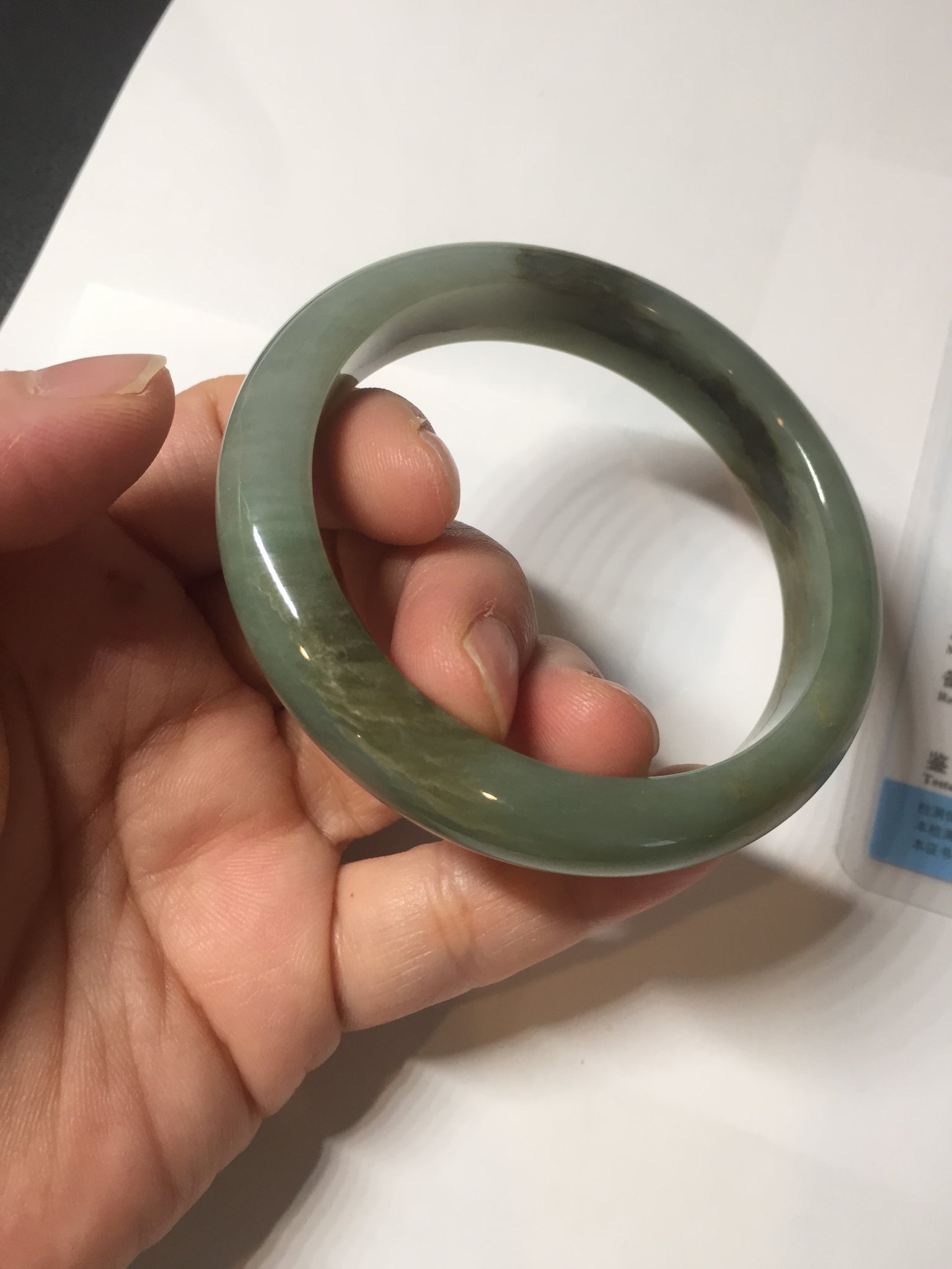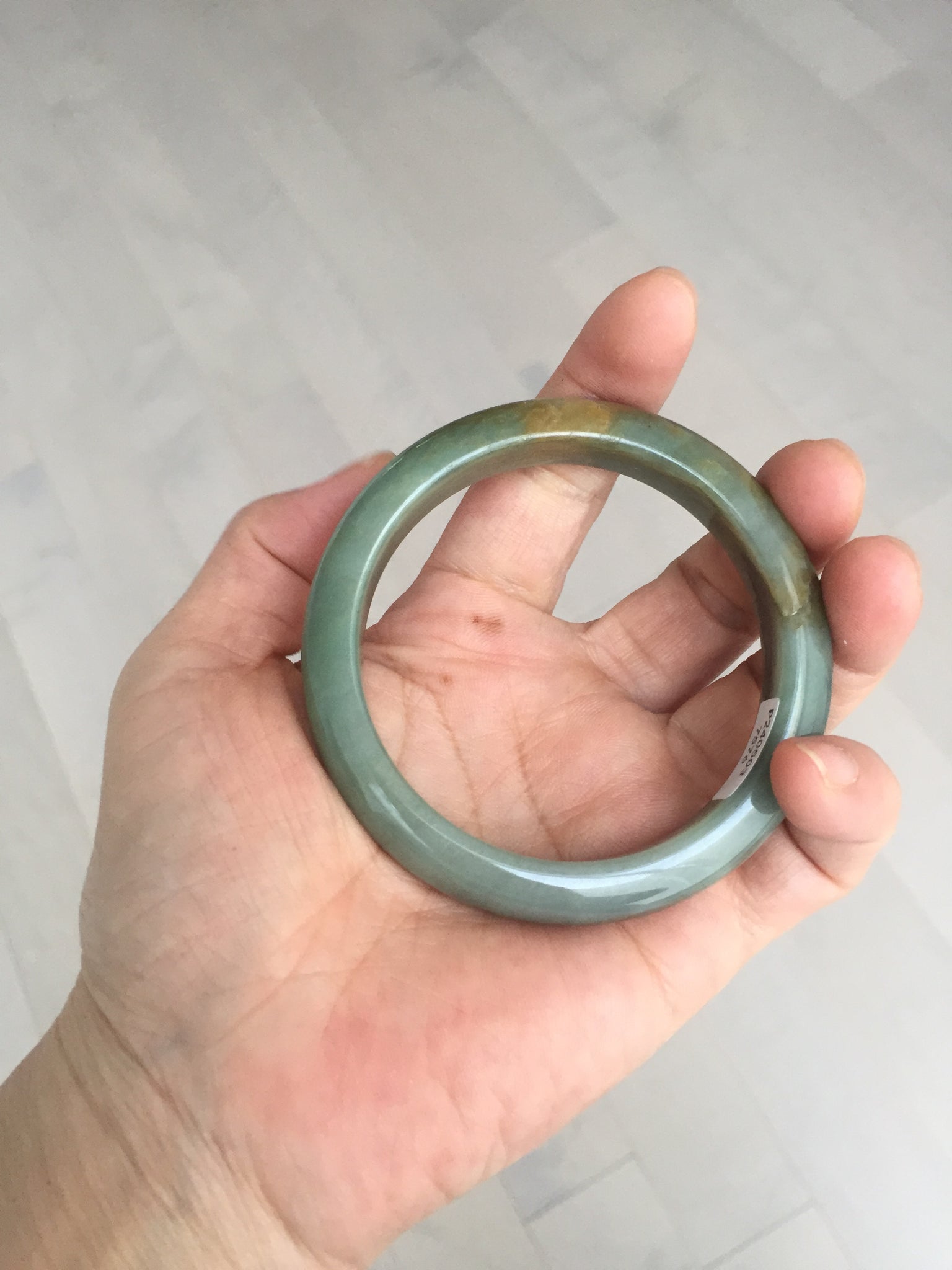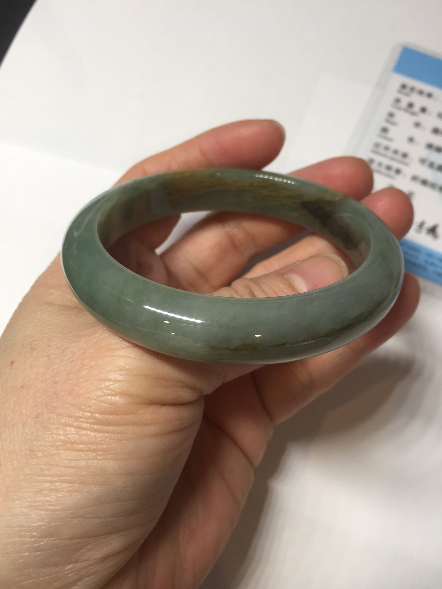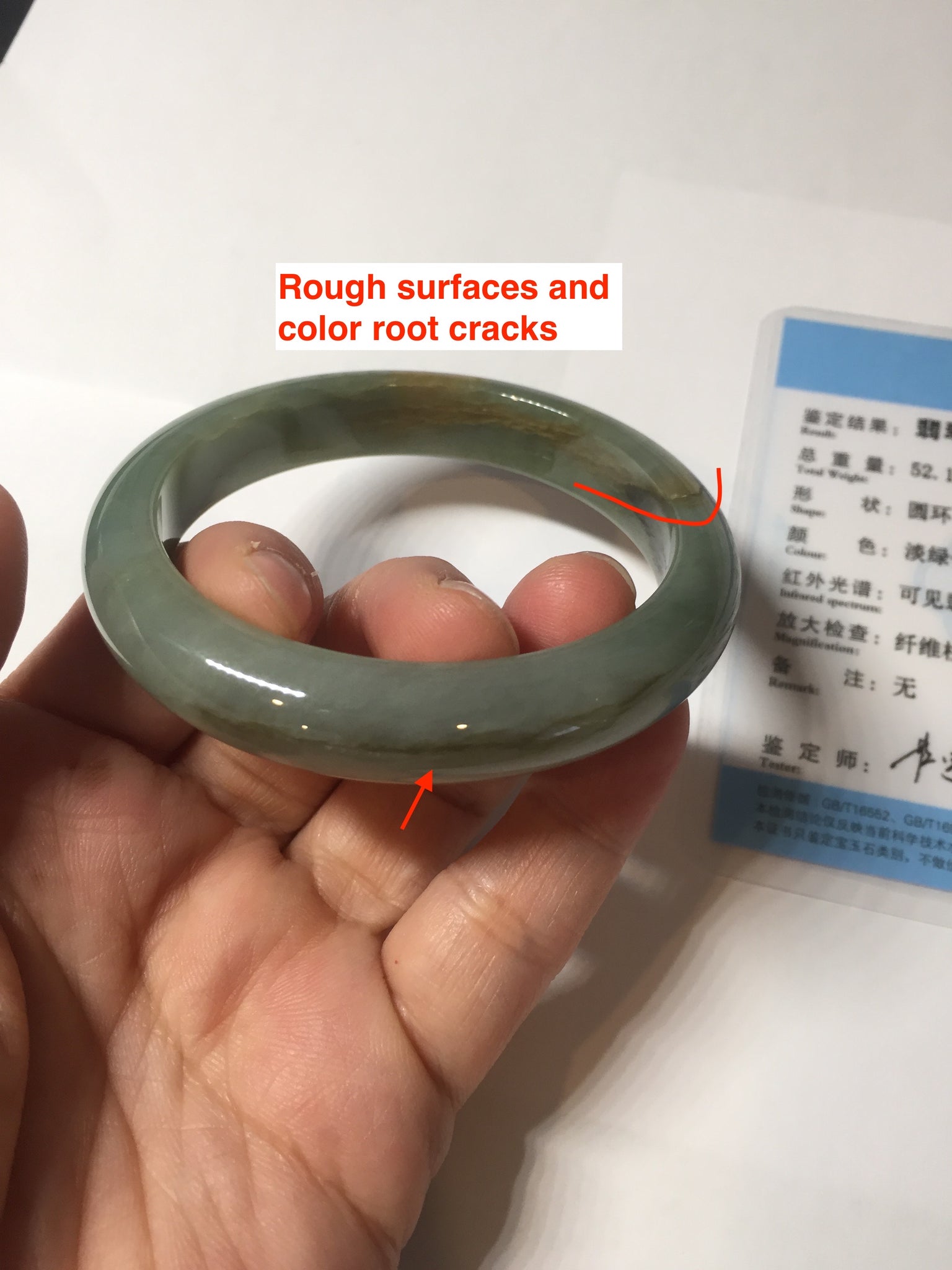 Some brown/black areas with color root cracks or fissure. The bangle is solid(Guaranteed!). Makes high pitch sound when tapped. Some color roots. Some cotton lines and cotton spots. One part is thinner than other parts. Has some gray/black color.