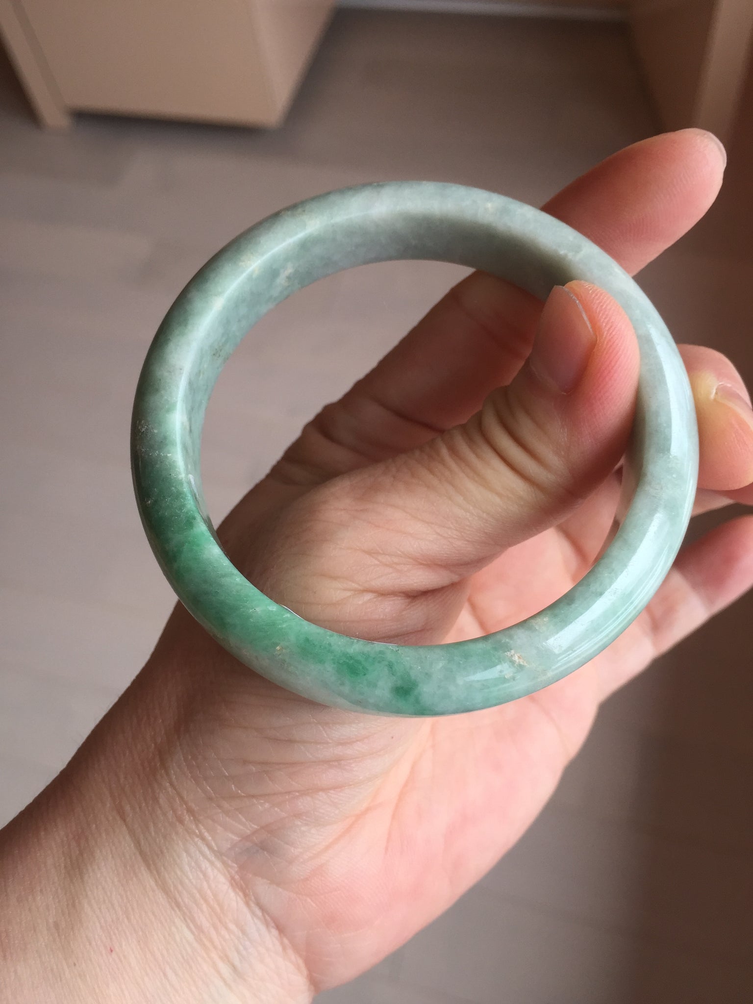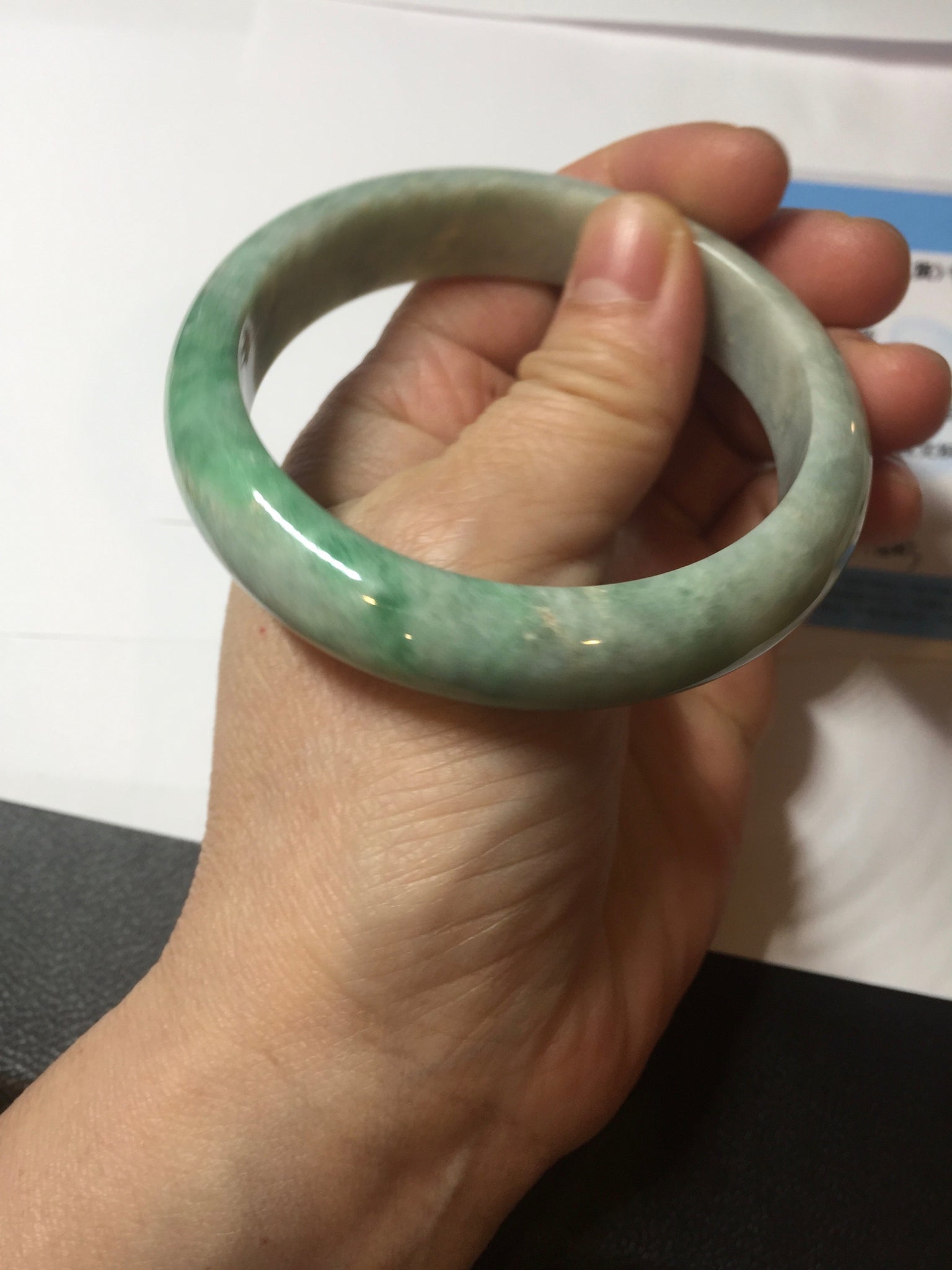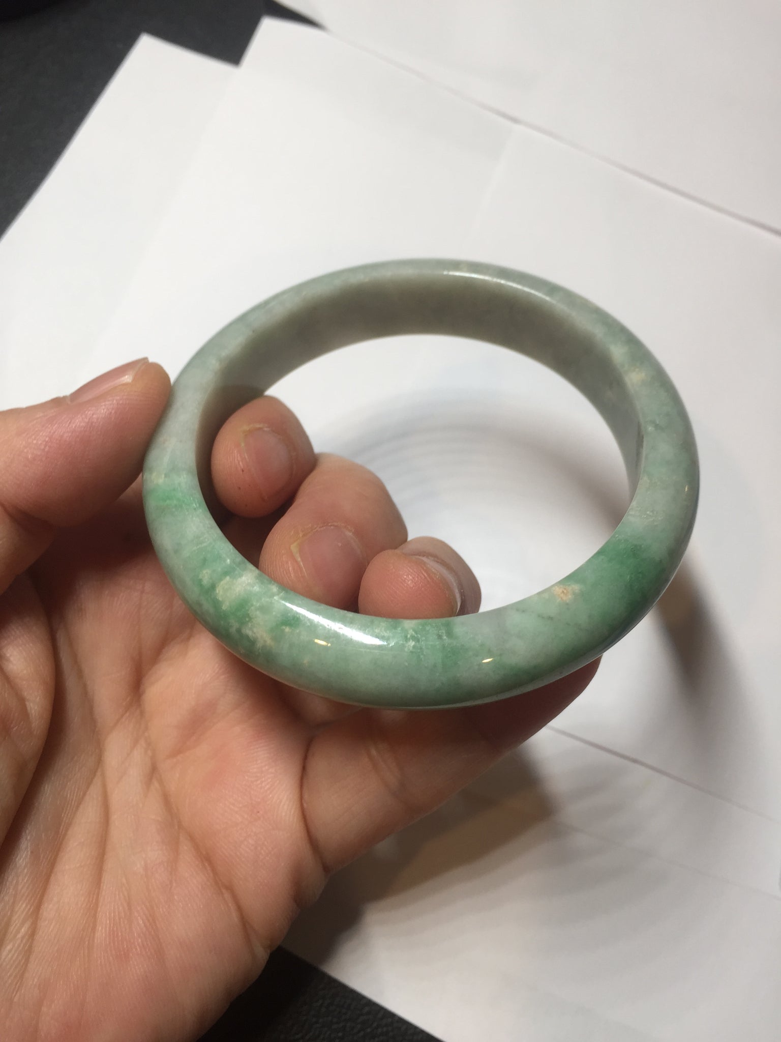 Imperfections: No crack. No hairline. Some rough surfaces and small mine pits. The bangle is solid. Some cotton spots, lines, and areas. Not transparent. Not watery.