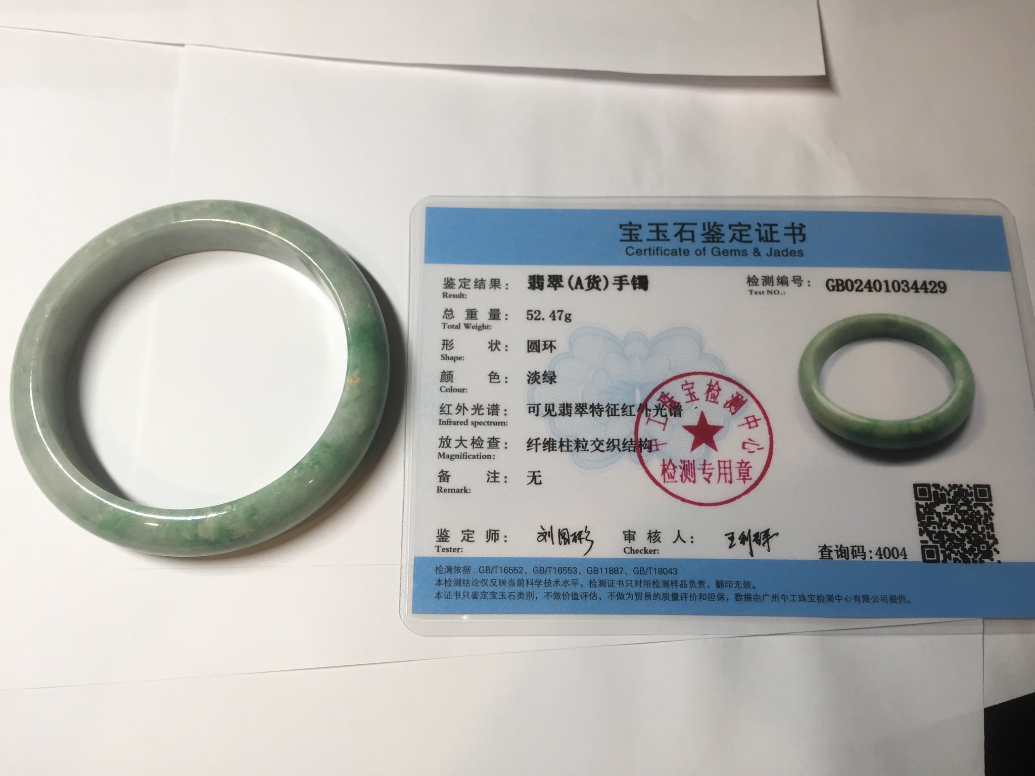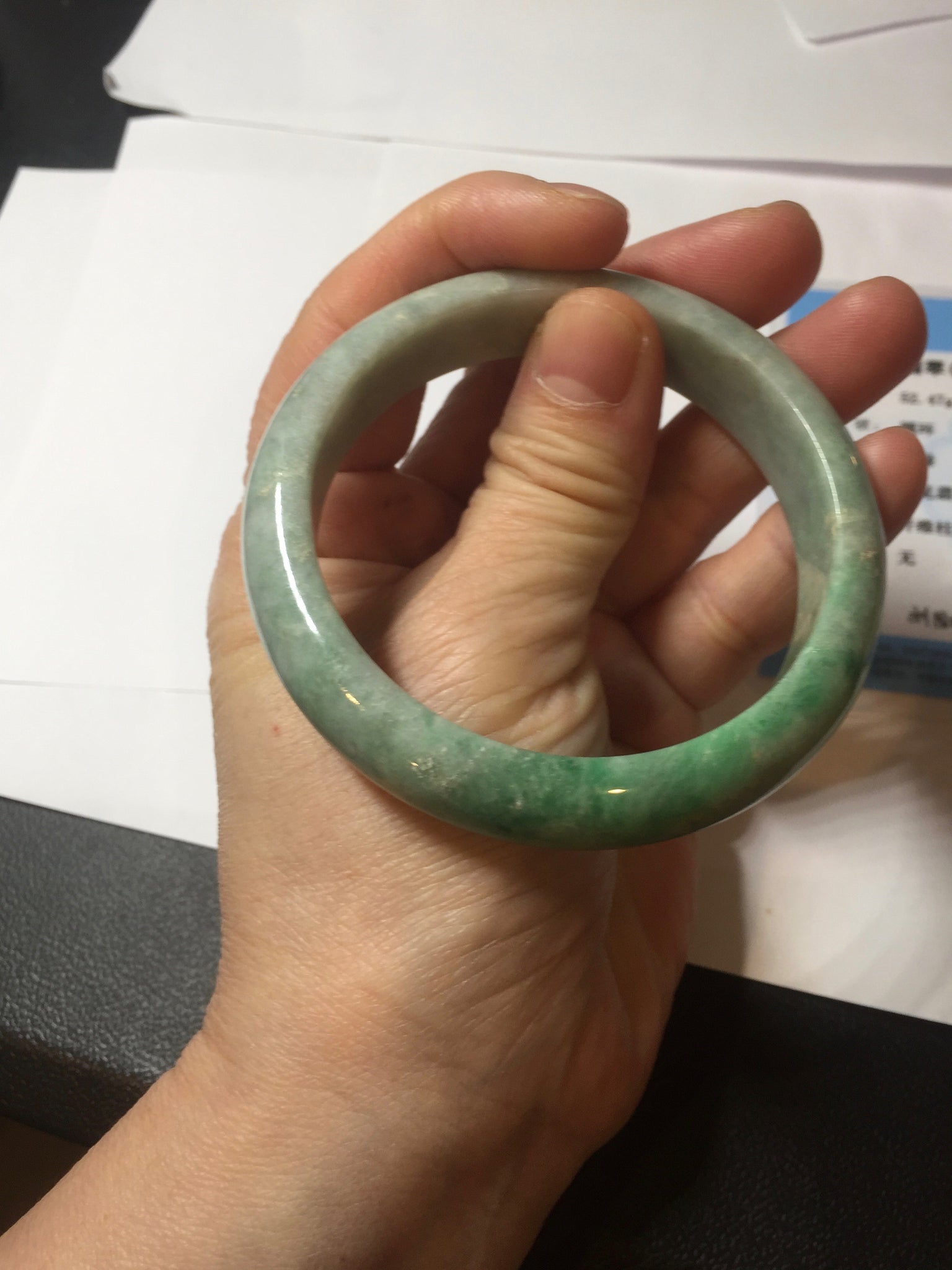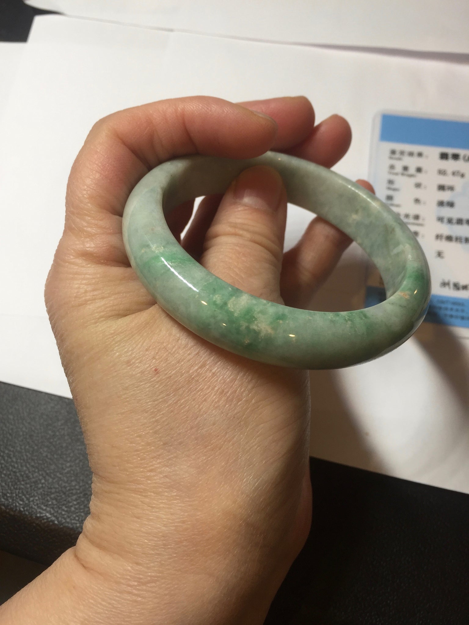 Imperfections: No crack. No hairline. Some rough surfaces and small mine pits. The bangle is solid. Some cotton spots, lines, and areas. Not transparent. Not watery.
