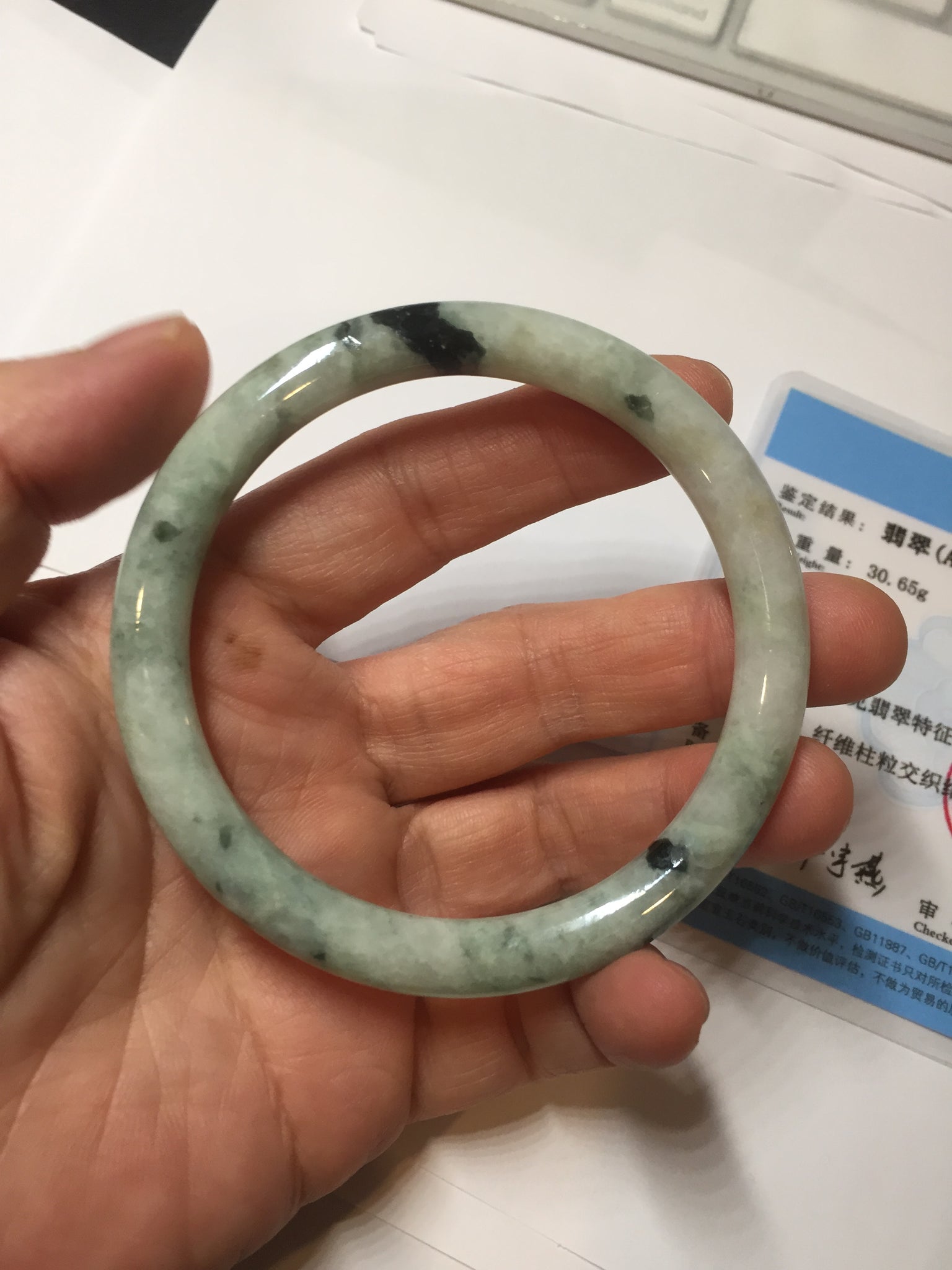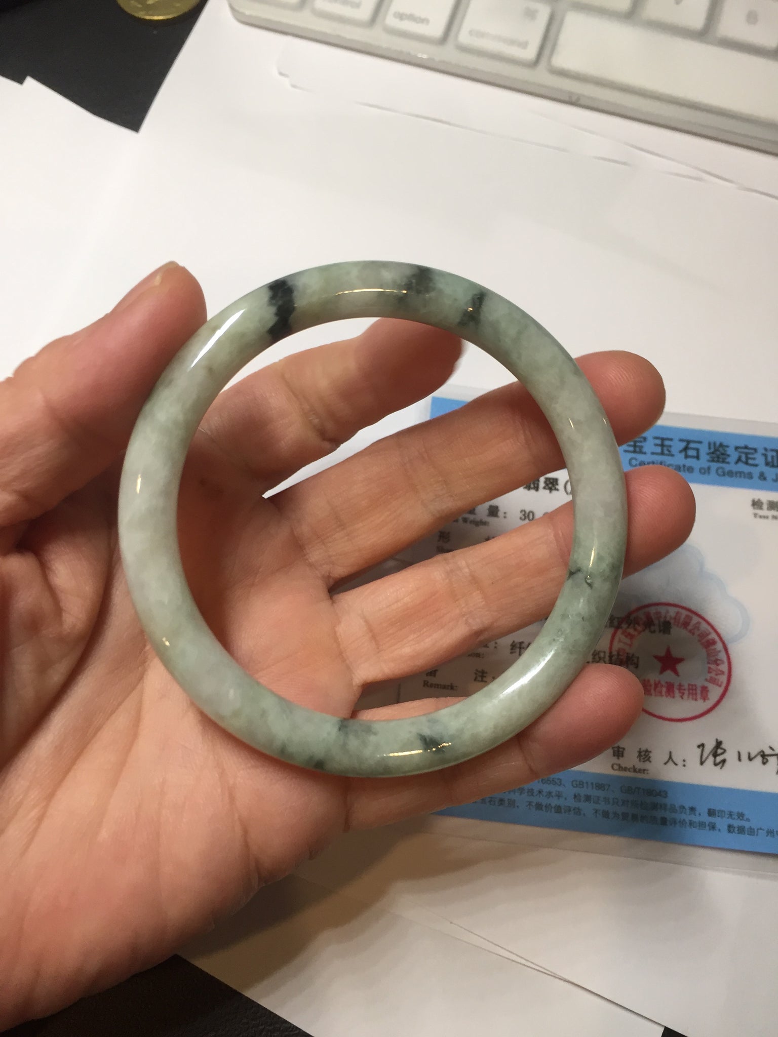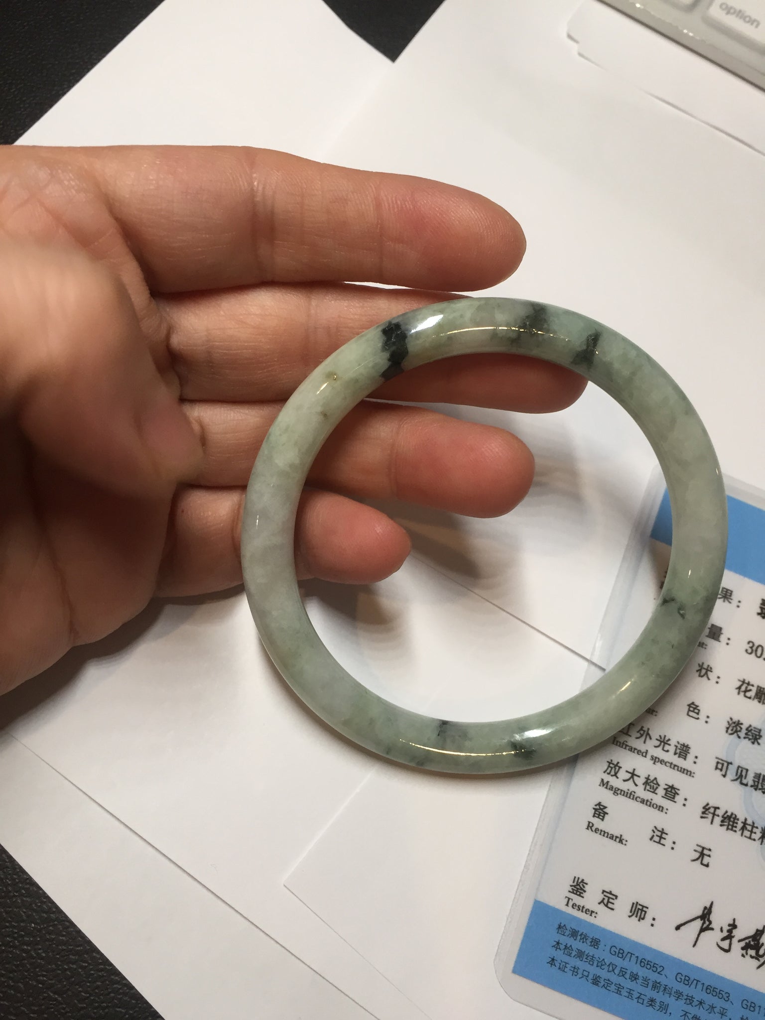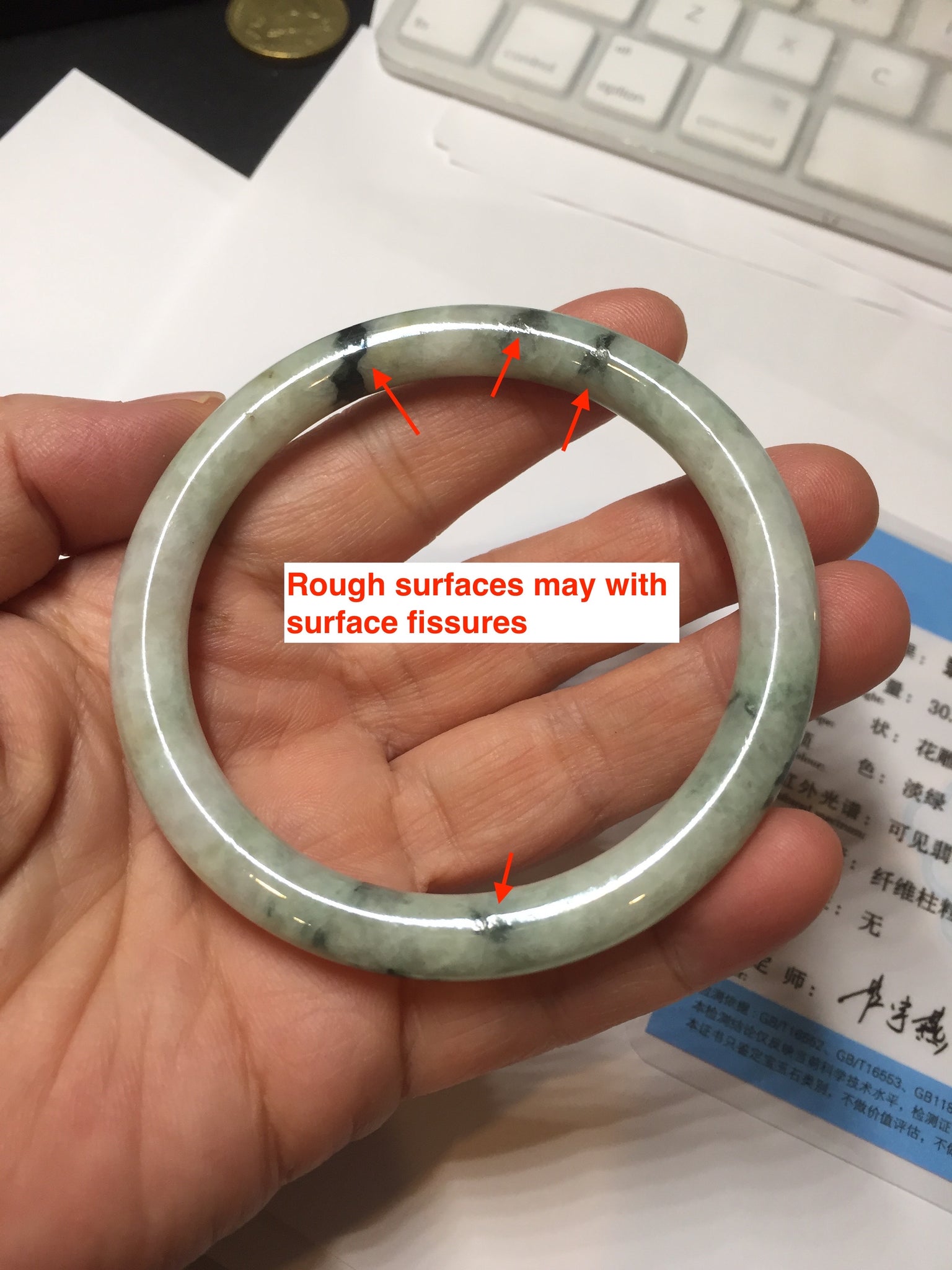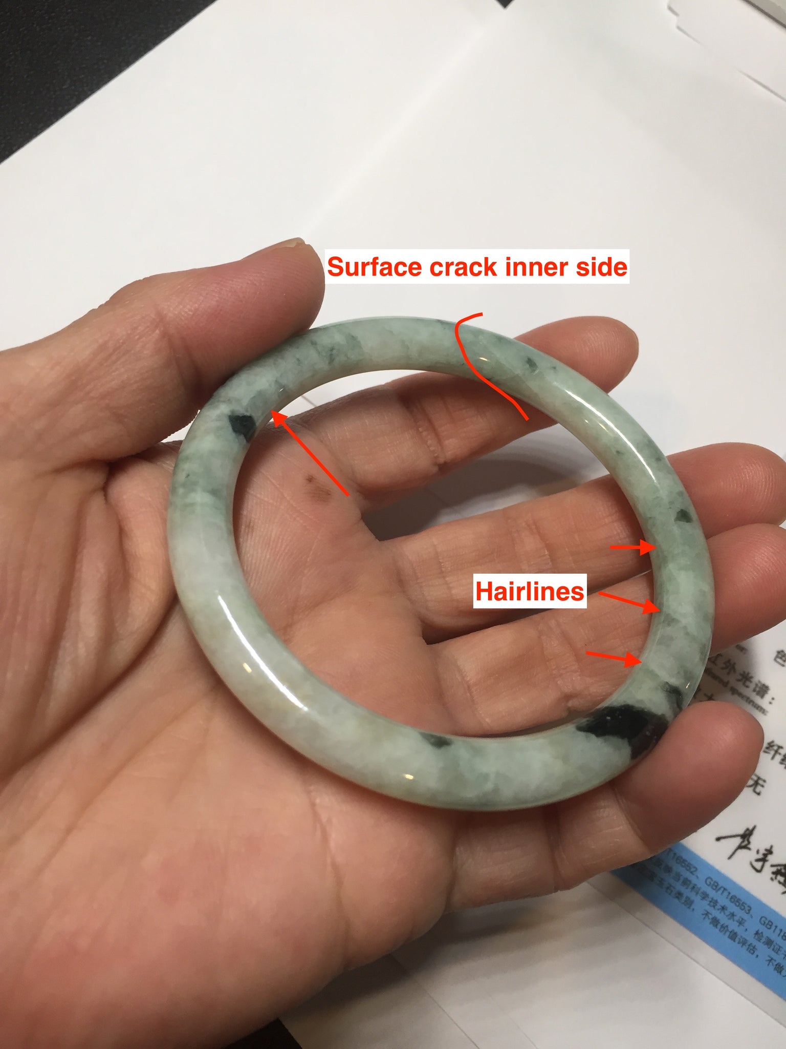 One U shape crack. Some dark green rough surfaces may with surface fissures or mine pits. Some cotton lines. Not transparent.