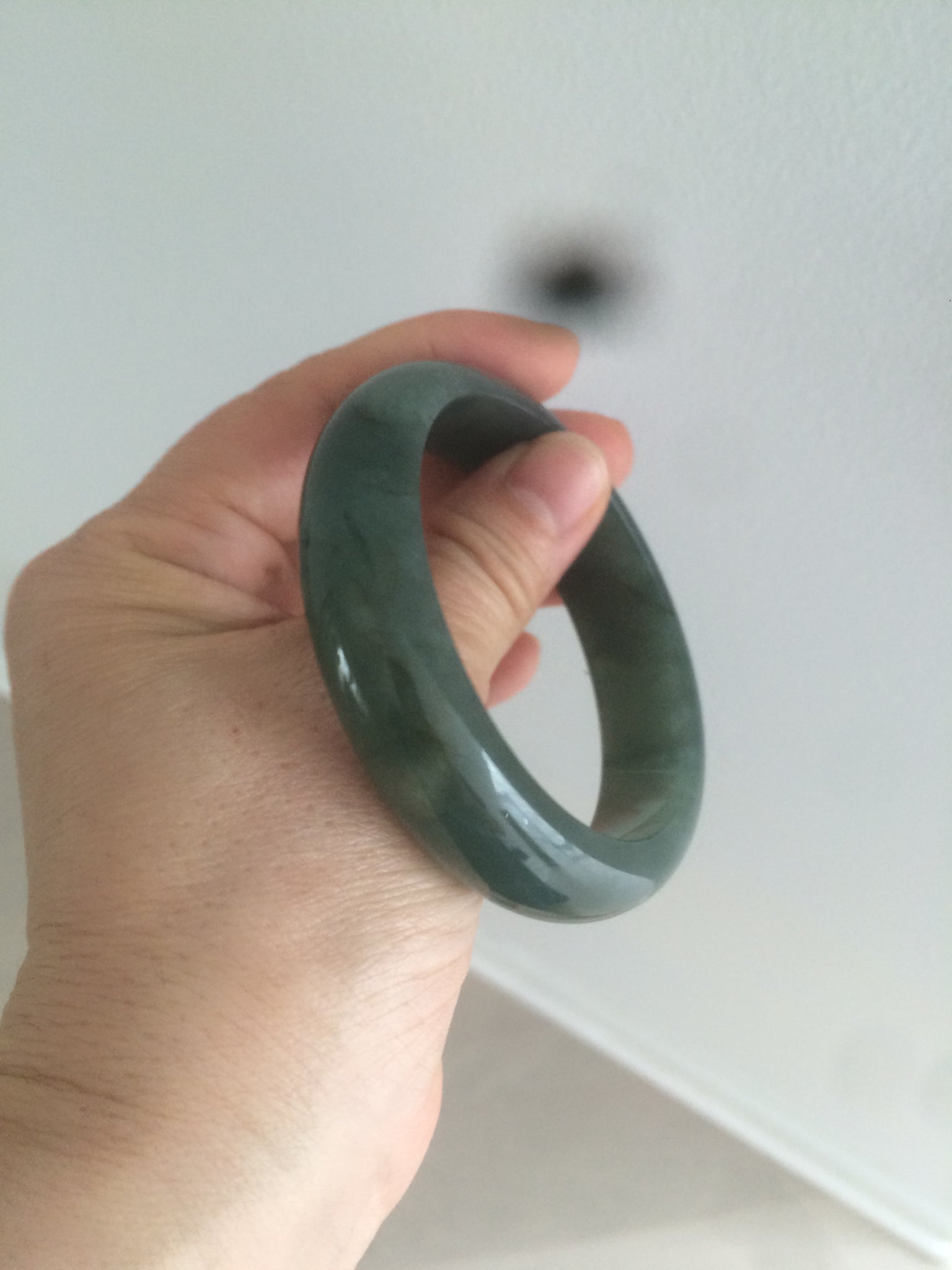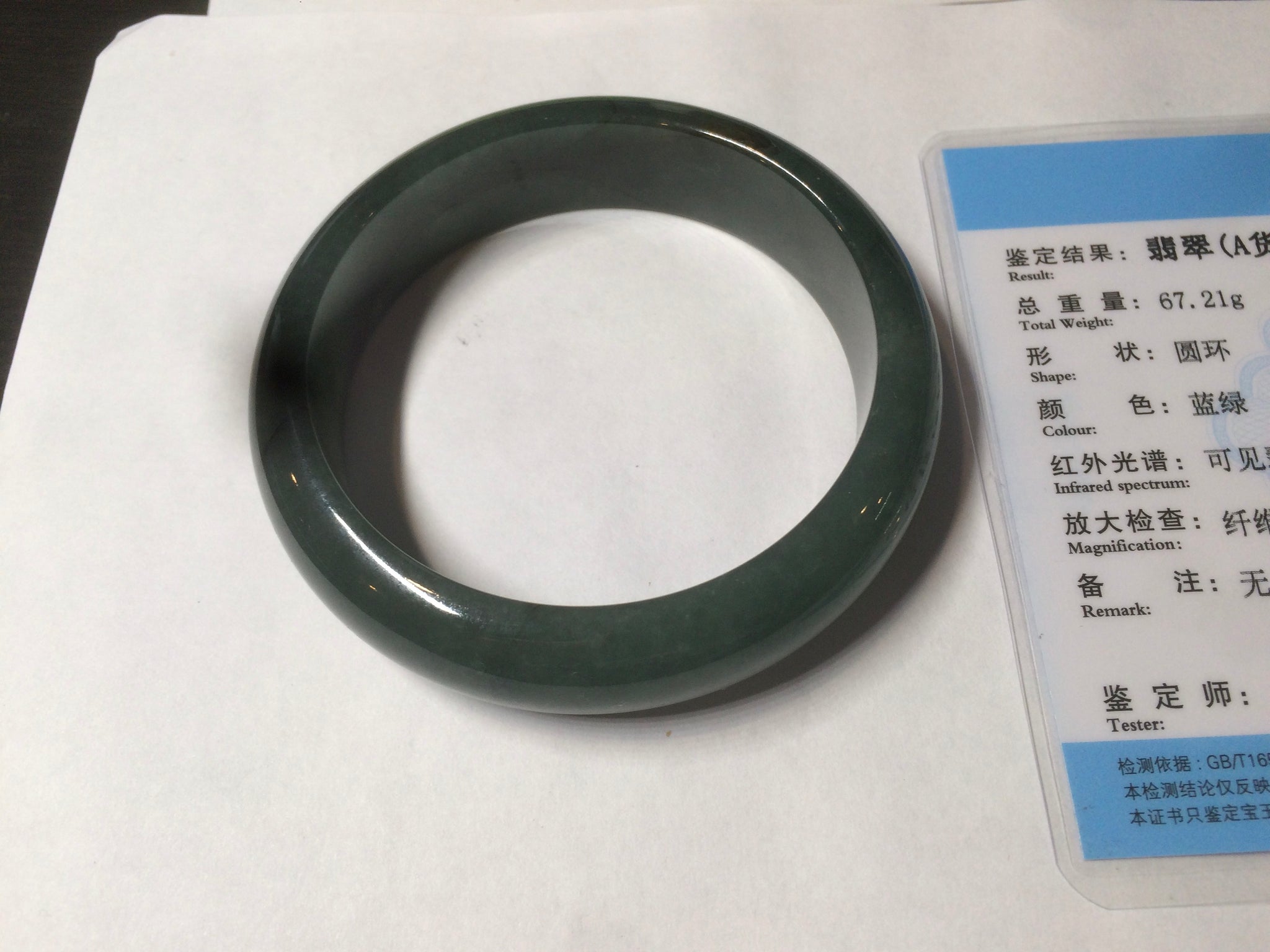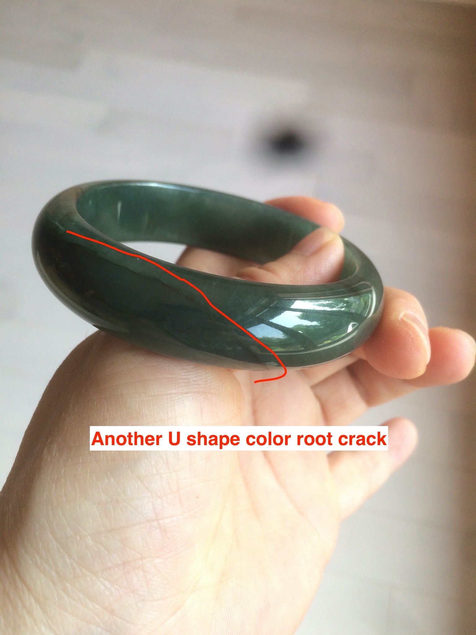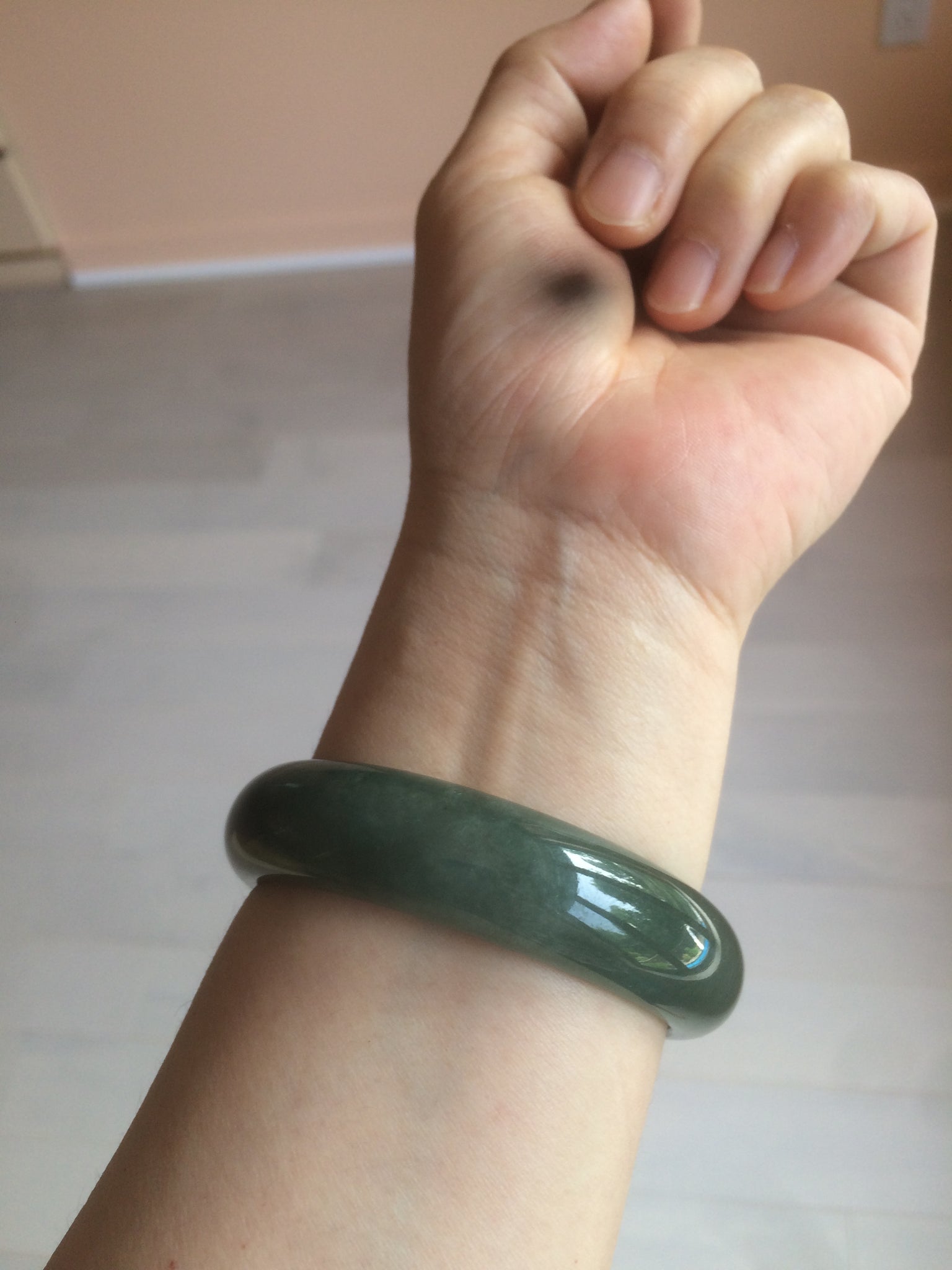 Some dark green/black cracks. The bangle is still solid. Makes a high-pitched sound when clicked. Some hairlines, cotton lines, and color roots. Cotton areas and lines.