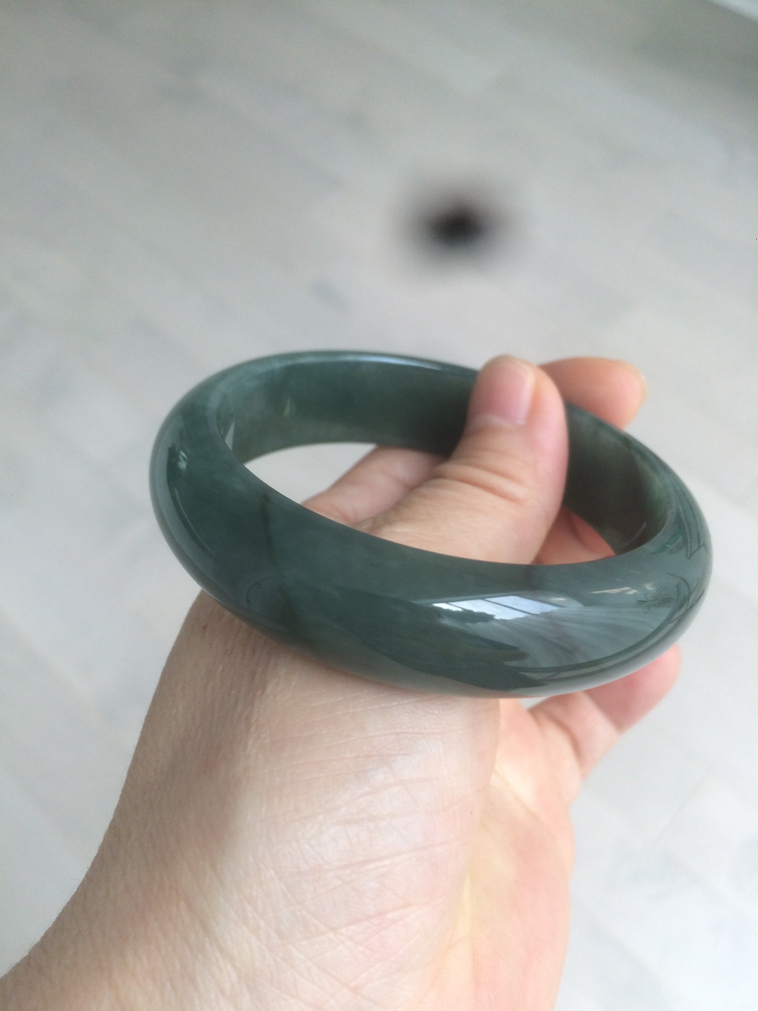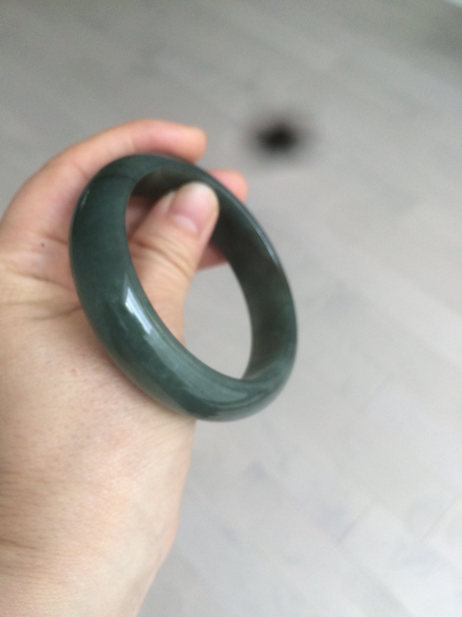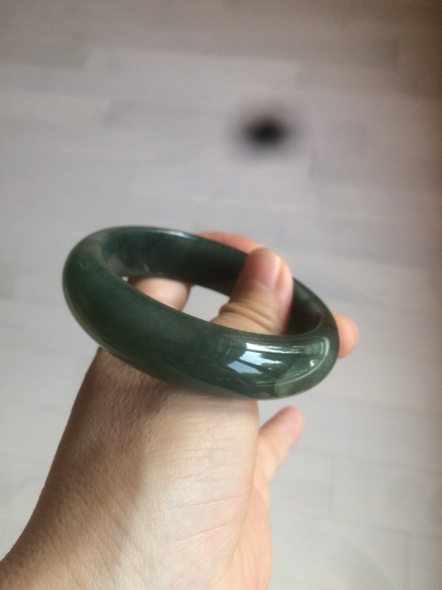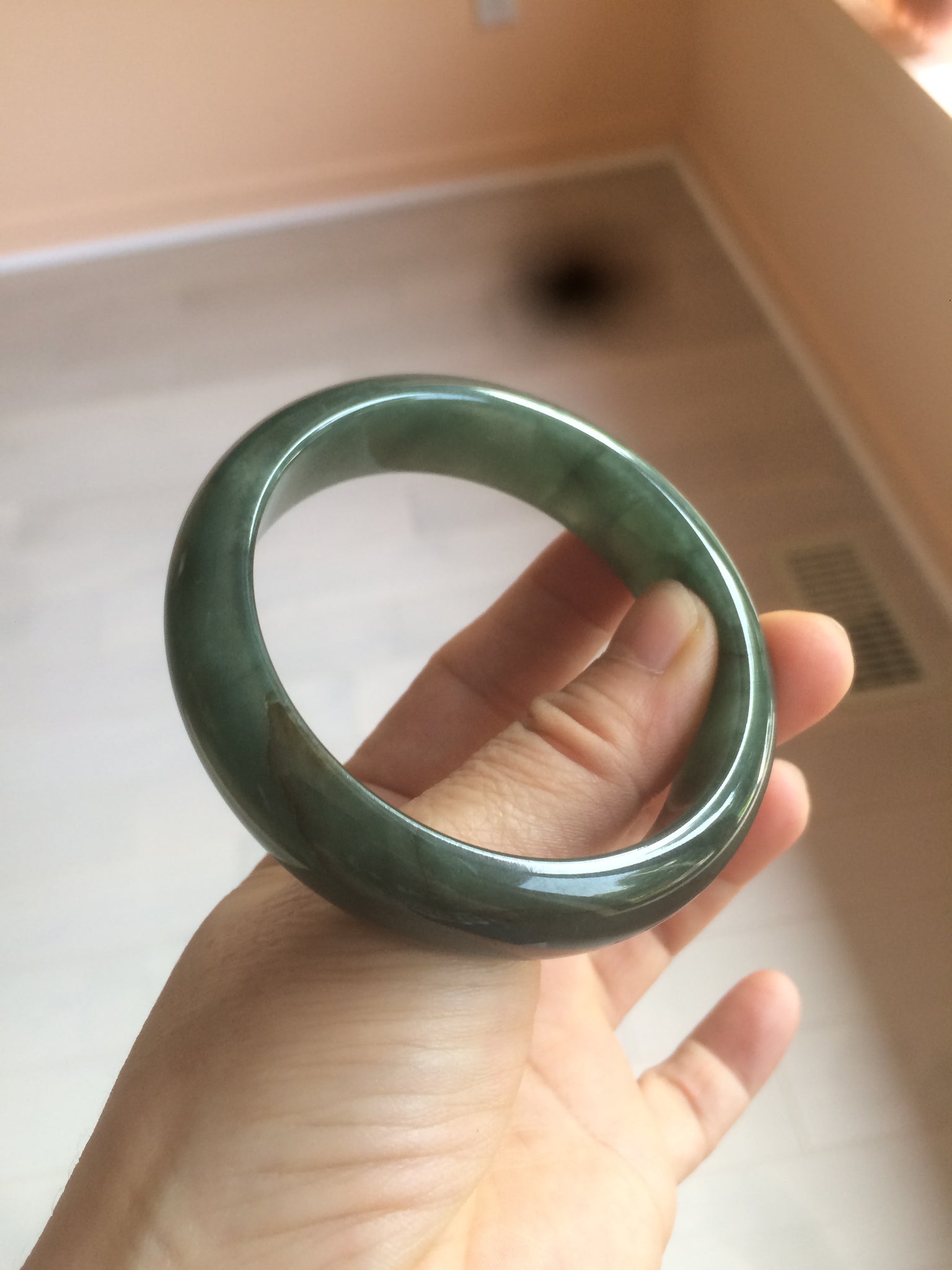 Some dark green/black cracks. The bangle is still solid. Makes a high-pitched sound when clicked. Some hairlines, cotton lines, and color roots. Cotton areas and lines.