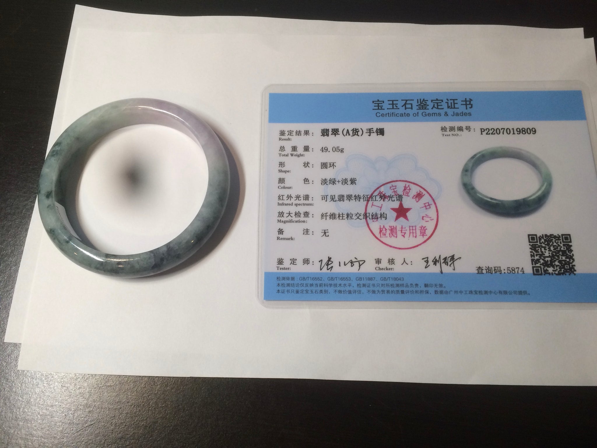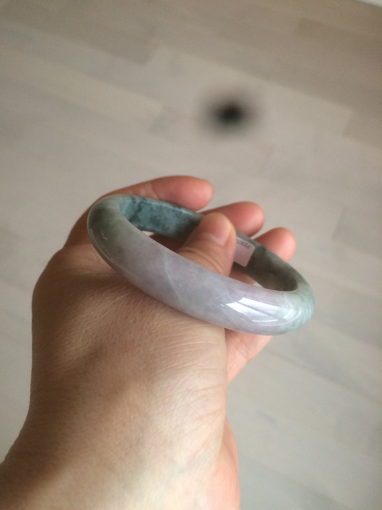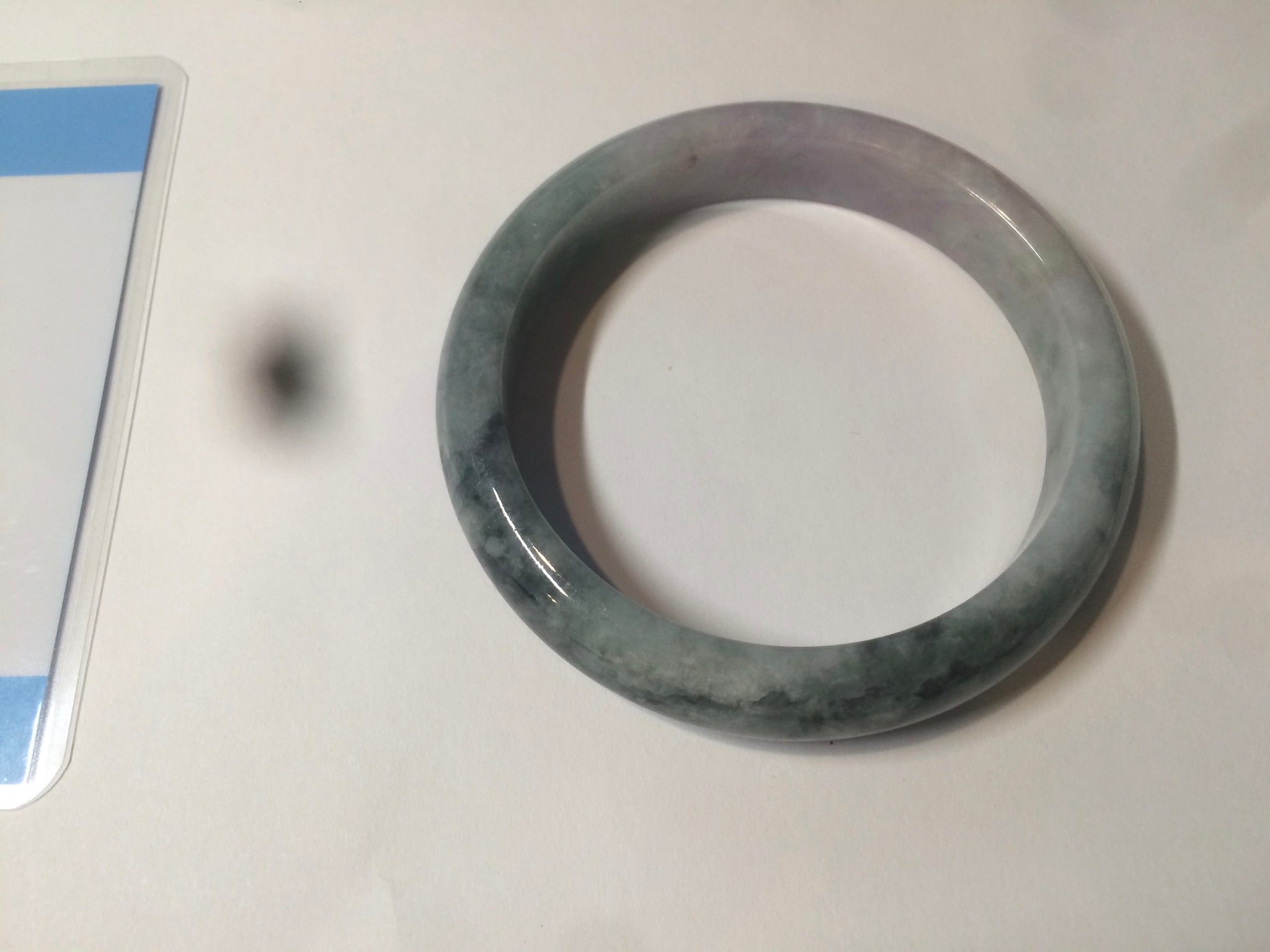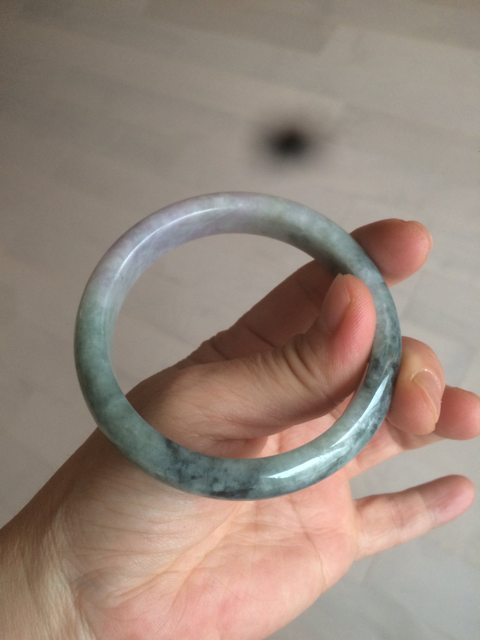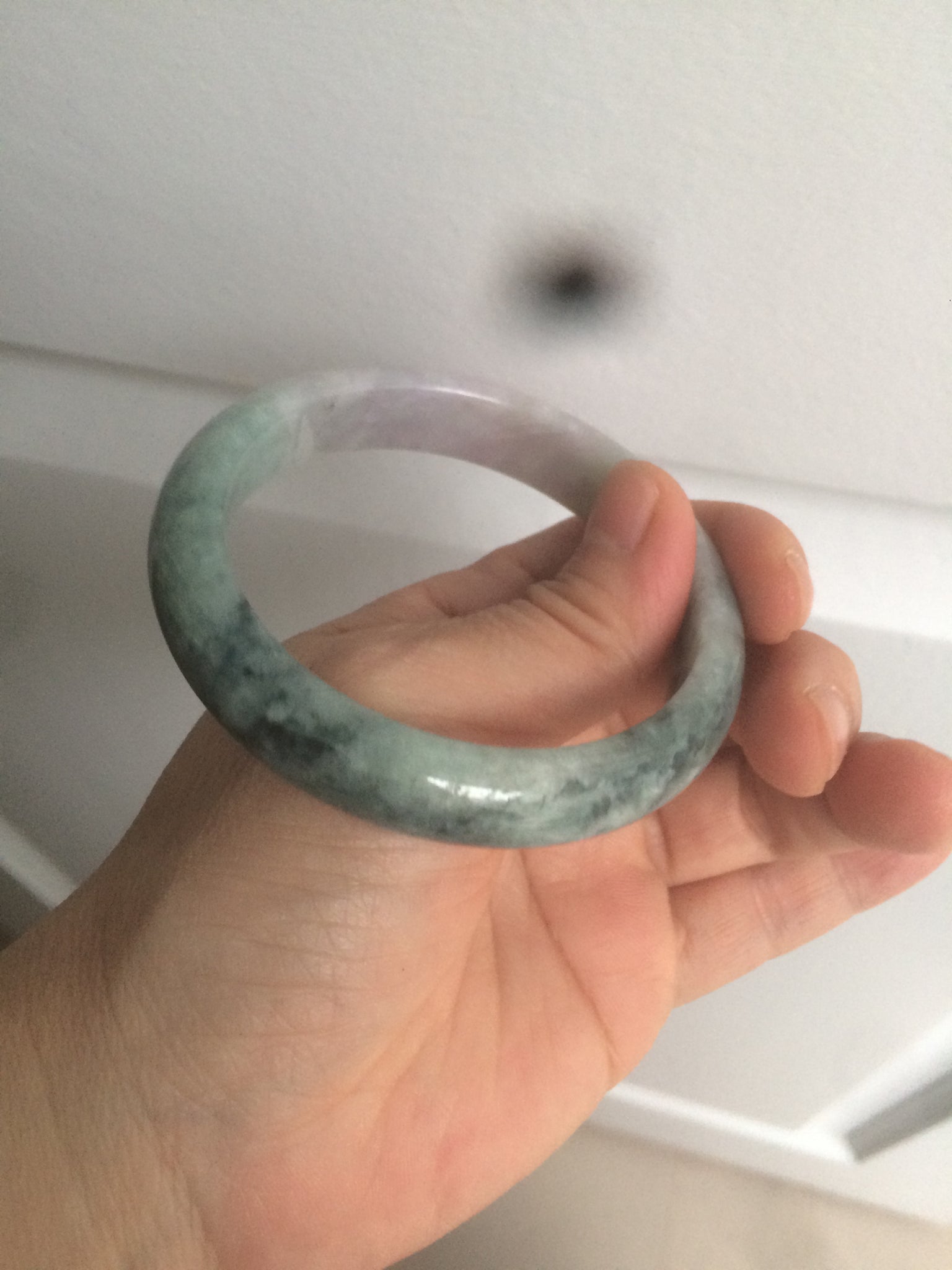 Imperfections: One long surface crack. Some hairlines (more than 5). Cotton spots. The bangle is still firm. The purple is lighter than in the photos. Has some dark dim colors. Not so watery.